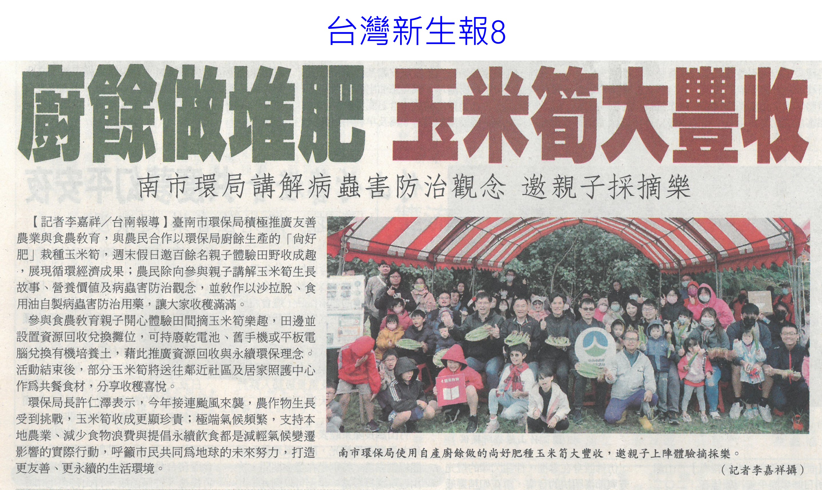 首頁玉米新鮮報鑑往知來玉米通 鑑往知來玉米通 排序 發布日期 更新日期 序號 發布日期 標題 401. 114/01/07 ET民調/78%民眾預期物價持續上漲 近3成喊「每月入不敷出」 402. 114/01/02 翁章梁帶嘉義轉型 不忘農業根(聯合報B2) 403. 114/01/02 1年134場 4700師生體驗食農教育(中華日報B7) 404. 113/12/31 營養師解析⟫均衡飲食難達成?國民健康署分享6項餐食,教你如何吃得營養又美味! 405. 113/12/30 農糧署抽驗把關 農友用肥好安心(中華日報B8) 406. 113/12/30 天然災害救助辦法 農業部預告修正(民眾日報2) 407. 113/12/30 台南農產外銷 拼出8億成績(自由時報A11) 408. 113/12/30 南市農業局 行銷商機近8億元(中國時報A9) 409. 113/12/30 親子採玉米享受田園樂(中華日報B4) 410. 113/12/30 台南農特產赴新北行銷 搶春節商機(中華日報B2) 411. 113/12/30 廚餘做堆肥 玉米筍大豐收(台灣新生報8) 412. 113/12/25 最美小雨燕農村再獲獎 雲林口湖椬梧映月塘永續理念添金質榮耀 413. 113/12/25 氣候冷涼潮濕 臺中農改場籲請農友加強防治馬鈴薯晚疫病 414. 113/12/25 台南農力出頭天 瓜瓜園及黃金蕎麥公司奪得十大嚴選穀得獎 林家寶獲選全國模範農民 415. 113/12/25 農業部調整公糧輔導收購價 每公斤24.5元明年起適用 416. 113/12/25 114年「綠色環境給付計畫」 1/2至2/8受理申報 417. 113/12/25 明年暫停大區輪作,水稻產業鬆口氣 418. 113/12/25 公糧定案:輔導收購調漲1.5 元,計畫餘糧調整收量,提高轉作休耕獎勵,水稻雜糧並重 419. 113/12/25 少了250億!財劃法修法重傷農業 陳駿季:農民權益等3面向陷困境 420. 113/12/20 立院通過公糧調漲決議 農業部:非最佳選項、續提「1集、2轉、3加3」政策 第 21/204 頁,共 4072 筆上一頁到第123456789101112131415161718192021222324252627282930313233343536373839404142434445464748495051525354555657585960616263646566676869707172737475767778798081828384858687888990919293949596979899100101102103104105106107108109110111112113114115116117118119120121122123124125126127128129130131132133134135136137138139140141142143144145146147148149150151152153154155156157158159160161162163164165166167168169170171172173174175176177178179180181182183184185186187188189190191192193194195196197198199200201202203204頁下一頁每頁103070筆資料