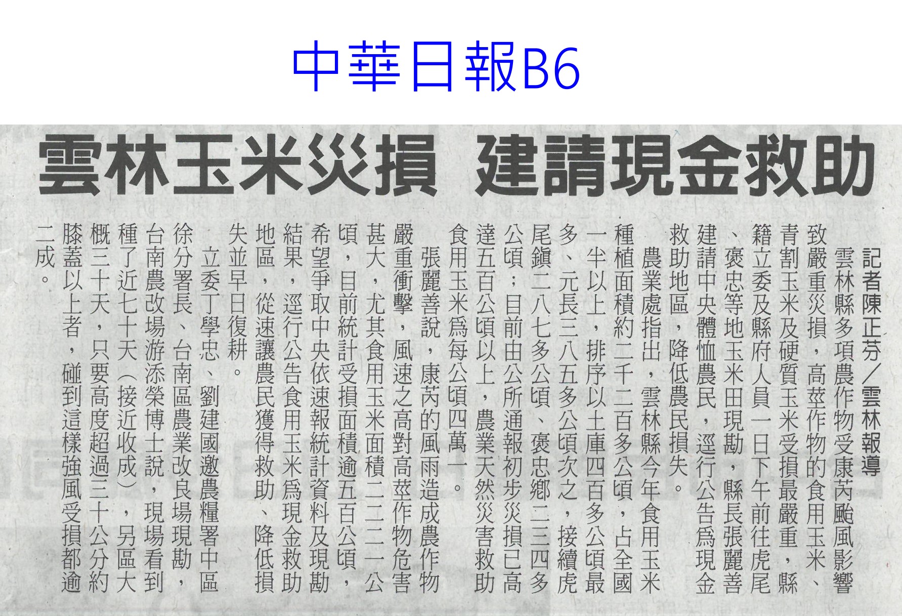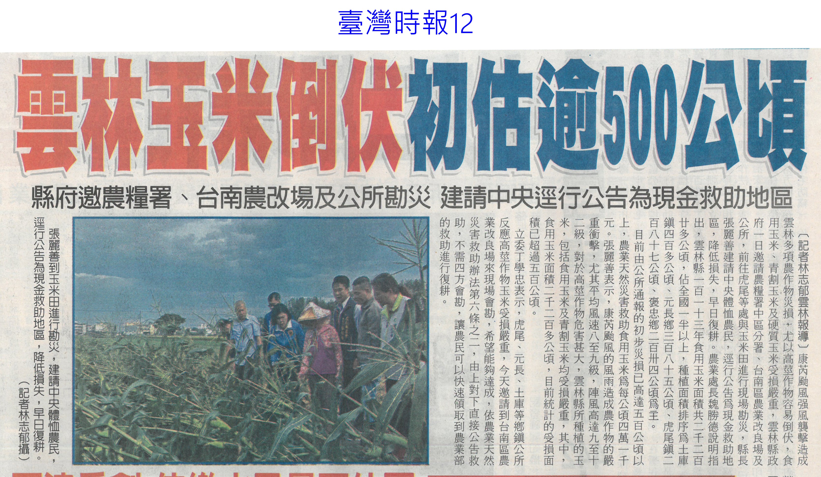 首頁玉米新鮮報鑑往知來玉米通 鑑往知來玉米通 排序 發布日期 更新日期 序號 發布日期 標題 481. 113/11/14 雲林良品 上架星國新台灣館(臺灣時報18) 482. 113/11/11 康芮農損 雲林再增作物現金救助(自由時報A11) 483. 113/11/07 刁蟲小計展開幕 瞭解農業實況(臺灣時報18) 484. 113/11/07 憂農退儲金破產 提繳率僅3成(中國時報A5) 485. 113/11/07 十大神農出爐 嘉縣陳鴻碩獲獎(臺灣時報18) 486. 113/11/06 雲林玉米倒伏初估逾500公頃(臺灣時報12) 487. 113/11/06 雲林玉米災損 建請現金救助(中華日報B6) 488. 113/11/06 玉米倒伏 雲縣府籲直接救助(中國時報A9) 489. 113/11/06 康芮重創雲林農損逾3.2億(臺灣時報9) 490. 113/11/06 推廣有機農業 嘉大辦研習(民眾日報4) 491. 113/11/06 立委邀農業部會勘災損(台灣新生報6) 492. 113/11/03 「康芮」重創台灣農業!農作物受害面積破萬頃 雲林花東災情最慘 493. 113/11/03 台灣農業慘遭「康芮」嚴重打擊!全國損失近8億 水稻慘淪重災區 494. 113/11/02 康芮狂虐全台農損近3億!雲林縣成最大受災戶 台中梨山滿地落果 495. 113/11/02 康芮颱風災情破萬件!釀2死617傷「逾3萬戶仍停電」 農損近5億 496. 113/11/02 康芮農損4.8億元「7成在雲林花蓮」 水稻最慘占1.5億元 497. 113/11/01 不敵康芮強風!雲林食用玉米災情慘 倒伏面積逾500公頃 498. 113/11/01 農業部啟動農損救助準備工作(中華日報A4) 499. 113/11/01 全台農損逾2億 供貨減菜價漲 500. 113/11/01 康芮颱風農損近3億 雲林損失最高!受損作物蒜頭最嚴重 第 25/204 頁,共 4072 筆上一頁到第123456789101112131415161718192021222324252627282930313233343536373839404142434445464748495051525354555657585960616263646566676869707172737475767778798081828384858687888990919293949596979899100101102103104105106107108109110111112113114115116117118119120121122123124125126127128129130131132133134135136137138139140141142143144145146147148149150151152153154155156157158159160161162163164165166167168169170171172173174175176177178179180181182183184185186187188189190191192193194195196197198199200201202203204頁下一頁每頁103070筆資料