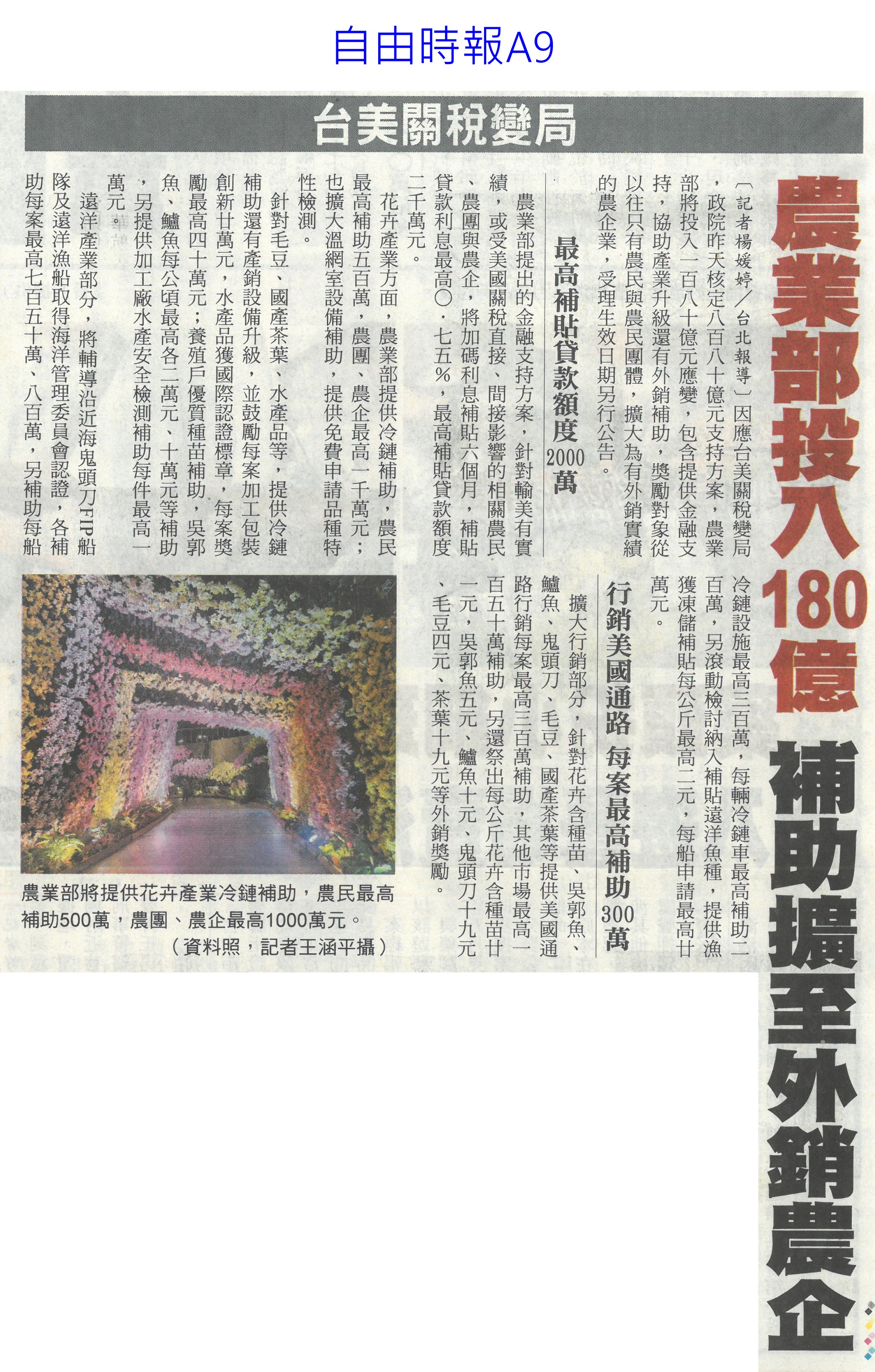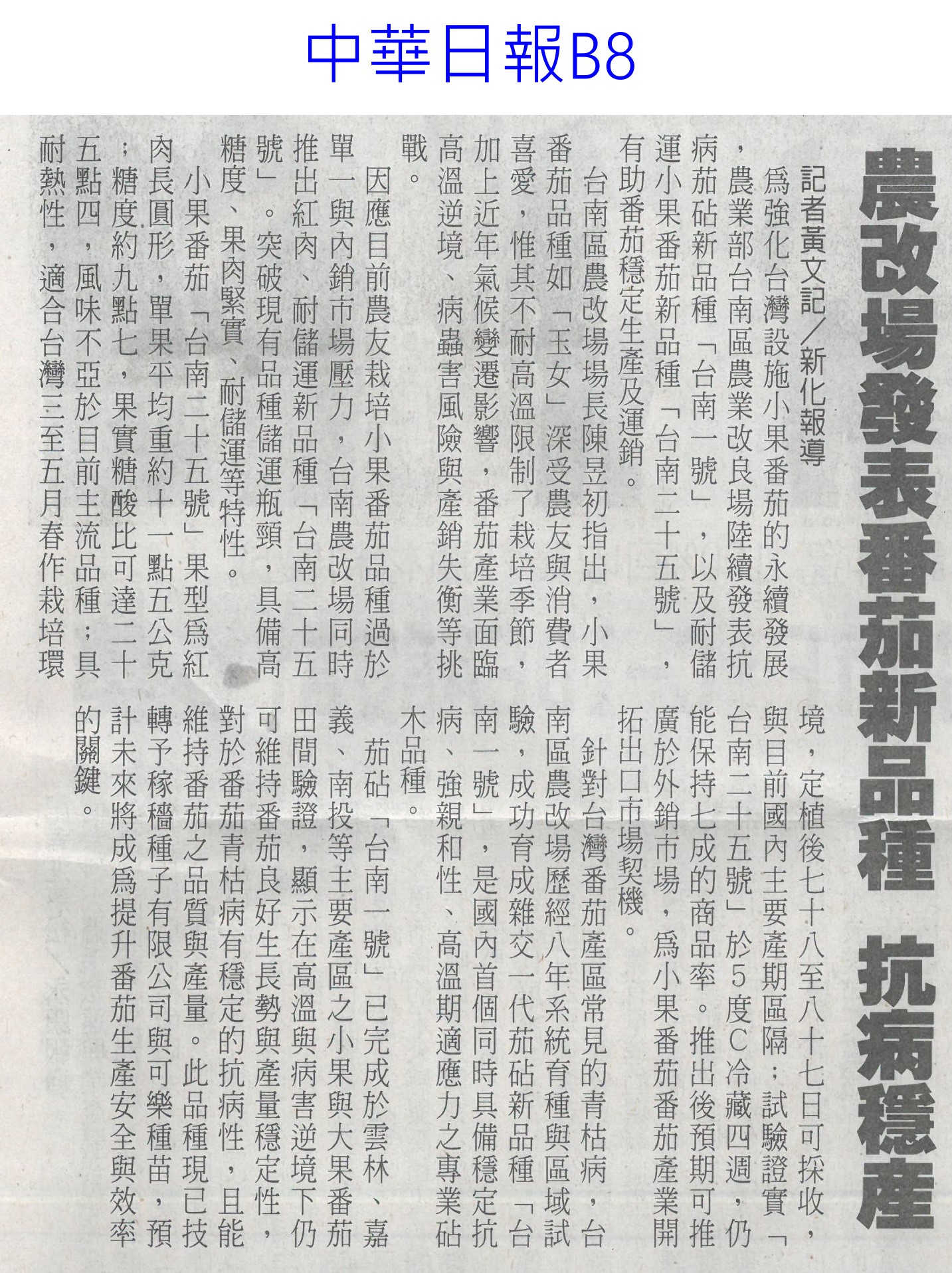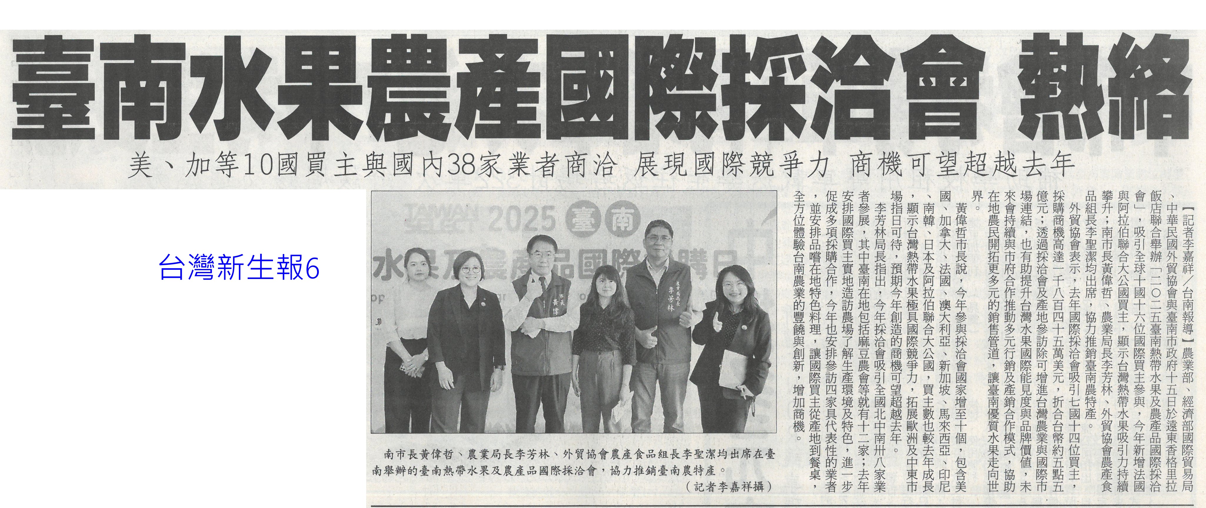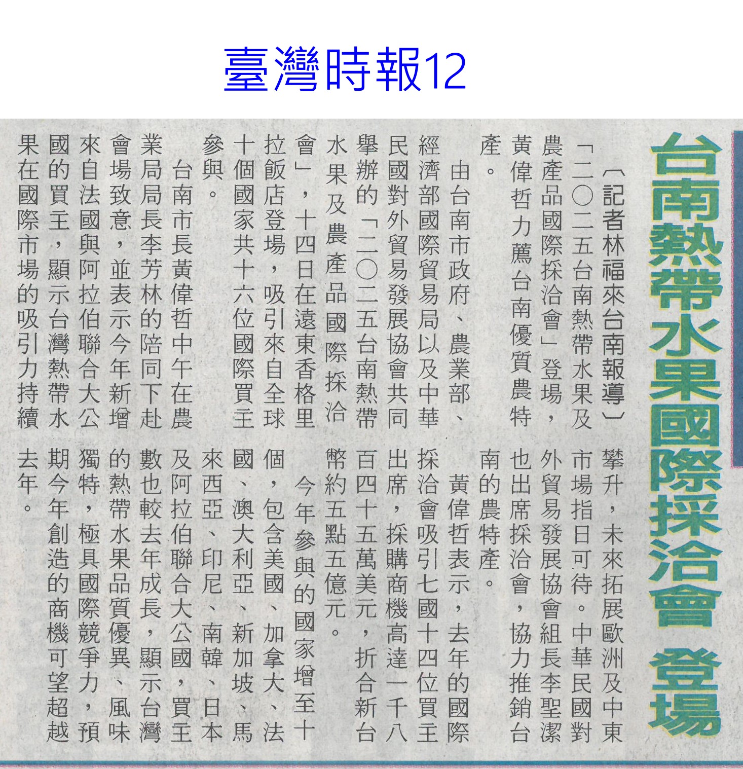首頁番茄搶先報 番茄搶先報 排序 發布日期 更新日期 序號 發布日期 標題 401. 114/05/19 月桃故事館 打造食農基地(聯合報B2) 402. 114/05/19 營養師推「食五紅」 端午節養生不怕胖 403. 114/05/18 蔬果佔餐盤一半 健康有保障 404. 114/05/17 炎炎夏日吃清涼水果消暑 專業醫提醒「4水果」傷骨 405. 114/05/17 早餐不能沒水果! 研究:早餐吃「二高水果」助認知力、降壓力 406. 114/05/16 雲林慶祝農民節 表彰172人(中華日報B6) 407. 114/05/16 農科園區定期強化安全防護 打造韌性產業聚落(民眾日報4) 408. 114/05/16 耐熱 抗病 亞蔬蔬菜育種觀摩(自由時報A11) 409. 114/05/16 臺南水果進軍北台 上架開賣(中華日報B2) 410. 114/05/16 臺南水果農產國際採洽會 熱絡(台灣新生報6) 411. 114/05/16 台南水果 農產採洽會 16國外買主參與(自由時報A11) 412. 114/05/16 台南熱帶水果國際採洽會 登場(臺灣時報12) 413. 114/05/13 農保放寬 光電農地免一分地門檻(中國時報A5) 414. 114/05/13 雲林良品30大伴手禮票選開跑(中華日報B6) 415. 114/05/07 菜價低迷多耕鋤 農民辛酸(中國時A9) 416. 114/05/07 農改場發表番茄新品種 抗病穩產(中華日報B8) 417. 114/04/28 南科小農市集明登場 挺優質農產(中華日報B8) 418. 114/04/28 南科小農市集周六開張 力挺震災區農產(自由時報A12) 419. 114/04/28 農業部投入180億 補助擴至外銷農企(自由時報A9) 420. 114/04/28 國際農業機械展 成交金額上看10億(臺灣時報18) 第 21/176 頁,共 3503 筆上一頁到第123456789101112131415161718192021222324252627282930313233343536373839404142434445464748495051525354555657585960616263646566676869707172737475767778798081828384858687888990919293949596979899100101102103104105106107108109110111112113114115116117118119120121122123124125126127128129130131132133134135136137138139140141142143144145146147148149150151152153154155156157158159160161162163164165166167168169170171172173174175176頁下一頁每頁103070筆資料