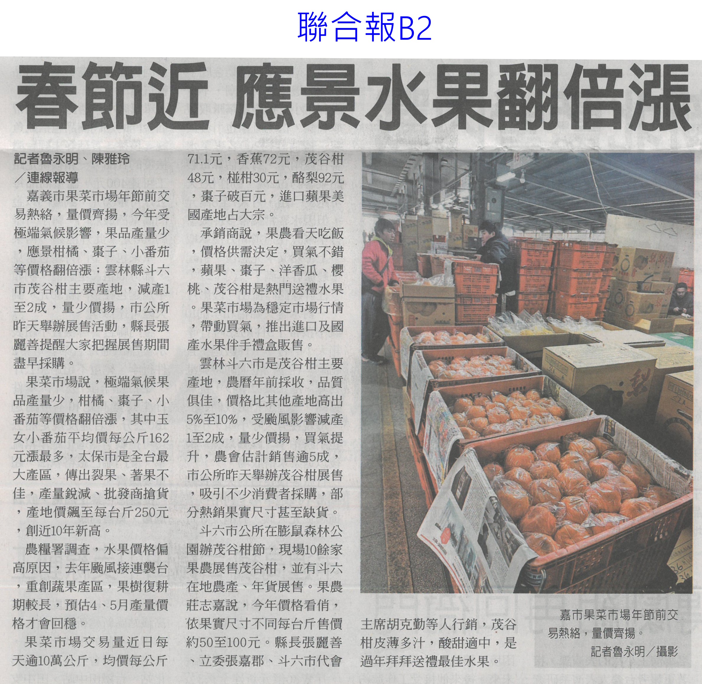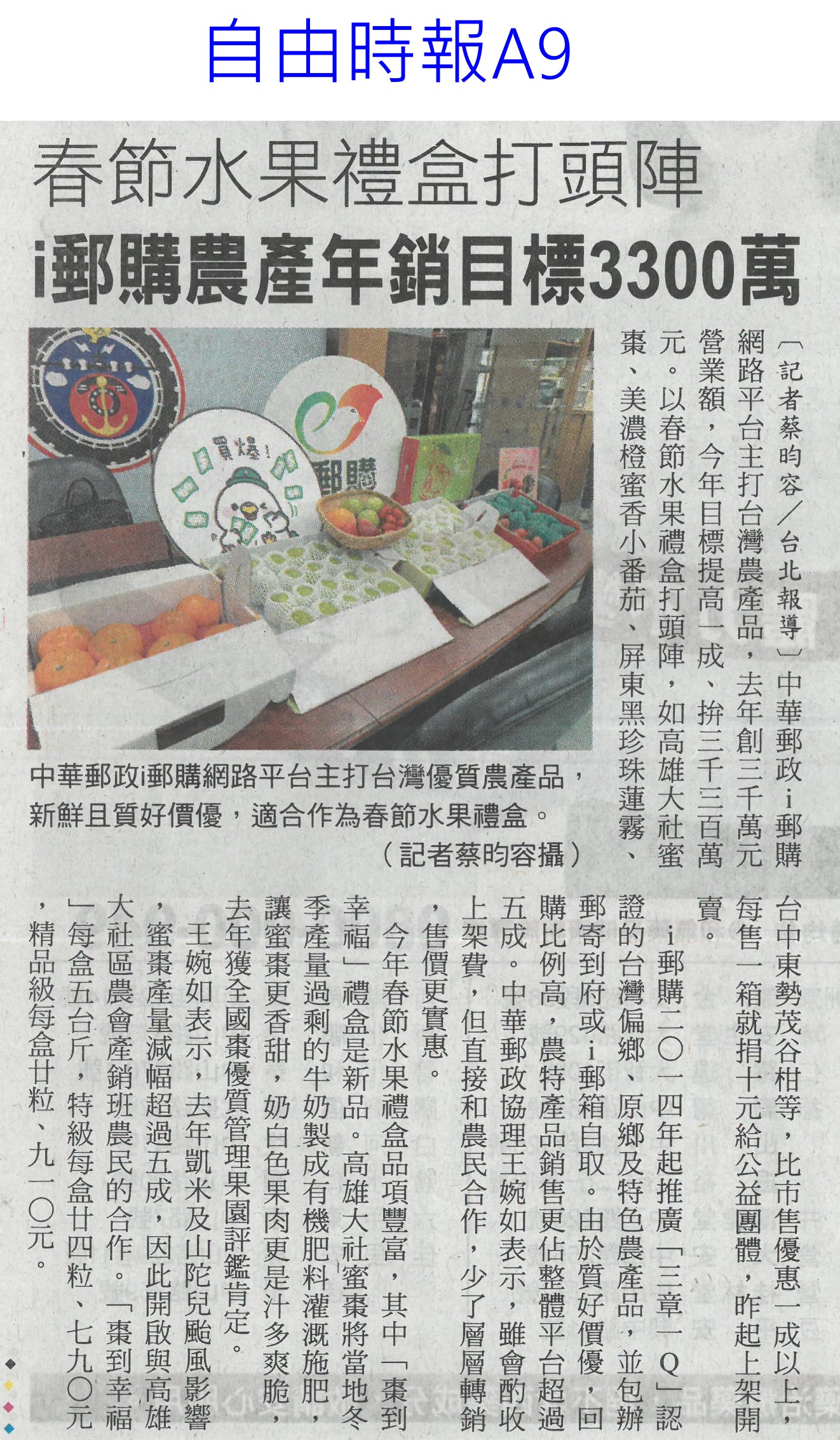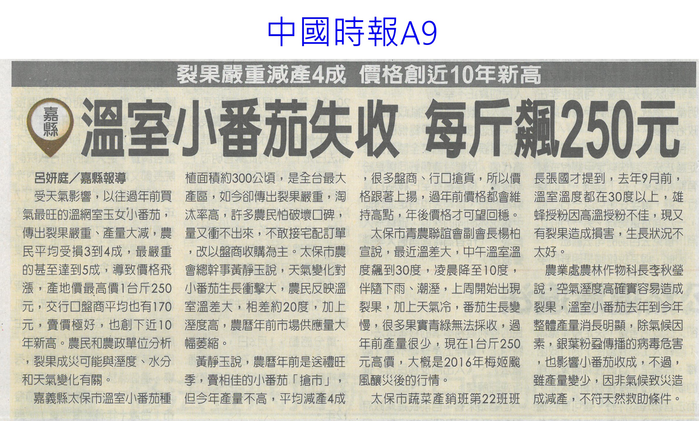 首頁番茄搶先報 番茄搶先報 排序 發布日期 更新日期 序號 發布日期 標題 561. 114/01/14 南瀛農特產伴手禮展售 買氣爆棚(中華日報B1) 562. 114/01/14 南瀛農特產伴手禮展售 創百萬業績(自由時報A11) 563. 114/01/14 春節近 應景水果翻倍漲(聯合報B2) 564. 114/01/14 黃偉哲板橋大遠百叫賣農漁特產(中華日報B1) 565. 114/01/14 菜價回跌 高麗菜半顆40元有找(臺灣時報7) 566. 114/01/14 菜價回跌 高麗菜半顆不到40元(中華日報A4) 567. 114/01/09 國內碳標籤加工蔬菜 花蓮無硫金針拔頭籌(自由時報A9) 568. 114/01/09 農企冷鏈補助取消 產業升級恐跛腳(自由時報A8) 569. 114/01/09 菜價回穩婆媽樂菜農嘆(臺灣時報13) 570. 114/01/09 黃偉哲+星國網紅行銷農特產 10分鐘完售(中華日報B2) 571. 114/01/09 南市府邀星國網紅 助攻農特產(中國時報A9) 572. 114/01/09 冬季產量穩定 高麗菜價腰斬(臺灣時報15) 573. 114/01/09 春節水果禮盒打頭陣(自由時報A9) 574. 114/01/09 12月蔬菜漲3成(自由時報A7) 575. 114/01/09 總統頒發十大神農當選人證書(民眾日報14) 576. 114/01/09 中華郵政攜小農 推春節水果禮盒(民眾日報6) 577. 114/01/09 南瀛農特產伴手禮展售 明登場(台灣新生報6) 578. 114/01/09 南瀛新春農特產伴手禮明展售(中華日報B8) 579. 114/01/09 嘉縣溫室小番茄失收 每公斤飆250元(中國時報A9) 580. 114/01/07 中華郵政i郵購推「32檔水果禮盒」挺小農 售價估便宜1成 第 29/176 頁,共 3506 筆上一頁到第123456789101112131415161718192021222324252627282930313233343536373839404142434445464748495051525354555657585960616263646566676869707172737475767778798081828384858687888990919293949596979899100101102103104105106107108109110111112113114115116117118119120121122123124125126127128129130131132133134135136137138139140141142143144145146147148149150151152153154155156157158159160161162163164165166167168169170171172173174175176頁下一頁每頁103070筆資料