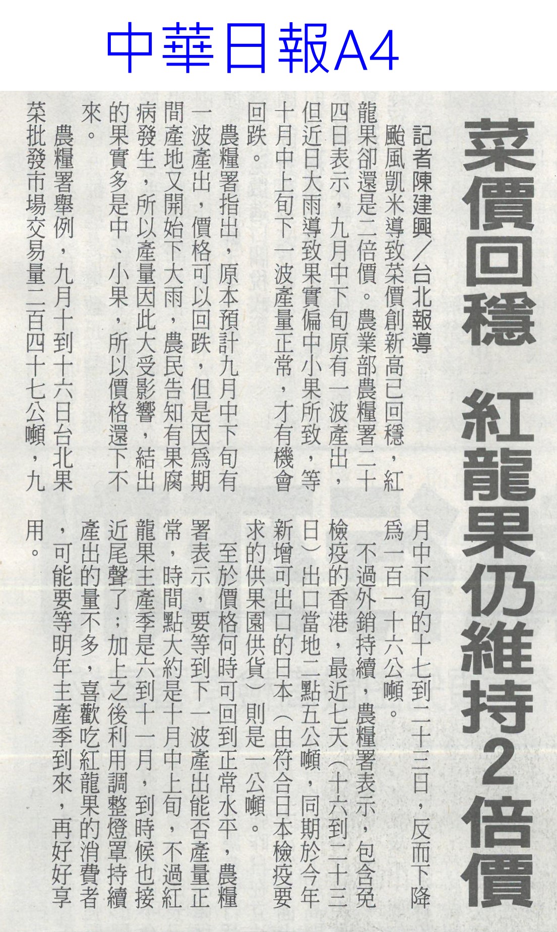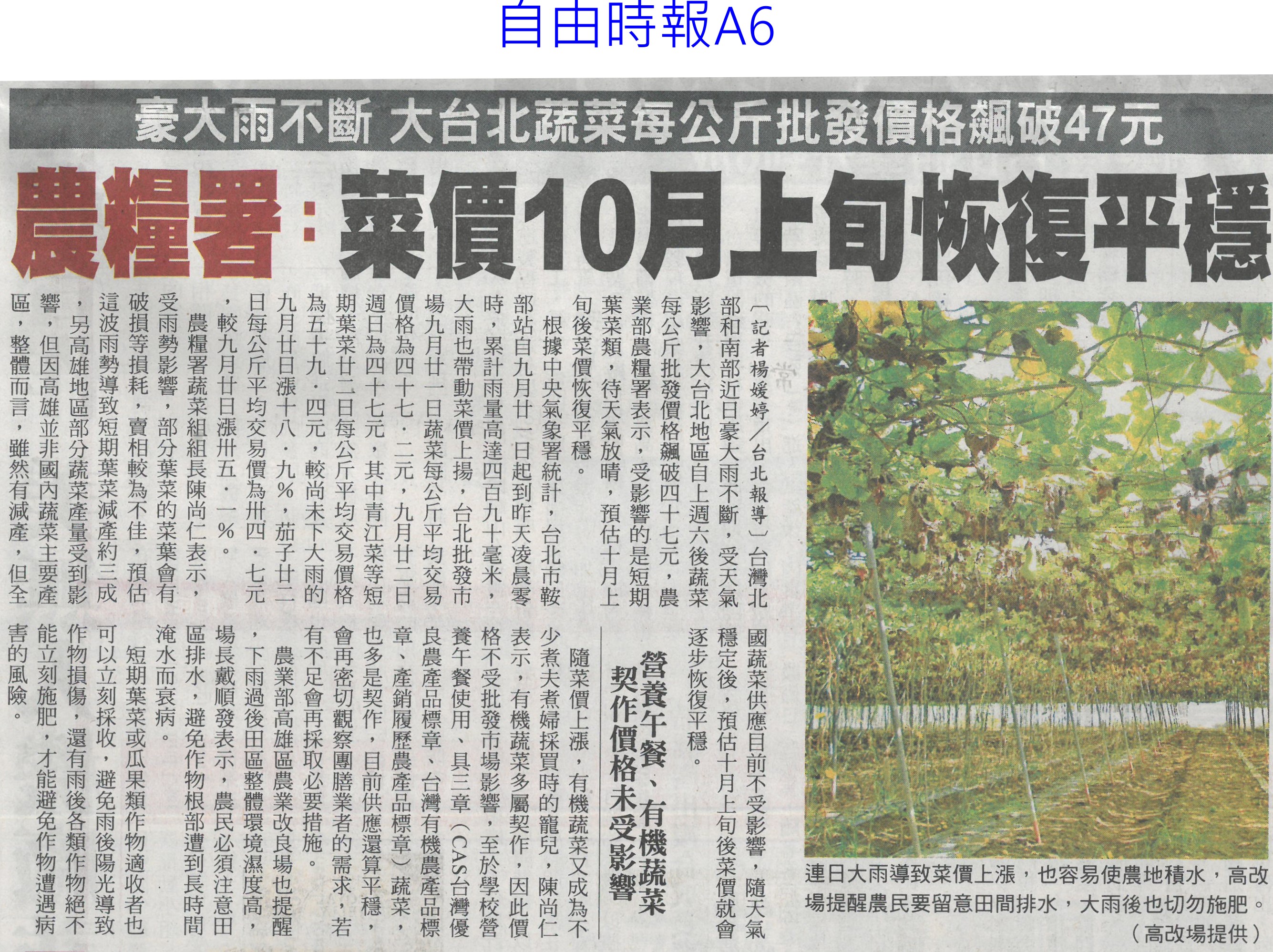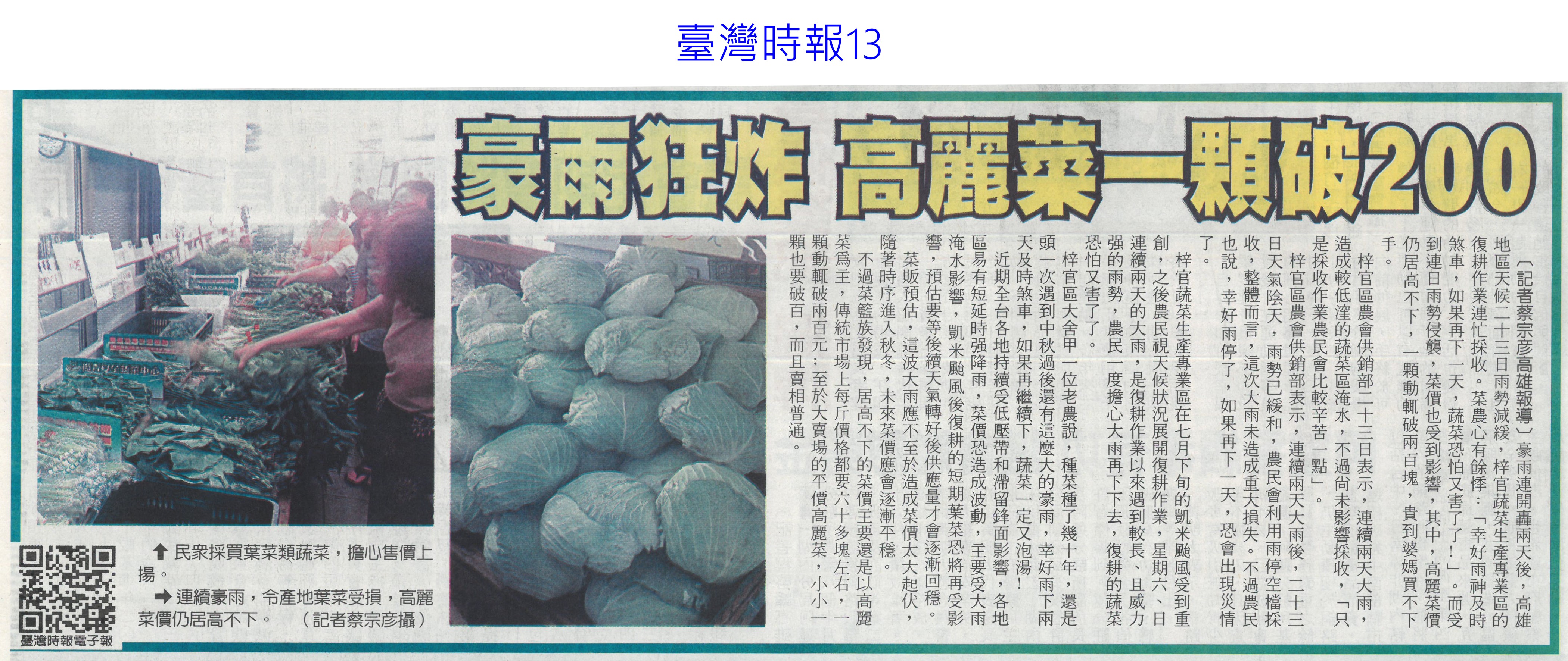 首頁番茄搶先報 番茄搶先報 排序 發布日期 更新日期 序號 發布日期 標題 741. 113/10/01 颱風山陀兒來襲「菜價創5年新高」 青江菜每公斤飆到160元 742. 113/09/30 最後一塊拼圖 古坑氣象站啟用(中國時報A9) 743. 113/09/30 古坑氣象站啟用 1縣市1站拼圖完成(聯合報B2) 744. 113/09/30 山陀兒颱風已成形 北部防豪雨(自由時報A9) 745. 113/09/30 菜價聞風漲2成 蔥蒜飆128%(中國時報A8) 746. 113/09/30 高麗菜1顆250元! 消費者:雞蛋比菜還便宜 747. 113/09/30 中颱「山陀兒」來襲!菜價聞風上漲 高麗菜被搶購一空 748. 113/09/29 颱風預期漲價心理!葉菜類漲1-3成 高麗菜1顆400元 749. 113/09/29 空心菜飆130元!颱風逼近「菜價創4年新高」 葉菜類翻倍漲 750. 113/09/26 農業部:影響有限 風險可控管(臺灣時報2) 751. 113/09/26 陸復徵農漁產關稅 台農兩樣情(中國時報AA1) 752. 113/09/26 農糧署攜中華郵政 打造農郵i新鮮市集(民眾日報4) 753. 113/09/26 農業權論壇登場(中國時報A6) 754. 113/09/26 農糧署回收廢棄農膜 清洗循環再利用(自由時報A8) 755. 113/09/25 農糧署:菜價10月上旬恢復平穩(自由時報A6) 756. 113/09/25 豪雨狂炸 高麗菜一顆破200元(臺灣時報13) 757. 113/09/25 菜價回穩 紅龍果仍維持2倍價(中華日報A4) 758. 113/09/24 紅龍果小顆破50元「凱米風災前2倍價」 農業部:10月有望回跌 759. 113/09/19 金推獎揭曉 六農會得獎(中華日報B2) 760. 113/09/19 加入小地主大專業農行列 提升農業競爭力(中華日報B1) 第 38/176 頁,共 3511 筆上一頁到第123456789101112131415161718192021222324252627282930313233343536373839404142434445464748495051525354555657585960616263646566676869707172737475767778798081828384858687888990919293949596979899100101102103104105106107108109110111112113114115116117118119120121122123124125126127128129130131132133134135136137138139140141142143144145146147148149150151152153154155156157158159160161162163164165166167168169170171172173174175176頁下一頁每頁103070筆資料