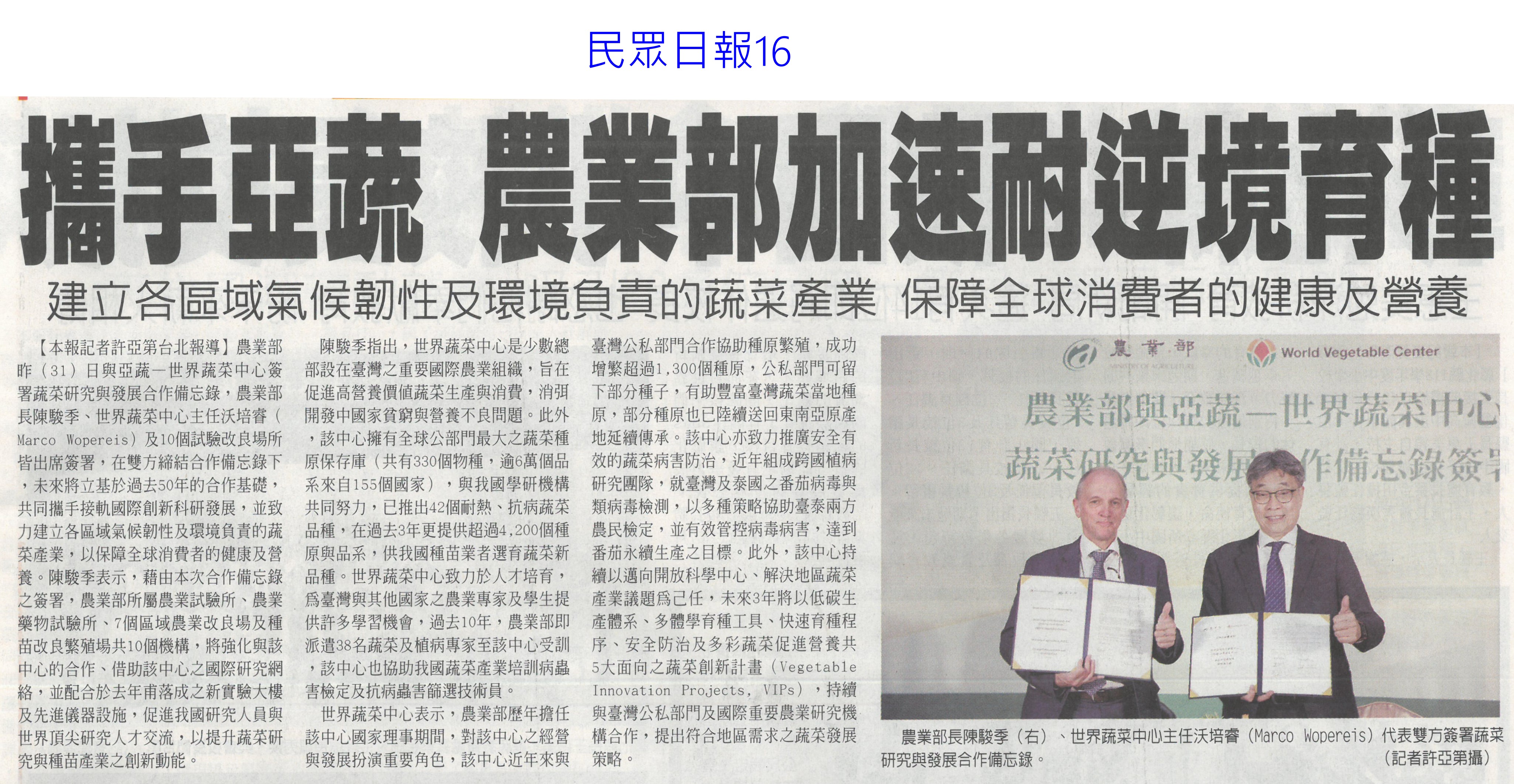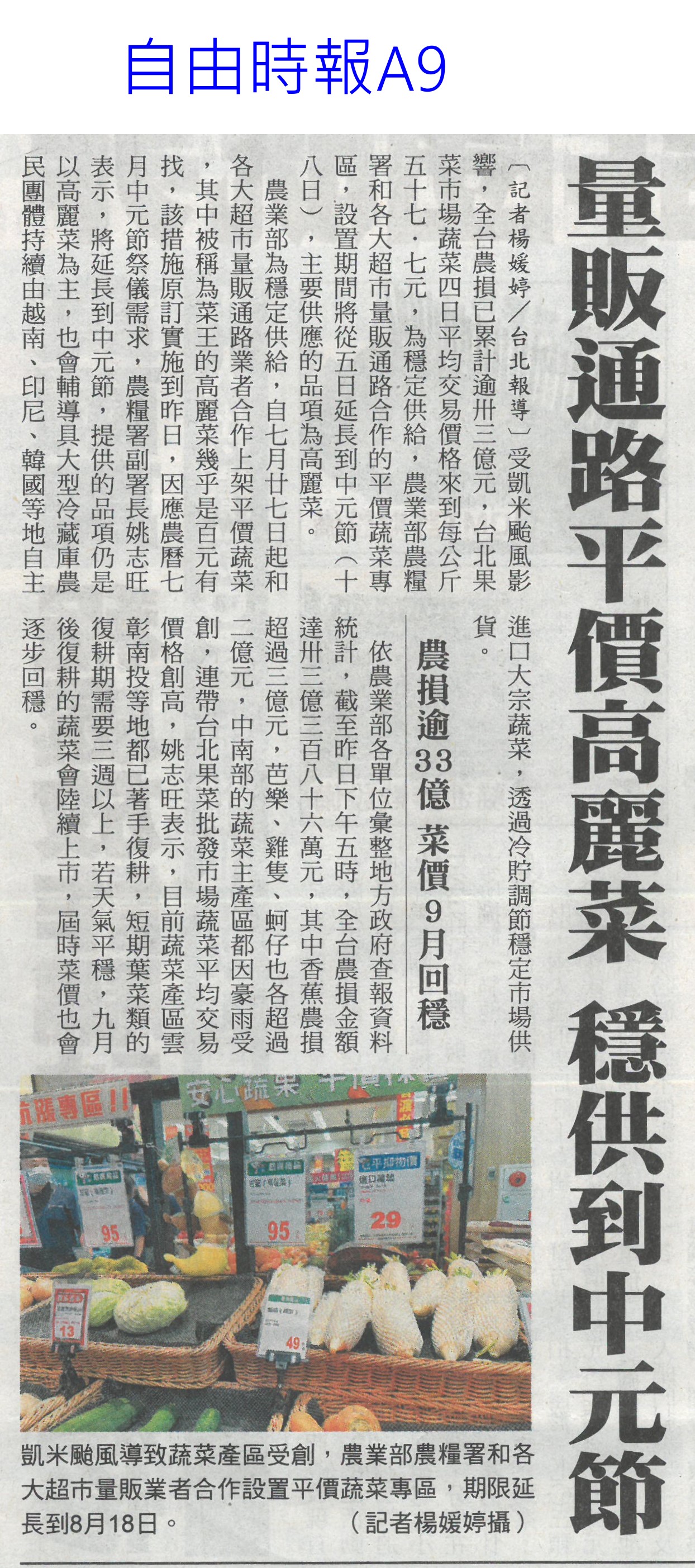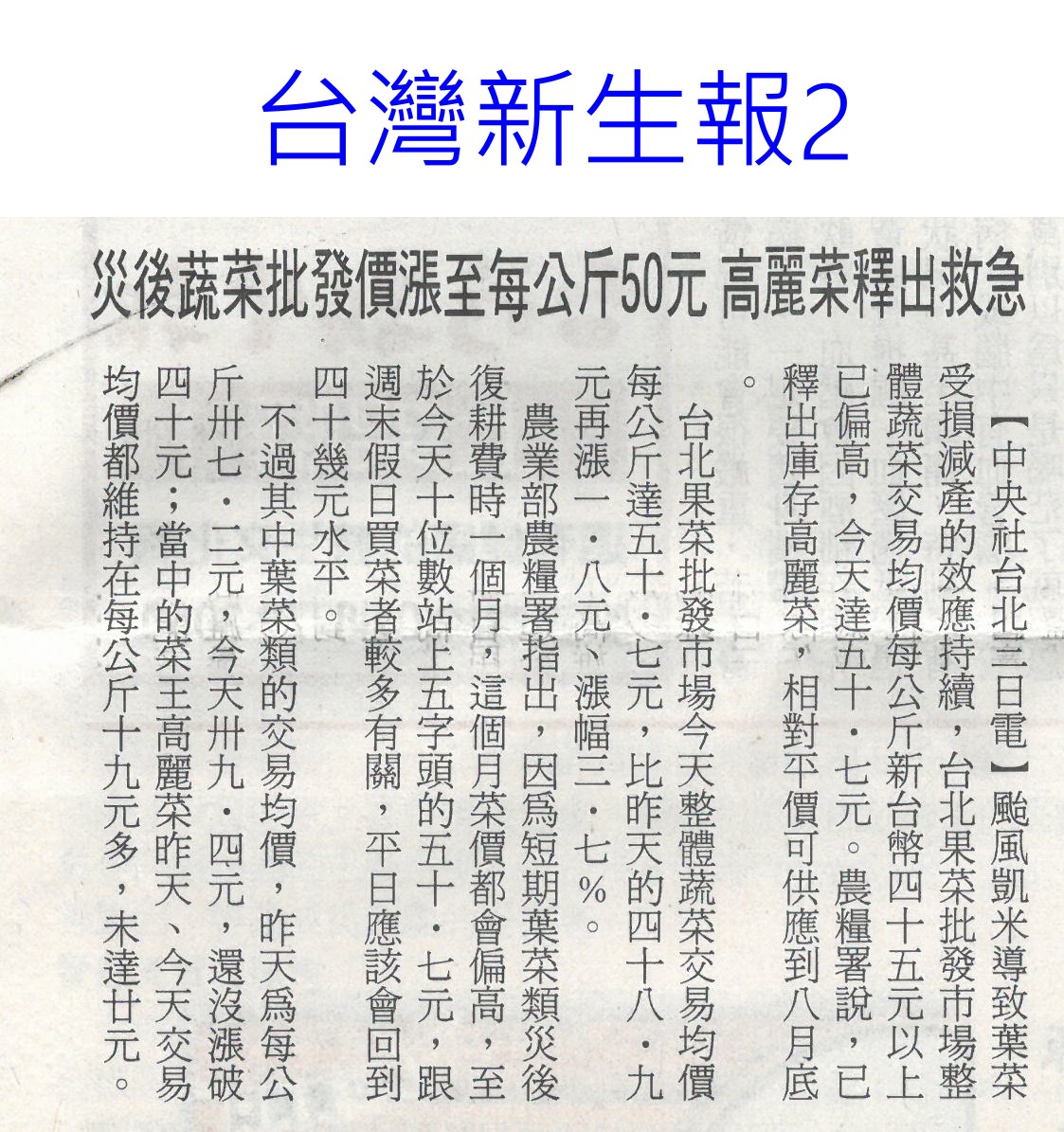 首頁番茄搶先報 番茄搶先報 排序 發布日期 更新日期 序號 發布日期 標題 841. 113/08/06 菜價飆 農糧署釋出庫存高麗菜(臺灣時報1) 842. 113/08/06 災後蔬菜批發價漲至每公斤50元 高麗菜釋出救急(台灣新生報2) 843. 113/08/06 菜價每公斤飆破50元 預估9月恢復平穩(中國時報A6) 844. 113/08/06 嘉義優鮮前進日本!福岡/東京接力開賣(中國時報A9) 845. 113/08/06 台南農特產品 外銷成績亮眼(中華日報B1) 846. 113/08/06 量販通路平價高麗菜 穩供到中元節(自由時報A9) 847. 113/08/06 颱風農損慘 菜販嘆快無菜可賣(臺灣時報13) 848. 113/08/06 菜價一日三市 主婦嘆漲到懷疑人生(中國時報A8) 849. 113/08/06 菜價還在高檔「連豆芽菜也翻倍漲」 農業部:本周起回穩 850. 113/08/05 美食展臺灣農業館12味 體驗五感豐富旅程(民眾日報5) 851. 113/08/05 香菜1斤上千元 四季豆600元 852. 113/08/04 菜價飆5年新高!每公斤漲至57元 農糧署估9月中恢復正常 853. 113/08/04 鮮吃鮮營 果然健康 854. 113/08/02 颱風菜價漲!超市平價專區開賣75元高麗菜!達人教5步驟炒菜脆又甜 855. 113/08/01 嘉義+台南農損高達5億(臺灣時報9) 856. 113/08/01 凱米農損續增 跨部會稽查哄抬物價(臺灣時報7) 857. 113/08/01 山上區農會/超商 簽物流合作(自由時報A11) 858. 113/08/01 農業部與亞蔬簽MOU 開發超抗逆境品種(自由時報A9) 859. 113/08/01 攜手亞蔬 農業部加速耐逆境育種(民眾日報16) 860. 113/08/01 山上區農會建構農漁會互聯網 擴大銷售在地農產品(民眾日報12) 第 43/176 頁,共 3511 筆上一頁到第123456789101112131415161718192021222324252627282930313233343536373839404142434445464748495051525354555657585960616263646566676869707172737475767778798081828384858687888990919293949596979899100101102103104105106107108109110111112113114115116117118119120121122123124125126127128129130131132133134135136137138139140141142143144145146147148149150151152153154155156157158159160161162163164165166167168169170171172173174175176頁下一頁每頁103070筆資料