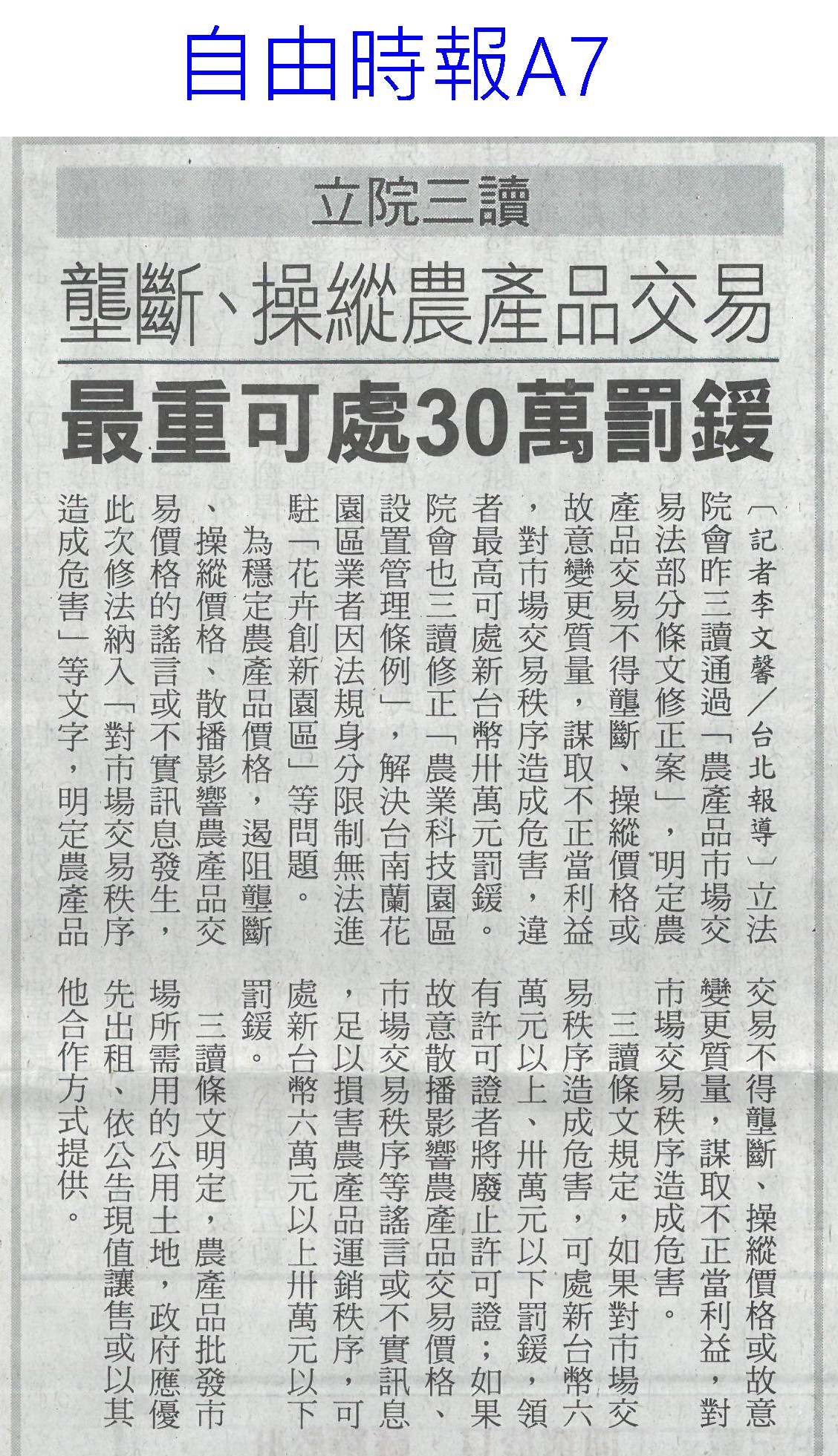 首頁番茄搶先報 番茄搶先報 排序 發布日期 更新日期 序號 發布日期 標題 101. 115/01/22 甘藍產銷調節新利器 液態氮急凍技術(民眾日報16) 102. 115/01/22 菠菜盛產大俗賣 民眾樂撿便宜(台灣時報10) 103. 115/01/22 台美談判 農產進口未以零關稅為前提(台灣新生報2) 104. 115/01/22 永康西勢拔蘿蔔 親子下田趣(中華日報B1) 105. 115/01/22 雲林好禮揪柑心 北上推廣(台灣新生報6) 106. 115/01/22 草莓遲到 估下周盛產(中華日報B1) 107. 115/01/22 政院拍板 老農津貼增至1萬(臺灣時報1) 108. 115/01/22 新農經營準備金 19日起開放申請(中華日報A4) 109. 115/01/22 青花菜大落價 民眾樂購(臺灣時報15) 110. 115/01/22 質譜快篩把關 蔬果安全有保障(民眾日報10) 111. 115/01/22 健康你我他/荷葉餐盤退暑氣 視覺味覺都滿足 112. 115/01/21 台南年節農產 進軍新北展售(台灣時報13) 113. 115/01/21 農業應對關稅 需變革而非補助(聯合報A10) 114. 115/01/21 新興農產業 四南坡地啤酒花試種成功(民眾日報16) 115. 115/01/21 嘉縣推12項伴手禮 台灣燈會限定聯名(自由時報A9) 116. 115/01/21 立院三讀 壟斷/操作農產品交易 最重可處30萬罰款(自由時報A7) 117. 115/01/21 嘉義優鮮伴手禮型錄 上線(台灣新生報6) 118. 115/01/21 嘉義優鮮迎燈會 搶攻年節商機(中國時報A9) 119. 115/01/21 台南官田社子農村社區土地重劃…地主過半同意 將送內政部審核 120. 115/01/21 品嘗正當時 台南鹽水番茄線上訂購限量送果乾 第 6/175 頁,共 3486 筆上一頁到第123456789101112131415161718192021222324252627282930313233343536373839404142434445464748495051525354555657585960616263646566676869707172737475767778798081828384858687888990919293949596979899100101102103104105106107108109110111112113114115116117118119120121122123124125126127128129130131132133134135136137138139140141142143144145146147148149150151152153154155156157158159160161162163164165166167168169170171172173174175頁下一頁每頁103070筆資料