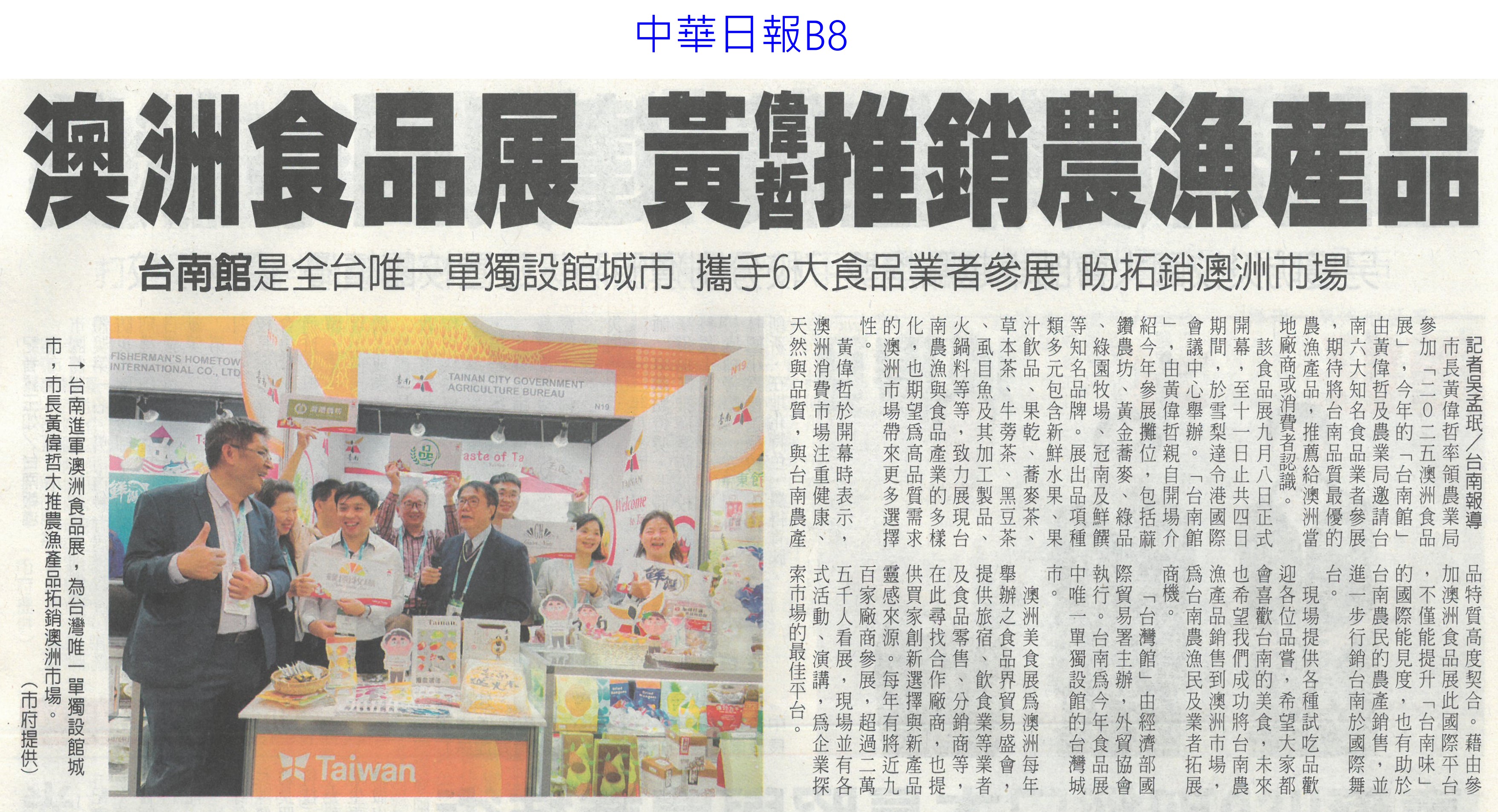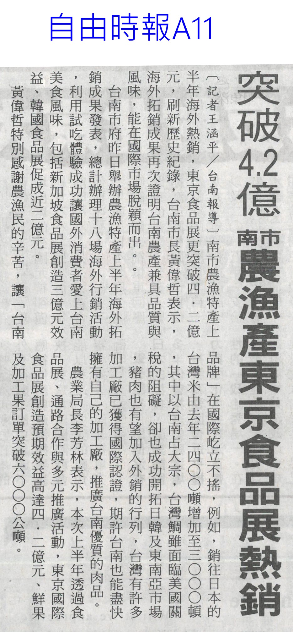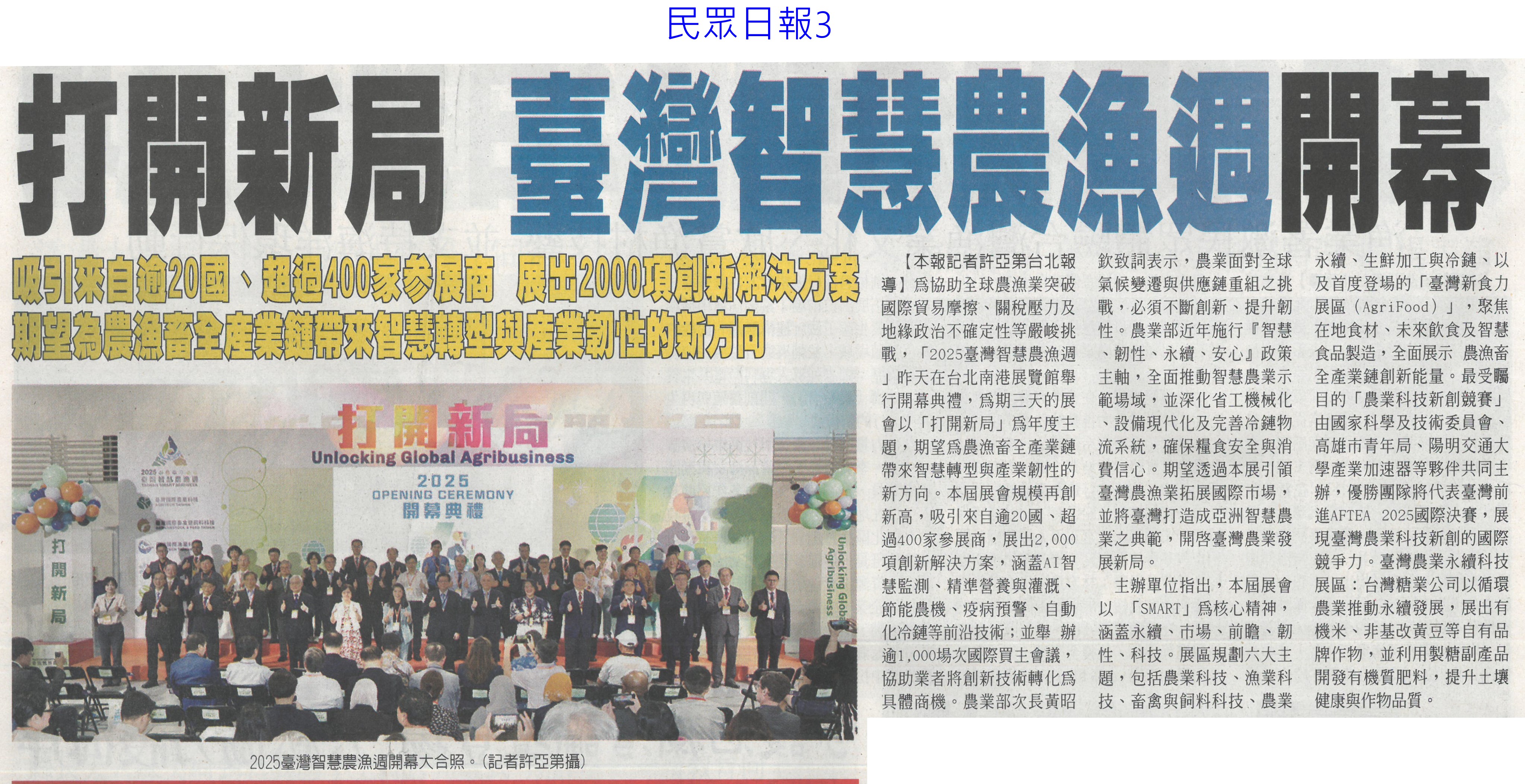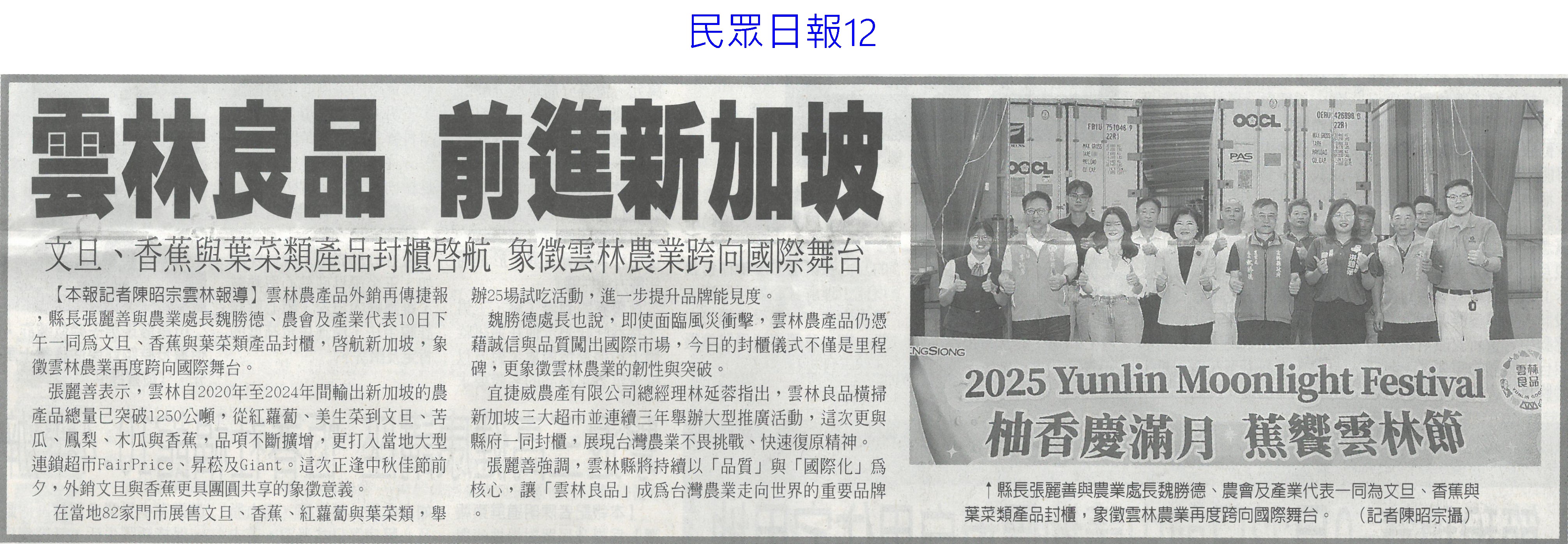 首頁萵苣觀新聞 萵苣觀新聞 排序 發布日期 更新日期 序號 發布日期 標題 181. 114/09/16 黃偉哲訪山形市力薦台南農特產(中華日報B8) 182. 114/09/12 澳洲食品展台灣館 台南6業者進駐(自由時報A9) 183. 114/09/12 澳洲食品展 黃偉哲推銷農漁產品(中華日報B8) 184. 114/09/12 南市安定/官田獲全國優良農業產銷班殊榮(台灣新生報3) 185. 114/09/12 稻田轉作雜糧 雲林高鐵沿線 節水減緩地層下陷(民眾日報2) 186. 114/09/12 農遊體驗超夯 年產值逾110億(自由時報A7) 187. 114/09/12 賣場推平價高麗菜 一顆90元有找(台灣時報13) 188. 114/09/12 丹娜絲風災/728豪雨 地方送件牛步 農民救助金卡關(自由時報A7) 189. 114/09/12 雲林良品大躍進 蔬果外銷逾千噸(台灣新生報6) 190. 114/09/12 雲林蔬果銷星 封櫃啟航(中華日報B6) 191. 114/09/12 雲林良品 前進新加坡(民眾日報12) 192. 114/09/09 雲林高鐵沿線推雜糧旱作 下陷趨緩(自由時報A11) 193. 114/09/09 大蒜種植登記 農糧署籲勿搶種(中華日報B5) 194. 114/09/05 農改場推農廢再利用 落花生 玉米增產40%(自由時報A8) 195. 114/09/05 農業AI發展藍圖 產官學研集思廣益(民眾日報6) 196. 114/09/05 農村好物選拔 打造品牌新亮點(民眾日報3) 197. 114/09/05 葉菜價崩 每公斤百元剩10幾元(中國時報A8) 198. 114/09/05 突破4.2億 南市農漁產東京食品展熱銷(自由時報A11) 199. 114/09/05 南市農漁特產 上半年海外熱銷(台灣新生報6) 200. 114/09/05 打開新局 臺灣智慧農漁開幕(民眾日報3) 第 10/141 頁,共 2807 筆上一頁到第123456789101112131415161718192021222324252627282930313233343536373839404142434445464748495051525354555657585960616263646566676869707172737475767778798081828384858687888990919293949596979899100101102103104105106107108109110111112113114115116117118119120121122123124125126127128129130131132133134135136137138139140141頁下一頁每頁103070筆資料