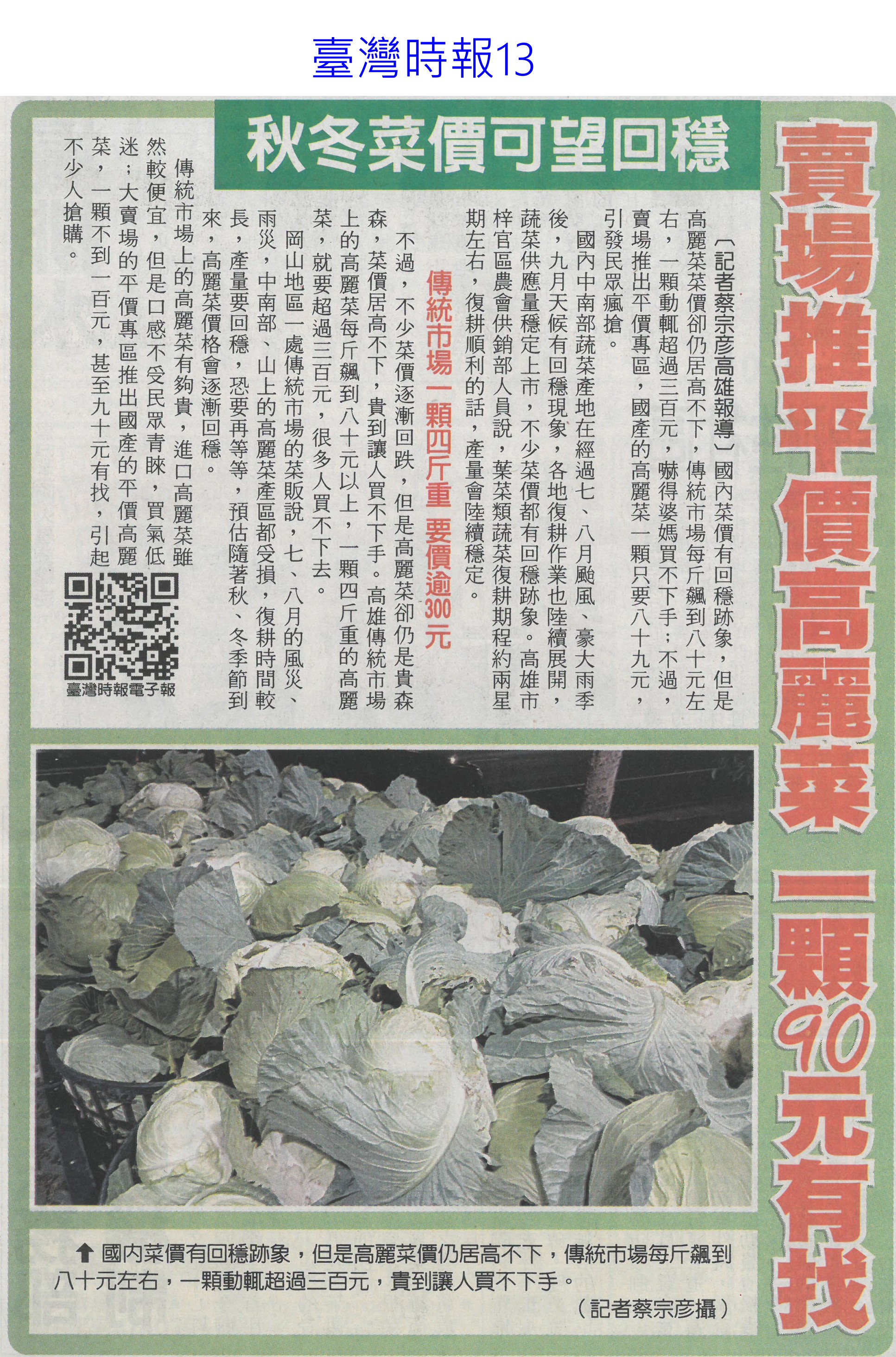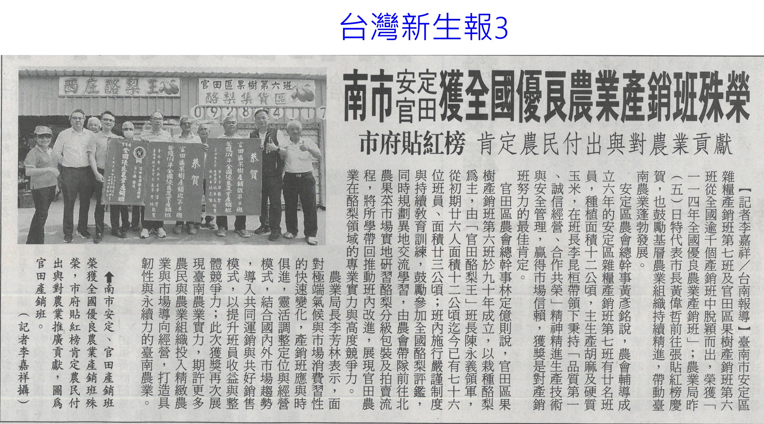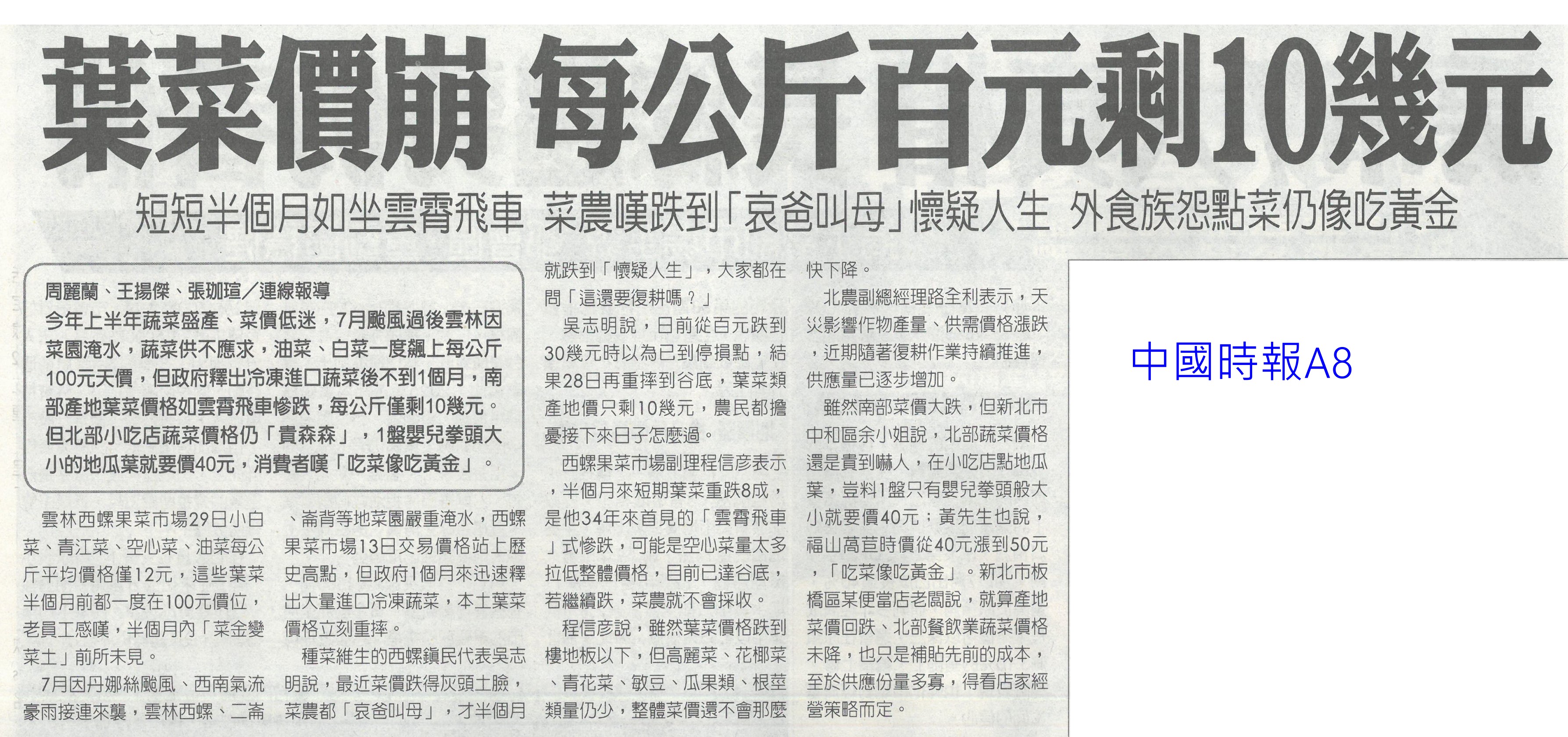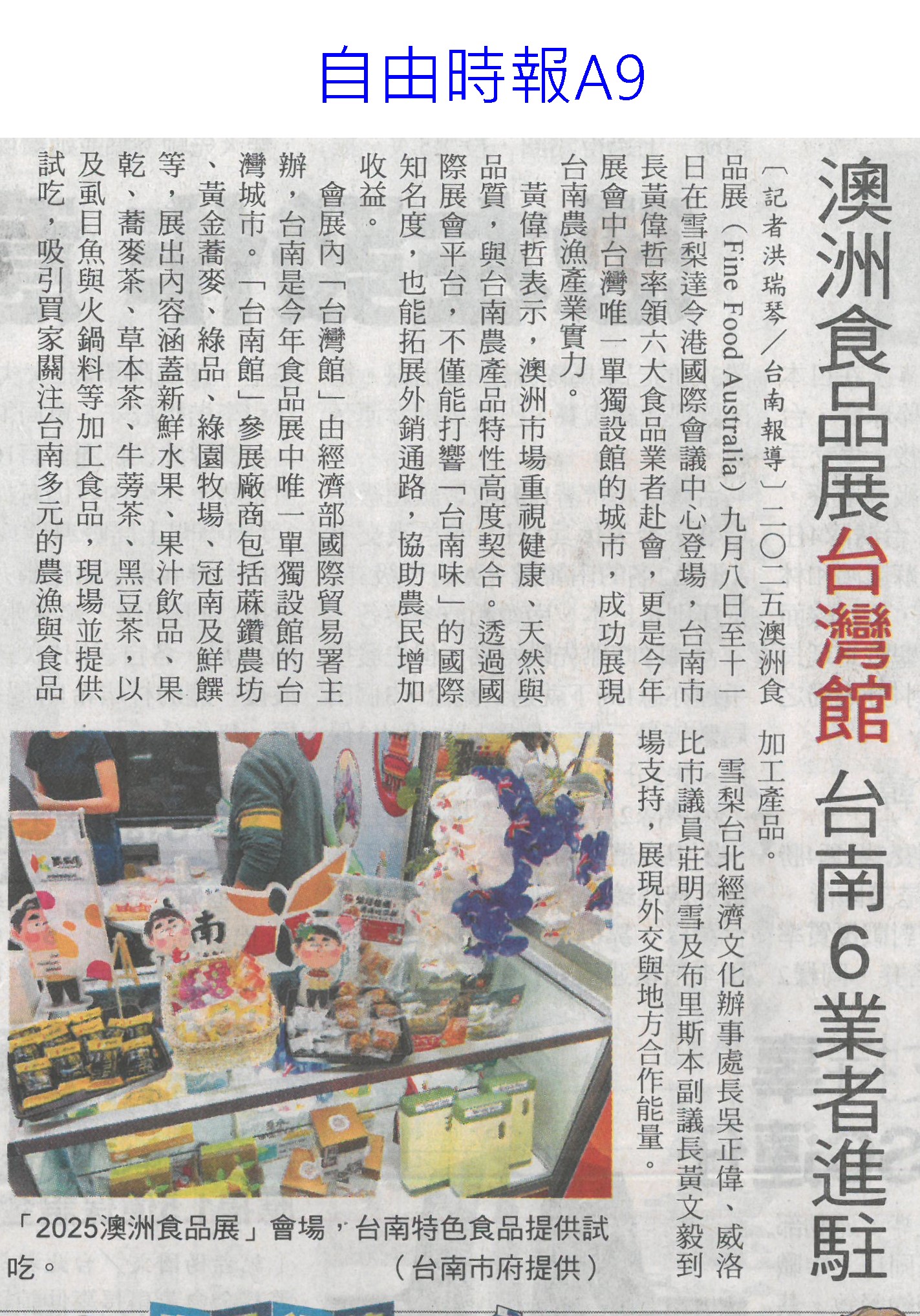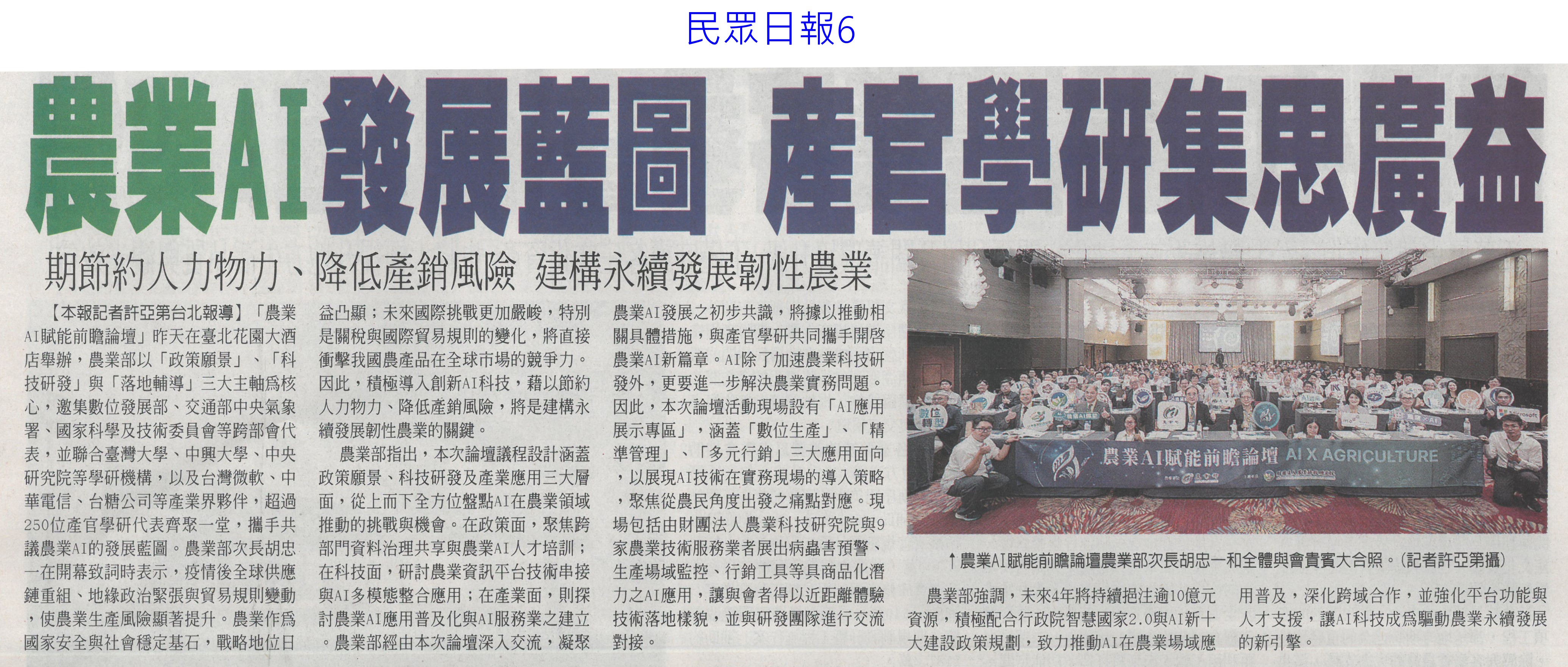 首頁萵苣觀新聞 萵苣觀新聞 排序 發布日期 更新日期 序號 發布日期 標題 181. 114/09/16 黃偉哲訪山形市力薦台南農特產(中華日報B8) 182. 114/09/12 澳洲食品展台灣館 台南6業者進駐(自由時報A9) 183. 114/09/12 澳洲食品展 黃偉哲推銷農漁產品(中華日報B8) 184. 114/09/12 南市安定/官田獲全國優良農業產銷班殊榮(台灣新生報3) 185. 114/09/12 稻田轉作雜糧 雲林高鐵沿線 節水減緩地層下陷(民眾日報2) 186. 114/09/12 農遊體驗超夯 年產值逾110億(自由時報A7) 187. 114/09/12 賣場推平價高麗菜 一顆90元有找(台灣時報13) 188. 114/09/12 丹娜絲風災/728豪雨 地方送件牛步 農民救助金卡關(自由時報A7) 189. 114/09/12 雲林良品大躍進 蔬果外銷逾千噸(台灣新生報6) 190. 114/09/12 雲林蔬果銷星 封櫃啟航(中華日報B6) 191. 114/09/12 雲林良品 前進新加坡(民眾日報12) 192. 114/09/09 雲林高鐵沿線推雜糧旱作 下陷趨緩(自由時報A11) 193. 114/09/09 大蒜種植登記 農糧署籲勿搶種(中華日報B5) 194. 114/09/05 農改場推農廢再利用 落花生 玉米增產40%(自由時報A8) 195. 114/09/05 農業AI發展藍圖 產官學研集思廣益(民眾日報6) 196. 114/09/05 農村好物選拔 打造品牌新亮點(民眾日報3) 197. 114/09/05 葉菜價崩 每公斤百元剩10幾元(中國時報A8) 198. 114/09/05 突破4.2億 南市農漁產東京食品展熱銷(自由時報A11) 199. 114/09/05 南市農漁特產 上半年海外熱銷(台灣新生報6) 200. 114/09/05 打開新局 臺灣智慧農漁開幕(民眾日報3) 第 10/141 頁,共 2807 筆上一頁到第123456789101112131415161718192021222324252627282930313233343536373839404142434445464748495051525354555657585960616263646566676869707172737475767778798081828384858687888990919293949596979899100101102103104105106107108109110111112113114115116117118119120121122123124125126127128129130131132133134135136137138139140141頁下一頁每頁103070筆資料