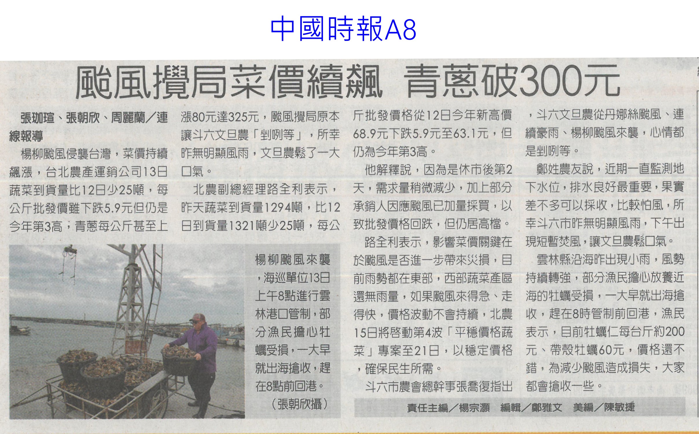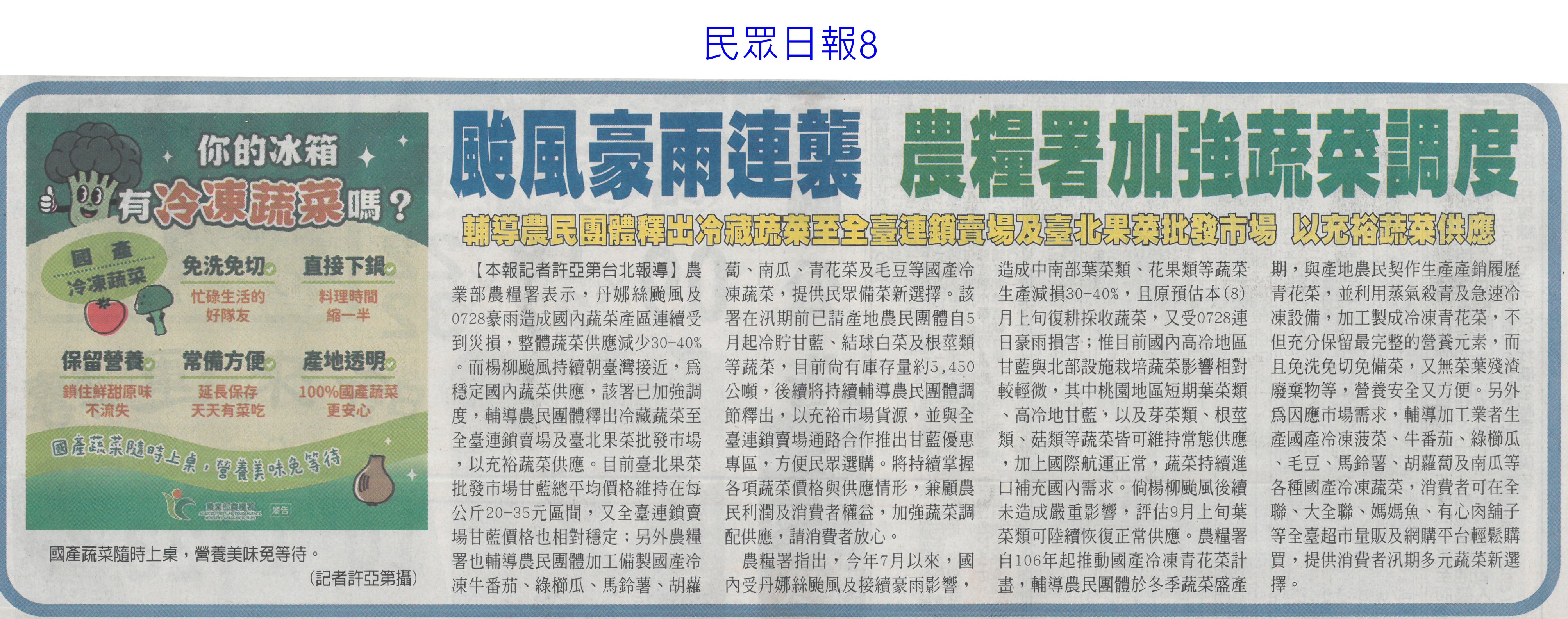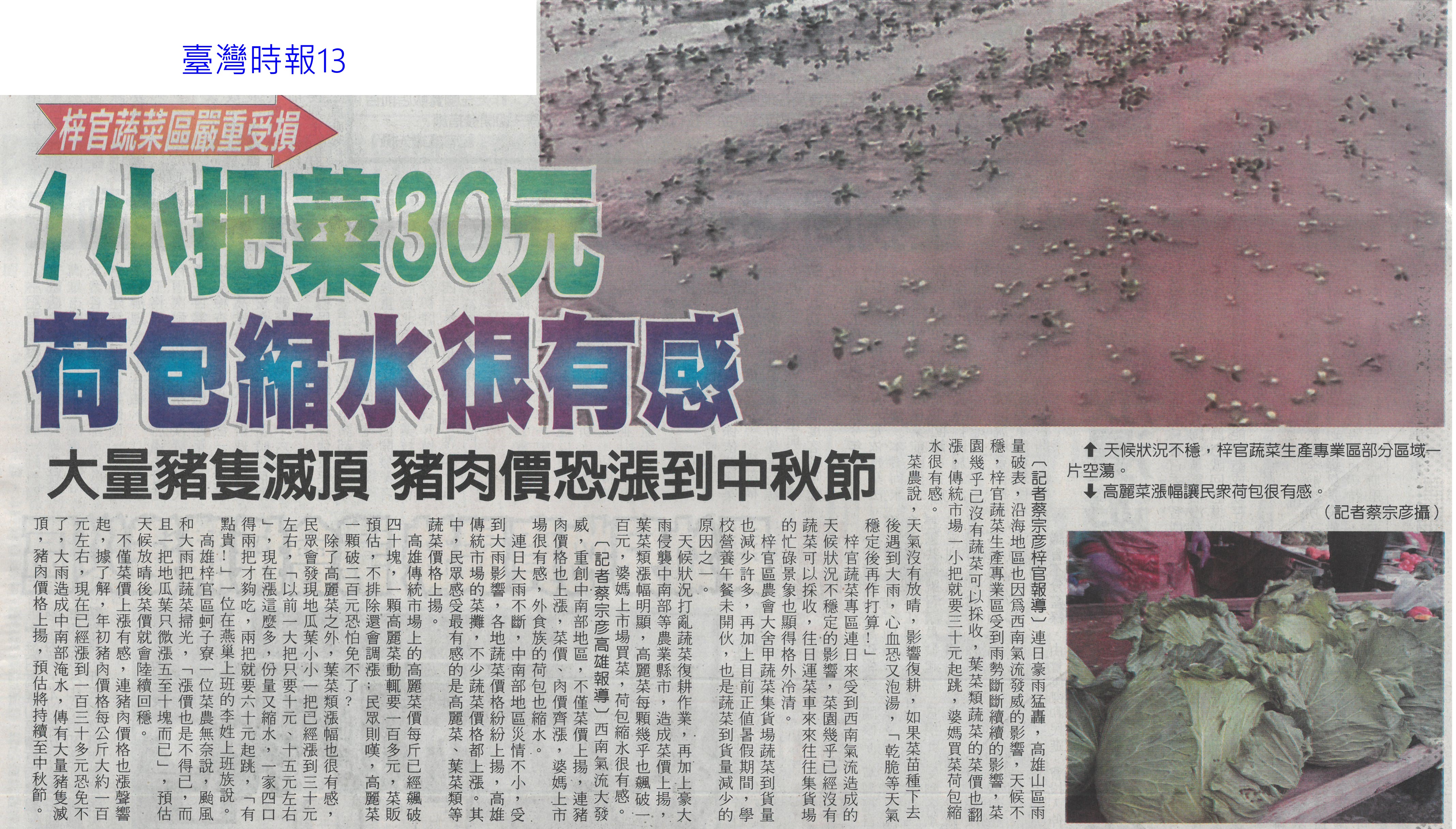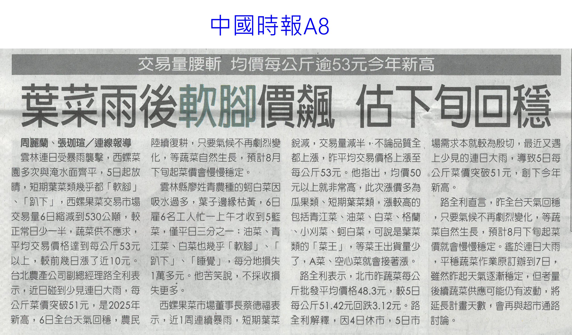 首頁萵苣觀新聞 萵苣觀新聞 排序 發布日期 更新日期 序號 發布日期 標題 201. 114/09/03 東京食品展效益破4.2 創新高(中華日報B8) 202. 114/09/02 台南農產攻韓 締造2億商機(台灣新生報6) 203. 114/09/01 陳駿季:遇農產品短缺 政府不再主導輸入(自由時報A7) 204. 114/09/01 民視全民農LINE秀 推廣雲林好物(民眾日報8) 205. 114/08/26 農改場推農業資材再利用效益佳(中華日報B8) 206. 114/08/21 菜價漲翻天 高麗菜一顆三 四百元(臺灣時報13) 207. 114/08/21 葉菜供應回穩 批發價降到5字頭(自由時報A9) 208. 114/08/21 農業育成中心成果發表 彰顯創育軟實力(民眾日報16) 209. 114/08/21 天災救助規定僵化 陳駿季允檢討(中華日報B2) 210. 114/08/14 菜價漲翻天逼近歷史新高(臺灣時報17) 211. 114/08/14 台東颳15級強風 農業部釋菜穩供(自由時報A8) 212. 114/08/14 颱風豪雨連襲 農糧署加強蔬菜調度(民眾日報8) 213. 114/08/14 農業部調釋冷藏 進口蔬菜(中華日報A1) 214. 114/08/14 颱風攪局菜價續飆(中國時報A8) 215. 114/08/14 農業部釋出冷藏蔬菜加強進口(臺灣時報3) 216. 114/08/13 楊柳颱風菜價見漲 農業部視市場供需調節釋出冷藏蔬菜、強化進口 217. 114/08/07 728豪雨農損逾3億 屏東最慘(中國時報A8) 218. 114/08/07 葉菜雨後軟腳價飆 估下旬回穩(中國時報A8) 219. 114/08/05 一小把菜30元 荷包縮水很有感(臺灣時報13) 220. 114/08/05 全台農損逾2.6億 蔬菜供應下月初回穩(自由時報A7) 第 11/141 頁,共 2807 筆上一頁到第123456789101112131415161718192021222324252627282930313233343536373839404142434445464748495051525354555657585960616263646566676869707172737475767778798081828384858687888990919293949596979899100101102103104105106107108109110111112113114115116117118119120121122123124125126127128129130131132133134135136137138139140141頁下一頁每頁103070筆資料