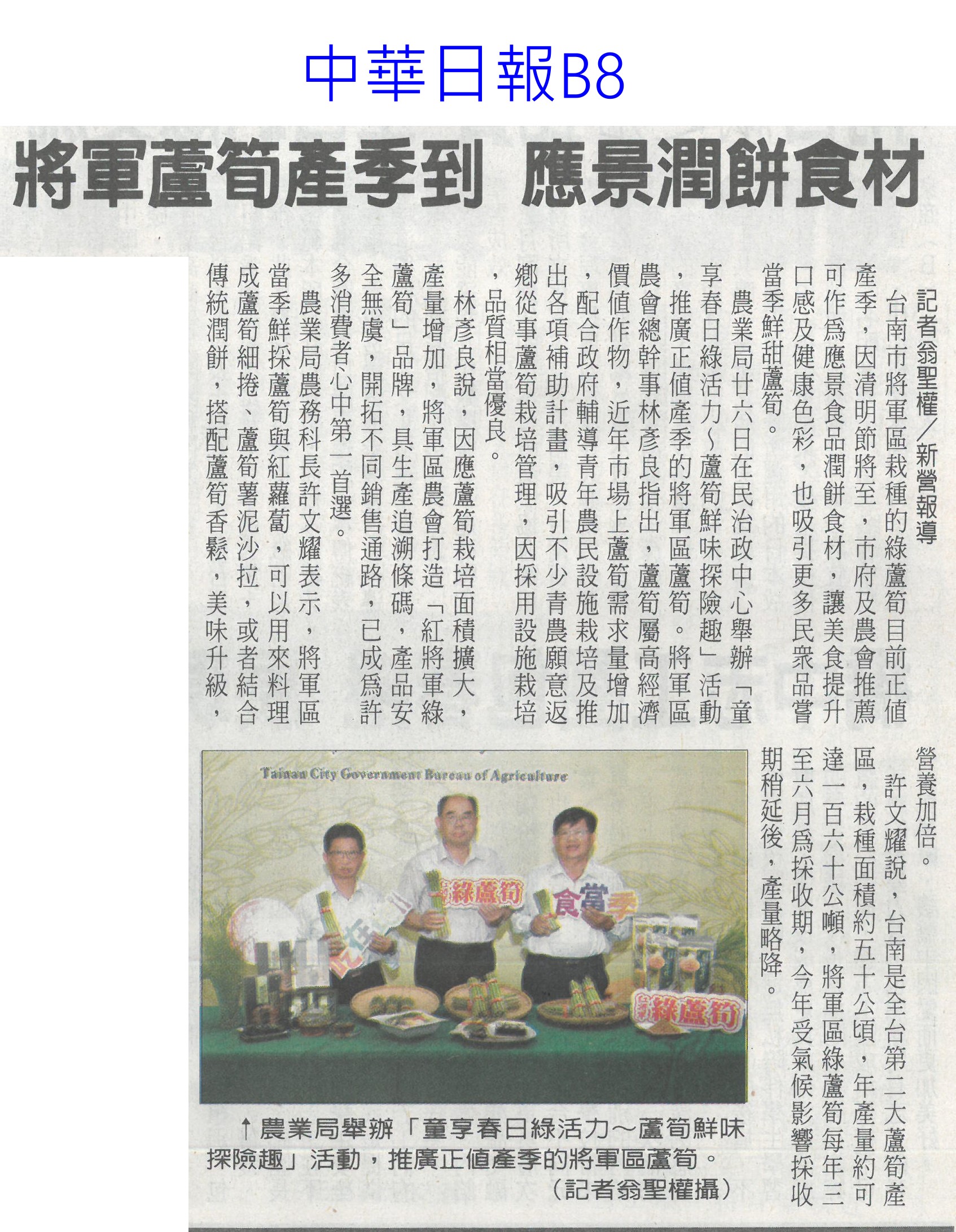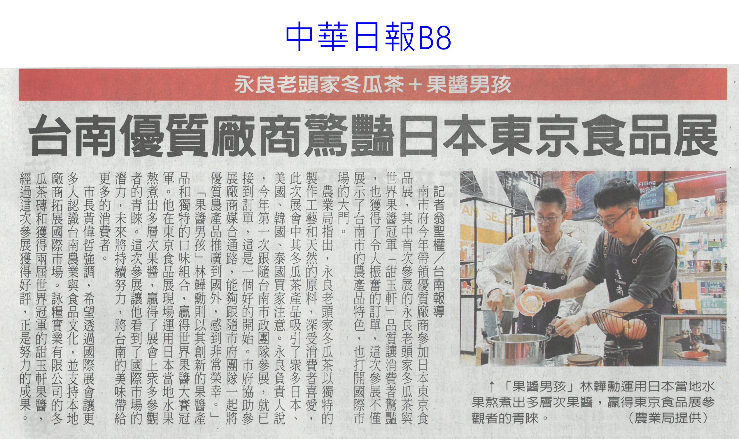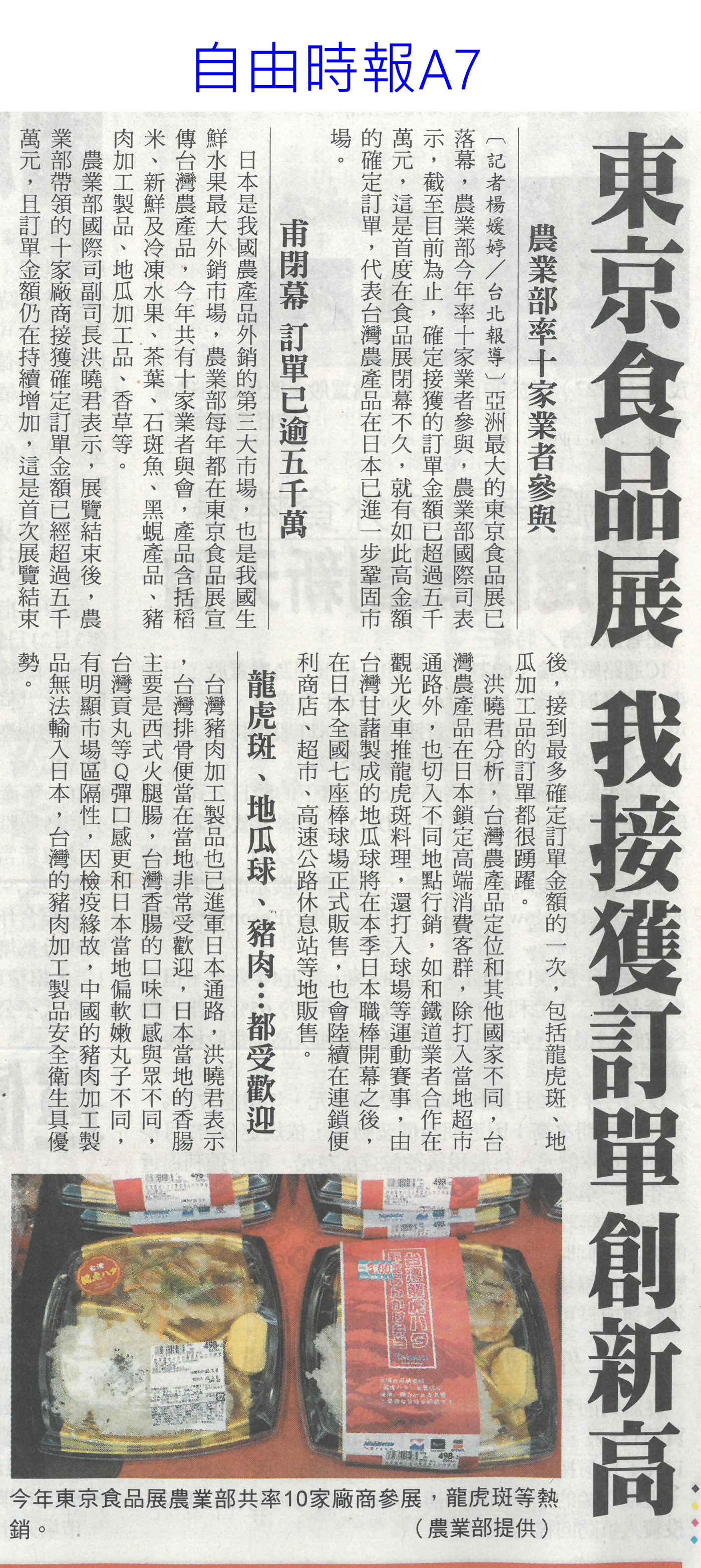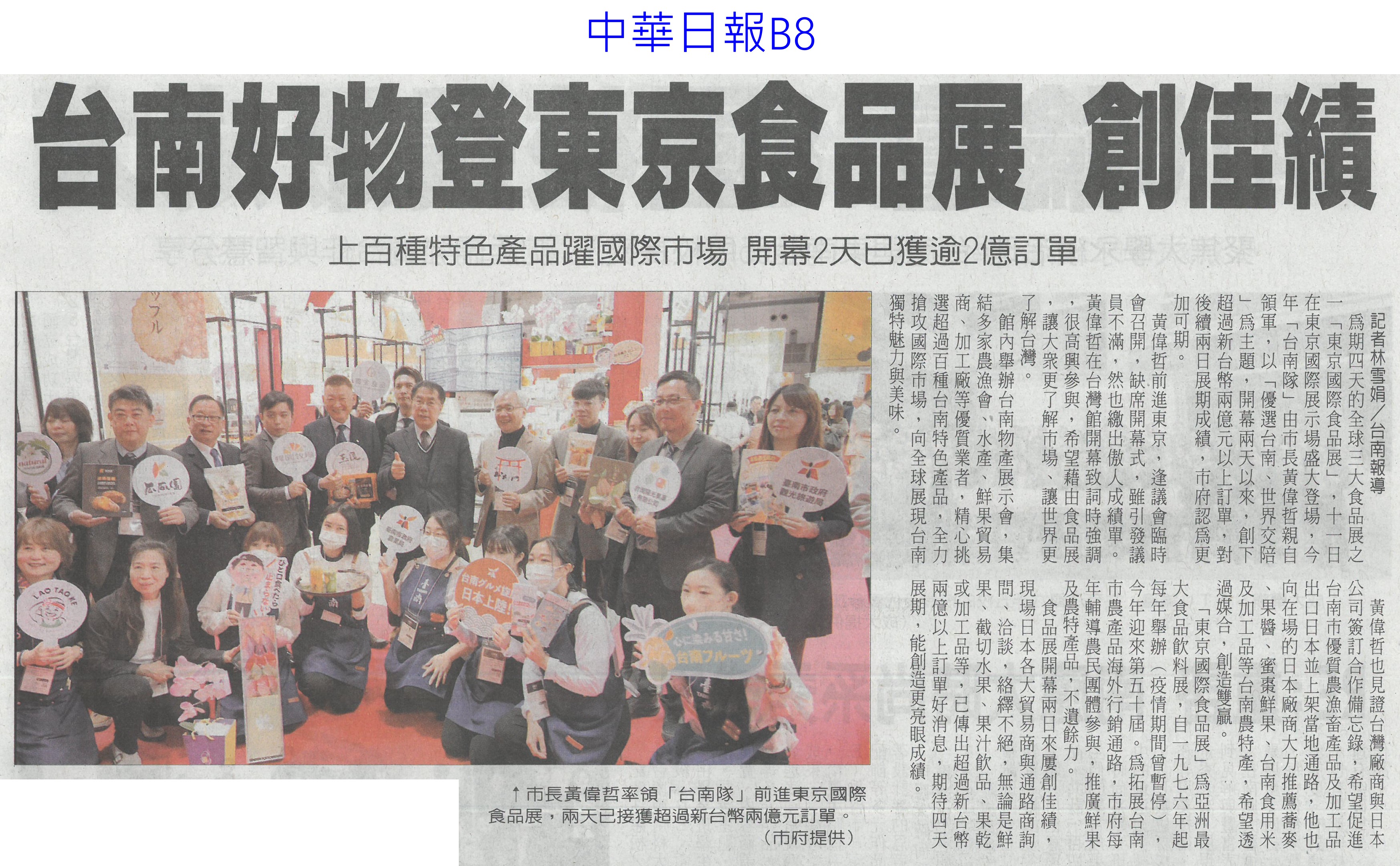 首頁萵苣觀新聞 萵苣觀新聞 排序 發布日期 更新日期 序號 發布日期 標題 321. 114/04/09 台南 雲林赴星推農產 搶東南亞商機(中國時報A9) 322. 114/04/08 農業部:補貼專案農貸利息最高1.5%(臺灣時報2) 323. 114/04/08 雲林良品前往新加坡食品展搶訂單(台灣新生報6) 324. 114/04/08 進軍星`日 雲林良品國際肯定(中國時報A9) 325. 114/04/02 植物診療師高考 8月將首次舉辦(民眾日報2) 326. 114/04/02 亞蔬種原庫翻新 庫存容量增2.5倍(自由時報A8) 327. 114/04/02 亞蔬種原庫翻新 落成啟用(中華日報B1) 328. 114/03/27 農業 外交部 組智慧新農業顧問團(民眾日報4) 329. 114/03/27 雲縣府分享用智慧農業打造韌性城鄉(台灣新生報5) 330. 114/03/27 東京食品展 我接獲訂單創新高(自由時報A7) 331. 114/03/27 雲縣府籲中央放寬農保資格清查(臺灣時報18) 332. 114/03/27 將軍蘆筍季到 應景潤餅食材(中華日報B8) 333. 114/03/18 農糧署米糧烘焙精品館 秀新招(民眾日報4) 334. 114/03/17 出租農地設光電? 雲林逾5千農民 面臨強制退保(聯合報A6) 335. 114/03/17 台南優質廠商驚豔日本東京食品展(中華日報B8) 336. 114/03/17 張麗善訪日 考察農業 地方創生(中國時報A9) 337. 114/03/13 東京食品展 台南2天接2億訂單(臺灣時報19) 338. 114/03/13 雲林良品強勢出擊東京食品展(台灣新生報6) 339. 114/03/13 台南進軍東京國際食品展(台灣新生報6) 340. 114/03/13 台南好物登東京 創佳績(中華日報B8) 第 17/141 頁,共 2813 筆上一頁到第123456789101112131415161718192021222324252627282930313233343536373839404142434445464748495051525354555657585960616263646566676869707172737475767778798081828384858687888990919293949596979899100101102103104105106107108109110111112113114115116117118119120121122123124125126127128129130131132133134135136137138139140141頁下一頁每頁103070筆資料