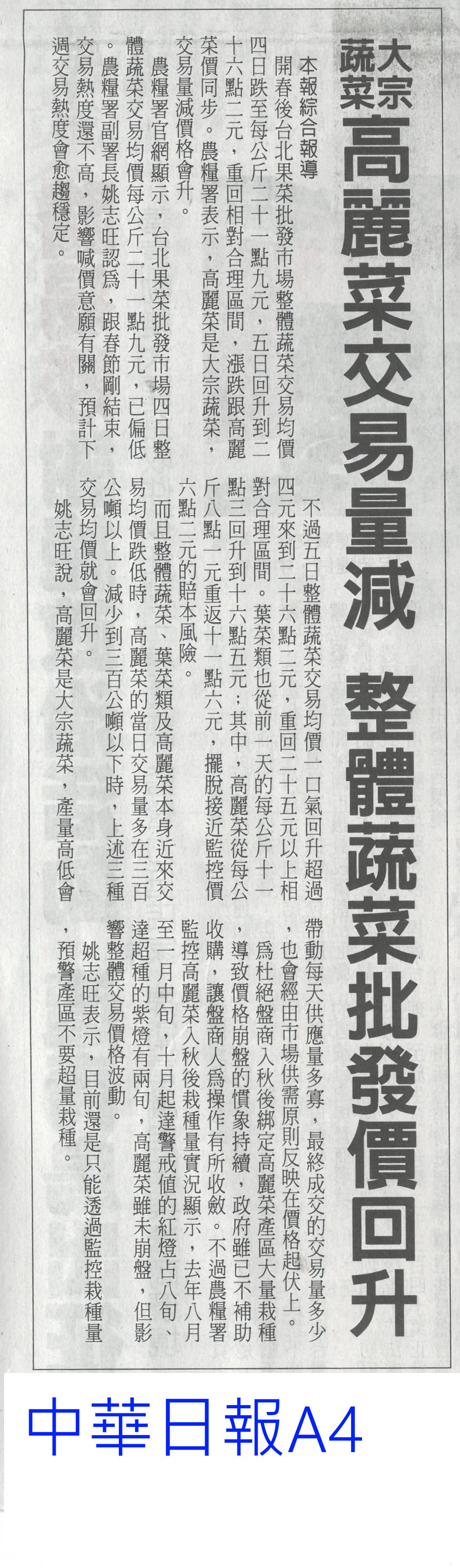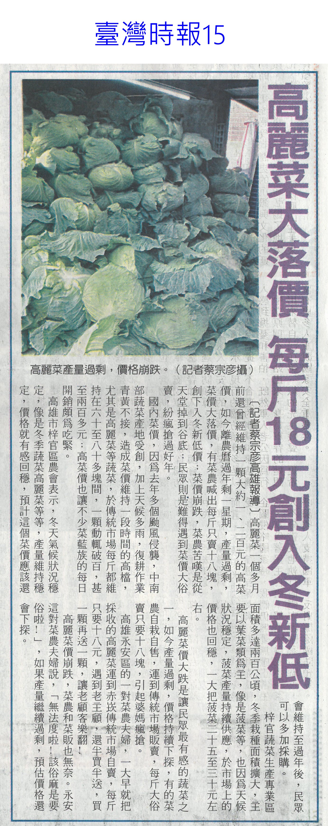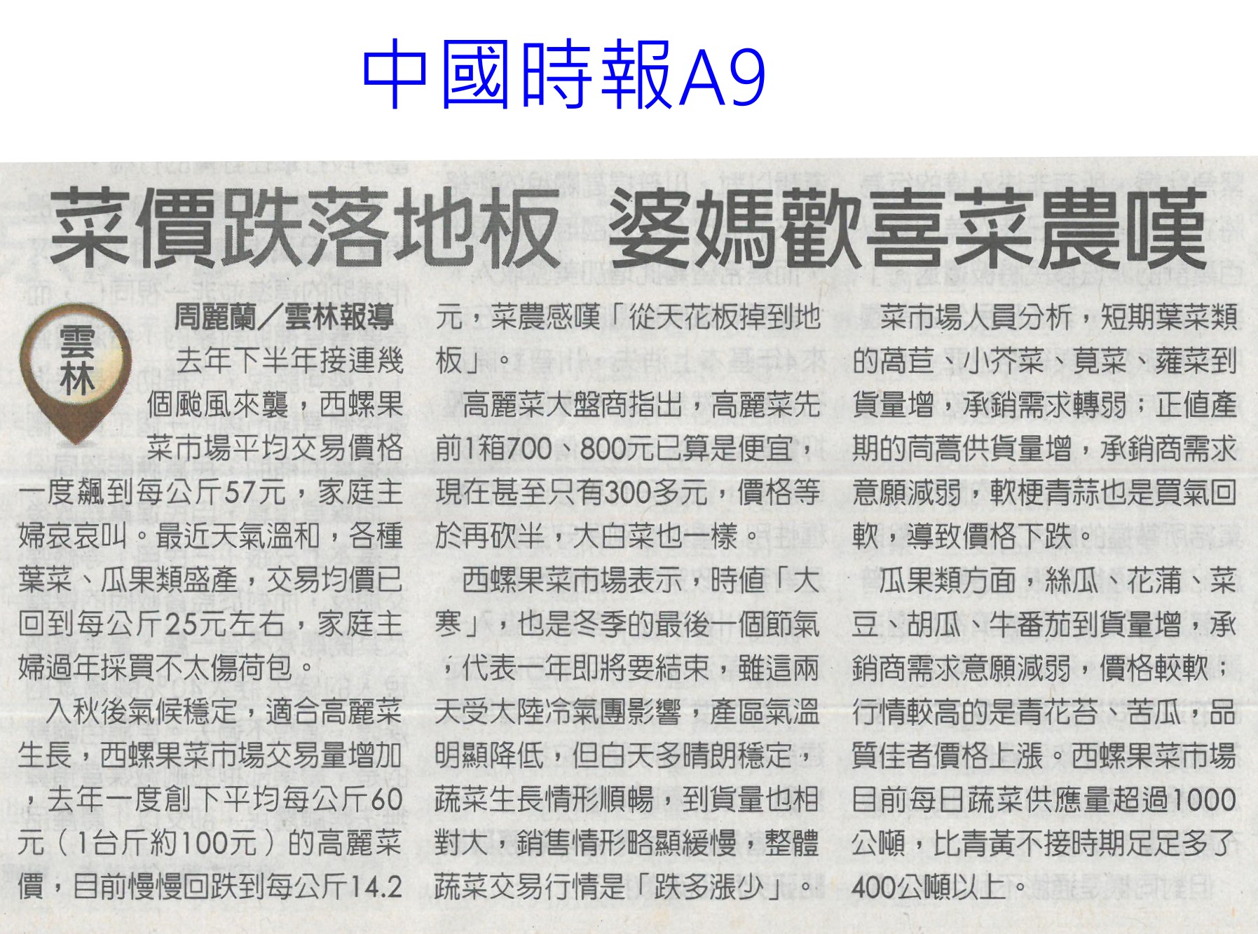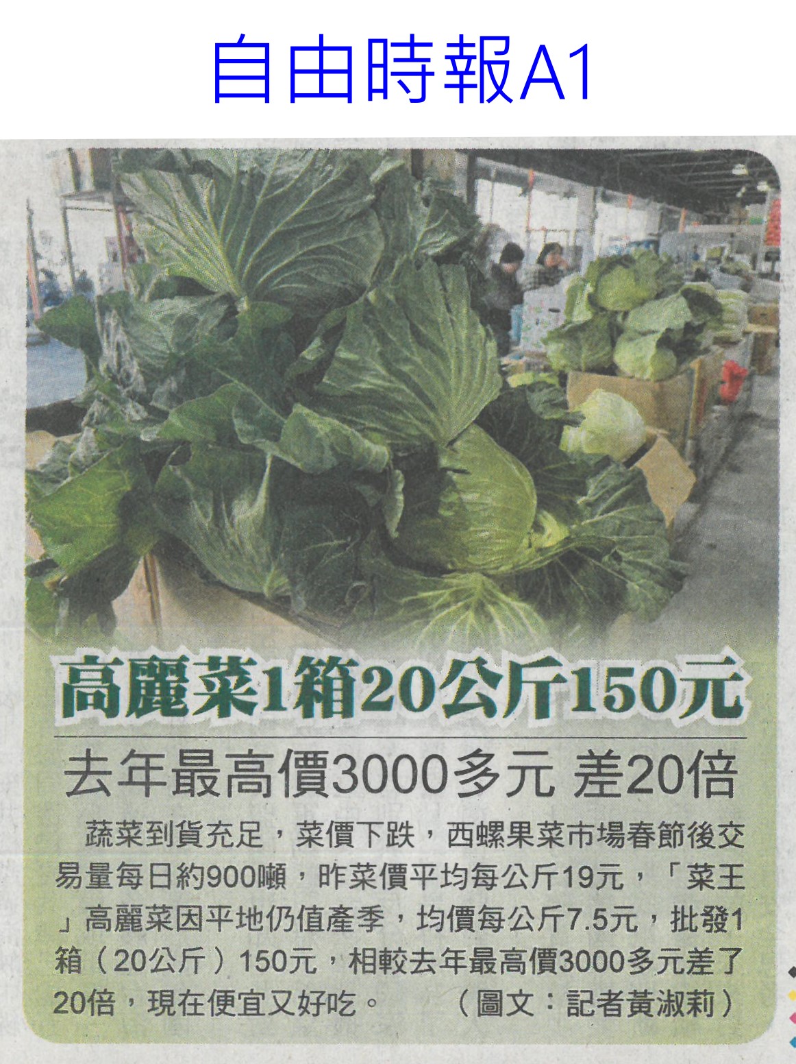 首頁萵苣觀新聞 萵苣觀新聞 排序 發布日期 更新日期 序號 發布日期 標題 381. 114/02/18 農業經營準備金 今起開放申請(民眾日報14) 382. 114/02/11 雲縣智慧農業補助開跑(台灣新生報6) 383. 114/02/11 雲林推智慧農業 最高補助百萬(中國時報A9) 384. 114/02/10 產量充足 葉菜1袋僅10元(中華日報A4) 385. 114/02/10 農業部長勘楠西南化災損(中華日報B2) 386. 114/02/10 蔬菜大宗高麗菜交易量減 整體蔬菜批發價回升(中華日報A4) 387. 114/02/10 農友休耕轉作申報 8日截止(中華日報B4) 388. 114/02/10 青農創新 卓蘭智慧溫網啓用(民眾日報4) 389. 114/02/10 對等關稅來勢洶 農部最憂蝴蝶蘭(中國時報A2) 390. 114/02/10 高麗菜1箱20公斤150元(自由時報A1) 391. 114/02/05 冷氣團來襲 農改場籲農友防寒害(中華日報B8) 392. 114/02/04 結合六感六味 引導食農教育(台灣新生報4) 393. 114/02/04 開市首日 超市高麗菜每顆60元(臺灣時報10) 394. 114/02/04 東京食品展 我參展規模遽減(自由時報A9) 395. 114/01/23 好運農總來 農業易遊網全新改版(民眾日報16) 396. 114/01/23 命脈錢被刪農業部:影響運作(臺灣時報4) 397. 114/01/23 高麗菜大落價 每斤18元創入冬新低(臺灣時報15) 398. 114/01/23 雲林菜價跌落地板 婆媽歡喜菜農嘆(中國時報A9) 399. 114/01/21 農業部:請國會共同守護臺灣農業(民眾日報2) 400. 114/01/20 春節農產供應充裕 請安心採購(民眾日報4) 第 20/141 頁,共 2813 筆上一頁到第123456789101112131415161718192021222324252627282930313233343536373839404142434445464748495051525354555657585960616263646566676869707172737475767778798081828384858687888990919293949596979899100101102103104105106107108109110111112113114115116117118119120121122123124125126127128129130131132133134135136137138139140141頁下一頁每頁103070筆資料