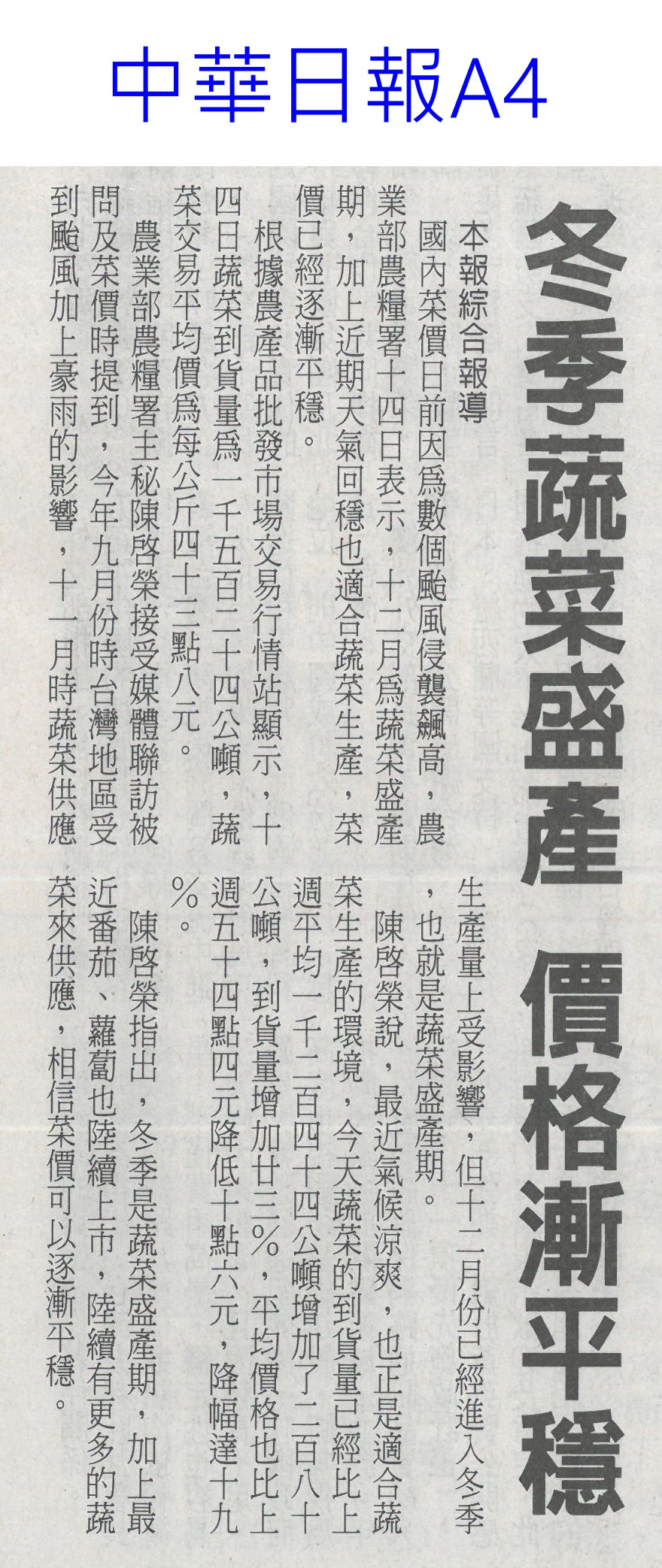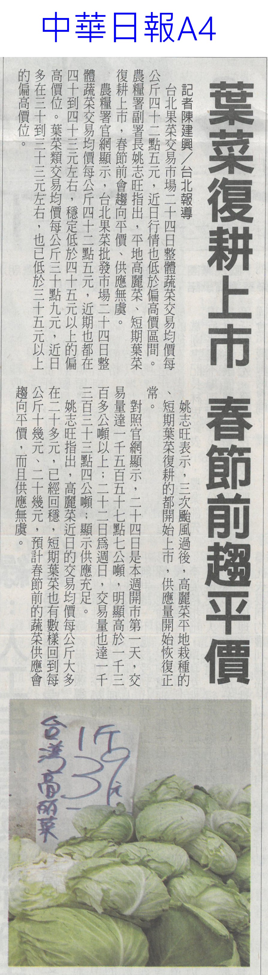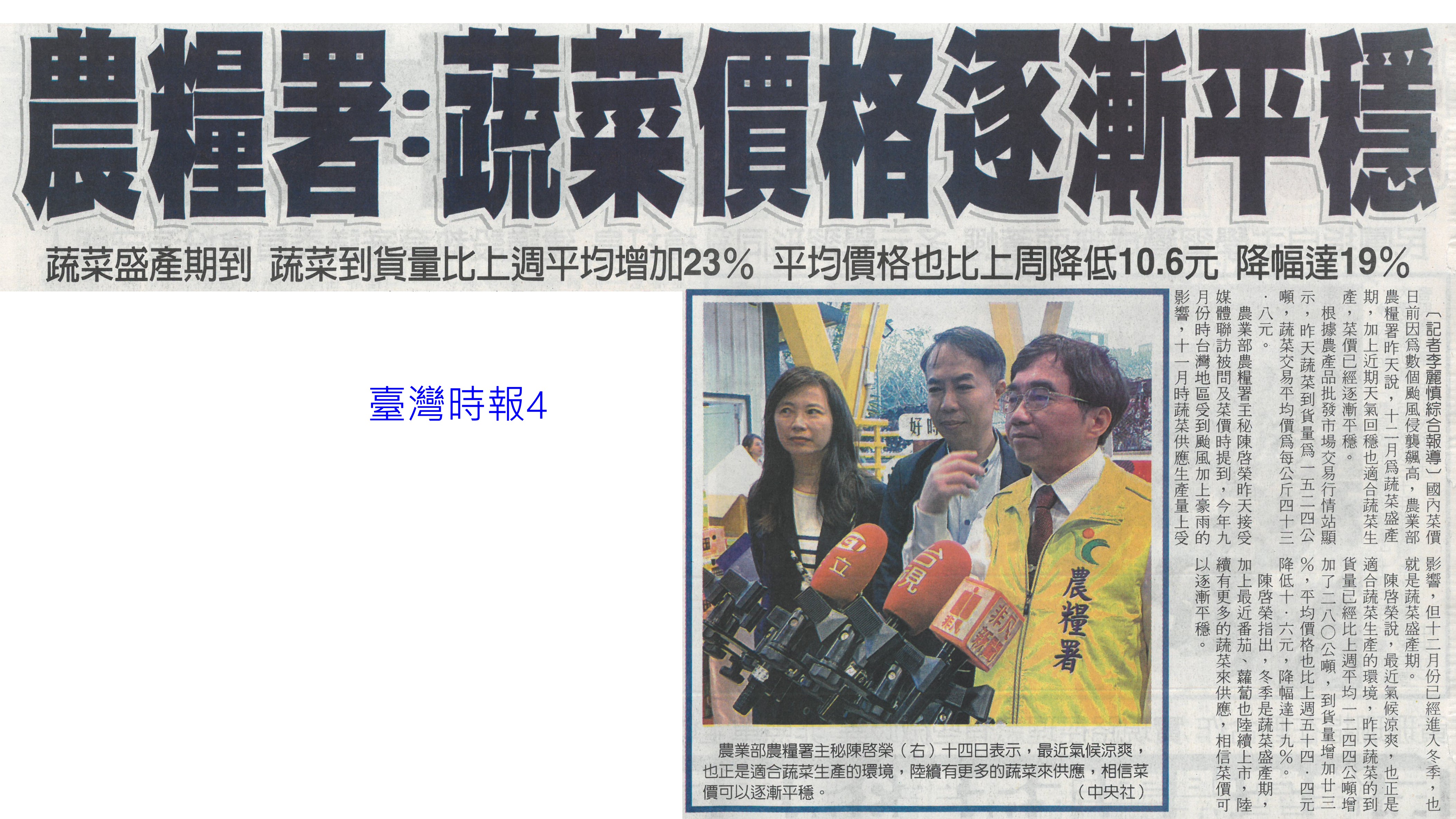 首頁萵苣觀新聞 萵苣觀新聞 排序 發布日期 更新日期 序號 發布日期 標題 421. 114/01/06 高麗菜豐收!每斤跌破20元「恐崩盤」 水果估一路貴到4月 422. 114/01/02 菜價回跌 高麗菜每顆百元有找(臺灣時報13) 423. 114/01/02 翁章梁帶嘉義轉型 不忘農業根(聯合報B2) 424. 114/01/02 1年134場 4700師生體驗食農教育(中華日報B7) 425. 113/12/31 營養師解析⟫均衡飲食難達成?國民健康署分享6項餐食,教你如何吃得營養又美味! 426. 113/12/30 農糧署攜嘉大 共推加工醃漬蔬菜(民眾日報12) 427. 113/12/30 農糧署攜嘉大 共推加工醃漬蔬菜(民眾日報12) 428. 113/12/30 國產蔬菜大進擊品嘗推廣(台灣新生報7) 429. 113/12/30 其來有漬-國產蔬菜大進擊 農糧署輔導嘉大推廣(台灣新生報6) 430. 113/12/30 農糧署抽驗把關 農友用肥好安心(中華日報B8) 431. 113/12/30 葉菜復耕上市 春節前趨平穩(中華日報A4) 432. 113/12/30 天然災害救助辦法 農業部預告修正(民眾日報2) 433. 113/12/30 台南農產外銷 拼出8億成績(自由時報A11) 434. 113/12/30 南市農業局 行銷商機近8億元(中國時報A9) 435. 113/12/30 台南農特產赴新北行銷 搶春節商機(中華日報B2) 436. 113/12/24 冬瓜每斤飆40元天價!菜販驚:30年來最貴 5款蔬菜漲最兇 437. 113/12/22 菜價降3成!葉菜每斤20元起 農糧署:價格回穩年節供應無虞 438. 113/12/18 冬季蔬菜量產 價格漸平穩(中華日報A4) 439. 113/12/18 農糧署:蔬菜價格逐漸平穩(台灣時報14) 440. 113/12/18 了解碳權 有助農業轉型升級(中華日報B3) 第 22/141 頁,共 2813 筆上一頁到第123456789101112131415161718192021222324252627282930313233343536373839404142434445464748495051525354555657585960616263646566676869707172737475767778798081828384858687888990919293949596979899100101102103104105106107108109110111112113114115116117118119120121122123124125126127128129130131132133134135136137138139140141頁下一頁每頁103070筆資料