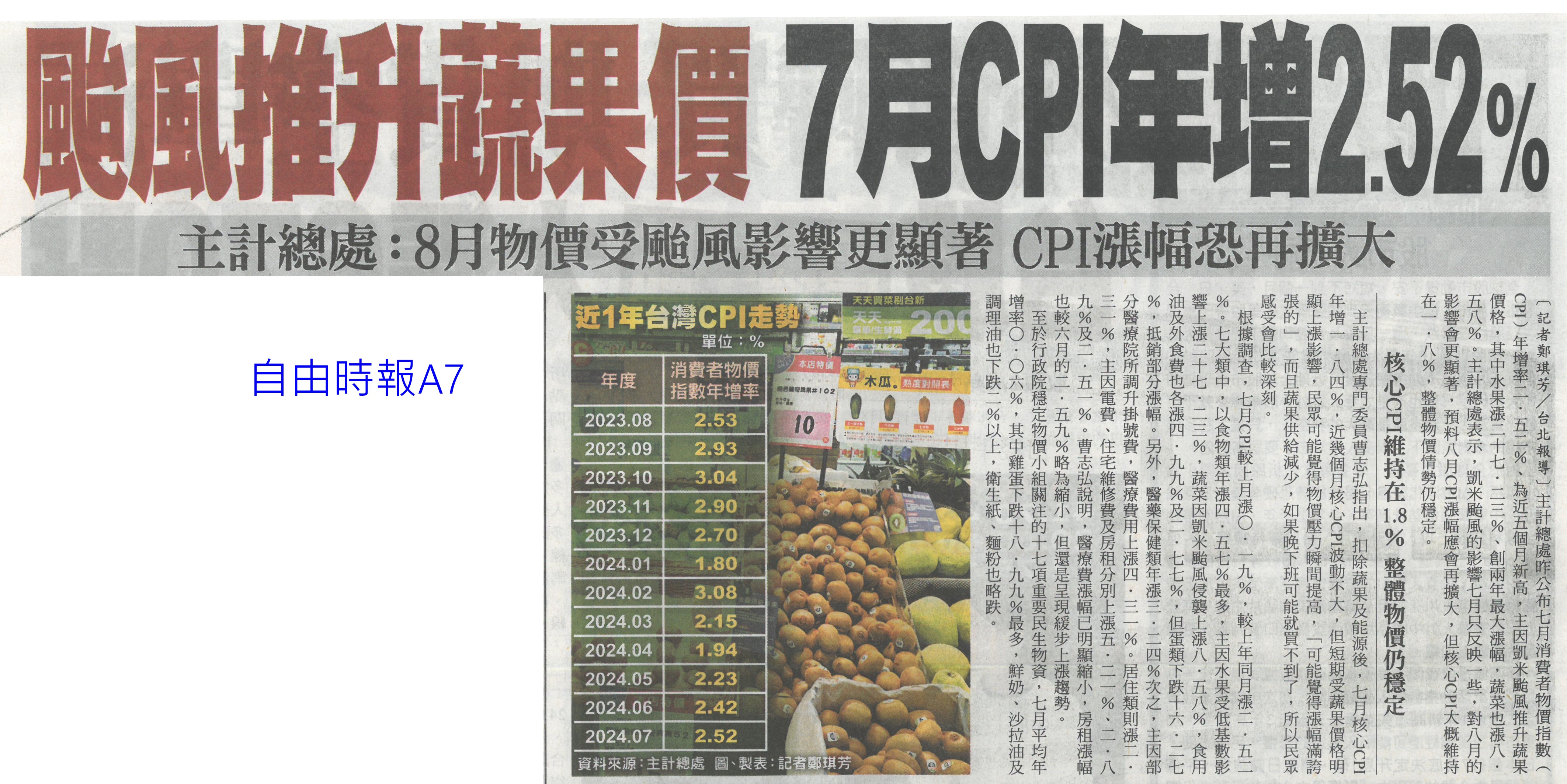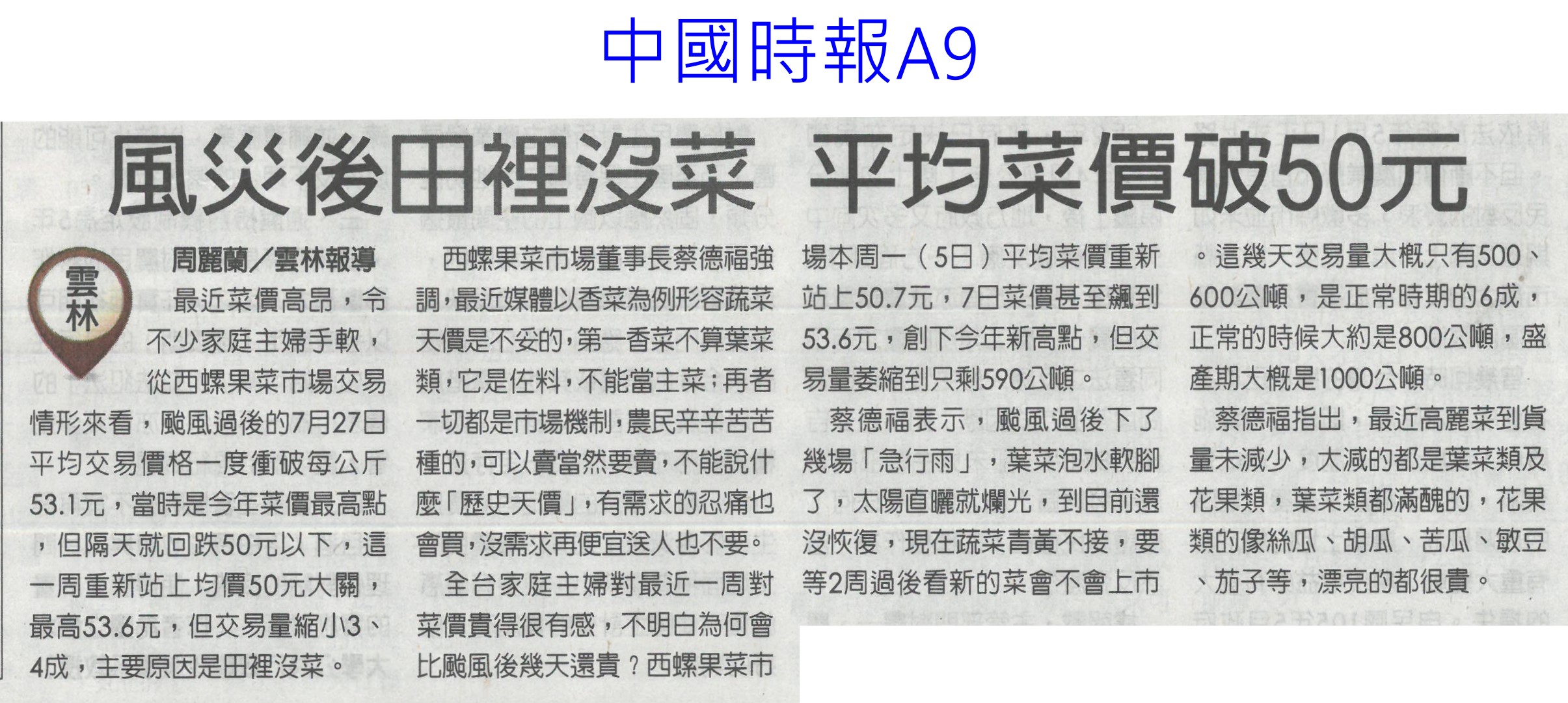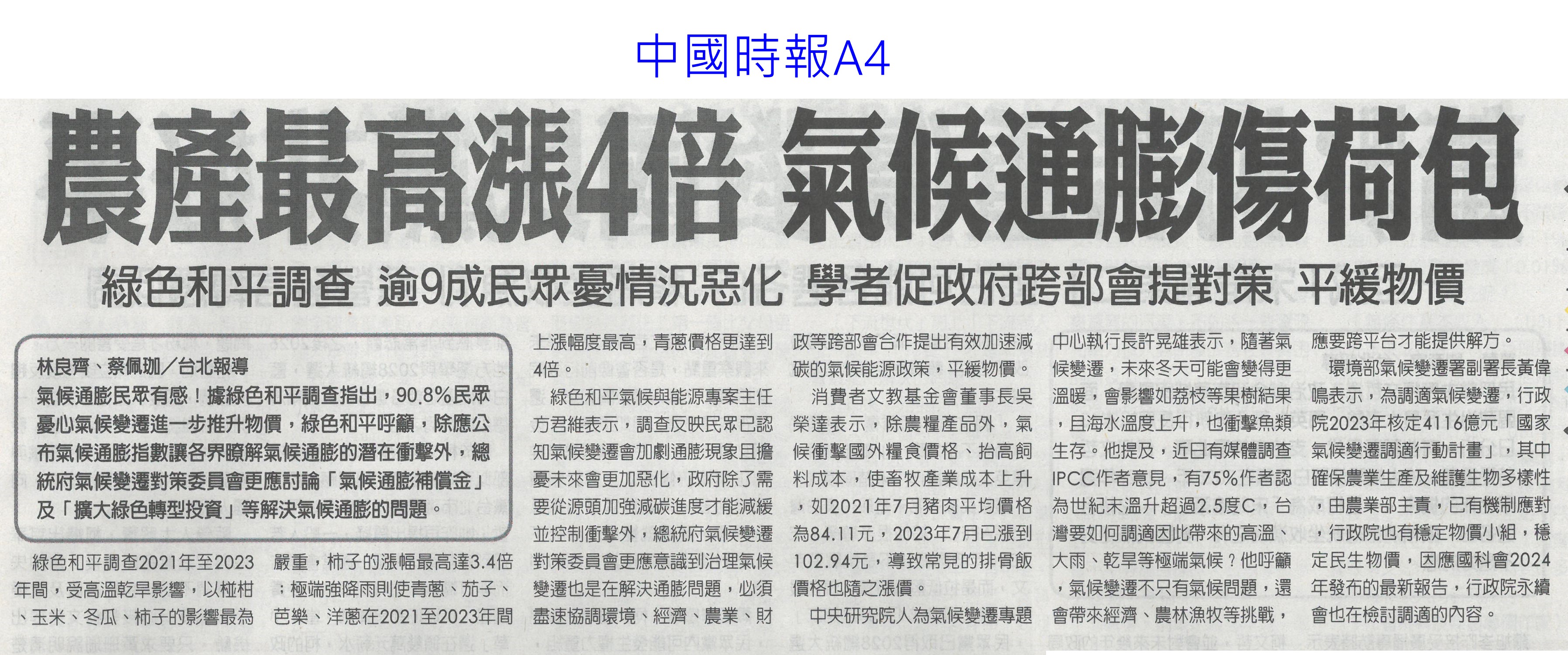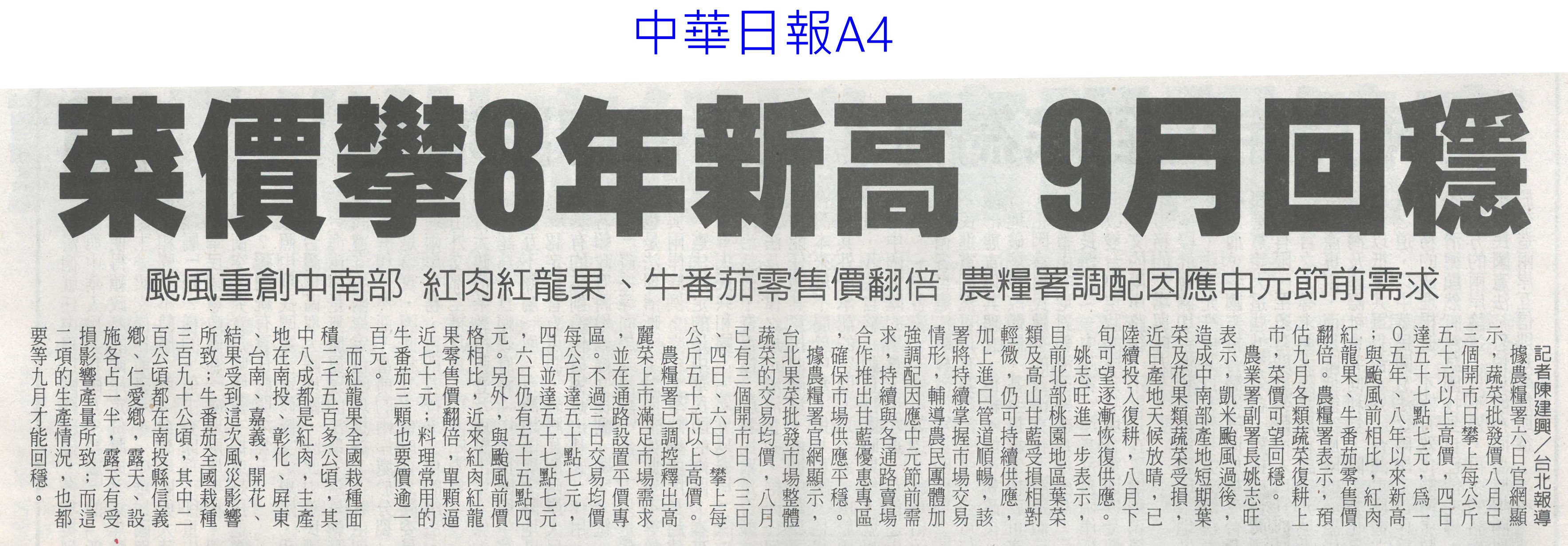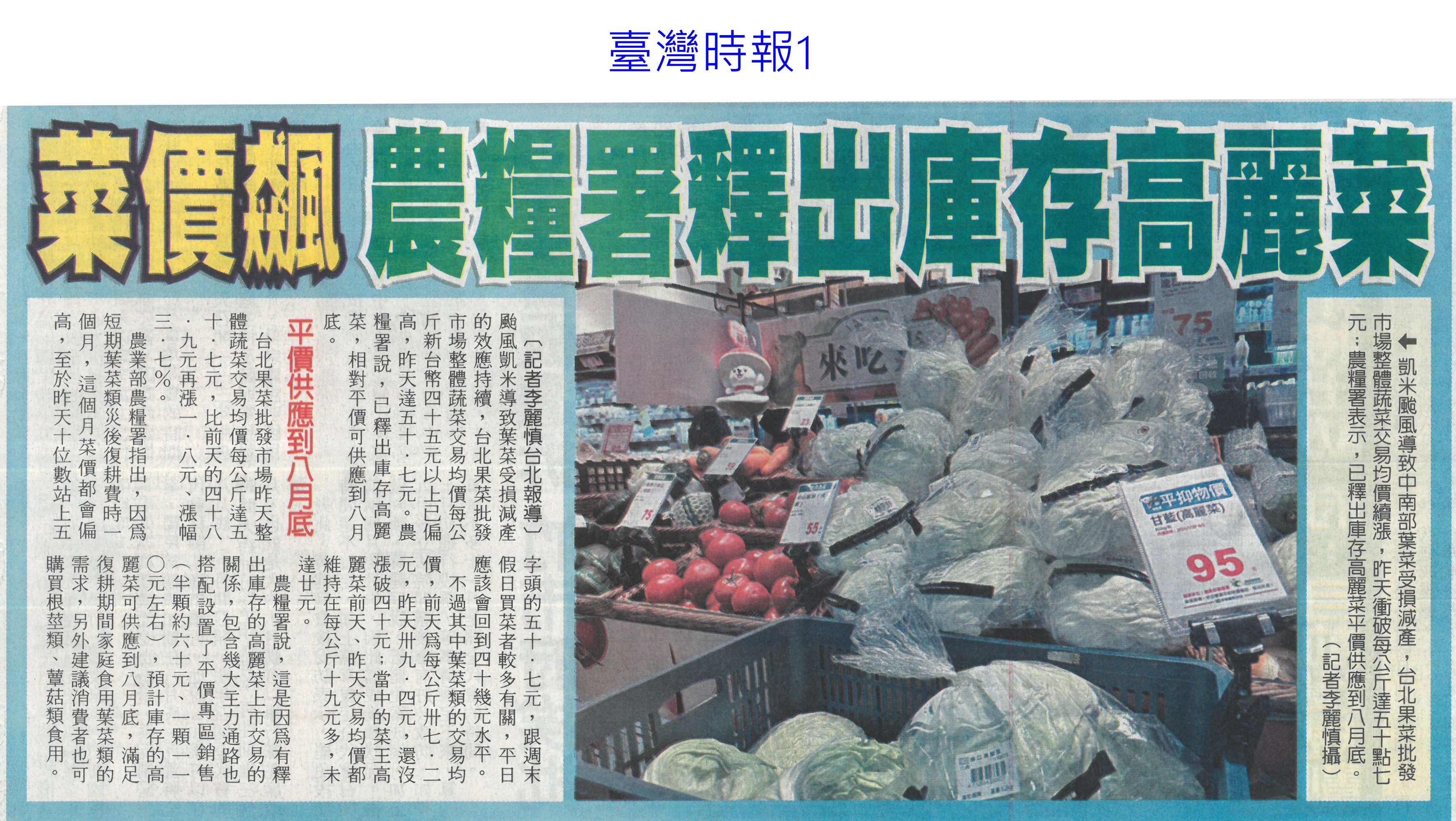 首頁萵苣觀新聞 萵苣觀新聞 排序 發布日期 更新日期 序號 發布日期 標題 621. 113/08/14 嘉義優鮮進軍國際 東京展售獲回響(臺灣時報18) 622. 113/08/14 菜價5字頭 中元物價蠢動(中華日報A4) 623. 113/08/14 雲林永續農業 雞屎牛糞變有機肥(中國時報A9) 624. 113/08/14 農產最高漲4倍 氣候通膨傷荷包(中國時報A4) 625. 113/08/12 陳駿季:研議堆疊式農業補貼(聯合報A5) 626. 113/08/12 南青出任務 規劃青農創生(台灣新生報6) 627. 113/08/12 中央對農業權無感 雲林將辦論壇(中國時報A8) 628. 113/08/12 蔬菜批發價仍高 農糧署釋高麗菜(臺灣時報3) 629. 113/08/12 台德協會農業交流經費 農業部喊停(自由時報A8) 630. 113/08/12 雲林風災後田裡沒菜 平均菜價破50元(中國時報A9) 631. 113/08/09 提升防災應變力 農糧署專案輔導重建溫網室(臺灣時報11) 632. 113/08/09 農糧署調配穩定中元節前蔬菜需求(民眾日報4) 633. 113/08/09 農業部與慈心基金會簽署合作備忘錄(民眾日報4) 634. 113/08/09 全國農業專家10傑 興大占6席(中華日報B5) 635. 113/08/09 農業部推園藝療育 可減緩退化(自由時報A10) 636. 113/08/09 山上農漁會互聯網 啟動店到店服務(中華日報B3) 637. 113/08/07 假農民寄生農保 農會挺嚴查 盼法令更明確(自由時報A9) 638. 113/08/07 颱風推升蔬菜價 7月年增2.52%(自由時報A7) 639. 113/08/07 菜價攀8年新高 9月回穩(中華日報A4) 640. 113/08/06 菜價飆 農糧署釋出庫存高麗菜(臺灣時報1) 第 32/142 頁,共 2823 筆上一頁到第123456789101112131415161718192021222324252627282930313233343536373839404142434445464748495051525354555657585960616263646566676869707172737475767778798081828384858687888990919293949596979899100101102103104105106107108109110111112113114115116117118119120121122123124125126127128129130131132133134135136137138139140141142頁下一頁每頁103070筆資料