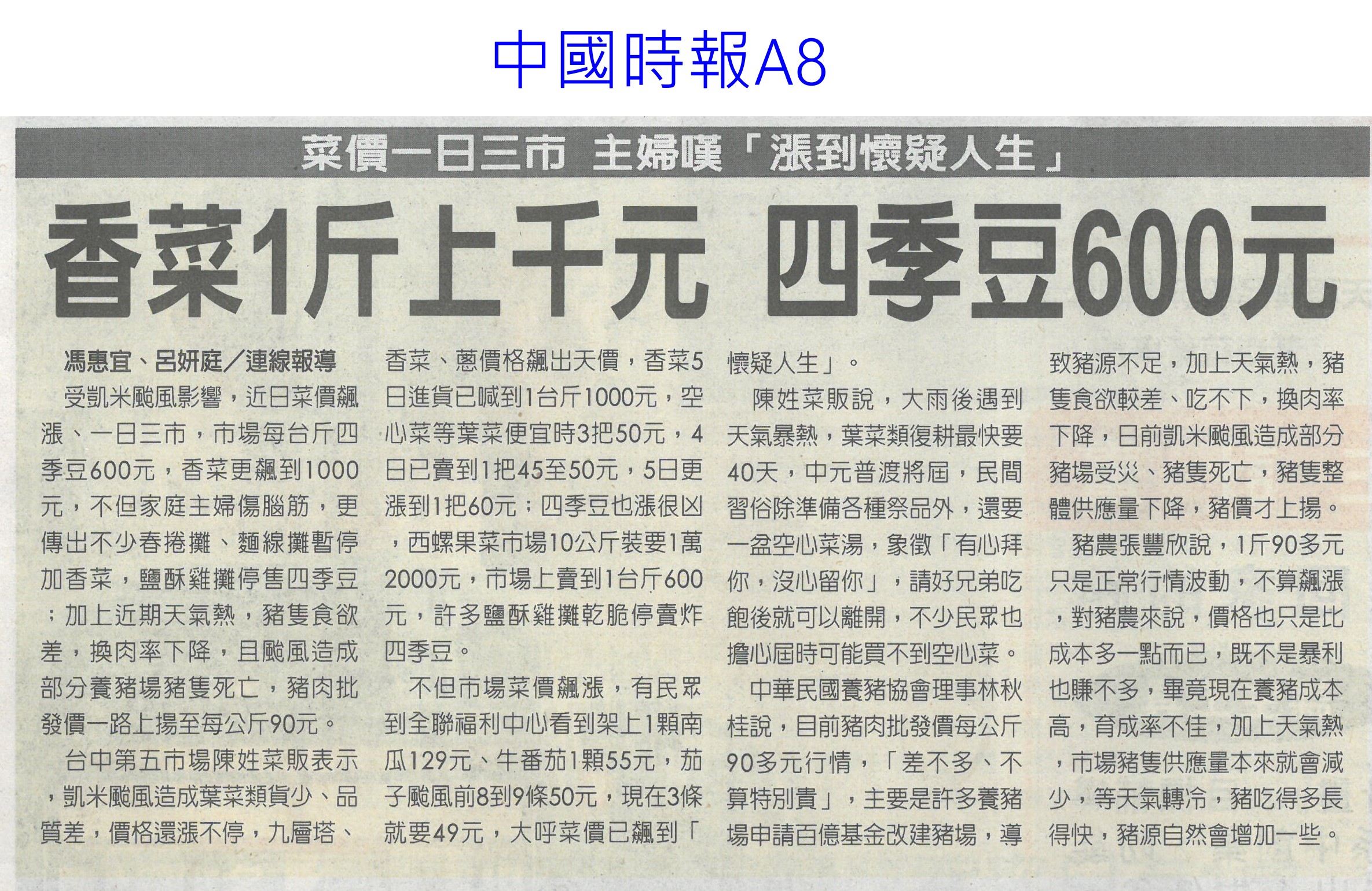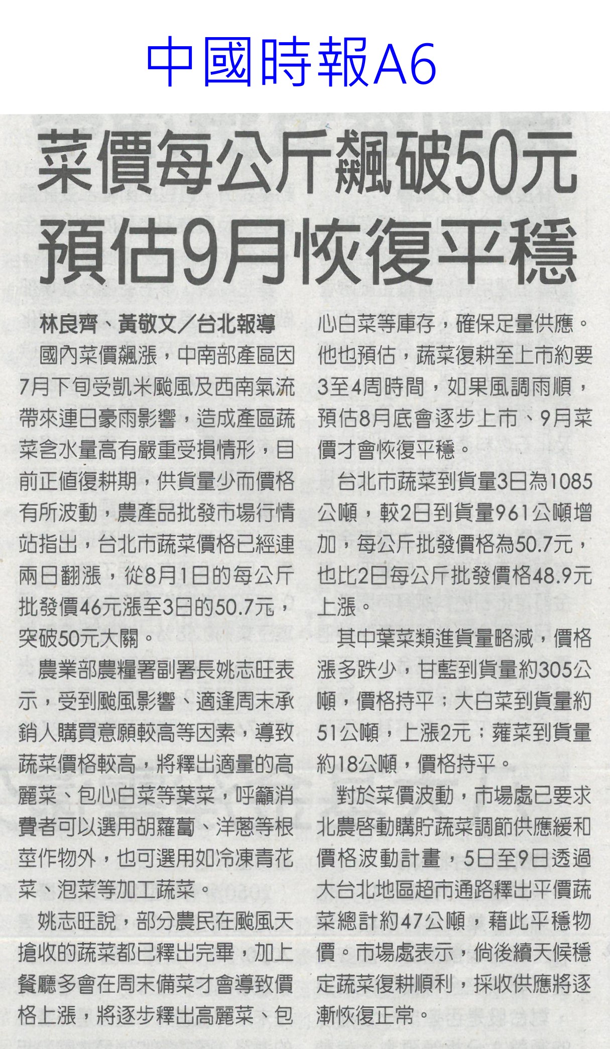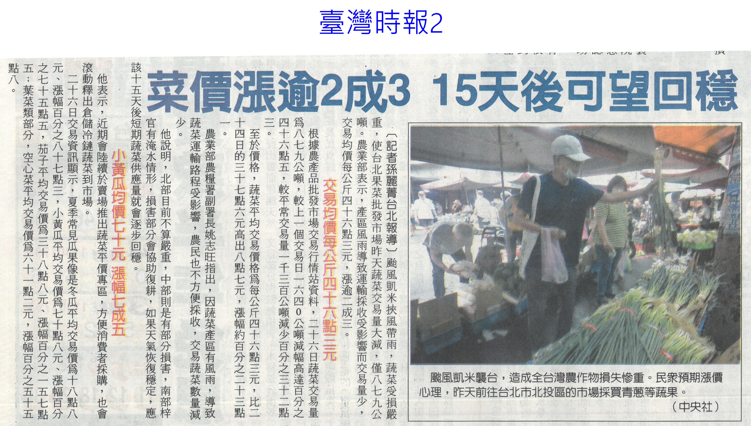 首頁萵苣觀新聞 萵苣觀新聞 排序 發布日期 更新日期 序號 發布日期 標題 641. 113/08/06 災後蔬菜批發價漲至每公斤50元 高麗菜釋出救急(台灣新生報2) 642. 113/08/06 菜價每公斤飆破50元 預估9月恢復平穩(中國時報A6) 643. 113/08/06 美食展臺灣農業館12味 體驗五感豐富旅程(民眾日報5) 644. 113/08/06 嘉義優鮮前進日本!福岡/東京接力開賣(中國時報A9) 645. 113/08/06 台南農特產品 外銷成績亮眼(中華日報B1) 646. 113/08/06 量販通路平價高麗菜 穩供到中元節(自由時報A9) 647. 113/08/06 颱風農損慘 菜販嘆快無菜可賣(臺灣時報13) 648. 113/08/06 菜價一日三市 主婦嘆漲到懷疑人生(中國時報A8) 649. 113/08/01 嘉義+台南農損高達5億(臺灣時報9) 650. 113/08/01 凱米農損續增 跨部會稽查哄抬物價(臺灣時報7) 651. 113/08/01 山上區農會/超商 簽物流合作(自由時報A11) 652. 113/08/01 農業部與亞蔬簽MOU 開發超抗逆境品種(自由時報A9) 653. 113/08/01 攜手亞蔬 農業部加速耐逆境育種(民眾日報16) 654. 113/08/01 山上區農會建構農漁會互聯網 擴大銷售在地農產品(民眾日報12) 655. 113/08/01 山上農會與OK超商物流合作(中華日報B8) 656. 113/08/01 農業部與世界蔬菜中心簽署MOU(中華日報A4) 657. 113/07/31 菜價漲逾2成3 15天後可望回穩(臺灣時報2) 658. 113/07/31 凱米重創 賴:農損免勘查 速核撥補助(自由時報A1) 659. 113/07/31 全台農損逾11億 雙北菜價漲逾2成(中國時報A4) 660. 113/07/31 菜價漲翻天 梓官農會將釋出59噸蔬菜穩定市場(臺灣時報13) 第 33/142 頁,共 2823 筆上一頁到第123456789101112131415161718192021222324252627282930313233343536373839404142434445464748495051525354555657585960616263646566676869707172737475767778798081828384858687888990919293949596979899100101102103104105106107108109110111112113114115116117118119120121122123124125126127128129130131132133134135136137138139140141142頁下一頁每頁103070筆資料