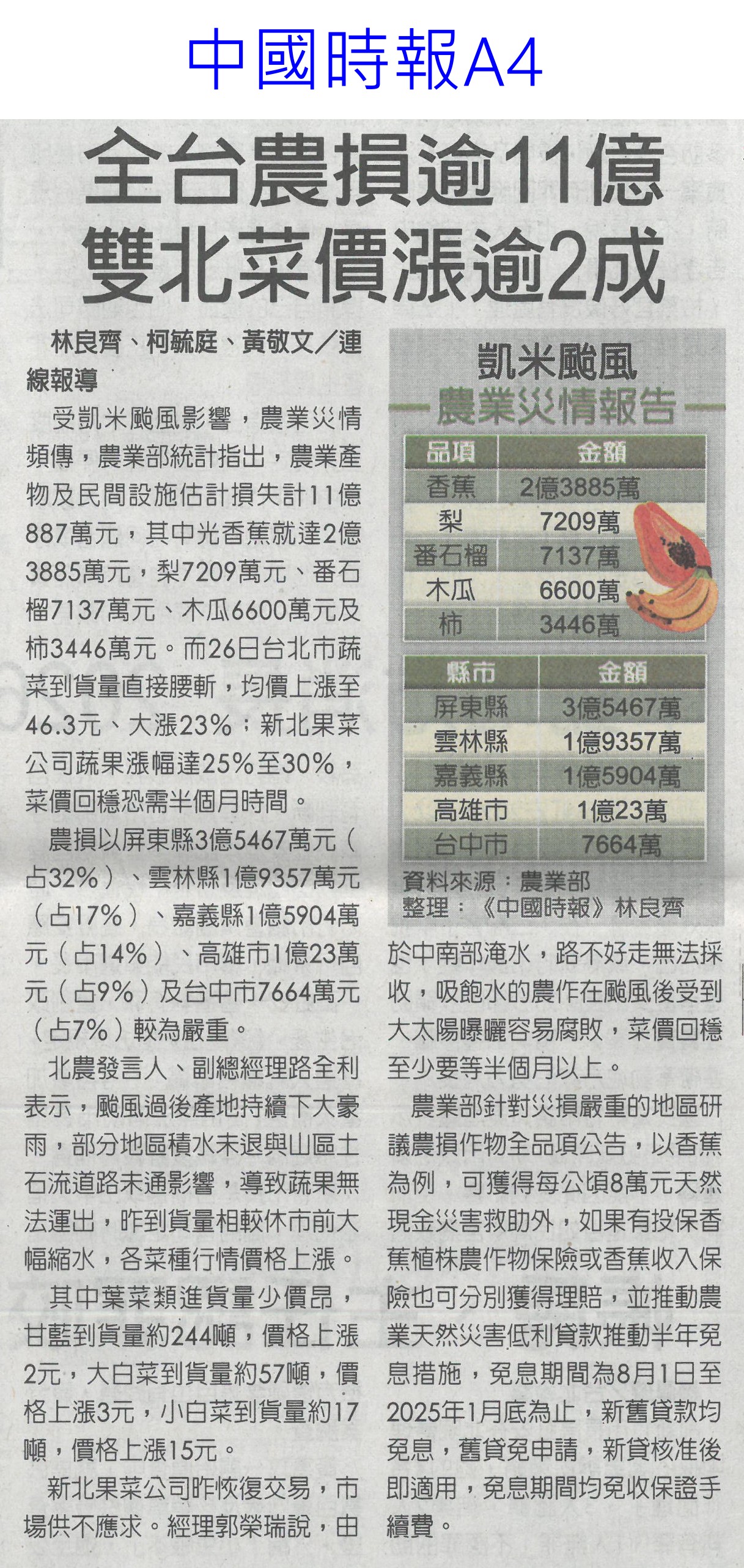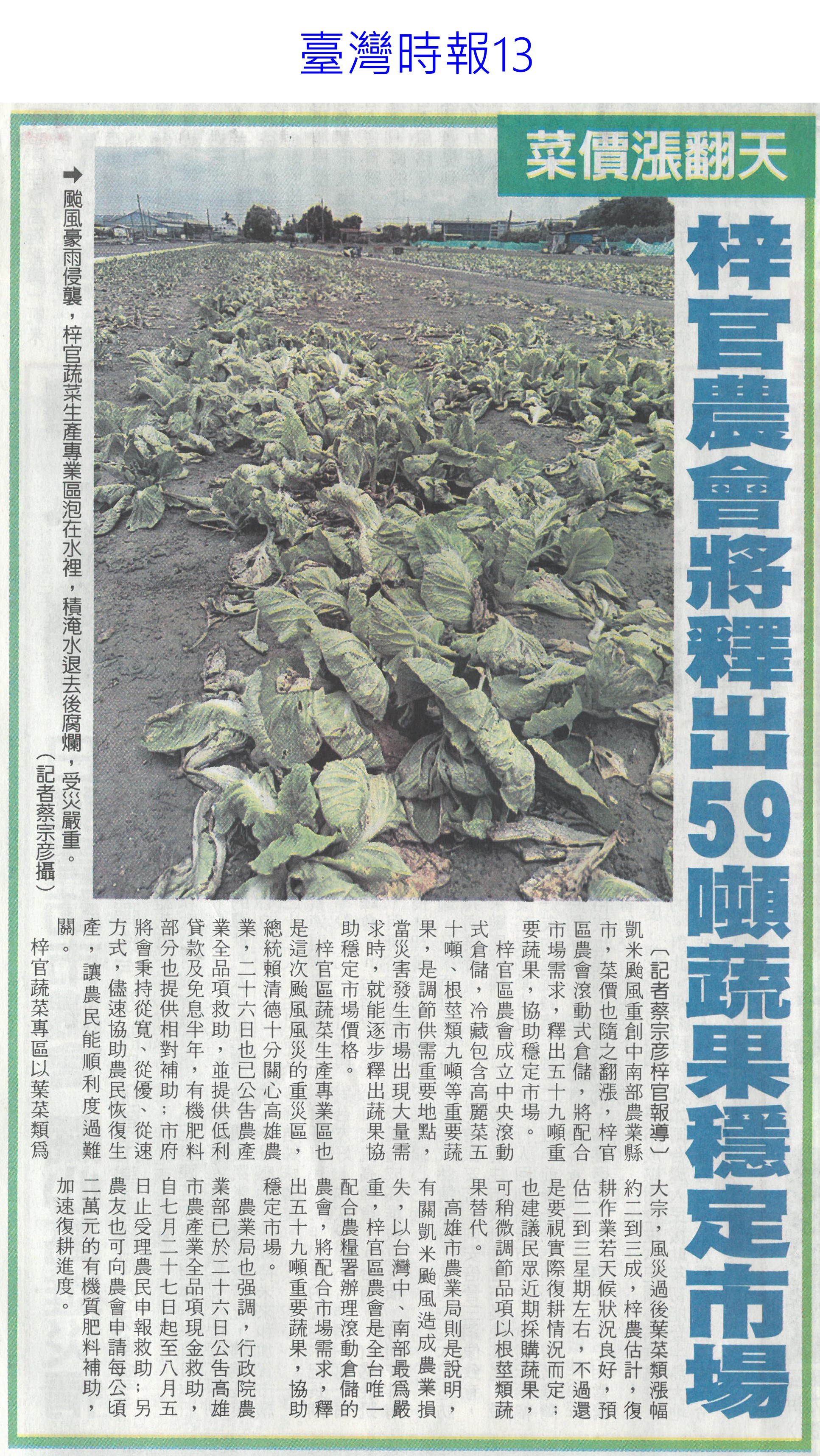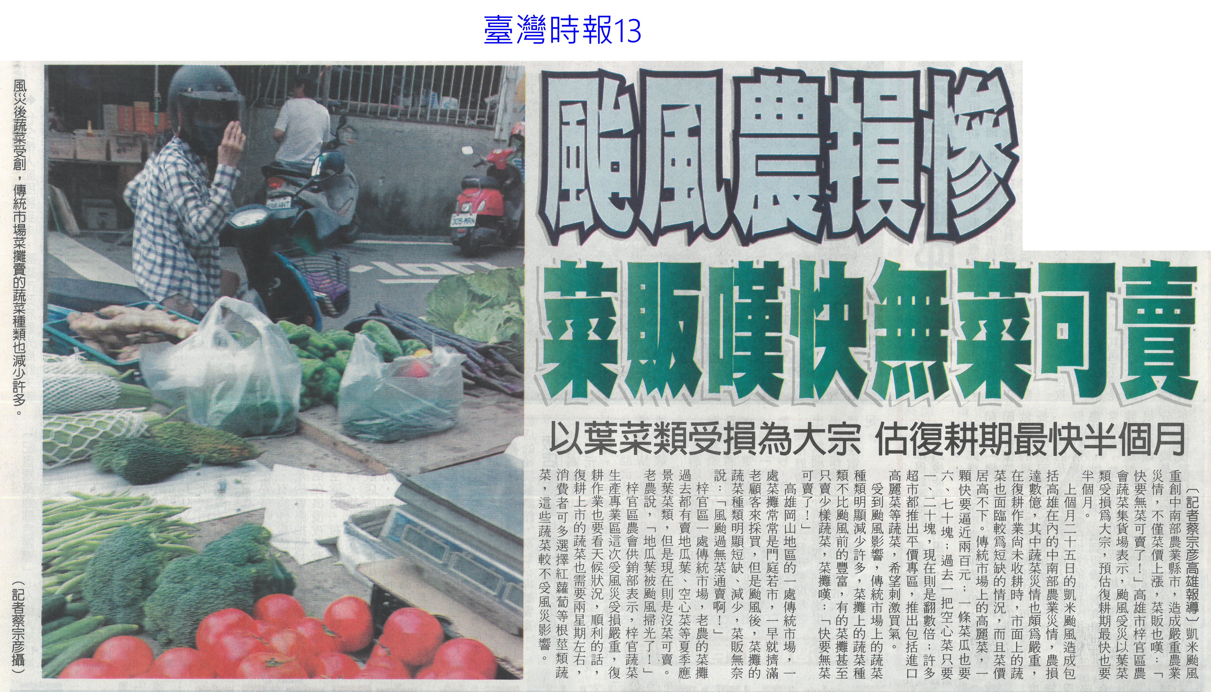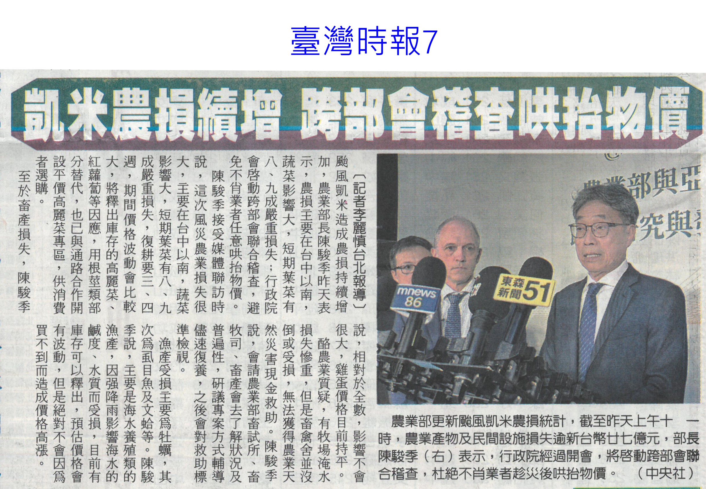 首頁萵苣觀新聞 萵苣觀新聞 排序 發布日期 更新日期 序號 發布日期 標題 641. 113/08/06 災後蔬菜批發價漲至每公斤50元 高麗菜釋出救急(台灣新生報2) 642. 113/08/06 菜價每公斤飆破50元 預估9月恢復平穩(中國時報A6) 643. 113/08/06 美食展臺灣農業館12味 體驗五感豐富旅程(民眾日報5) 644. 113/08/06 嘉義優鮮前進日本!福岡/東京接力開賣(中國時報A9) 645. 113/08/06 台南農特產品 外銷成績亮眼(中華日報B1) 646. 113/08/06 量販通路平價高麗菜 穩供到中元節(自由時報A9) 647. 113/08/06 颱風農損慘 菜販嘆快無菜可賣(臺灣時報13) 648. 113/08/06 菜價一日三市 主婦嘆漲到懷疑人生(中國時報A8) 649. 113/08/01 嘉義+台南農損高達5億(臺灣時報9) 650. 113/08/01 凱米農損續增 跨部會稽查哄抬物價(臺灣時報7) 651. 113/08/01 山上區農會/超商 簽物流合作(自由時報A11) 652. 113/08/01 農業部與亞蔬簽MOU 開發超抗逆境品種(自由時報A9) 653. 113/08/01 攜手亞蔬 農業部加速耐逆境育種(民眾日報16) 654. 113/08/01 山上區農會建構農漁會互聯網 擴大銷售在地農產品(民眾日報12) 655. 113/08/01 山上農會與OK超商物流合作(中華日報B8) 656. 113/08/01 農業部與世界蔬菜中心簽署MOU(中華日報A4) 657. 113/07/31 菜價漲逾2成3 15天後可望回穩(臺灣時報2) 658. 113/07/31 凱米重創 賴:農損免勘查 速核撥補助(自由時報A1) 659. 113/07/31 全台農損逾11億 雙北菜價漲逾2成(中國時報A4) 660. 113/07/31 菜價漲翻天 梓官農會將釋出59噸蔬菜穩定市場(臺灣時報13) 第 33/142 頁,共 2823 筆上一頁到第123456789101112131415161718192021222324252627282930313233343536373839404142434445464748495051525354555657585960616263646566676869707172737475767778798081828384858687888990919293949596979899100101102103104105106107108109110111112113114115116117118119120121122123124125126127128129130131132133134135136137138139140141142頁下一頁每頁103070筆資料