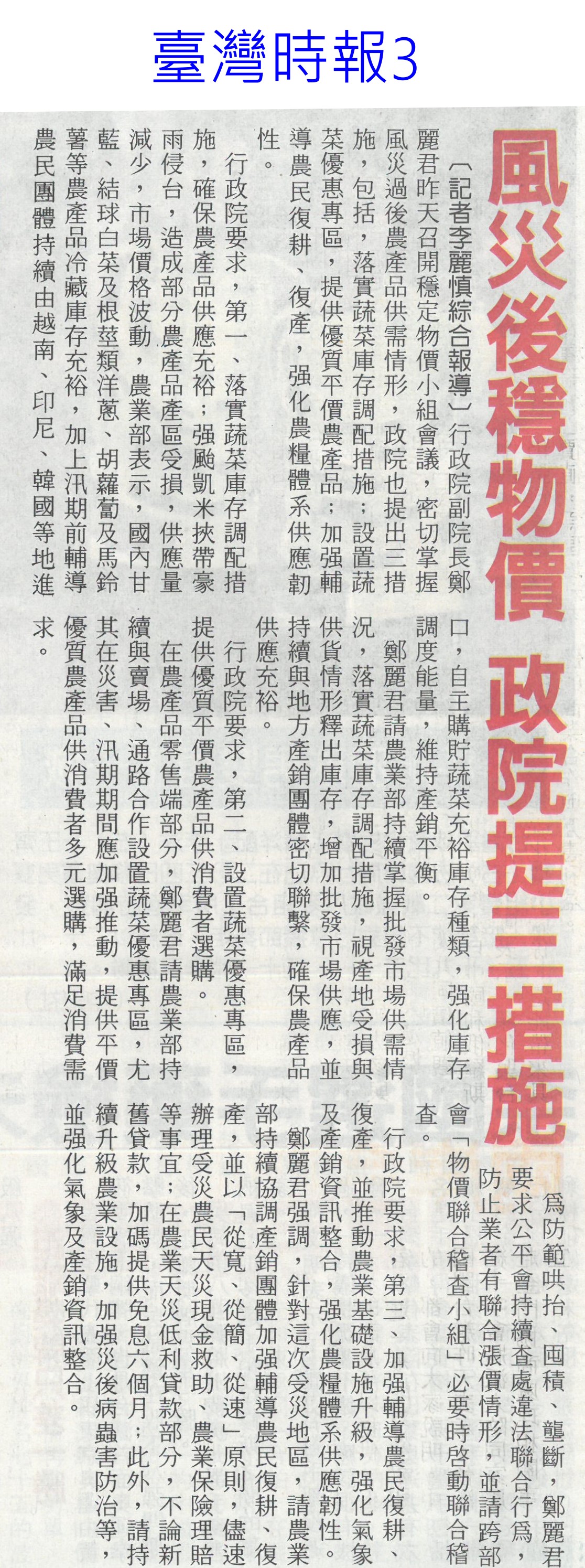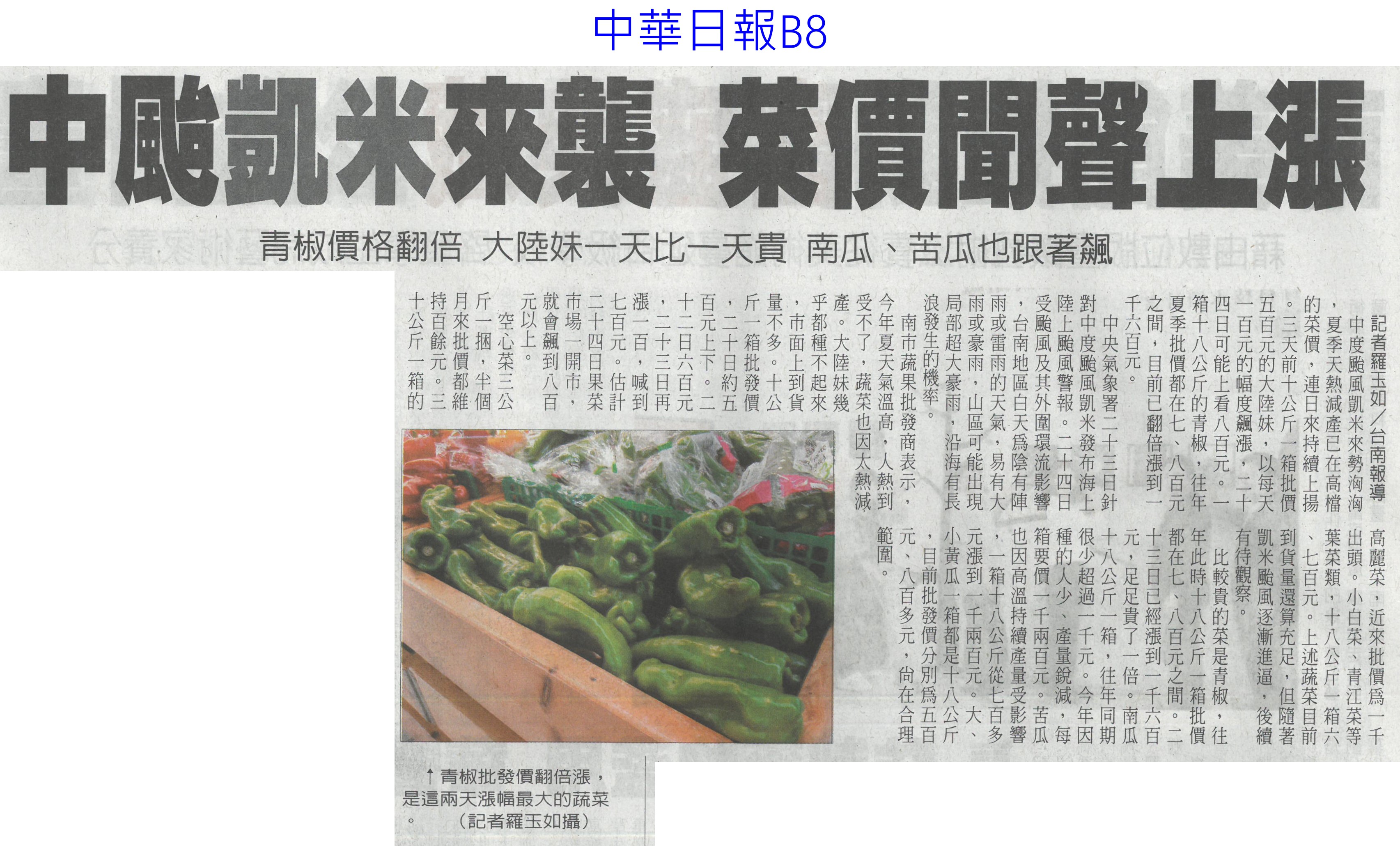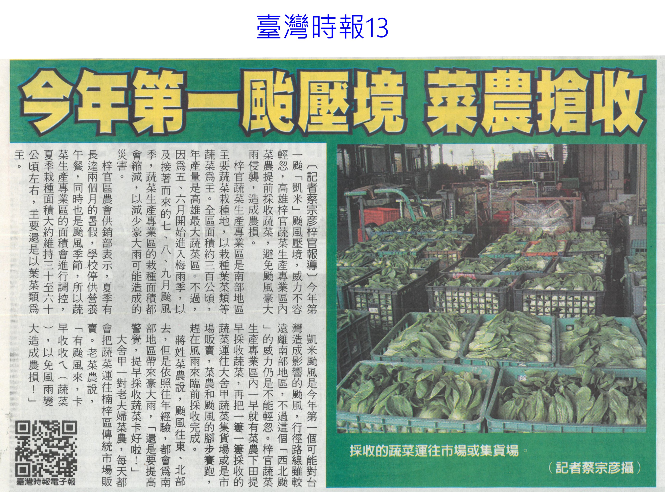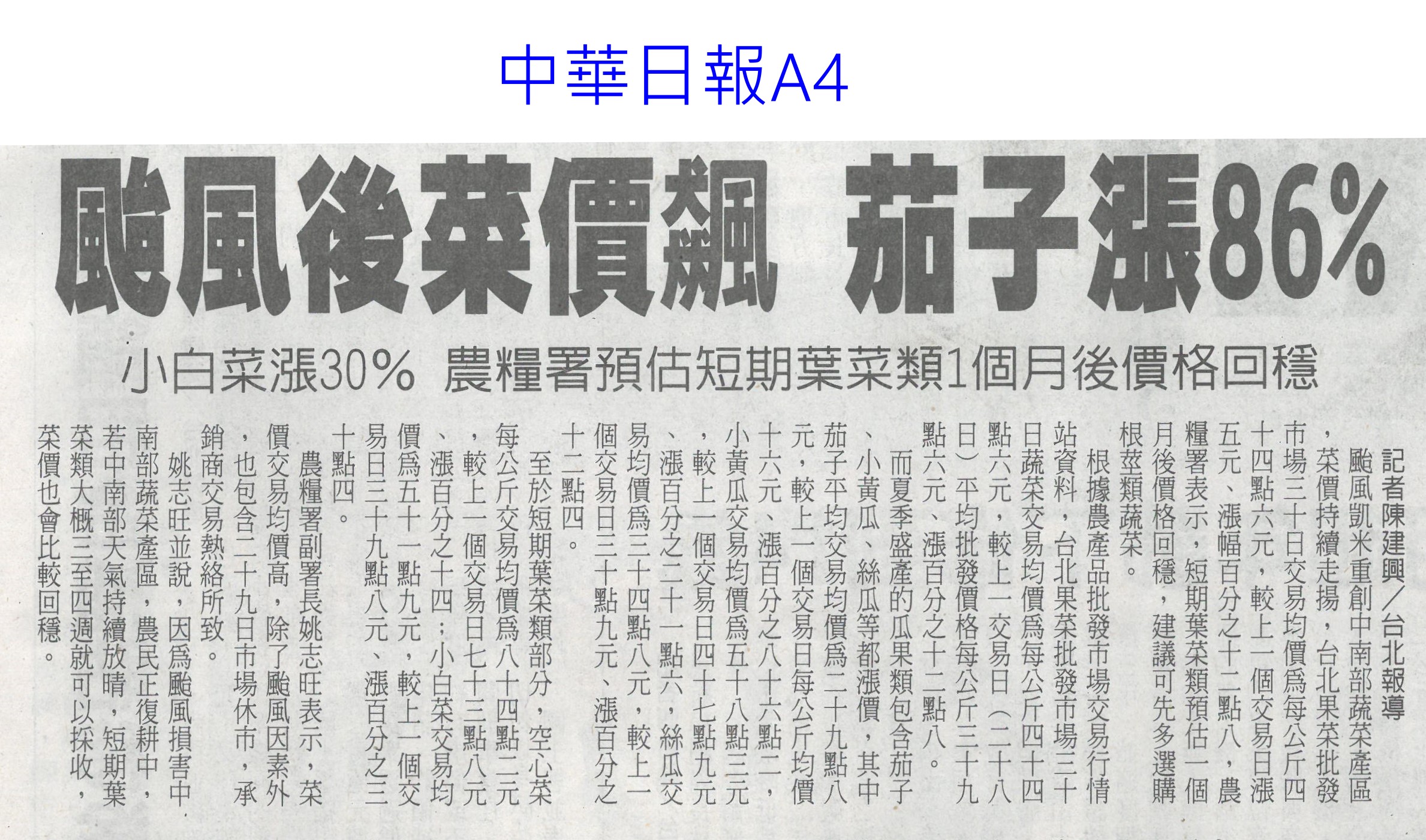 首頁萵苣觀新聞 萵苣觀新聞 排序 發布日期 更新日期 序號 發布日期 標題 661. 113/07/31 颱風後菜價飆 茄子漲86%(中華日報A4) 662. 113/07/30 暴風雨!嘉南作物泡湯 雲林農損670公頃(聯合報B2) 663. 113/07/30 凱米挹注 全台水庫進帳13.8億噸(臺灣時報5) 664. 113/07/30 菜價狂飆 空心菜批價翻倍(中華日報B1) 665. 113/07/30 賣相差 西螺果菜市場均價跌2成(中國時報A8) 666. 113/07/30 農糧署秀庫存 強調蔬菜供應穩定(臺灣時報3) 667. 113/07/30 供應量增 蔬菜批發價回跌6.4元(中華日報A4) 668. 113/07/30 今年第一颱壓境 菜農搶收(臺灣時報13) 669. 113/07/30 農民聞風搶收 菜價漲12%(自由時報A5) 670. 113/07/30 中颱凱米來襲 菜價聞聲上漲(中華日報B8) 671. 113/07/30 嘉縣一季園主培訓 學員手植瓜苗(中國時報A9) 672. 113/07/30 民眾搶買蔬菜 菜價波動待觀察(臺灣時報15) 673. 113/07/30 淹水缺貨 復耕買不到秧苗(聯合報B2) 674. 113/07/30 有機農業 緩解氣候變遷(聯合報A13) 675. 113/07/30 農損破28億 雲林最慘(臺灣時報3) 676. 113/07/30 風災後穩物價 政院提三措施(臺灣時報3) 677. 113/07/30 賴:農損全品項現金救助(臺灣時報1) 678. 113/07/30 彰雲嘉南高屏漁產 全品項救助(自由時報A11) 679. 113/07/30 農糧署攜通路 設甘藍優惠專區(民眾日報4) 680. 113/07/30 賴總統勘災 啟動農業救助機制(民眾日報2) 第 34/142 頁,共 2823 筆上一頁到第123456789101112131415161718192021222324252627282930313233343536373839404142434445464748495051525354555657585960616263646566676869707172737475767778798081828384858687888990919293949596979899100101102103104105106107108109110111112113114115116117118119120121122123124125126127128129130131132133134135136137138139140141142頁下一頁每頁103070筆資料