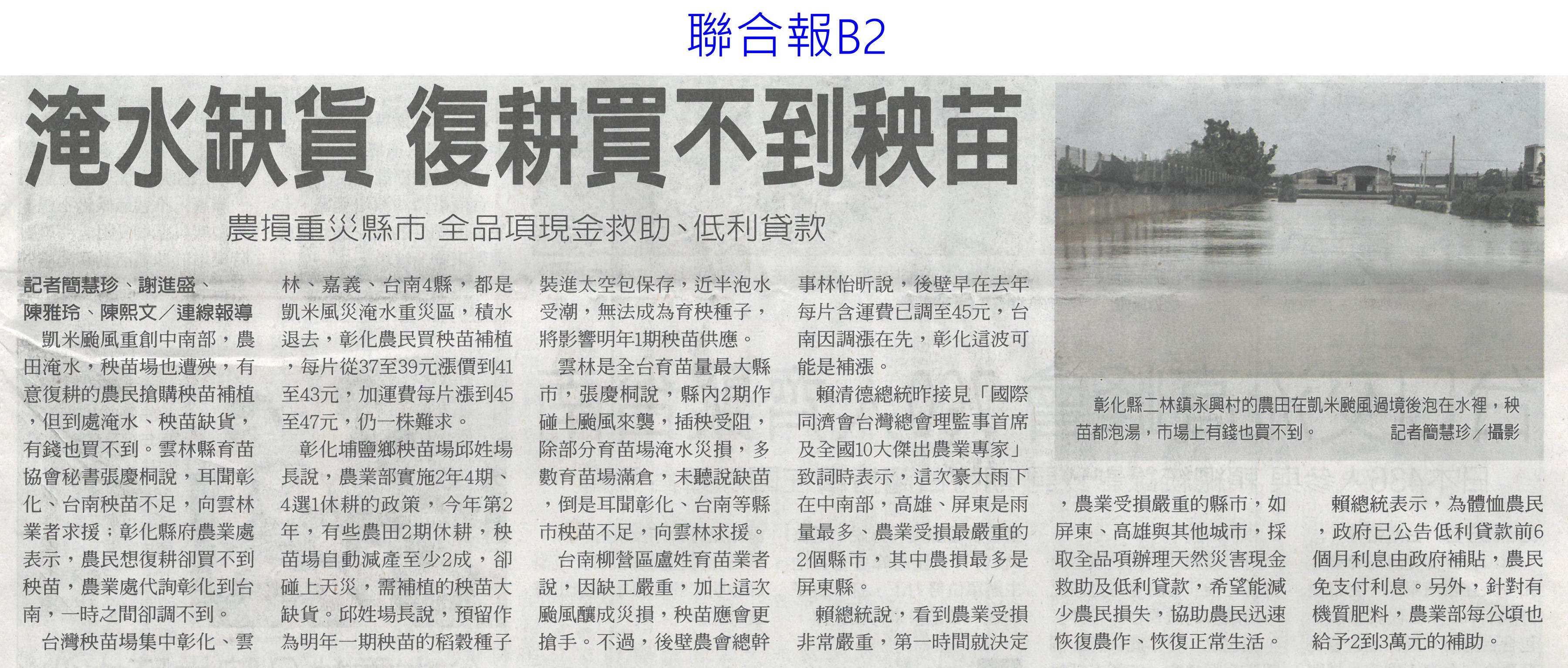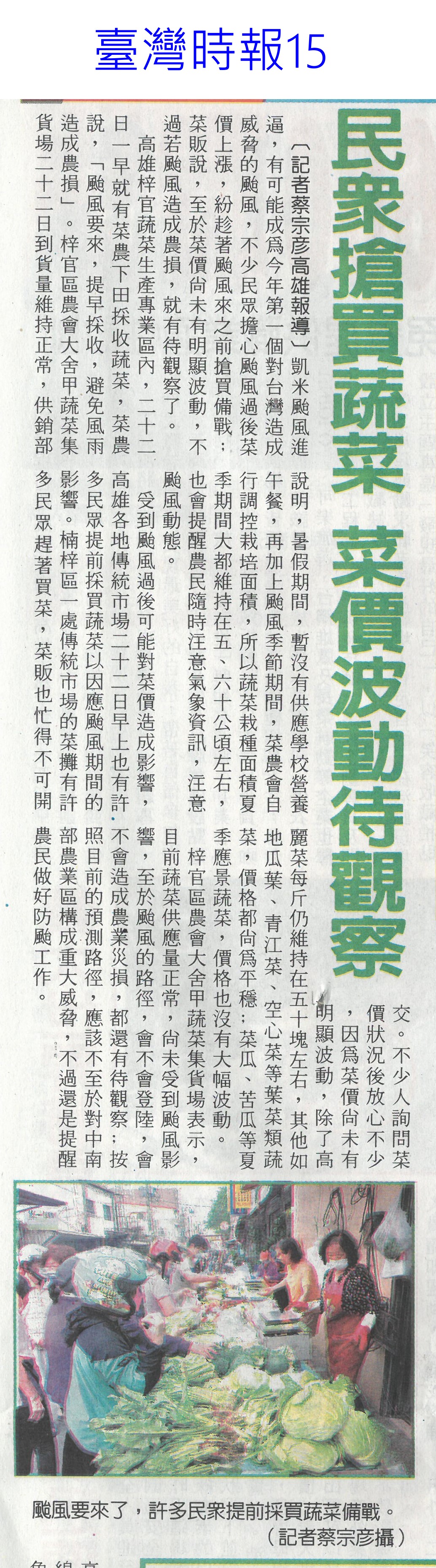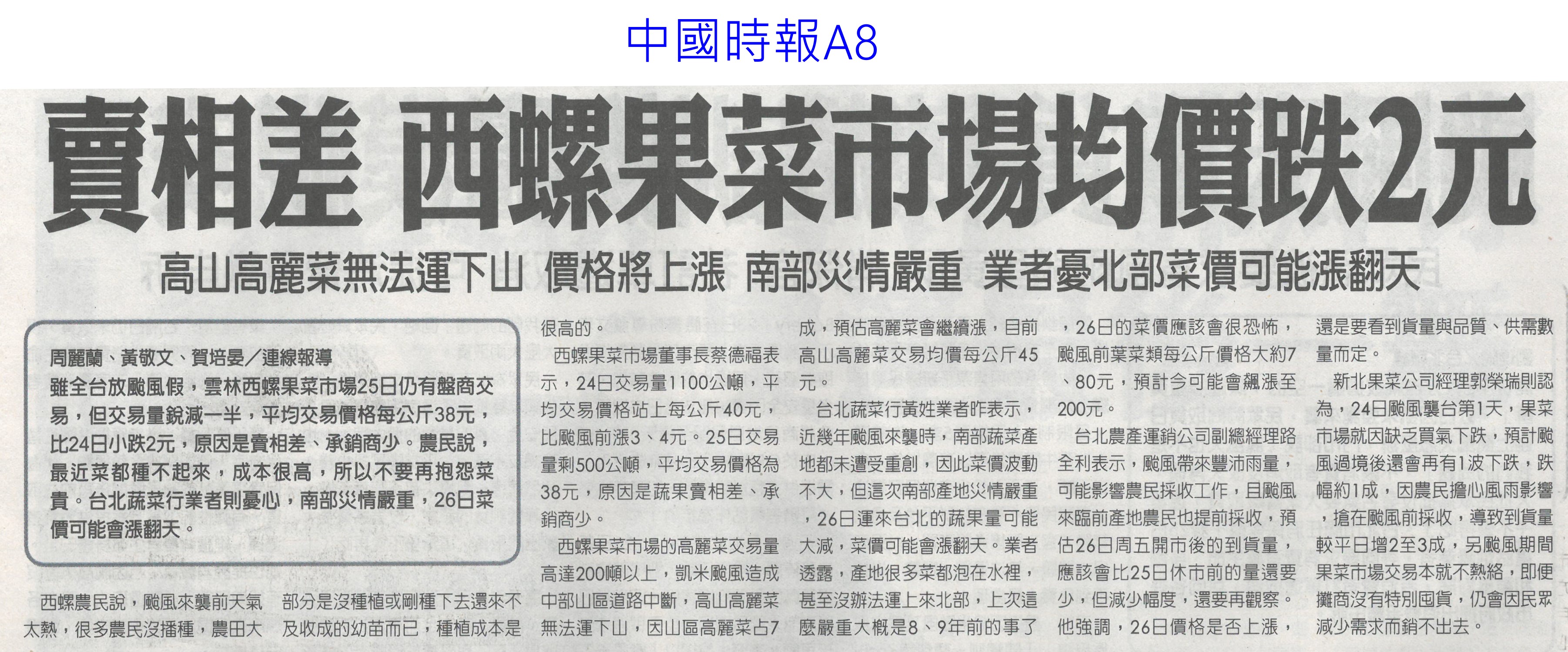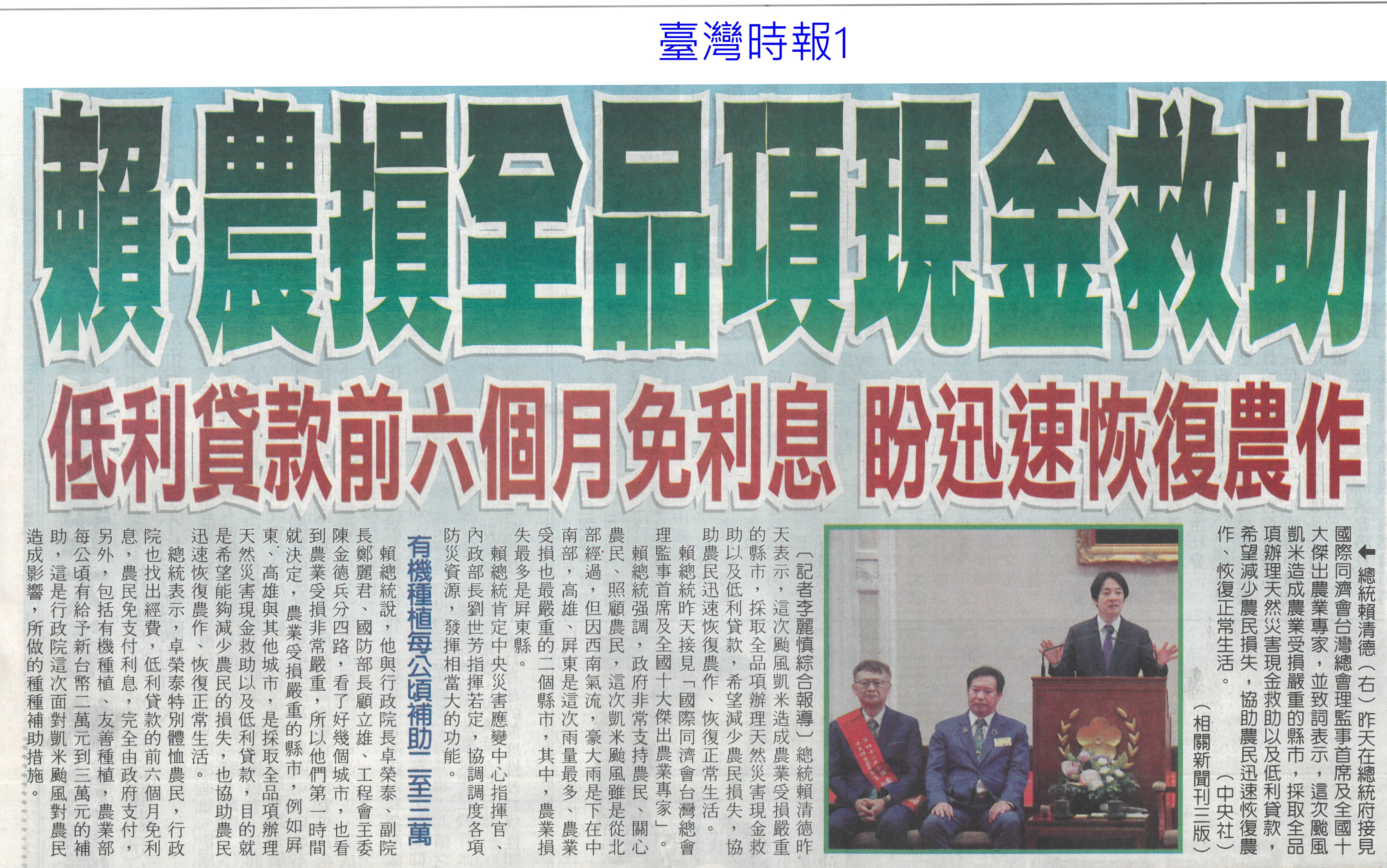 首頁萵苣觀新聞 萵苣觀新聞 排序 發布日期 更新日期 序號 發布日期 標題 661. 113/07/31 颱風後菜價飆 茄子漲86%(中華日報A4) 662. 113/07/30 暴風雨!嘉南作物泡湯 雲林農損670公頃(聯合報B2) 663. 113/07/30 凱米挹注 全台水庫進帳13.8億噸(臺灣時報5) 664. 113/07/30 菜價狂飆 空心菜批價翻倍(中華日報B1) 665. 113/07/30 賣相差 西螺果菜市場均價跌2成(中國時報A8) 666. 113/07/30 農糧署秀庫存 強調蔬菜供應穩定(臺灣時報3) 667. 113/07/30 供應量增 蔬菜批發價回跌6.4元(中華日報A4) 668. 113/07/30 今年第一颱壓境 菜農搶收(臺灣時報13) 669. 113/07/30 農民聞風搶收 菜價漲12%(自由時報A5) 670. 113/07/30 中颱凱米來襲 菜價聞聲上漲(中華日報B8) 671. 113/07/30 嘉縣一季園主培訓 學員手植瓜苗(中國時報A9) 672. 113/07/30 民眾搶買蔬菜 菜價波動待觀察(臺灣時報15) 673. 113/07/30 淹水缺貨 復耕買不到秧苗(聯合報B2) 674. 113/07/30 有機農業 緩解氣候變遷(聯合報A13) 675. 113/07/30 農損破28億 雲林最慘(臺灣時報3) 676. 113/07/30 風災後穩物價 政院提三措施(臺灣時報3) 677. 113/07/30 賴:農損全品項現金救助(臺灣時報1) 678. 113/07/30 彰雲嘉南高屏漁產 全品項救助(自由時報A11) 679. 113/07/30 農糧署攜通路 設甘藍優惠專區(民眾日報4) 680. 113/07/30 賴總統勘災 啟動農業救助機制(民眾日報2) 第 34/142 頁,共 2823 筆上一頁到第123456789101112131415161718192021222324252627282930313233343536373839404142434445464748495051525354555657585960616263646566676869707172737475767778798081828384858687888990919293949596979899100101102103104105106107108109110111112113114115116117118119120121122123124125126127128129130131132133134135136137138139140141142頁下一頁每頁103070筆資料