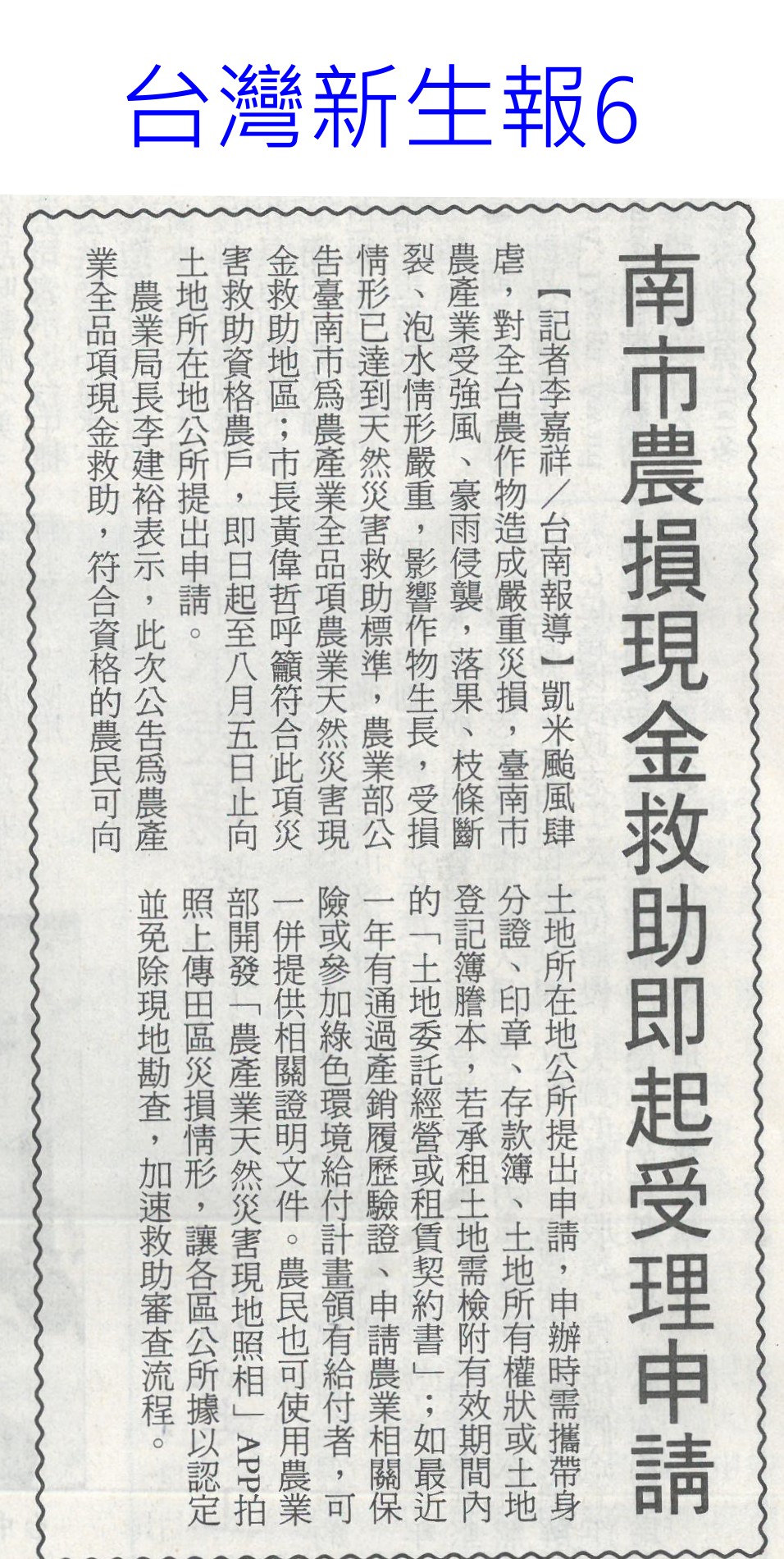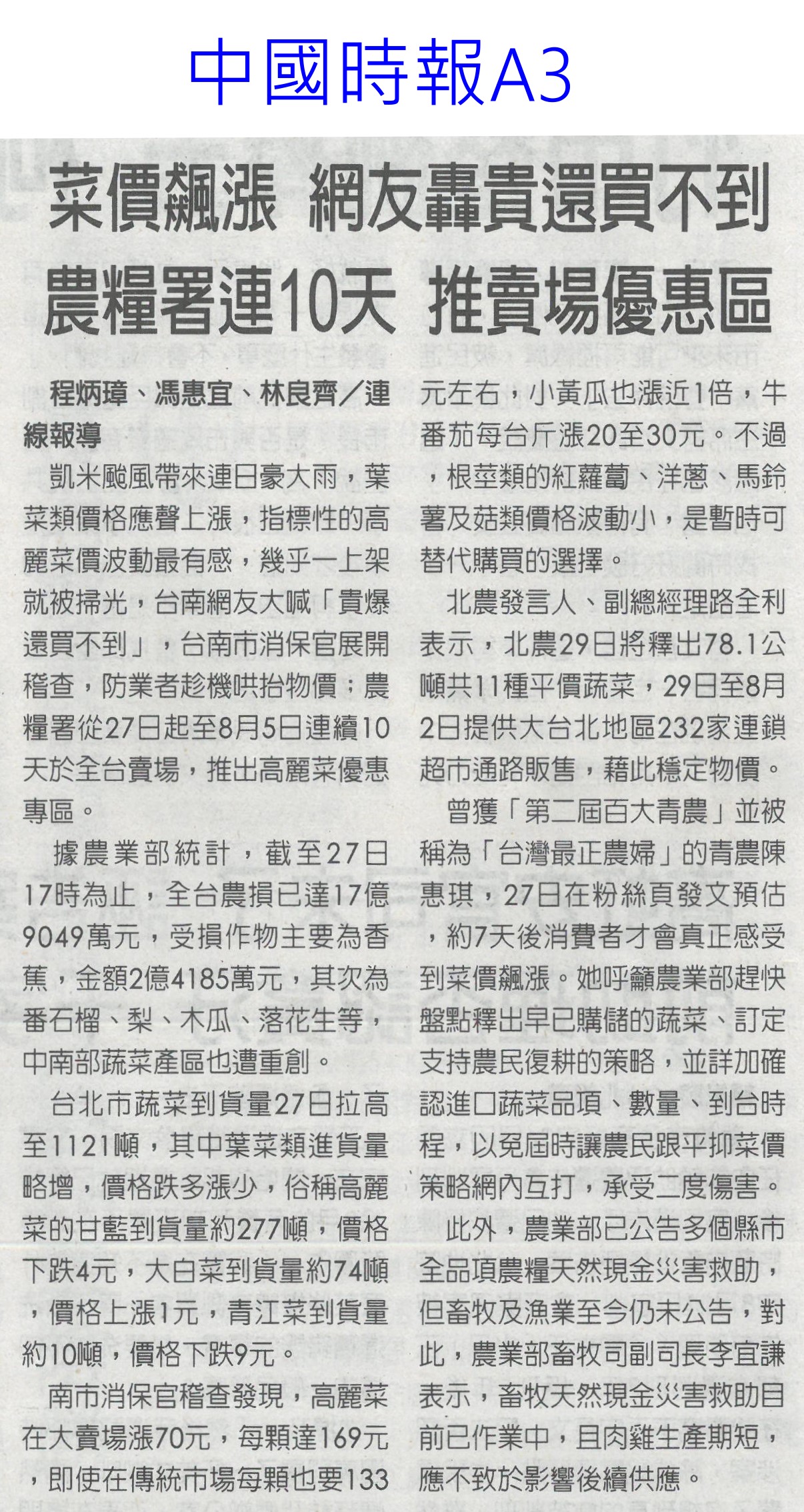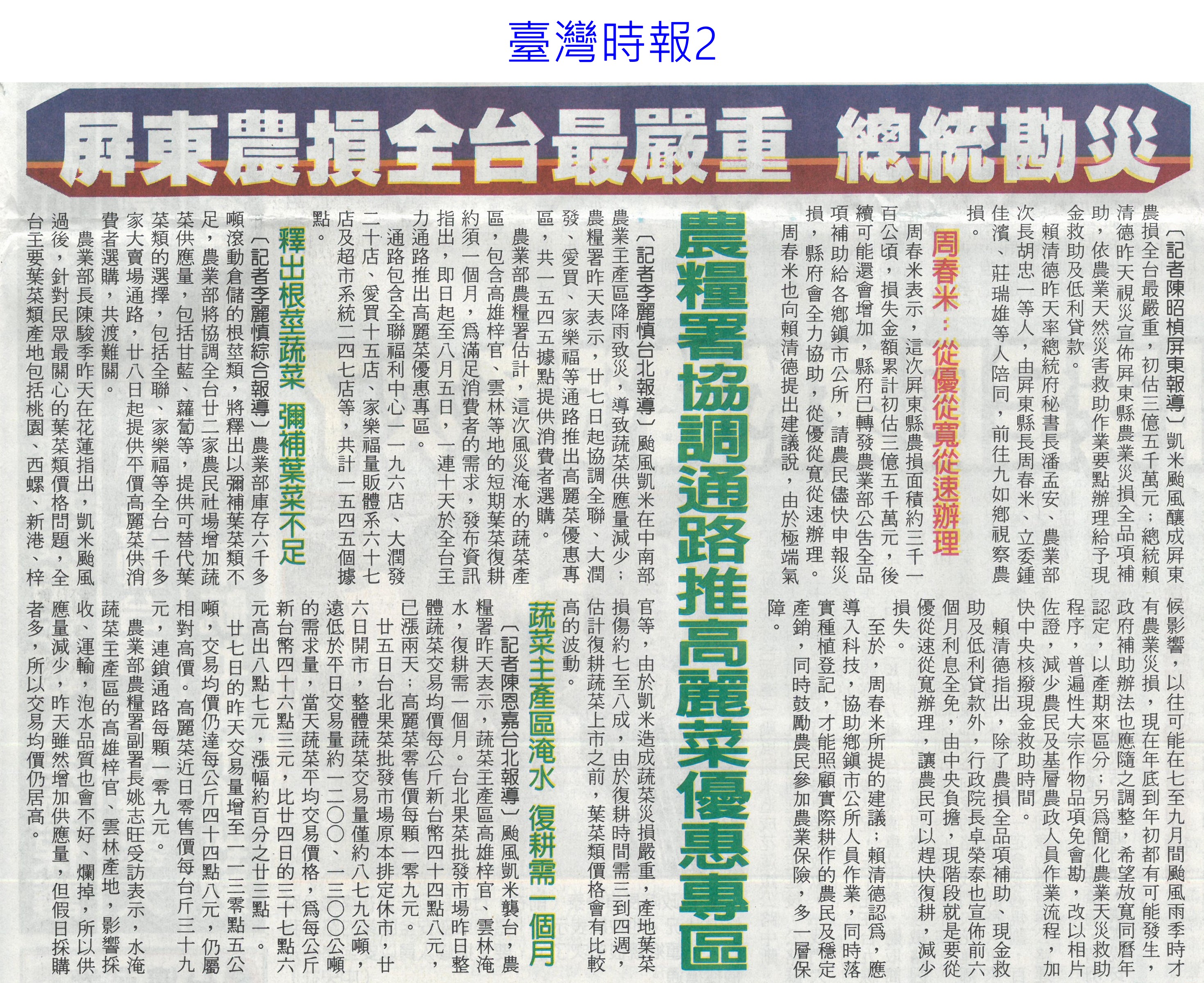 首頁萵苣觀新聞 萵苣觀新聞 排序 發布日期 更新日期 序號 發布日期 標題 681. 113/07/30 賴:農損全品項現金救助(臺灣時報1) 682. 113/07/30 彰雲嘉南高屏漁產 全品項救助(自由時報A11) 683. 113/07/30 農糧署攜通路 設甘藍優惠專區(民眾日報4) 684. 113/07/30 賴總統勘災 啟動農業救助機制(民眾日報2) 685. 113/07/30 總統盼創造農業新價值(台灣新生報2) 686. 113/07/30 凱米農損28億 雲林6億最慘(中華日報A3) 687. 113/07/30 農損慘重/山區路斷 菜價估2週後回穩(中華日報A1) 688. 113/07/29 農損嚴重 彰化以南/花蓮多區 全品項救助(臺灣時報2) 689. 113/07/29 農糧署協調通路推高麗菜優惠專區(臺灣時報2) 690. 113/07/29 雲嘉南災損近10億 盼漁牧也現金救助(自由時報A10) 691. 113/07/29 農業部公告 彰以南 花蓮五鄉鎮全品項農產 災損免勘 提供現金救助(自由時報A6) 692. 113/07/29 葉菜災損價揚 法制處查訪賣場(中華日報B4) 693. 113/07/29 蔬菜主產區淹水 復耕需一個月(中華日報A4) 694. 113/07/29 菜價飆漲 農糧署連10天 推賣場優惠區(中國時報A3) 695. 113/07/29 農漁牧災損逾21億 雲林最多(臺灣時報3) 696. 113/07/29 南市農損現金救助即起受理申請(台灣新生報6) 697. 113/07/29 農損逾18億 南臺灣慘兮兮(中華日報A1) 698. 113/07/27 西瓜輸了!只排第7名 「1蔬菜」含水量96.9% 699. 113/07/26 凱米過境菜價漲 農業災損累計逾5億元「這地方」最嚴重 700. 113/07/22 農業展開幕 4D沉浸劇場體驗(自由時報A13) 第 35/142 頁,共 2827 筆上一頁到第123456789101112131415161718192021222324252627282930313233343536373839404142434445464748495051525354555657585960616263646566676869707172737475767778798081828384858687888990919293949596979899100101102103104105106107108109110111112113114115116117118119120121122123124125126127128129130131132133134135136137138139140141142頁下一頁每頁103070筆資料