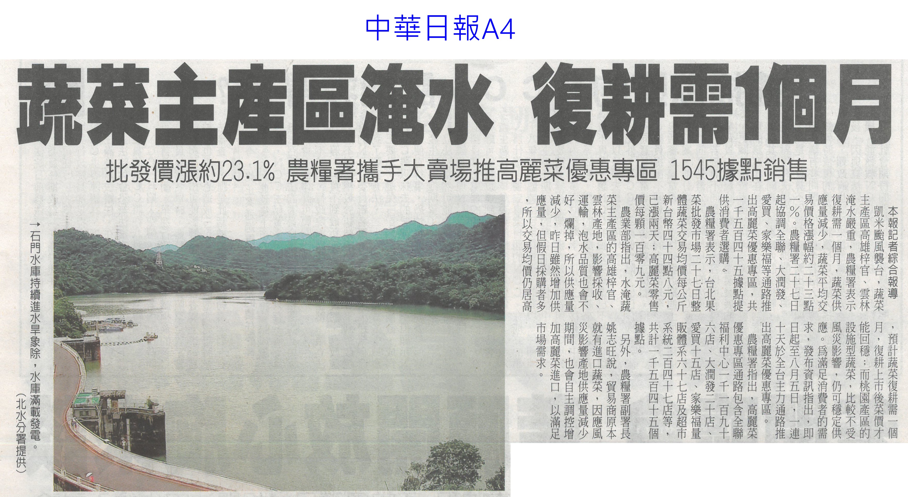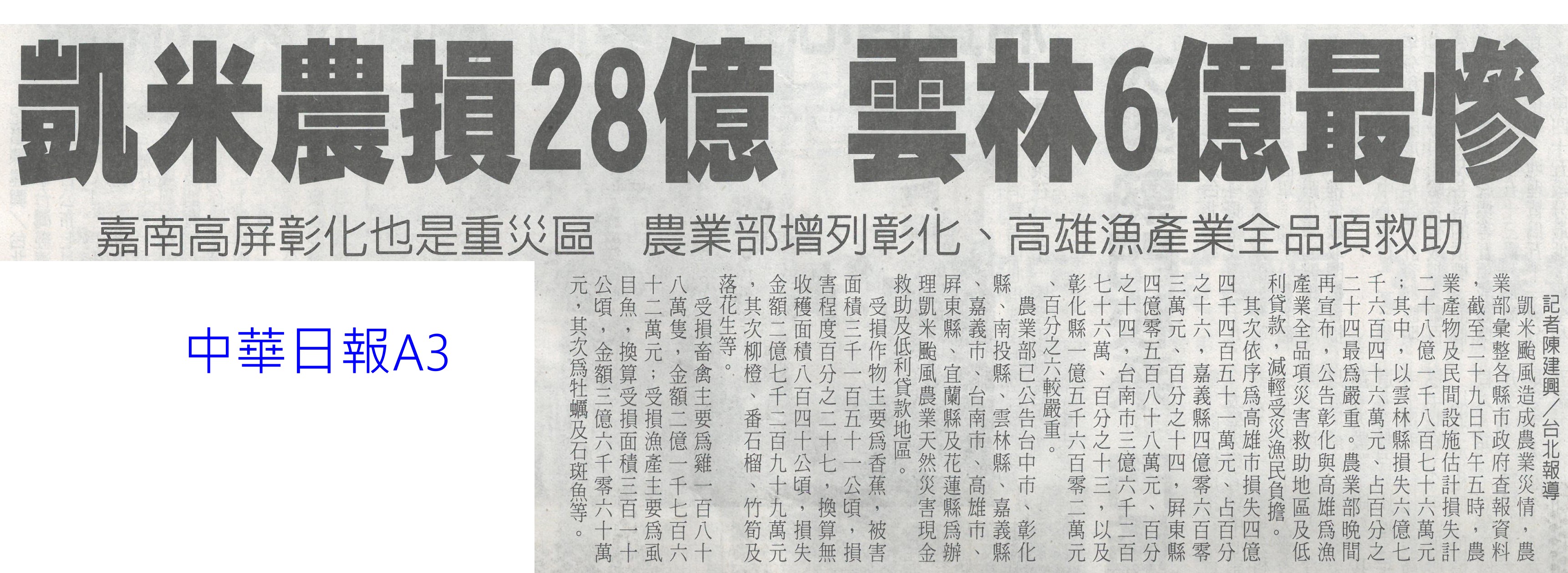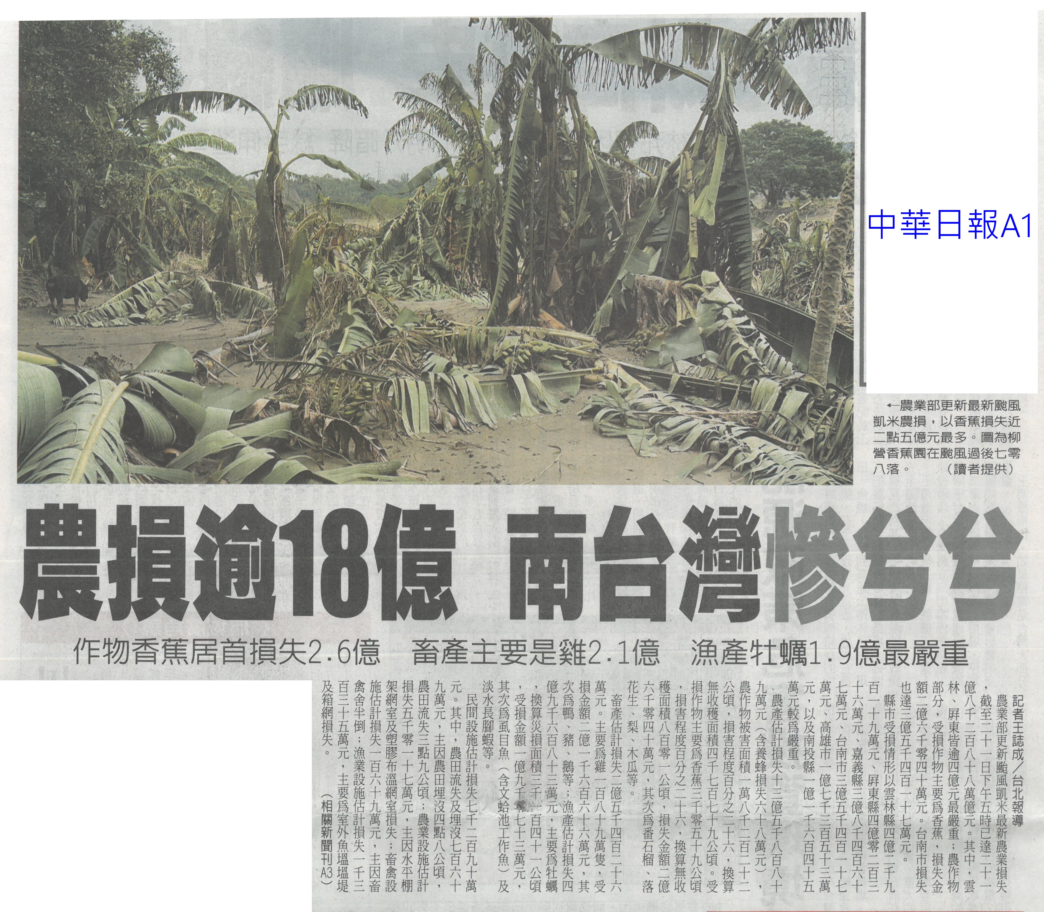 首頁萵苣觀新聞 萵苣觀新聞 排序 發布日期 更新日期 序號 發布日期 標題 681. 113/07/30 賴:農損全品項現金救助(臺灣時報1) 682. 113/07/30 彰雲嘉南高屏漁產 全品項救助(自由時報A11) 683. 113/07/30 農糧署攜通路 設甘藍優惠專區(民眾日報4) 684. 113/07/30 賴總統勘災 啟動農業救助機制(民眾日報2) 685. 113/07/30 總統盼創造農業新價值(台灣新生報2) 686. 113/07/30 凱米農損28億 雲林6億最慘(中華日報A3) 687. 113/07/30 農損慘重/山區路斷 菜價估2週後回穩(中華日報A1) 688. 113/07/29 農損嚴重 彰化以南/花蓮多區 全品項救助(臺灣時報2) 689. 113/07/29 農糧署協調通路推高麗菜優惠專區(臺灣時報2) 690. 113/07/29 雲嘉南災損近10億 盼漁牧也現金救助(自由時報A10) 691. 113/07/29 農業部公告 彰以南 花蓮五鄉鎮全品項農產 災損免勘 提供現金救助(自由時報A6) 692. 113/07/29 葉菜災損價揚 法制處查訪賣場(中華日報B4) 693. 113/07/29 蔬菜主產區淹水 復耕需一個月(中華日報A4) 694. 113/07/29 菜價飆漲 農糧署連10天 推賣場優惠區(中國時報A3) 695. 113/07/29 農漁牧災損逾21億 雲林最多(臺灣時報3) 696. 113/07/29 南市農損現金救助即起受理申請(台灣新生報6) 697. 113/07/29 農損逾18億 南臺灣慘兮兮(中華日報A1) 698. 113/07/27 西瓜輸了!只排第7名 「1蔬菜」含水量96.9% 699. 113/07/26 凱米過境菜價漲 農業災損累計逾5億元「這地方」最嚴重 700. 113/07/22 農業展開幕 4D沉浸劇場體驗(自由時報A13) 第 35/142 頁,共 2827 筆上一頁到第123456789101112131415161718192021222324252627282930313233343536373839404142434445464748495051525354555657585960616263646566676869707172737475767778798081828384858687888990919293949596979899100101102103104105106107108109110111112113114115116117118119120121122123124125126127128129130131132133134135136137138139140141142頁下一頁每頁103070筆資料