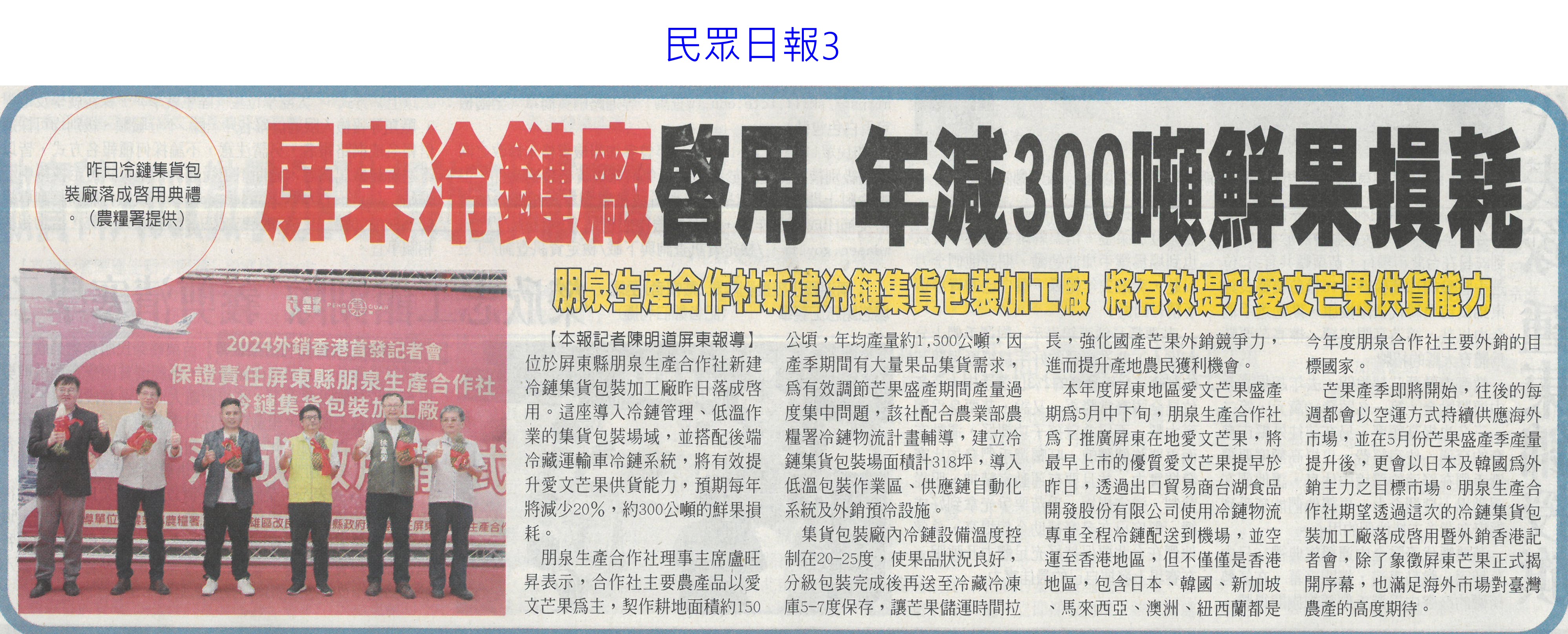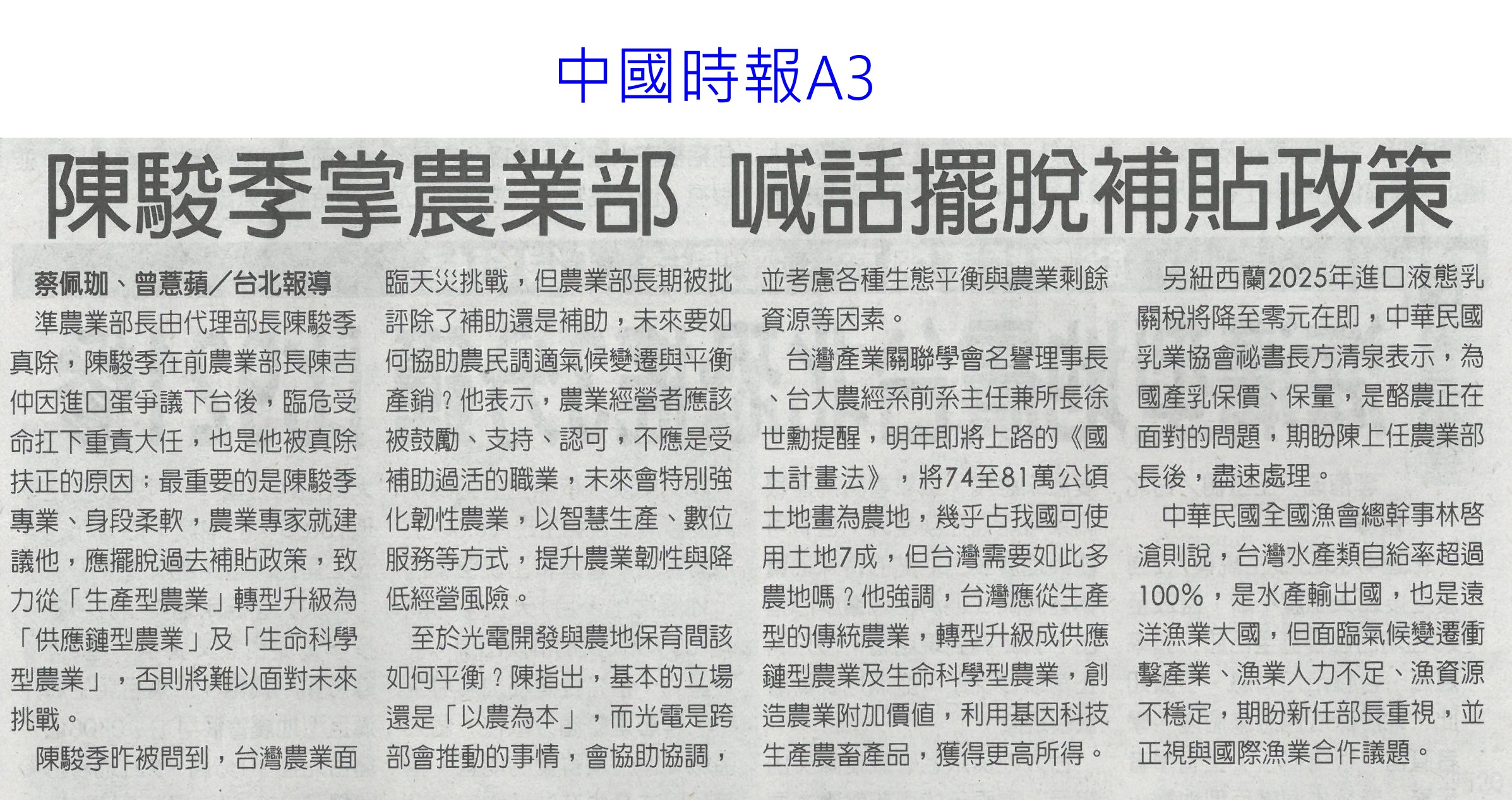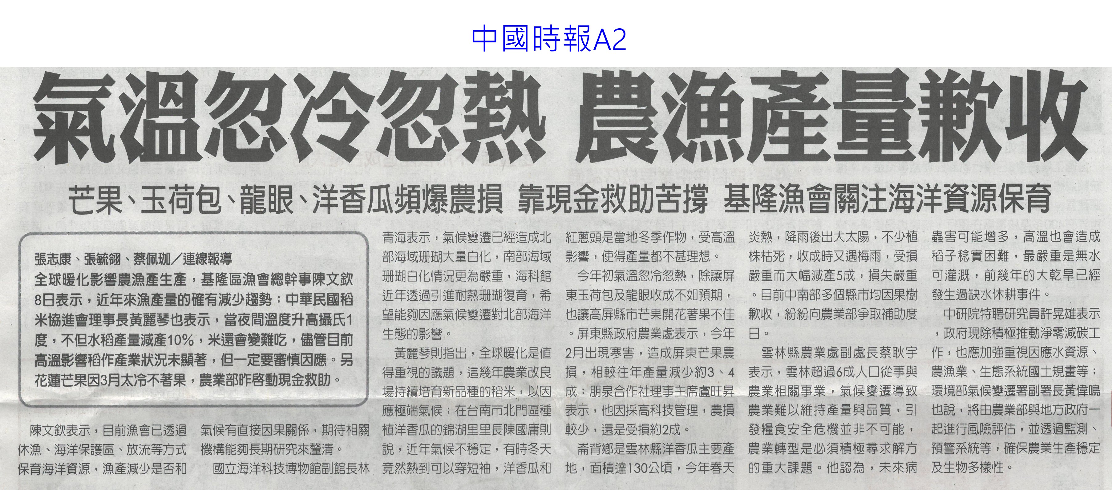 首頁萵苣觀新聞 萵苣觀新聞 排序 發布日期 更新日期 序號 發布日期 標題 781. 113/05/21 百大青農 嘉縣大放異彩11人獲選(自由時報A12) 782. 113/05/14 520專屬伴手禮 沒吃國宴也買得到(自由時報A13) 783. 113/05/09 黃偉哲開箱國宴伴手禮 滿滿臺南人情味(台灣新生報6) 784. 113/05/09 稻草分解菌有機質肥料補助 每公斤5元(民眾日報12) 785. 113/05/09 臺灣夏天恐達7個月(聯合報A1) 786. 113/05/09 氣溫忽冷忽熱 農漁產量歉收(中國時報A2) 787. 113/05/06 降雨+節水 曾文`烏山頭水庫獲益3千萬噸(自由時報12) 788. 113/05/06 農業減碳 屏科大智慧農機來助攻(民眾日報10) 789. 113/05/06 曾彥蓉獲台南農業達人亞軍(中華日報B8) 790. 113/05/06 瓜果節登場 苦瓜 絲瓜當主角(中華日報B4) 791. 113/05/06 張麗善:輔導農民投入智慧科技創新農業(台灣新生報7) 792. 113/05/03 曾文 烏山頭水庫 3天進帳800萬噸(自由時報A11) 793. 113/05/03 山區降雨 曾文水庫進帳62萬噸(自由時報A11) 794. 113/05/03 農產首季外銷產值 較去年成長6%(自由時報A8) 795. 113/04/25 屏東冷鏈廠啟用 年減300噸鮮果損耗(民眾日報3) 796. 113/04/25 陳駿季接農業部 內外挑戰大(自由時報A9) 797. 113/04/25 雲林良品進軍新加坡食品展 搶訂單(台灣新生報7) 798. 113/04/25 新加坡食品展 台南隊逾50產品搶市(自由時報A11) 799. 113/04/25 黃偉哲領軍 台南農產品登新加坡食品展(中華日報B8) 800. 113/04/25 陳駿季掌農業部 喊話擺脫補貼政策(中國時報A3) 第 40/142 頁,共 2828 筆上一頁到第123456789101112131415161718192021222324252627282930313233343536373839404142434445464748495051525354555657585960616263646566676869707172737475767778798081828384858687888990919293949596979899100101102103104105106107108109110111112113114115116117118119120121122123124125126127128129130131132133134135136137138139140141142頁下一頁每頁103070筆資料