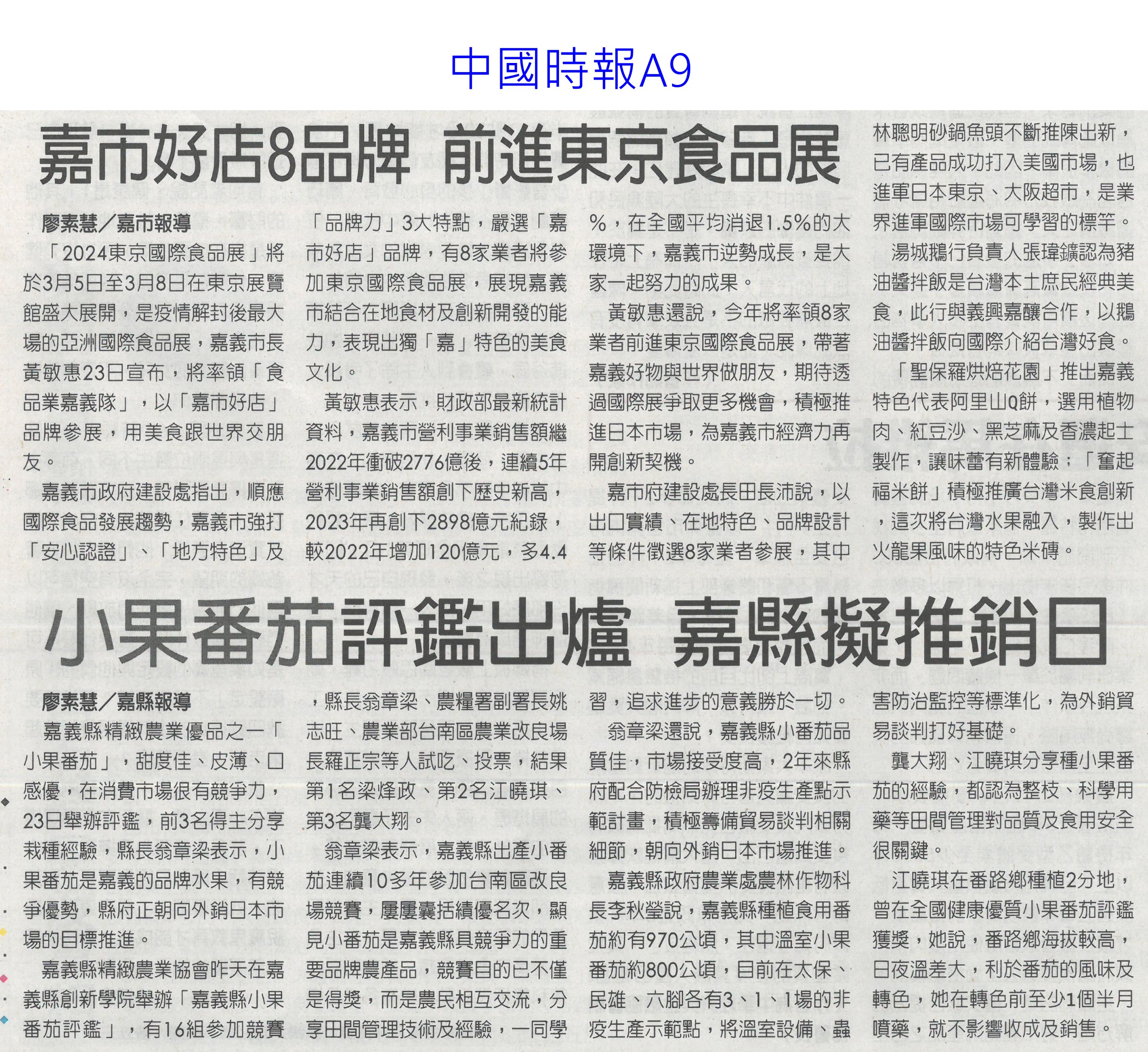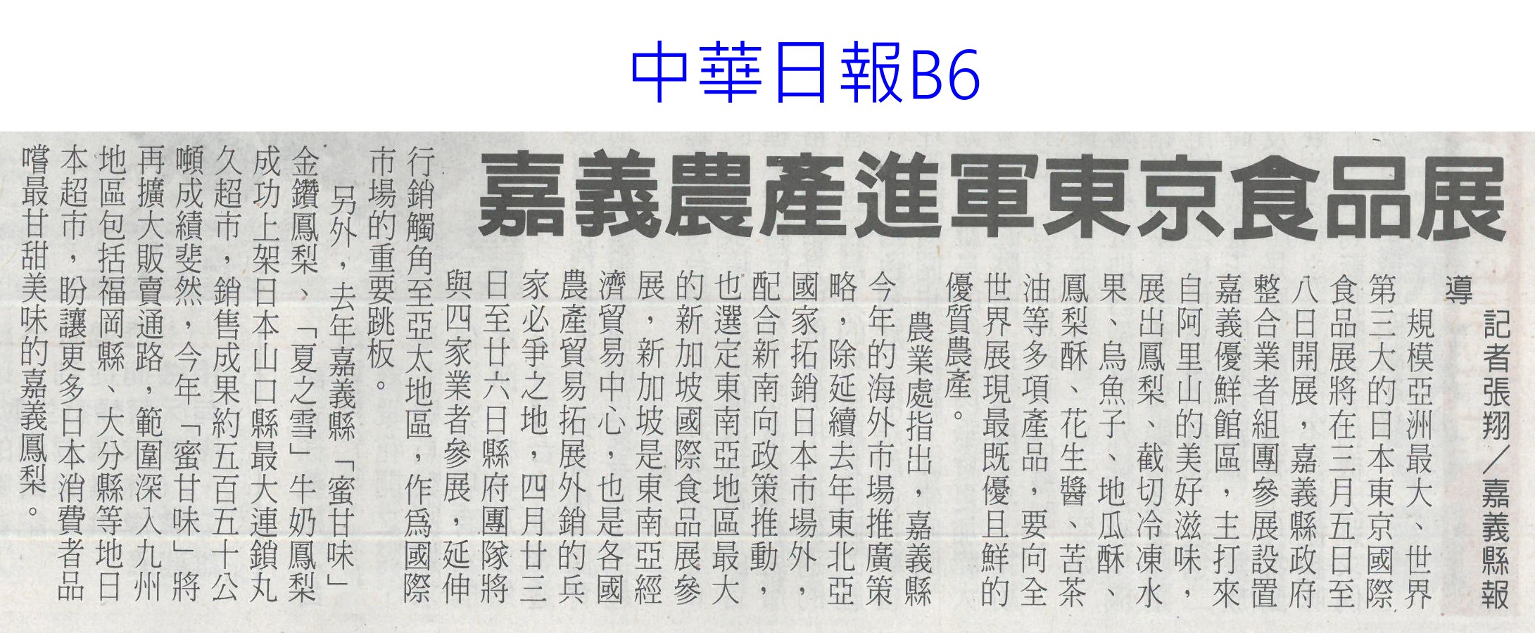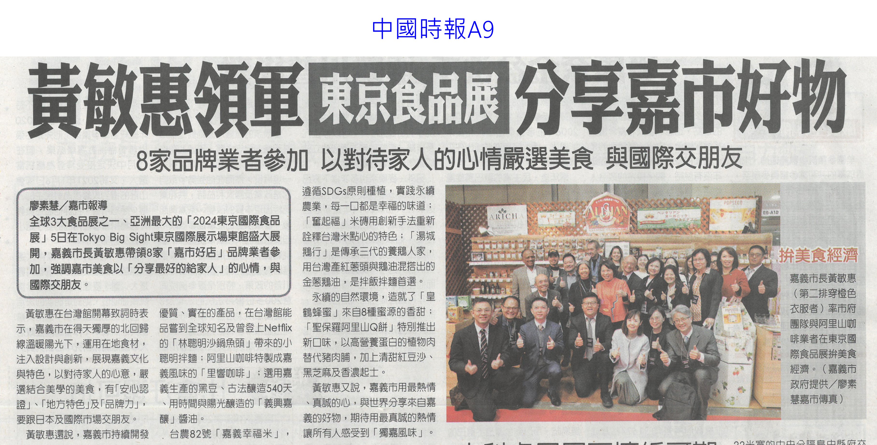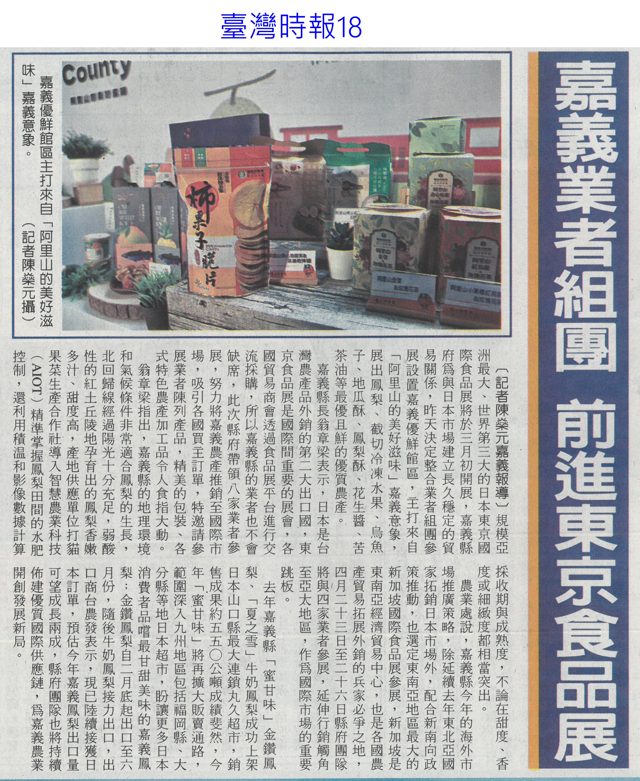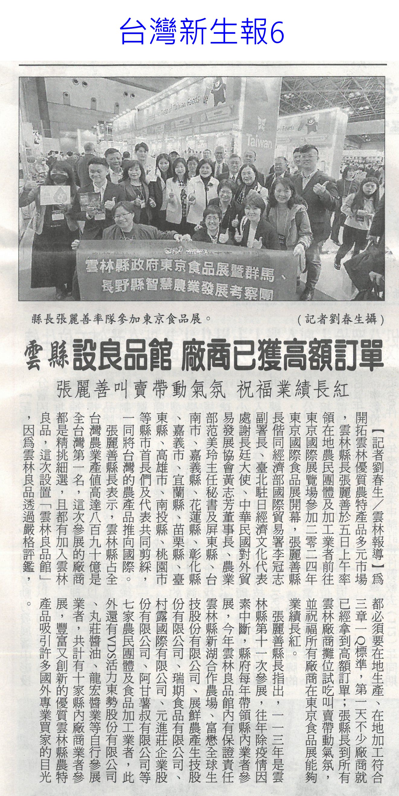 首頁萵苣觀新聞 萵苣觀新聞 排序 發布日期 更新日期 序號 發布日期 標題 861. 113/03/07 雲縣表揚十大菁英農民(台灣新生報6) 862. 113/03/06 嘉市好店站上國際舞台(台灣新生報6) 863. 113/03/06 雲縣設良品館 廠商已獲高額訂單(台灣新生報6) 864. 113/03/06 黃敏惠領軍東京食品展 分享嘉市好物(中國時報A9) 865. 113/03/06 2024雲林良品前進東京國際食品展 獲國際肯定(中國時報A9) 866. 113/03/04 有機農產品 去年外銷逾40噸創新高(自由時報A8) 867. 113/03/04 人工增雨 曾文水庫估進帳20萬噸(中國時報A9) 868. 113/03/04 張麗善率農業團隊訪日交流(台灣新生報6) 869. 113/03/01 曾文水庫蓄水率6成 水情穩定(自由時報A11) 870. 113/03/01 嘉義業者組團 前進東京食品展(臺灣時報18) 871. 113/03/01 嘉義農產進軍東京食品展(中華日報B6) 872. 113/03/01 嘉縣前進東京食品展 行銷農漁產品(中國時報A9) 873. 113/03/01 雲林特產拚外銷 進軍東京食品展(臺灣時報12) 874. 113/02/26 東京國際食品展 嘉市不缺席(民眾日報12) 875. 113/02/26 嘉義8特色好店 前進東京參展(中華日報B6) 876. 113/02/26 柳營公所與無人機農耕團隊簽防災支援協定(中華日報B3) 877. 113/02/26 嘉市好店8品牌 前進東京食品展(中國時報A9) 878. 113/02/26 農業部4政策 拚2040農業淨零(自由時報A7) 879. 113/02/26 花蓮小農種碳 一舉兩得(自由時報A7) 880. 113/02/26 南市青農聯誼會選舉 許玉靜連任總會長(台灣新生報8) 第 44/142 頁,共 2828 筆上一頁到第123456789101112131415161718192021222324252627282930313233343536373839404142434445464748495051525354555657585960616263646566676869707172737475767778798081828384858687888990919293949596979899100101102103104105106107108109110111112113114115116117118119120121122123124125126127128129130131132133134135136137138139140141142頁下一頁每頁103070筆資料