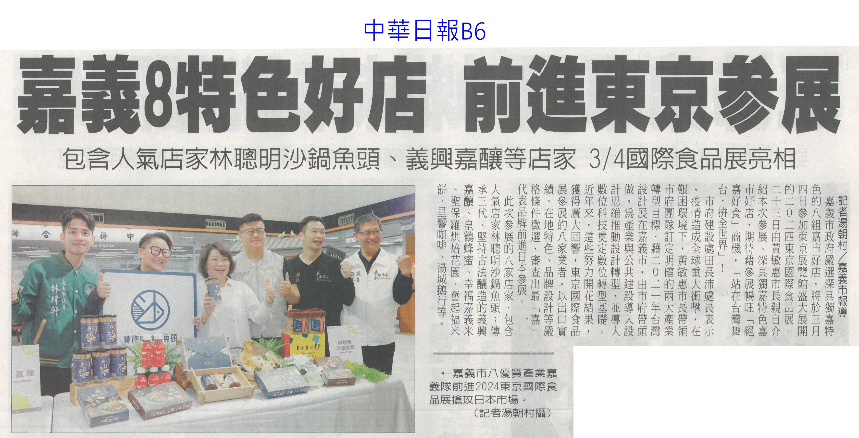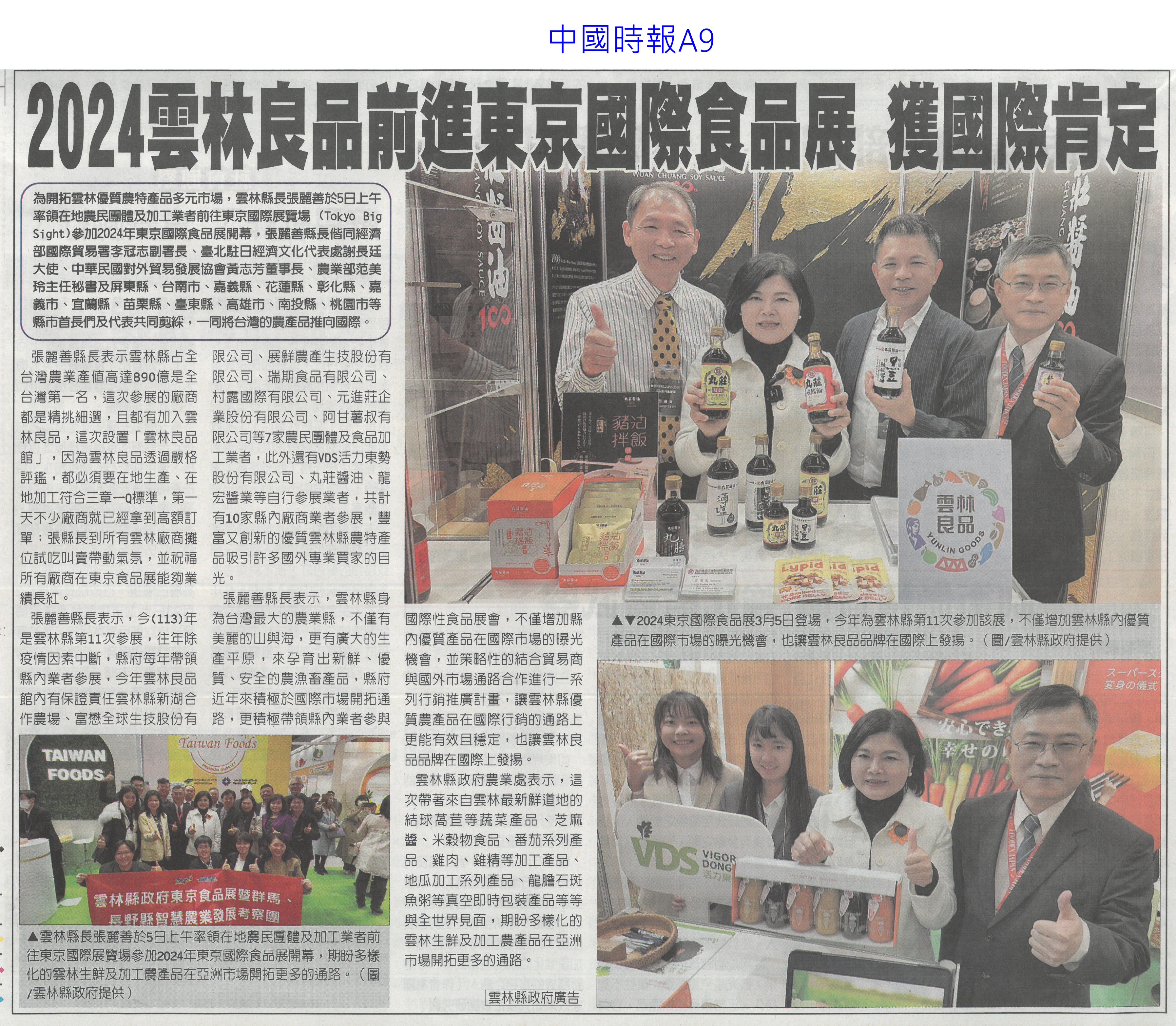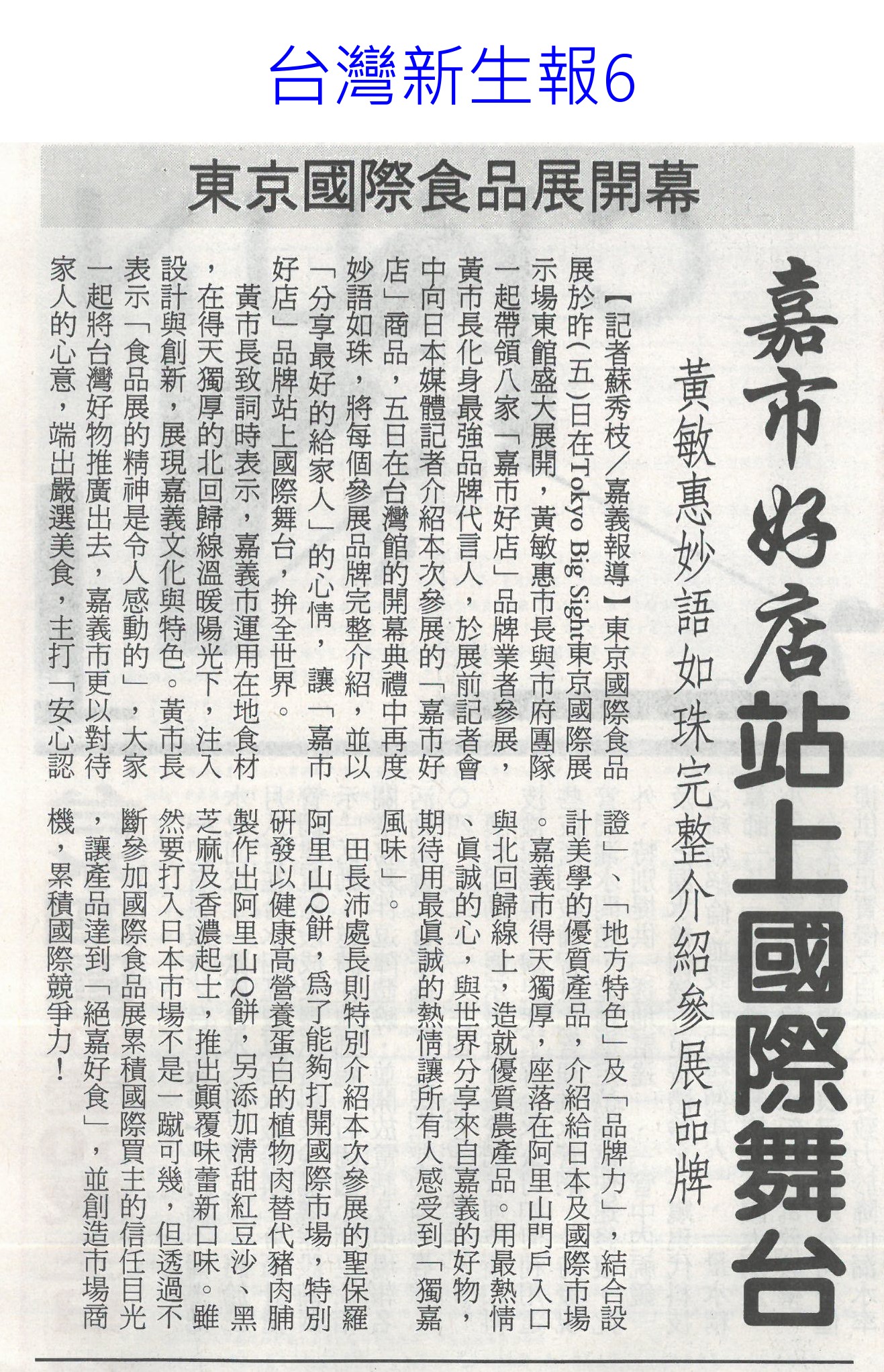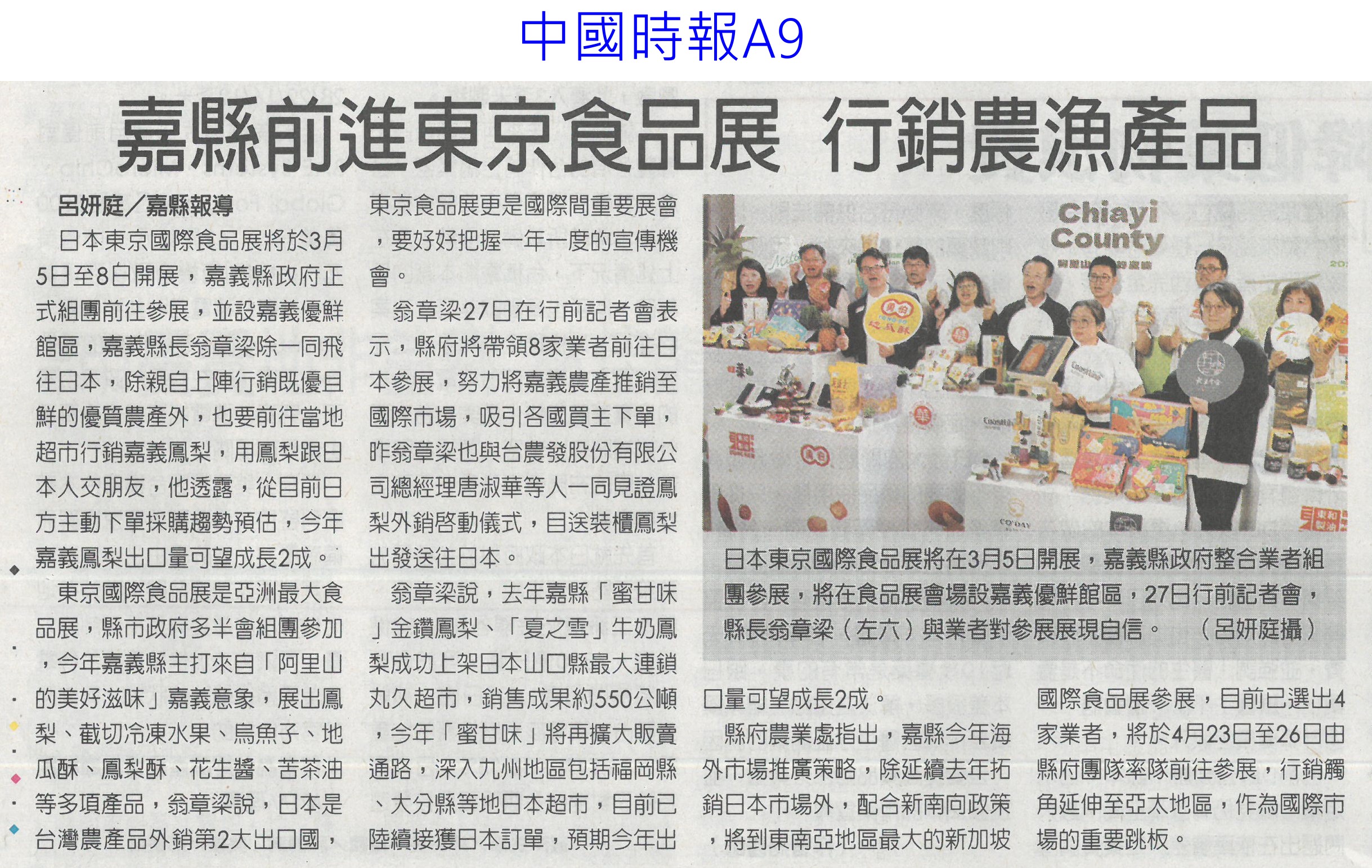 首頁萵苣觀新聞 萵苣觀新聞 排序 發布日期 更新日期 序號 發布日期 標題 861. 113/03/07 雲縣表揚十大菁英農民(台灣新生報6) 862. 113/03/06 嘉市好店站上國際舞台(台灣新生報6) 863. 113/03/06 雲縣設良品館 廠商已獲高額訂單(台灣新生報6) 864. 113/03/06 黃敏惠領軍東京食品展 分享嘉市好物(中國時報A9) 865. 113/03/06 2024雲林良品前進東京國際食品展 獲國際肯定(中國時報A9) 866. 113/03/04 有機農產品 去年外銷逾40噸創新高(自由時報A8) 867. 113/03/04 人工增雨 曾文水庫估進帳20萬噸(中國時報A9) 868. 113/03/04 張麗善率農業團隊訪日交流(台灣新生報6) 869. 113/03/01 曾文水庫蓄水率6成 水情穩定(自由時報A11) 870. 113/03/01 嘉義業者組團 前進東京食品展(臺灣時報18) 871. 113/03/01 嘉義農產進軍東京食品展(中華日報B6) 872. 113/03/01 嘉縣前進東京食品展 行銷農漁產品(中國時報A9) 873. 113/03/01 雲林特產拚外銷 進軍東京食品展(臺灣時報12) 874. 113/02/26 東京國際食品展 嘉市不缺席(民眾日報12) 875. 113/02/26 嘉義8特色好店 前進東京參展(中華日報B6) 876. 113/02/26 柳營公所與無人機農耕團隊簽防災支援協定(中華日報B3) 877. 113/02/26 嘉市好店8品牌 前進東京食品展(中國時報A9) 878. 113/02/26 農業部4政策 拚2040農業淨零(自由時報A7) 879. 113/02/26 花蓮小農種碳 一舉兩得(自由時報A7) 880. 113/02/26 南市青農聯誼會選舉 許玉靜連任總會長(台灣新生報8) 第 44/142 頁,共 2828 筆上一頁到第123456789101112131415161718192021222324252627282930313233343536373839404142434445464748495051525354555657585960616263646566676869707172737475767778798081828384858687888990919293949596979899100101102103104105106107108109110111112113114115116117118119120121122123124125126127128129130131132133134135136137138139140141142頁下一頁每頁103070筆資料