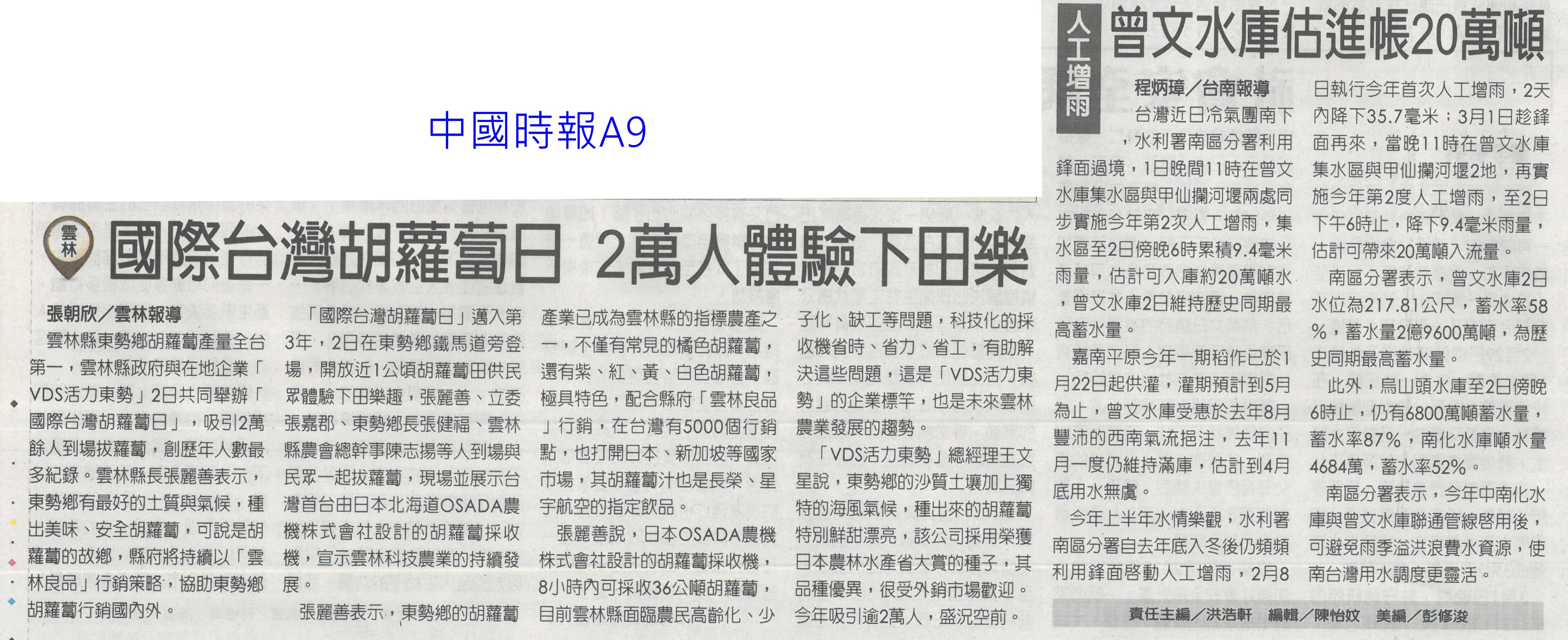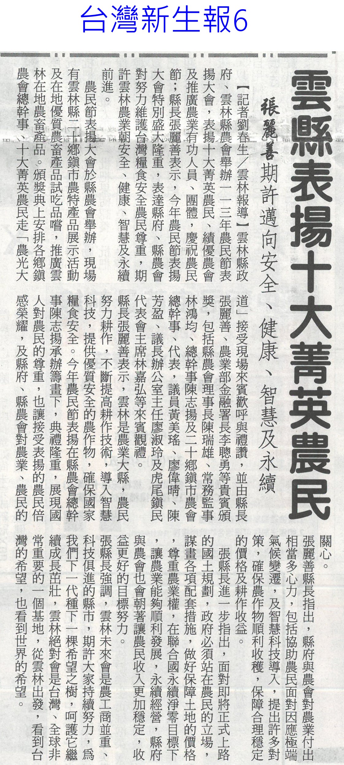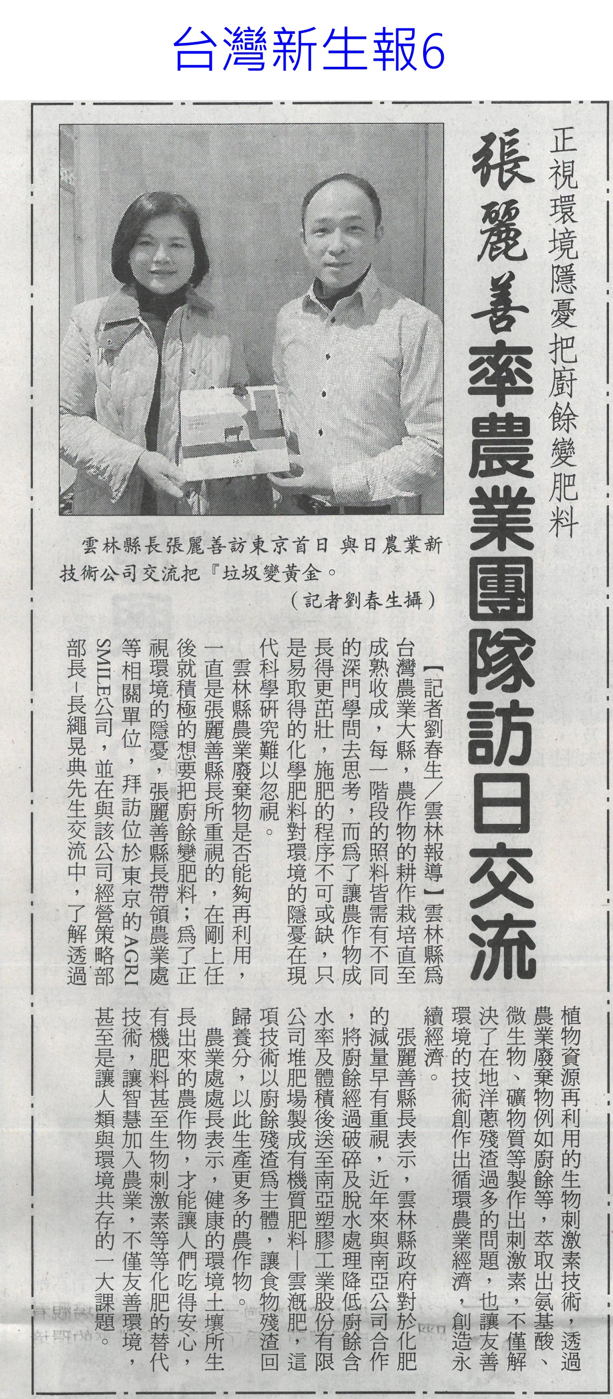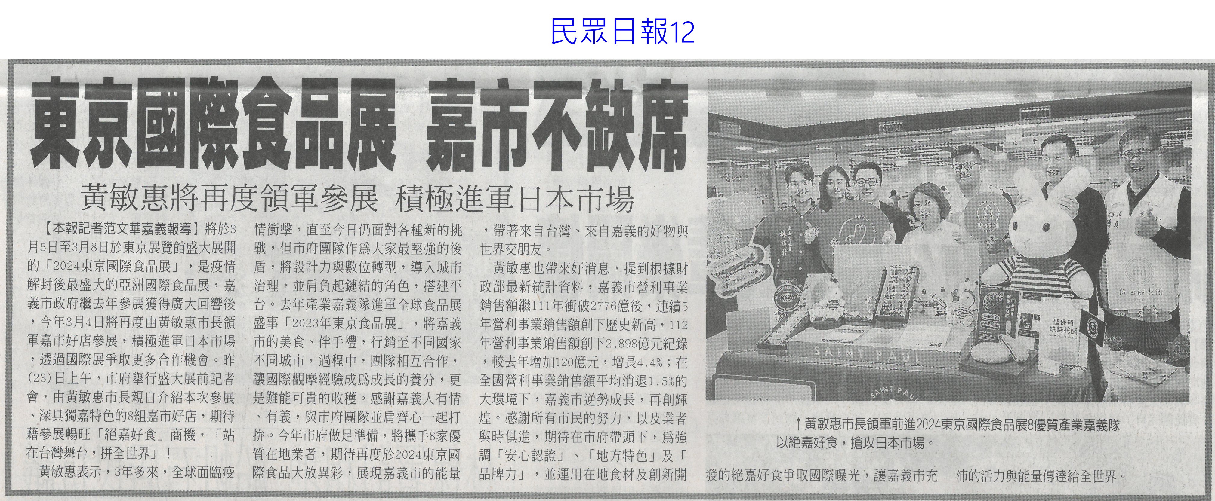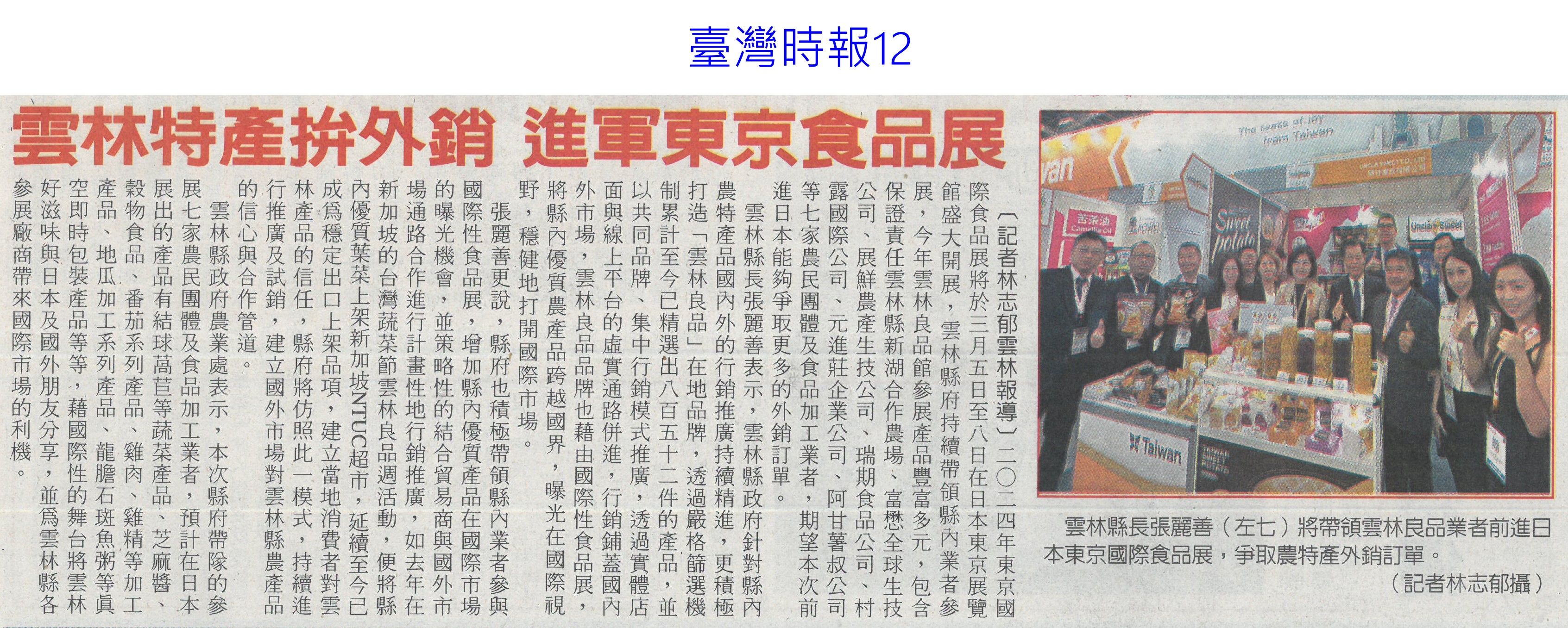首頁萵苣觀新聞 萵苣觀新聞 排序 發布日期 更新日期 序號 發布日期 標題 861. 113/03/07 雲縣表揚十大菁英農民(台灣新生報6) 862. 113/03/06 嘉市好店站上國際舞台(台灣新生報6) 863. 113/03/06 雲縣設良品館 廠商已獲高額訂單(台灣新生報6) 864. 113/03/06 黃敏惠領軍東京食品展 分享嘉市好物(中國時報A9) 865. 113/03/06 2024雲林良品前進東京國際食品展 獲國際肯定(中國時報A9) 866. 113/03/04 有機農產品 去年外銷逾40噸創新高(自由時報A8) 867. 113/03/04 人工增雨 曾文水庫估進帳20萬噸(中國時報A9) 868. 113/03/04 張麗善率農業團隊訪日交流(台灣新生報6) 869. 113/03/01 曾文水庫蓄水率6成 水情穩定(自由時報A11) 870. 113/03/01 嘉義業者組團 前進東京食品展(臺灣時報18) 871. 113/03/01 嘉義農產進軍東京食品展(中華日報B6) 872. 113/03/01 嘉縣前進東京食品展 行銷農漁產品(中國時報A9) 873. 113/03/01 雲林特產拚外銷 進軍東京食品展(臺灣時報12) 874. 113/02/26 東京國際食品展 嘉市不缺席(民眾日報12) 875. 113/02/26 嘉義8特色好店 前進東京參展(中華日報B6) 876. 113/02/26 柳營公所與無人機農耕團隊簽防災支援協定(中華日報B3) 877. 113/02/26 嘉市好店8品牌 前進東京食品展(中國時報A9) 878. 113/02/26 農業部4政策 拚2040農業淨零(自由時報A7) 879. 113/02/26 花蓮小農種碳 一舉兩得(自由時報A7) 880. 113/02/26 南市青農聯誼會選舉 許玉靜連任總會長(台灣新生報8) 第 44/142 頁,共 2828 筆上一頁到第123456789101112131415161718192021222324252627282930313233343536373839404142434445464748495051525354555657585960616263646566676869707172737475767778798081828384858687888990919293949596979899100101102103104105106107108109110111112113114115116117118119120121122123124125126127128129130131132133134135136137138139140141142頁下一頁每頁103070筆資料