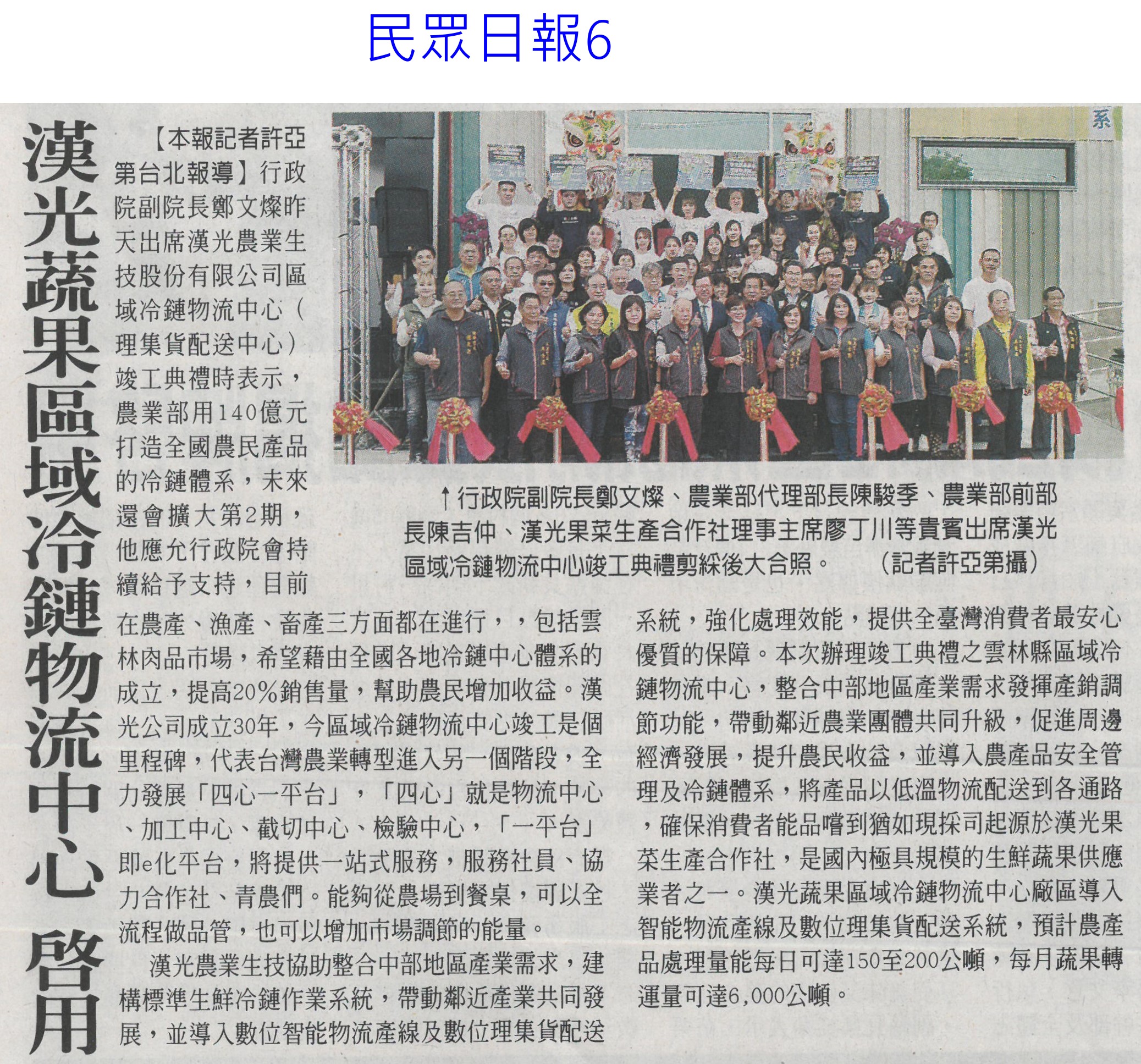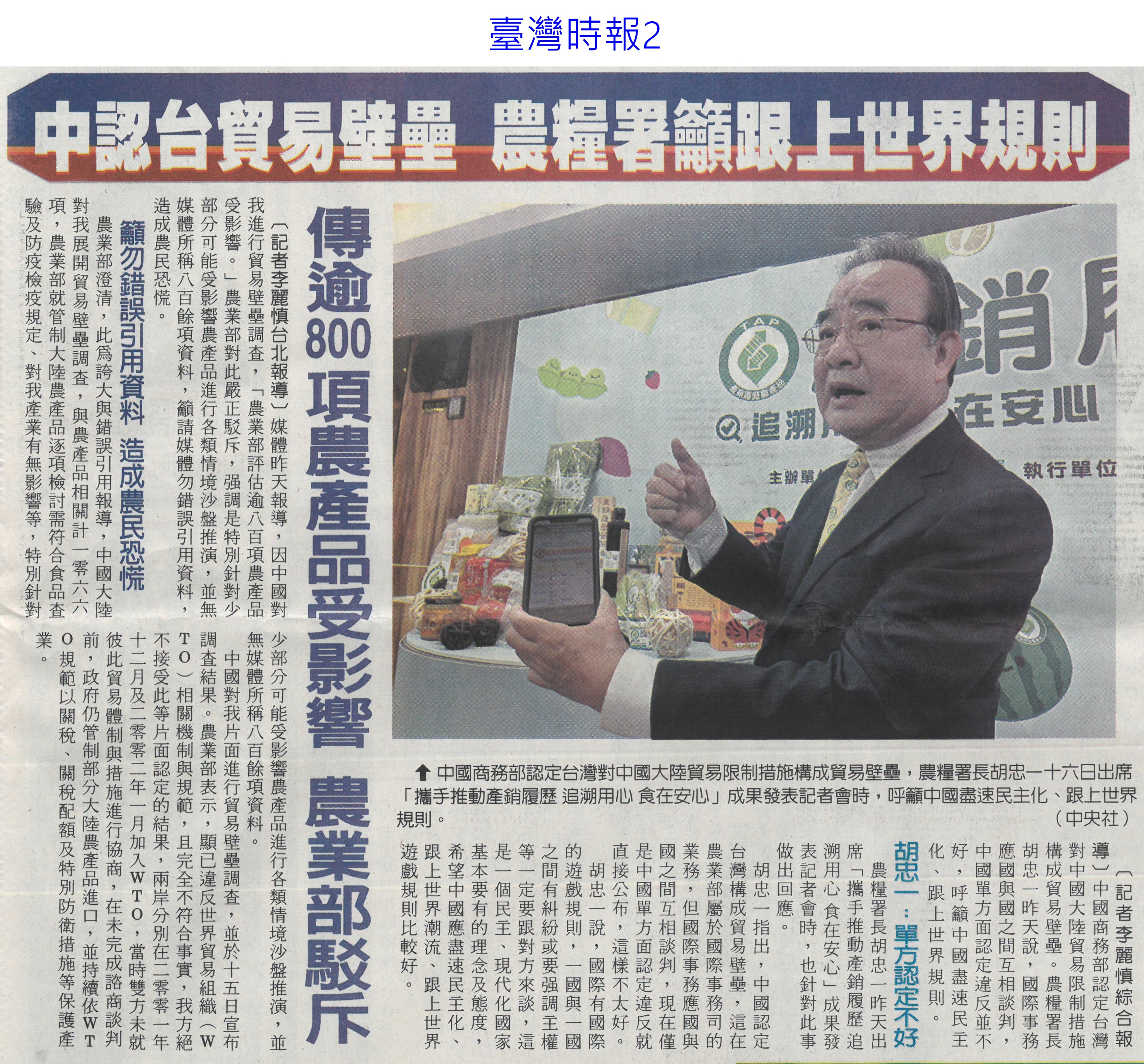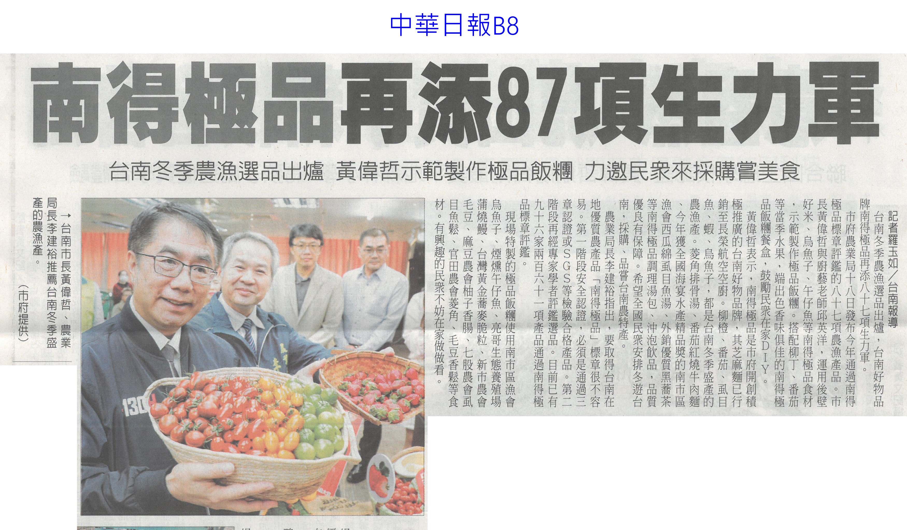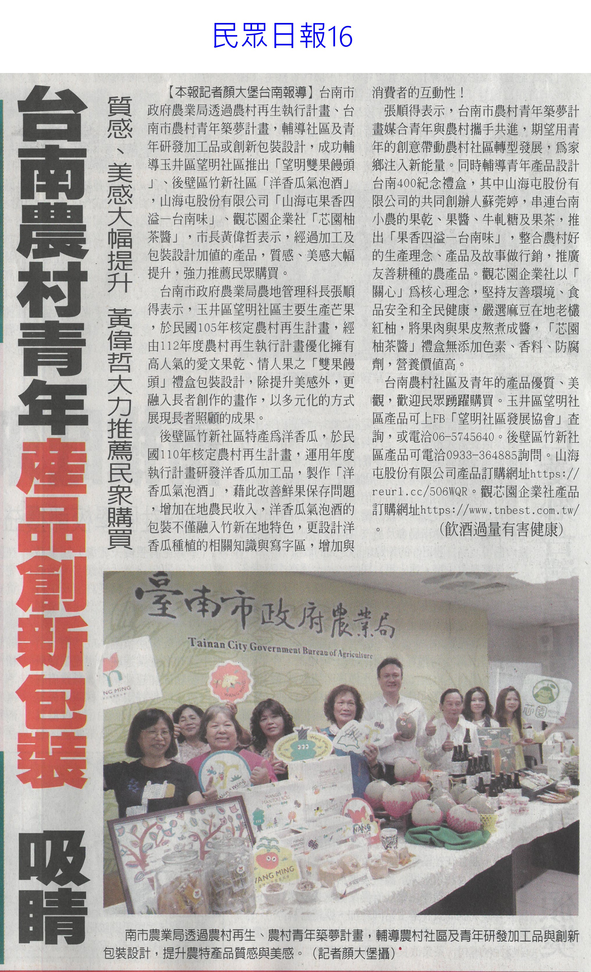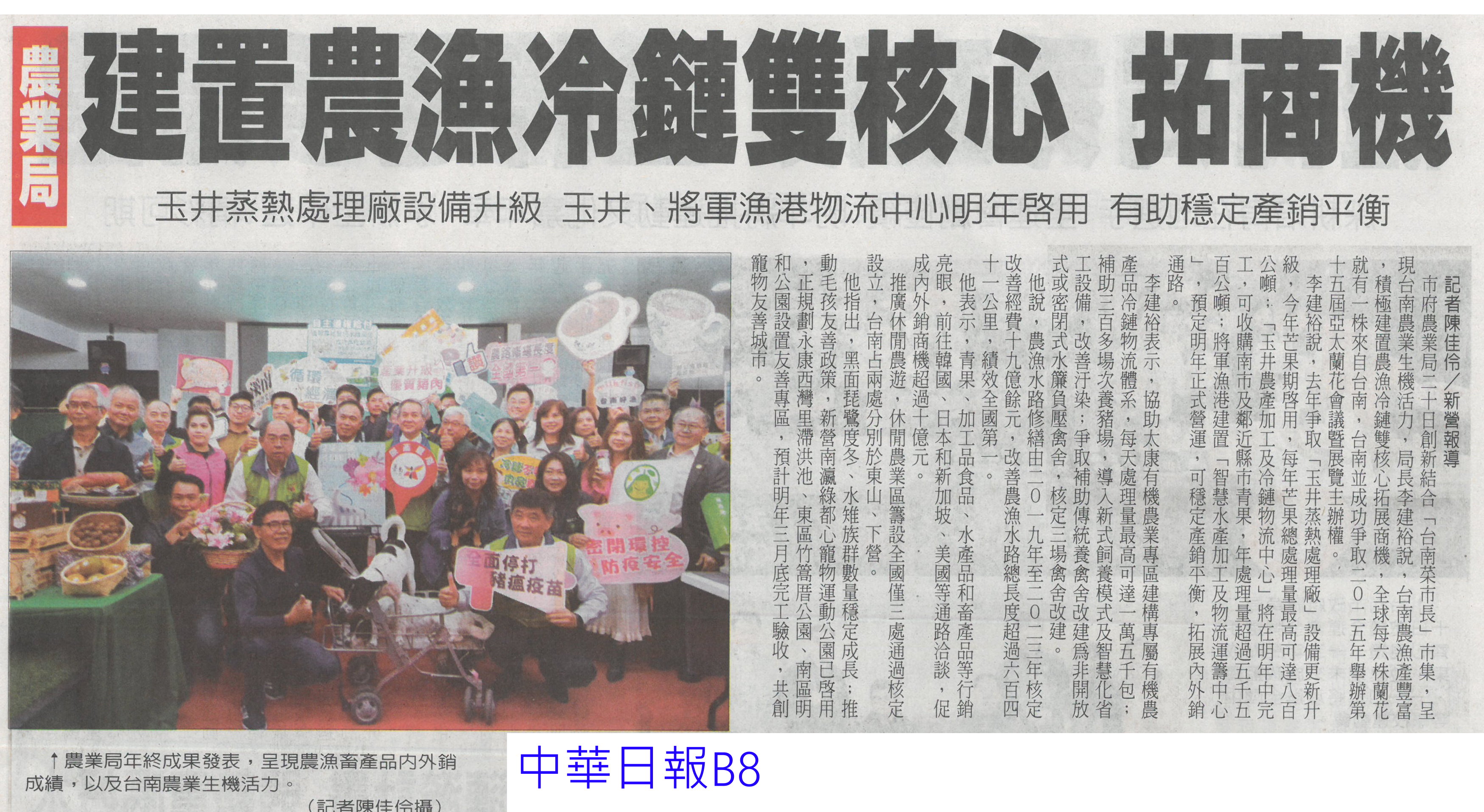首頁萵苣觀新聞 萵苣觀新聞 排序 發布日期 更新日期 序號 發布日期 標題 921. 113/01/02 雲縣府與量販店行銷農村好物(中華日報B6) 922. 113/01/02 企業CSR採購 挺國產優質農產品(民眾日報4) 923. 112/12/26 雲林良品大葉高島屋快閃 引搶購風潮(臺灣時報18) 924. 112/12/25 洗菜去毒三步驟 先浸泡、後沖洗、再切除 925. 112/12/22 台南冬季農漁選品大賞出爐(台灣新生報6) 926. 112/12/22 雲林良品偕全家超商 推聯名鮮食(臺灣時報18) 927. 112/12/22 全國十大績優農業產銷班 陳揆頒獎表揚(民眾日報4) 928. 112/12/22 農業局 建置農漁冷鏈雙核心 拓商機(中華日報B8) 929. 112/12/22 農產品安嗎?農業部:若有損失仍可控制(中華日報A2) 930. 112/12/20 南得極品再添87項生力軍(中華日報B8) 931. 112/12/20 台南市府行銷南得極品(中國時報A9) 932. 112/12/20 雲縣府聯手超商 推雲林良品鮮食(中國時報A9) 933. 112/12/18 中認台貿易壁壘 農糧署籲跟上世界規則(臺灣時報2) 934. 112/12/18 貿易壁壘影響8百項農產? 農業部:誇大(中華日報A1) 935. 112/12/14 台南農村青年產品創新包裝 吸睛(民眾日報16) 936. 112/12/14 農村再生+青年築夢 秀成果(中華日報B8) 937. 112/12/13 台肥握多管道尿素來源 肥料供應無虞(民眾日報4) 938. 112/12/13 漢光蔬果區域冷鏈物流中心 啟用(民眾日報6) 939. 112/12/13 漢光區域級冷鏈物流中心竣工(臺灣時報18) 940. 112/12/13 國家農業科學獎 增加國際競爭力(民眾日報3) 第 47/142 頁,共 2828 筆上一頁到第123456789101112131415161718192021222324252627282930313233343536373839404142434445464748495051525354555657585960616263646566676869707172737475767778798081828384858687888990919293949596979899100101102103104105106107108109110111112113114115116117118119120121122123124125126127128129130131132133134135136137138139140141142頁下一頁每頁103070筆資料