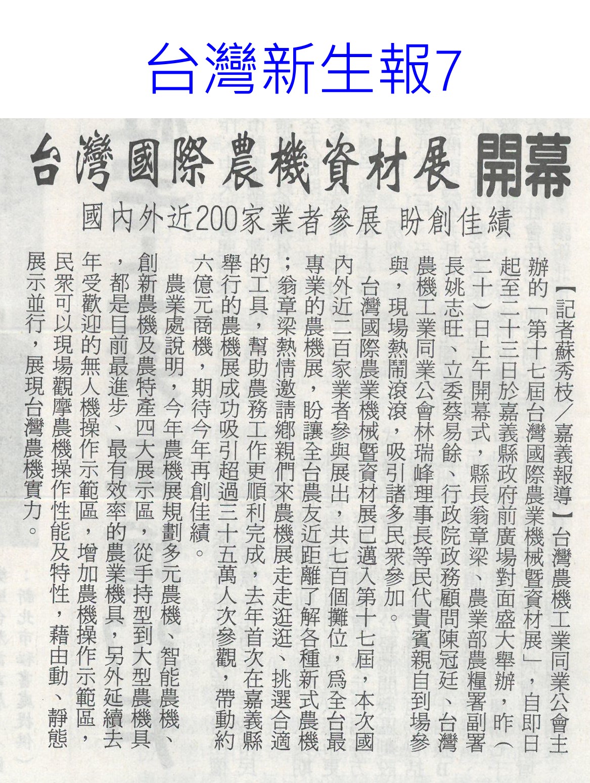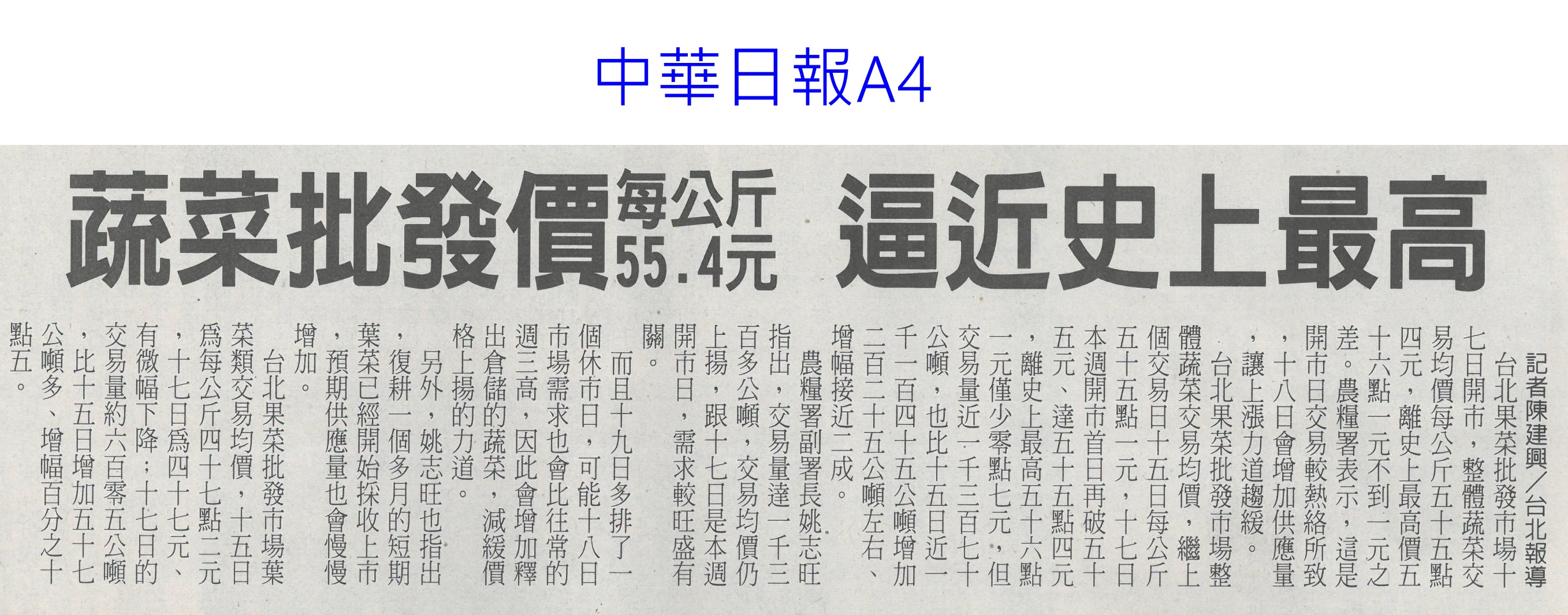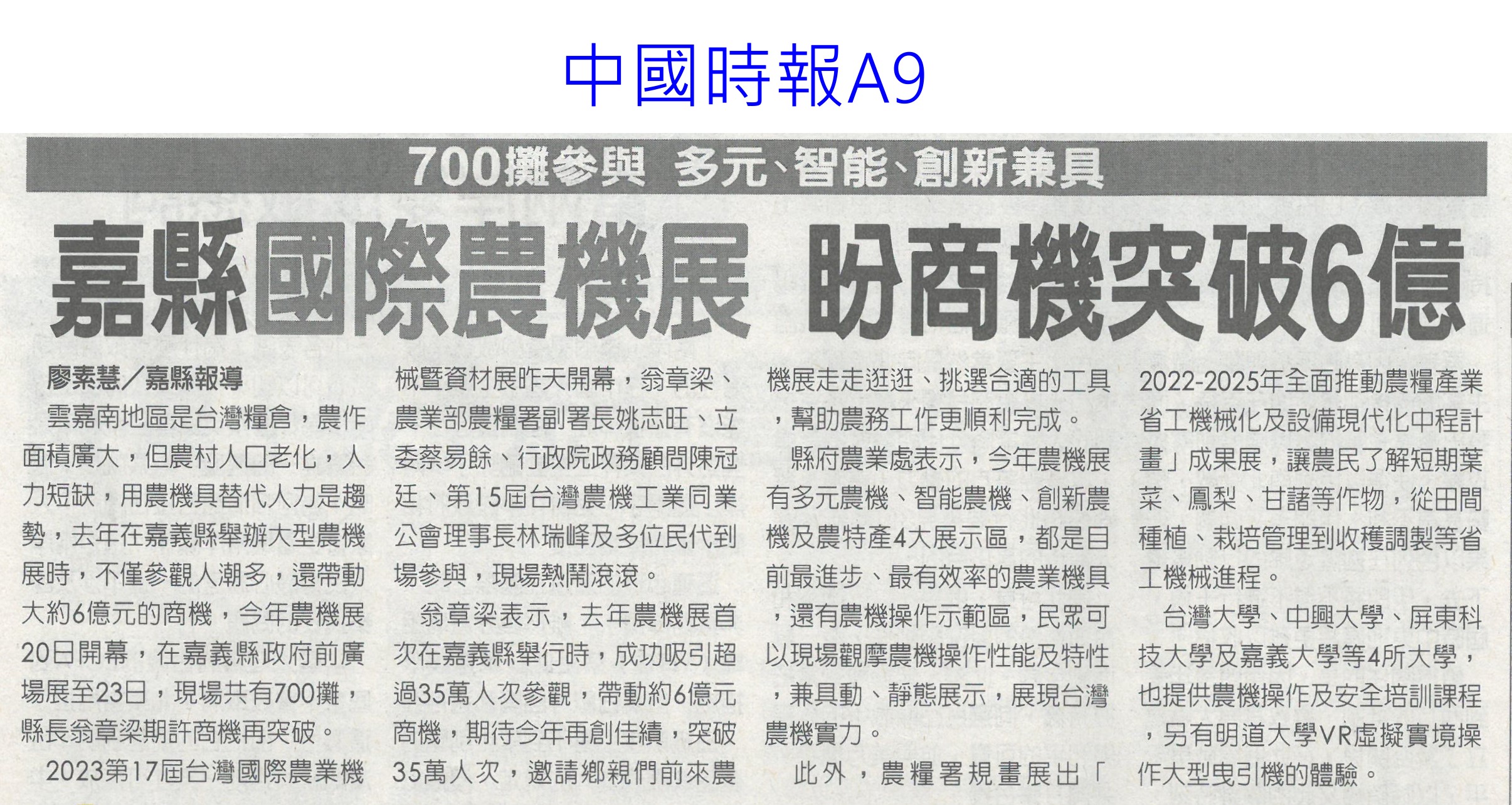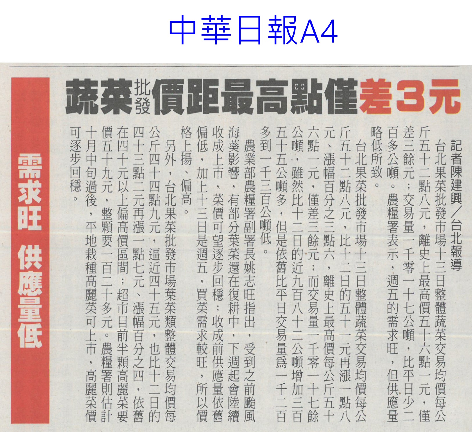 首頁萵苣觀新聞 萵苣觀新聞 排序 發布日期 更新日期 序號 發布日期 標題 1001. 112/10/24 雲林良品專區 擴大行銷優質農產(中國時報A9) 1002. 112/10/24 南高屏山珍海味全體驗 1003. 112/10/23 台灣國際農機資材展 開幕(台灣新生報7) 1004. 112/10/23 嘉縣國際農機展 判商機突破6億(中國時報A9) 1005. 112/10/23 南市八農漁會榮獲農金獎(台灣新生報8) 1006. 112/10/23 112年度產銷履歷達人 頒獎(民眾日報4) 1007. 112/10/20 小犬颱風吹毀溫網室 雲七鄉鎮列現金救助(中華日報B6) 1008. 112/10/20 農業補助 議員認應有未來性(中華日報B2) 1009. 112/10/20 嘉縣廢農膜回收 再造新價值(中國時報A9) 1010. 112/10/19 明年春耕 供灌無虞(自由時報A13) 1011. 112/10/19 水情樂觀 明年梅雨季前用水無虞(中華日報B8) 1012. 112/10/19 雲林十大菁英農民評選出爐(中華日報B6) 1013. 112/10/19 蔬菜批發價每公斤55.4元 逼近史上最高(中華日報A4) 1014. 112/10/19 水庫喝飽 秋冬及明春灌溉沒問題(自由時報A13) 1015. 112/10/16 嘉有好市集復辦(自由時報A12) 1016. 112/10/16 蔬菜批發價距最高點僅差3元(中華日報A4) 1017. 112/10/13 國際農機展20日 嘉義登場(臺灣時報18) 1018. 112/10/13 熱風侵襲雲林農損慘重 農業部同意補助(民眾日報12) 1019. 112/10/12 技術交流 市農會與石日川農業締約(自由時報A13) 1020. 112/10/12 食農教育遊程 南市推4條路線(民眾日報12) 第 51/142 頁,共 2828 筆上一頁到第123456789101112131415161718192021222324252627282930313233343536373839404142434445464748495051525354555657585960616263646566676869707172737475767778798081828384858687888990919293949596979899100101102103104105106107108109110111112113114115116117118119120121122123124125126127128129130131132133134135136137138139140141142頁下一頁每頁103070筆資料