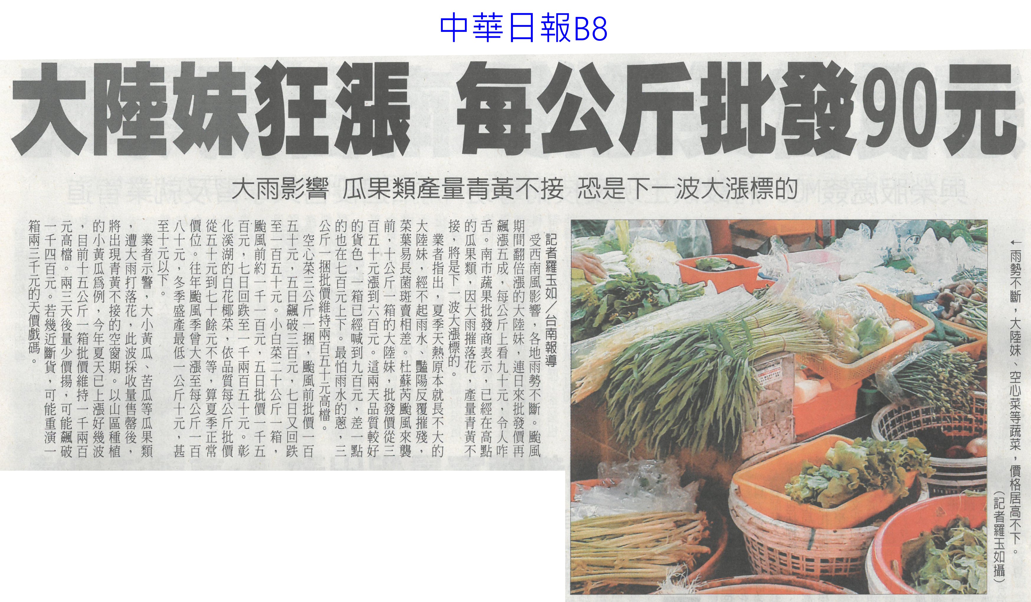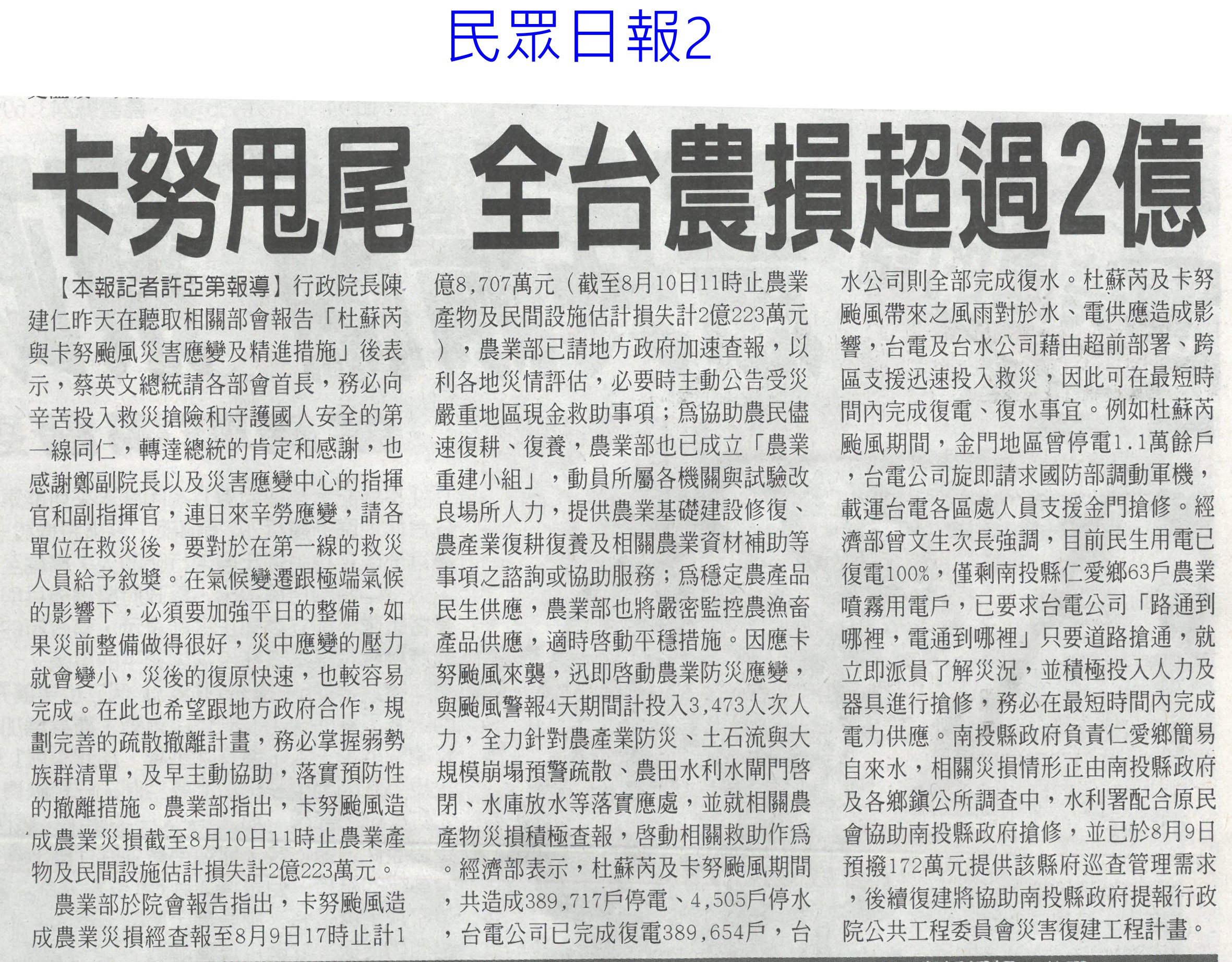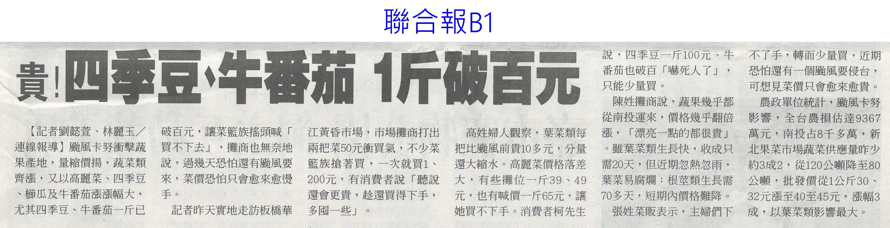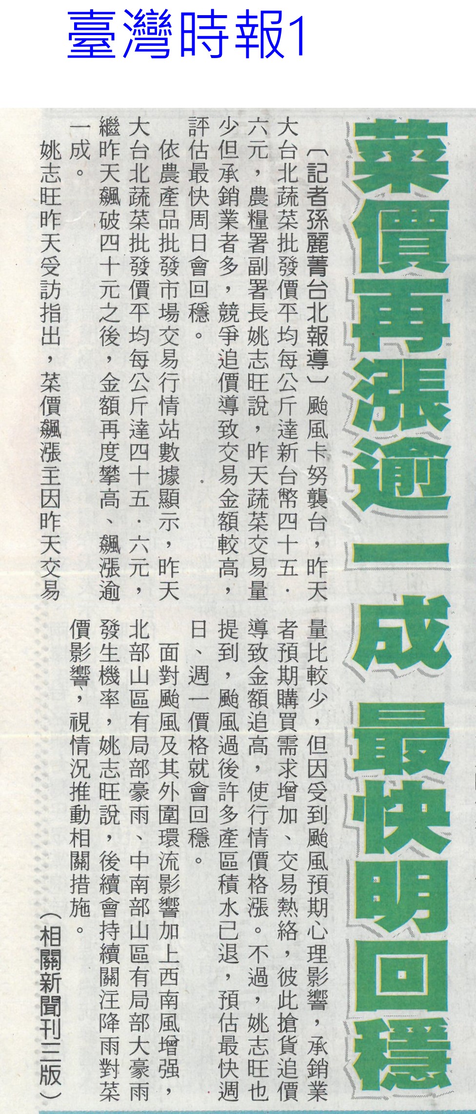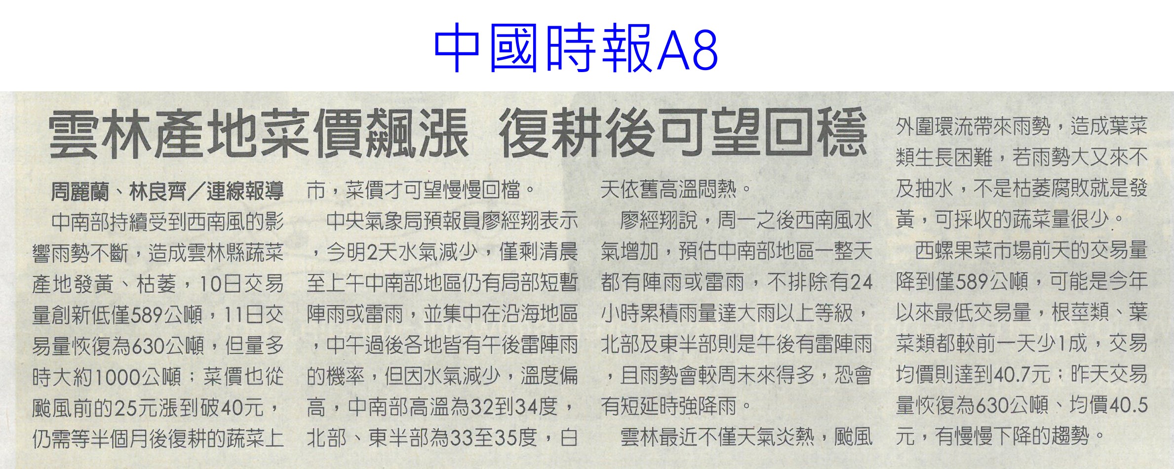 首頁萵苣觀新聞 萵苣觀新聞 排序 發布日期 更新日期 序號 發布日期 標題 1101. 112/08/17 嘉縣國本學堂 助小農創新提升競爭力(中國時報A9) 1102. 112/08/14 印尼農業畜牧業移工 最快9月可引進來台(中國時報A4) 1103. 112/08/14 農藥10年減半 納健康與環境評估(自由時報A9) 1104. 112/08/14 卡努甩尾 全台農損超過2億(民眾日報2) 1105. 112/08/14 雲林產地菜價飆漲 復耕後可望回穩(中國時報A8) 1106. 112/08/14 農局開設農村再生系列工作坊(台灣新生報8) 1107. 112/08/10 台美農貿逆差逾千億 再攀新高(聯合報A5) 1108. 112/08/08 雨水挹注曾文水庫蓄水破5成(臺灣時報19) 1109. 112/08/08 卡努解渴 嘉義水情轉正常(臺灣時報18) 1110. 112/08/08 曾文水庫蓄水率重回5成(自由時報A2) 1111. 112/08/08 大陸妹狂漲 每公斤批發90元(中華日報B8) 1112. 112/08/08 曾文水庫蓄水逾52% 嘉南平原解除限水(中國時報A8) 1113. 112/08/07 菜價再漲逾一成 最快明回穩(臺灣時報1) 1114. 112/08/07 改善5道路 東山咖啡道路升級(自由時報A13) 1115. 112/08/07 2天降雨300毫米 曾文水庫蓄水率回到4成(中國時報A9) 1116. 112/08/07 貴!四季豆 牛番茄 1斤破百元(聯合報B1) 1117. 112/08/07 卡努颱風農損1.2億 南投占9成(臺灣時報5) 1118. 112/08/04 陳吉仲赴美 推介臺灣農水產品(民眾日報6) 1119. 112/08/04 農業部臺南農改場 畜試所揭牌(台灣新生報6) 1120. 112/08/03 砍掉重練 農業部要做厚生的靠山(中國時報A10) 第 56/142 頁,共 2828 筆上一頁到第123456789101112131415161718192021222324252627282930313233343536373839404142434445464748495051525354555657585960616263646566676869707172737475767778798081828384858687888990919293949596979899100101102103104105106107108109110111112113114115116117118119120121122123124125126127128129130131132133134135136137138139140141142頁下一頁每頁103070筆資料