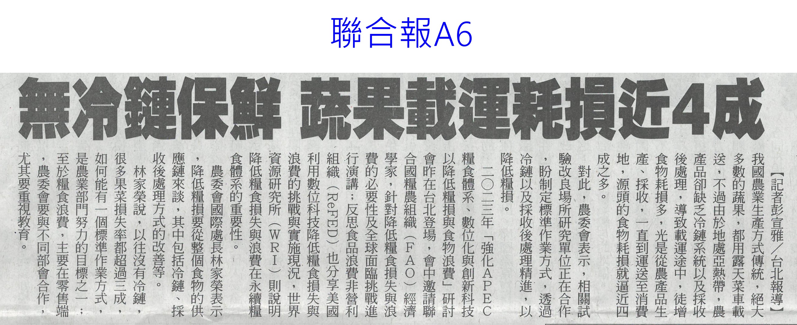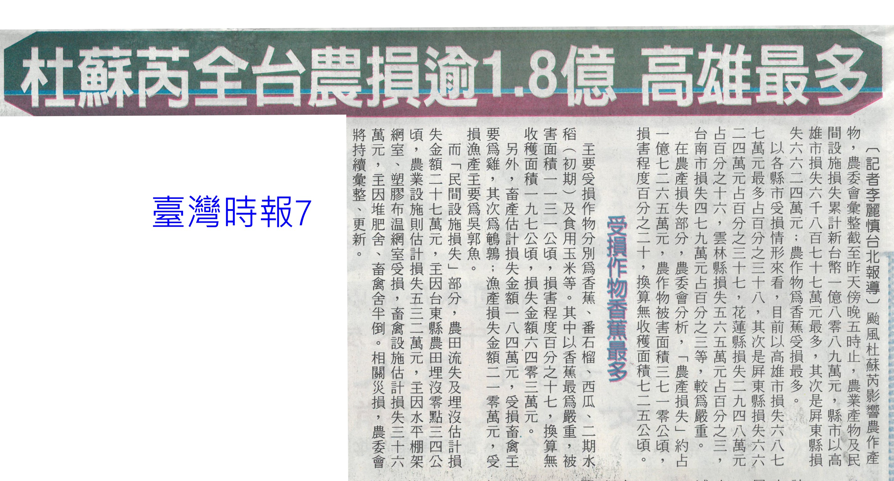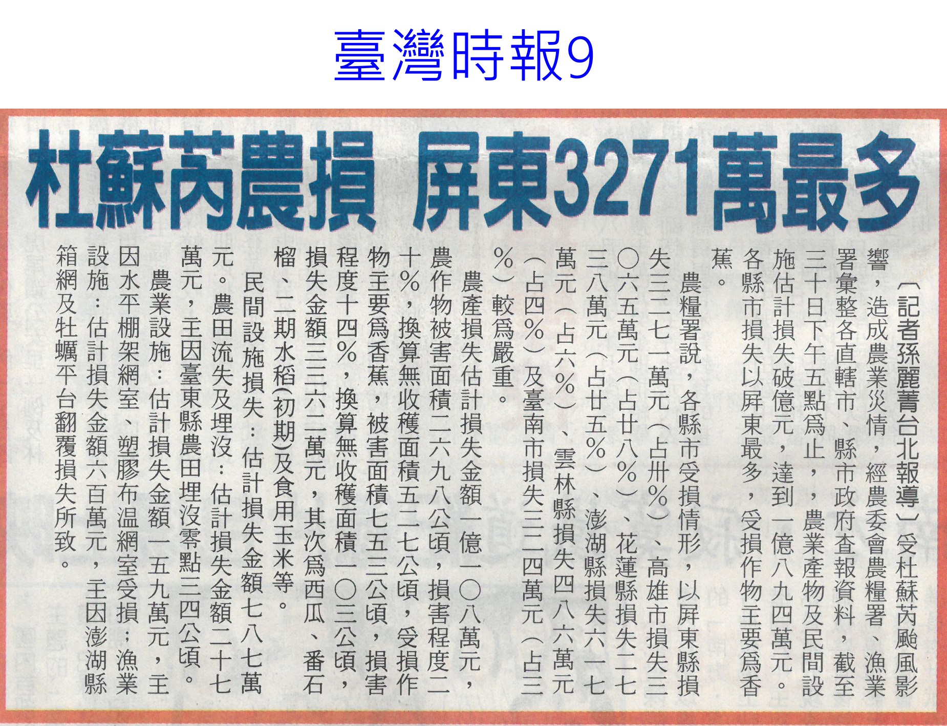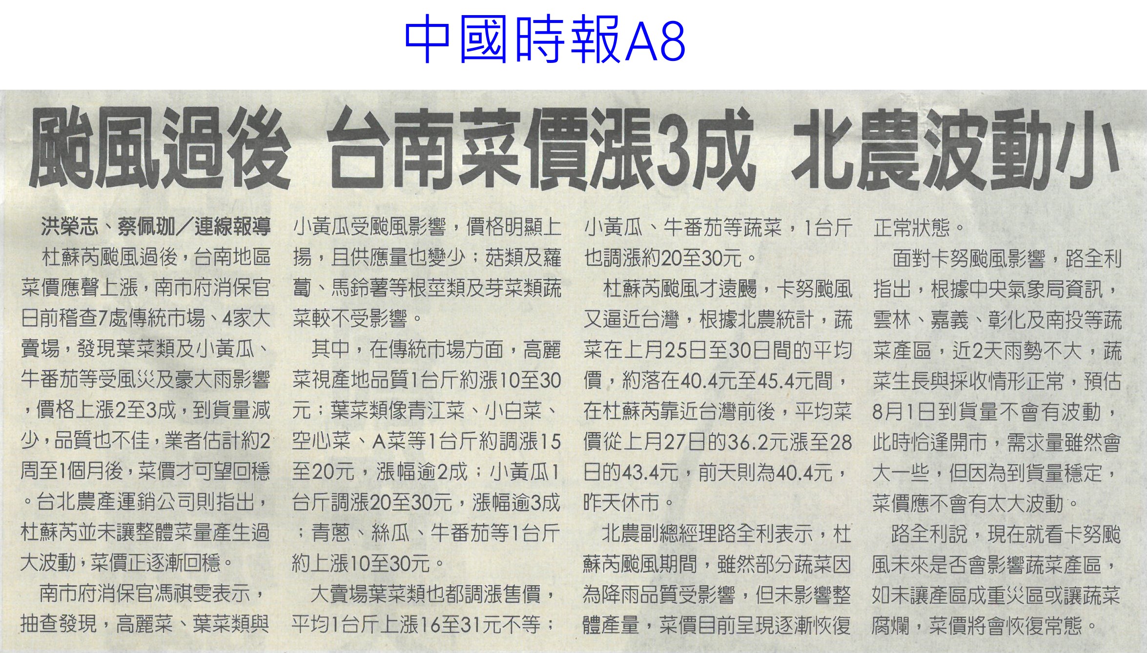 首頁萵苣觀新聞 萵苣觀新聞 排序 發布日期 更新日期 序號 發布日期 標題 1121. 112/08/02 杜蘇芮全台農損逾1.8億 高雄最多(臺灣時報7) 1122. 112/08/02 臺灣美食展 農委會復刻農旬味(民眾日報16) 1123. 112/08/02 農業部今掛牌 陳揆:全力照顧農漁民(民眾日報2) 1124. 112/08/02 颱風後菜價揚 多吃根莖省荷包(中華日報B8) 1125. 112/08/02 颱風過後 台南菜價漲3成 北農波動小(中國時報A8) 1126. 112/08/02 歷經35年農業部揭牌 陳吉仲淋雨謝天(臺灣時報7) 1127. 112/08/02 學者籲農業補助要有智慧(聯合報A4) 1128. 112/08/02 農業部揭牌 陳吉仲:首要任務是因應氣候變遷挑戰(自由時報A9) 1129. 112/08/02 農業部揭牌 小英:做農漁民靠山(民眾日報2) 1130. 112/08/02 臺灣美食展 嘉縣推三冠王(中華日報B6) 1131. 112/07/31 颱風侵襲 全台農損6183萬(中華日報A4) 1132. 112/07/31 杜蘇芮農損 屏東3271萬最多(臺灣時報9) 1133. 112/07/24 無冷鏈保鮮 蔬果載運耗損近4成(聯合報A6) 1134. 112/07/24 暴雨降集水區 台南3大水庫進帳1100萬噸(中國時報A9) 1135. 112/07/24 古坑有機農產合作社 減碳做公益(聯合報B2) 1136. 112/07/24 杜蘇芮沒到菜先漲!農民「見好就收」 蔬菜產地價漲2成 1137. 112/07/21 農作避日頭 留意自身狀況(台灣新生報12) 1138. 112/07/20 黃偉哲偕視察茅港尾農水路改善(民眾日報12) 1139. 112/07/20 農產外銷慘跌 陳吉仲撒幣等升官(民眾日報2) 1140. 112/07/20 嘉義農產深受日本青睞(台灣新生報6) 第 57/142 頁,共 2828 筆上一頁到第123456789101112131415161718192021222324252627282930313233343536373839404142434445464748495051525354555657585960616263646566676869707172737475767778798081828384858687888990919293949596979899100101102103104105106107108109110111112113114115116117118119120121122123124125126127128129130131132133134135136137138139140141142頁下一頁每頁103070筆資料