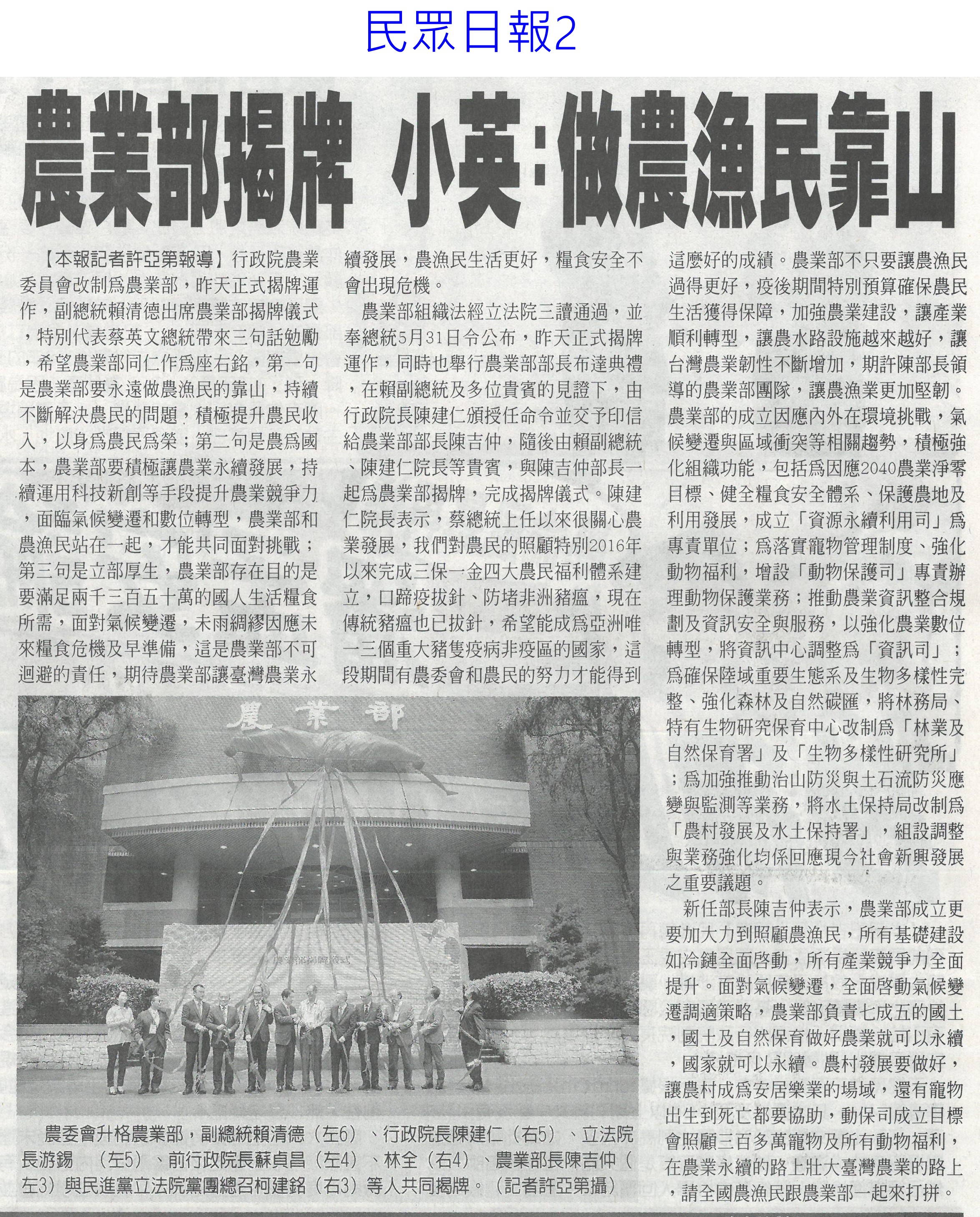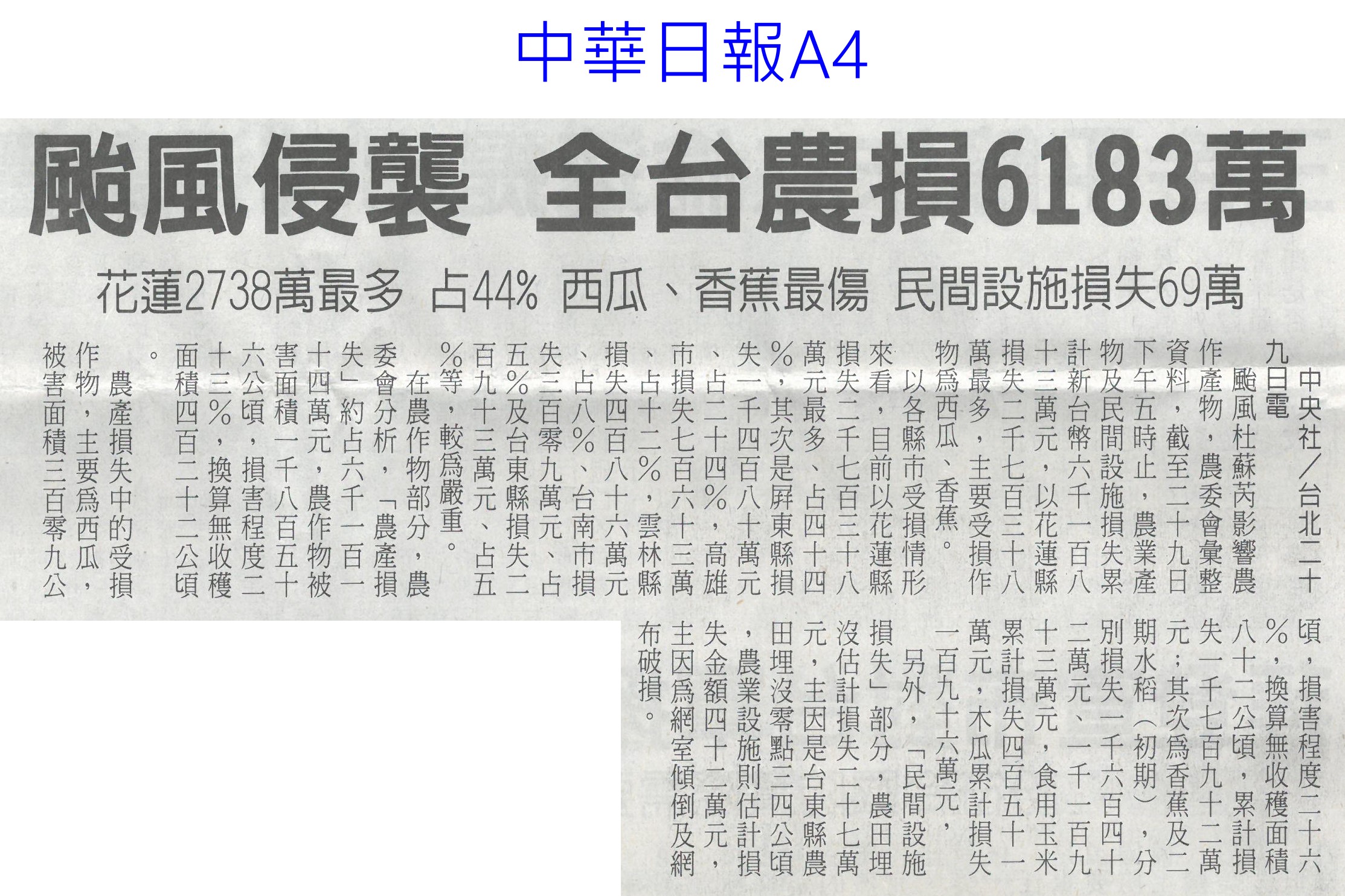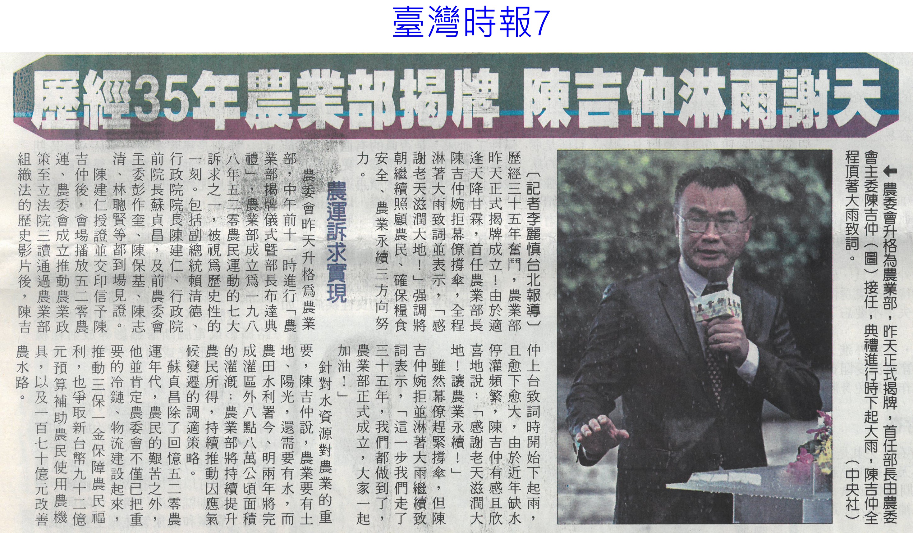 首頁萵苣觀新聞 萵苣觀新聞 排序 發布日期 更新日期 序號 發布日期 標題 1121. 112/08/02 杜蘇芮全台農損逾1.8億 高雄最多(臺灣時報7) 1122. 112/08/02 臺灣美食展 農委會復刻農旬味(民眾日報16) 1123. 112/08/02 農業部今掛牌 陳揆:全力照顧農漁民(民眾日報2) 1124. 112/08/02 颱風後菜價揚 多吃根莖省荷包(中華日報B8) 1125. 112/08/02 颱風過後 台南菜價漲3成 北農波動小(中國時報A8) 1126. 112/08/02 歷經35年農業部揭牌 陳吉仲淋雨謝天(臺灣時報7) 1127. 112/08/02 學者籲農業補助要有智慧(聯合報A4) 1128. 112/08/02 農業部揭牌 陳吉仲:首要任務是因應氣候變遷挑戰(自由時報A9) 1129. 112/08/02 農業部揭牌 小英:做農漁民靠山(民眾日報2) 1130. 112/08/02 臺灣美食展 嘉縣推三冠王(中華日報B6) 1131. 112/07/31 颱風侵襲 全台農損6183萬(中華日報A4) 1132. 112/07/31 杜蘇芮農損 屏東3271萬最多(臺灣時報9) 1133. 112/07/24 無冷鏈保鮮 蔬果載運耗損近4成(聯合報A6) 1134. 112/07/24 暴雨降集水區 台南3大水庫進帳1100萬噸(中國時報A9) 1135. 112/07/24 古坑有機農產合作社 減碳做公益(聯合報B2) 1136. 112/07/24 杜蘇芮沒到菜先漲!農民「見好就收」 蔬菜產地價漲2成 1137. 112/07/21 農作避日頭 留意自身狀況(台灣新生報12) 1138. 112/07/20 黃偉哲偕視察茅港尾農水路改善(民眾日報12) 1139. 112/07/20 農產外銷慘跌 陳吉仲撒幣等升官(民眾日報2) 1140. 112/07/20 嘉義農產深受日本青睞(台灣新生報6) 第 57/142 頁,共 2828 筆上一頁到第123456789101112131415161718192021222324252627282930313233343536373839404142434445464748495051525354555657585960616263646566676869707172737475767778798081828384858687888990919293949596979899100101102103104105106107108109110111112113114115116117118119120121122123124125126127128129130131132133134135136137138139140141142頁下一頁每頁103070筆資料