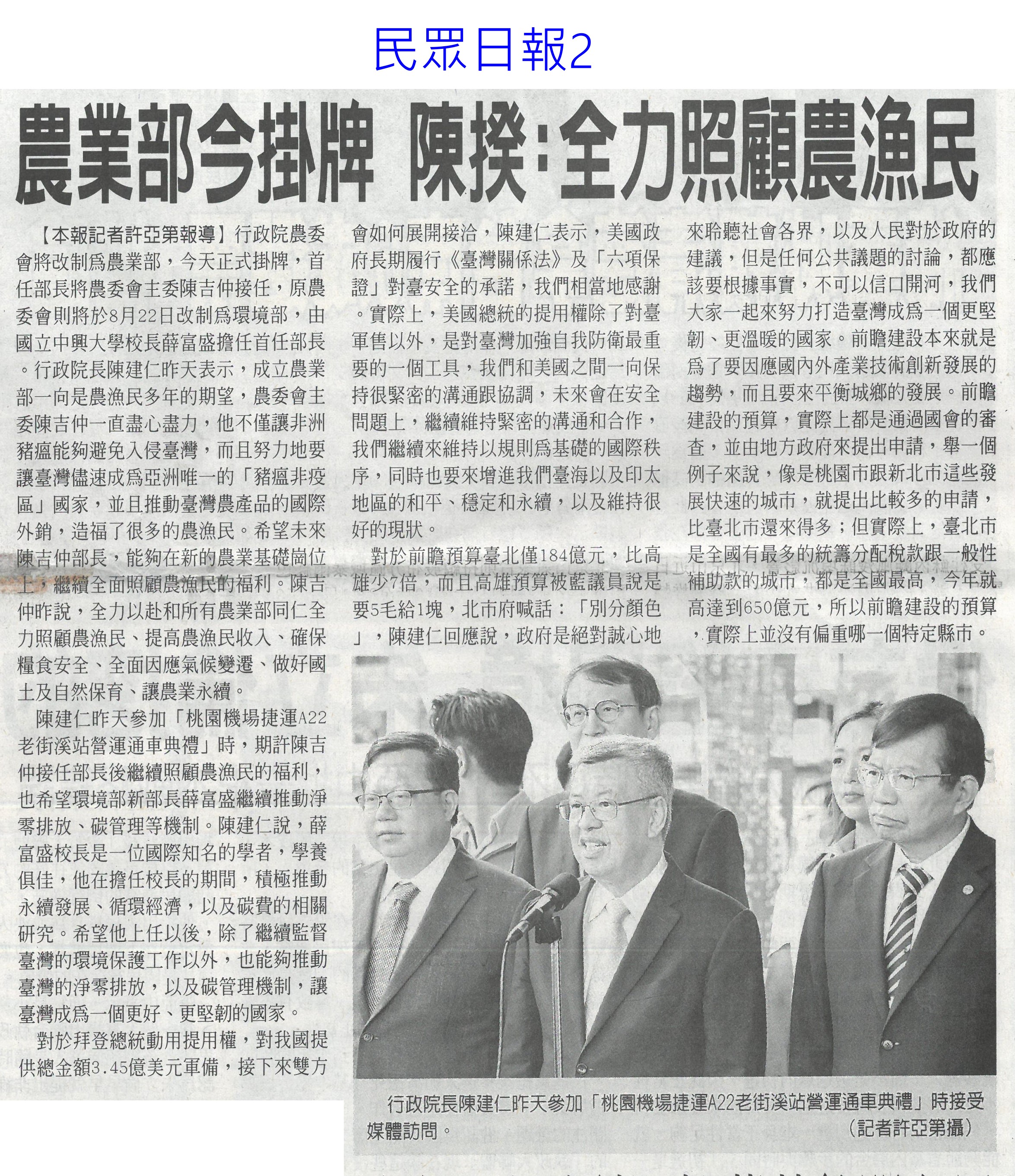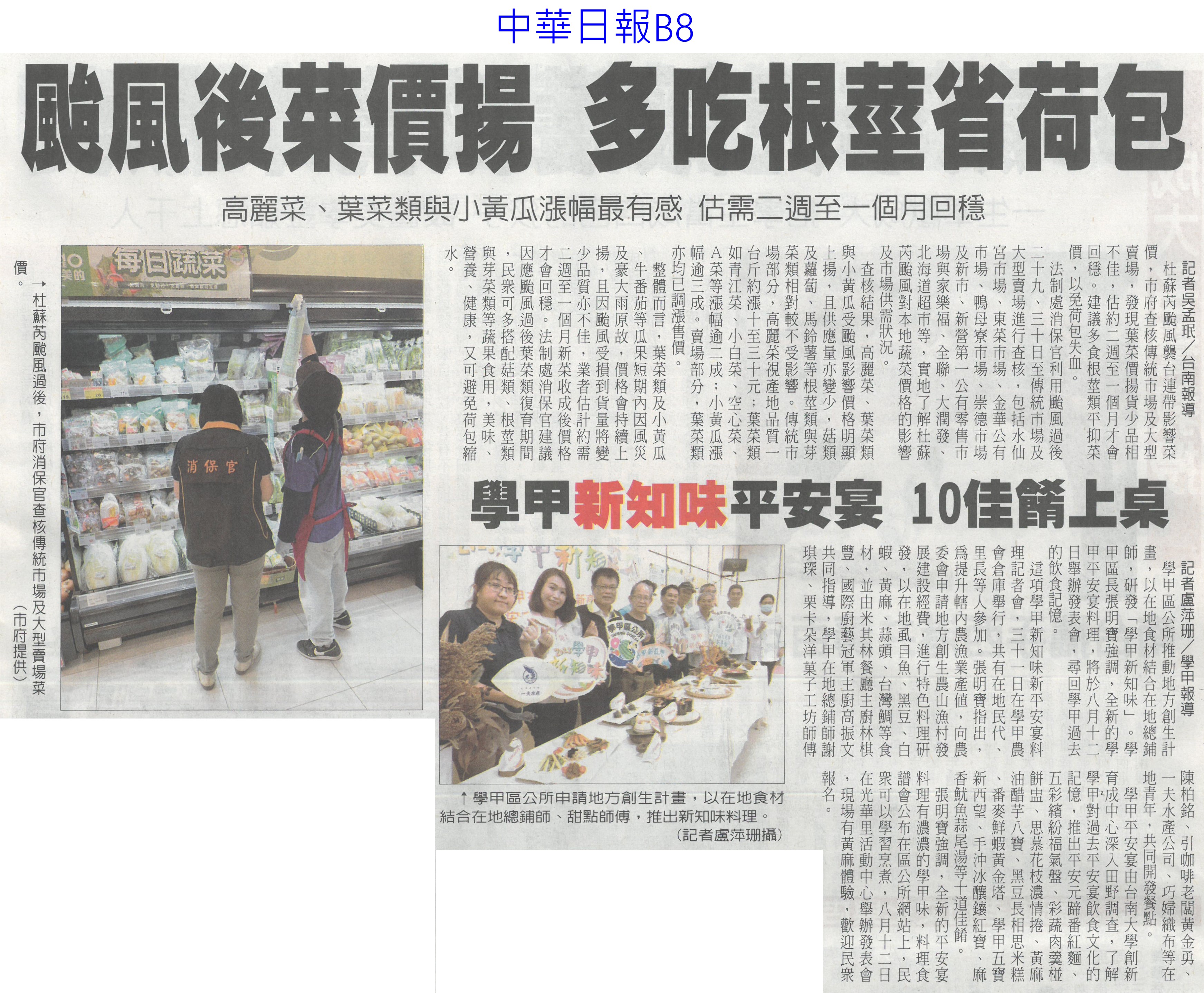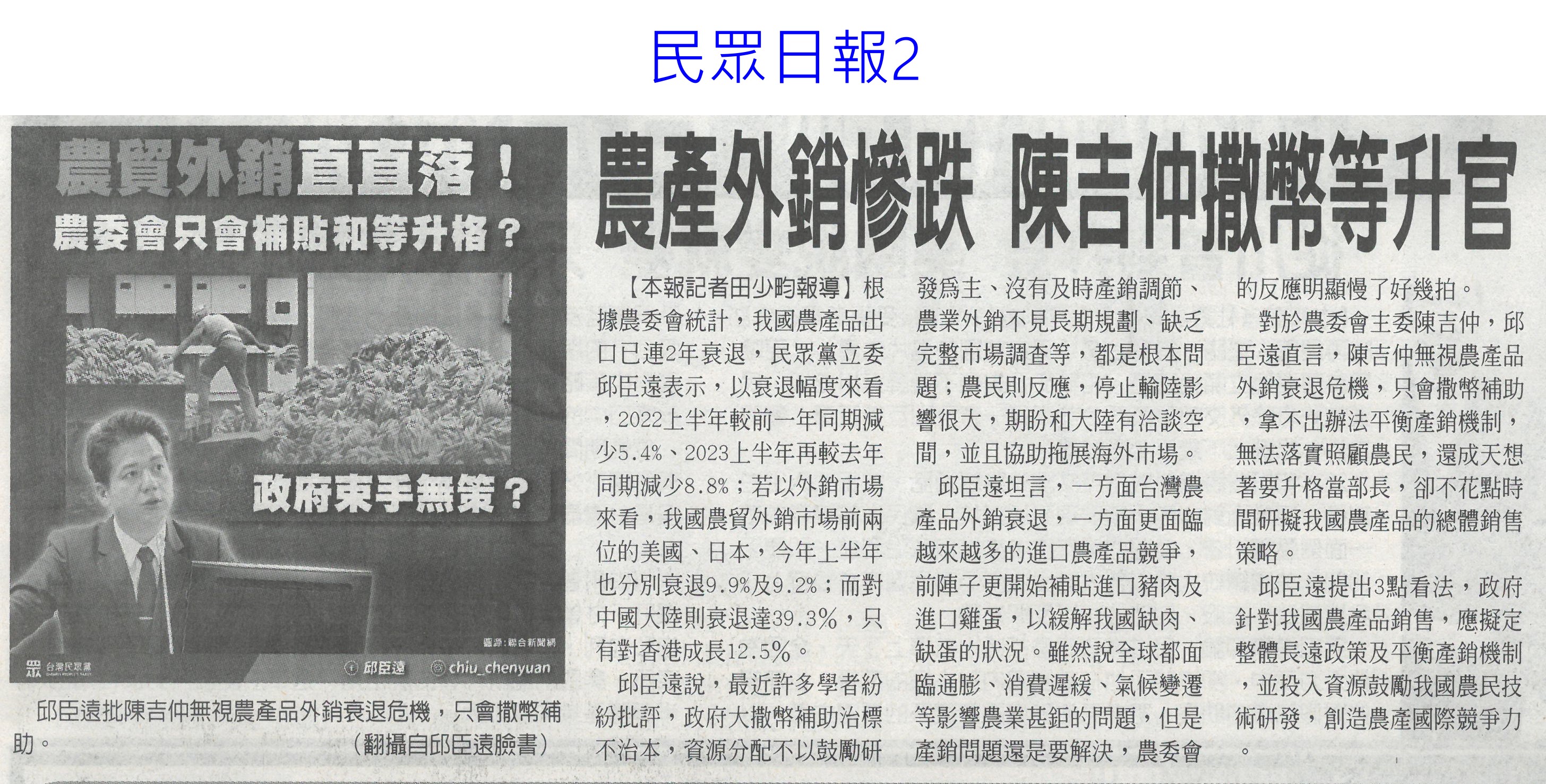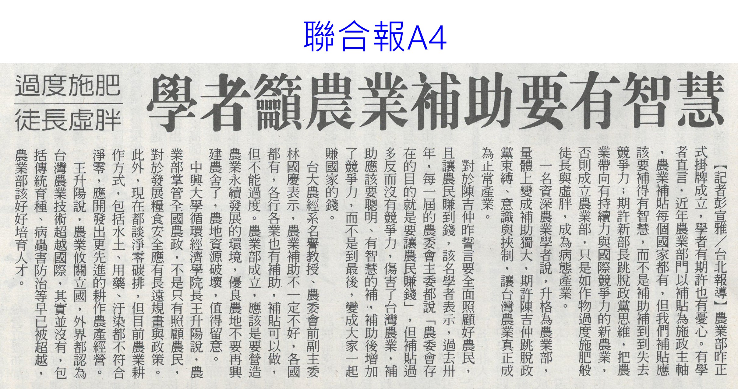 首頁萵苣觀新聞 萵苣觀新聞 排序 發布日期 更新日期 序號 發布日期 標題 1121. 112/08/02 杜蘇芮全台農損逾1.8億 高雄最多(臺灣時報7) 1122. 112/08/02 臺灣美食展 農委會復刻農旬味(民眾日報16) 1123. 112/08/02 農業部今掛牌 陳揆:全力照顧農漁民(民眾日報2) 1124. 112/08/02 颱風後菜價揚 多吃根莖省荷包(中華日報B8) 1125. 112/08/02 颱風過後 台南菜價漲3成 北農波動小(中國時報A8) 1126. 112/08/02 歷經35年農業部揭牌 陳吉仲淋雨謝天(臺灣時報7) 1127. 112/08/02 學者籲農業補助要有智慧(聯合報A4) 1128. 112/08/02 農業部揭牌 陳吉仲:首要任務是因應氣候變遷挑戰(自由時報A9) 1129. 112/08/02 農業部揭牌 小英:做農漁民靠山(民眾日報2) 1130. 112/08/02 臺灣美食展 嘉縣推三冠王(中華日報B6) 1131. 112/07/31 颱風侵襲 全台農損6183萬(中華日報A4) 1132. 112/07/31 杜蘇芮農損 屏東3271萬最多(臺灣時報9) 1133. 112/07/24 無冷鏈保鮮 蔬果載運耗損近4成(聯合報A6) 1134. 112/07/24 暴雨降集水區 台南3大水庫進帳1100萬噸(中國時報A9) 1135. 112/07/24 古坑有機農產合作社 減碳做公益(聯合報B2) 1136. 112/07/24 杜蘇芮沒到菜先漲!農民「見好就收」 蔬菜產地價漲2成 1137. 112/07/21 農作避日頭 留意自身狀況(台灣新生報12) 1138. 112/07/20 黃偉哲偕視察茅港尾農水路改善(民眾日報12) 1139. 112/07/20 農產外銷慘跌 陳吉仲撒幣等升官(民眾日報2) 1140. 112/07/20 嘉義農產深受日本青睞(台灣新生報6) 第 57/142 頁,共 2828 筆上一頁到第123456789101112131415161718192021222324252627282930313233343536373839404142434445464748495051525354555657585960616263646566676869707172737475767778798081828384858687888990919293949596979899100101102103104105106107108109110111112113114115116117118119120121122123124125126127128129130131132133134135136137138139140141142頁下一頁每頁103070筆資料