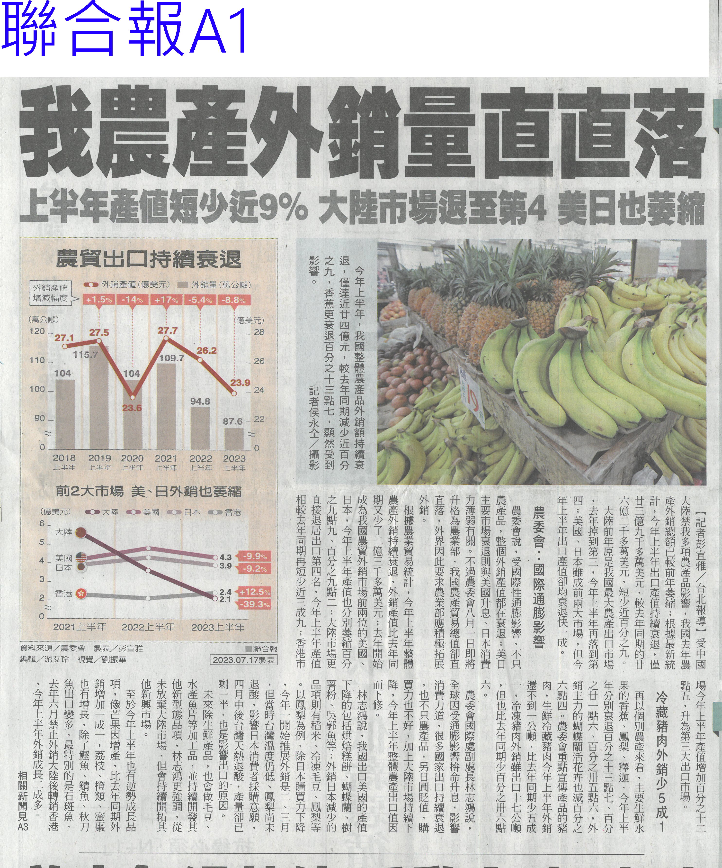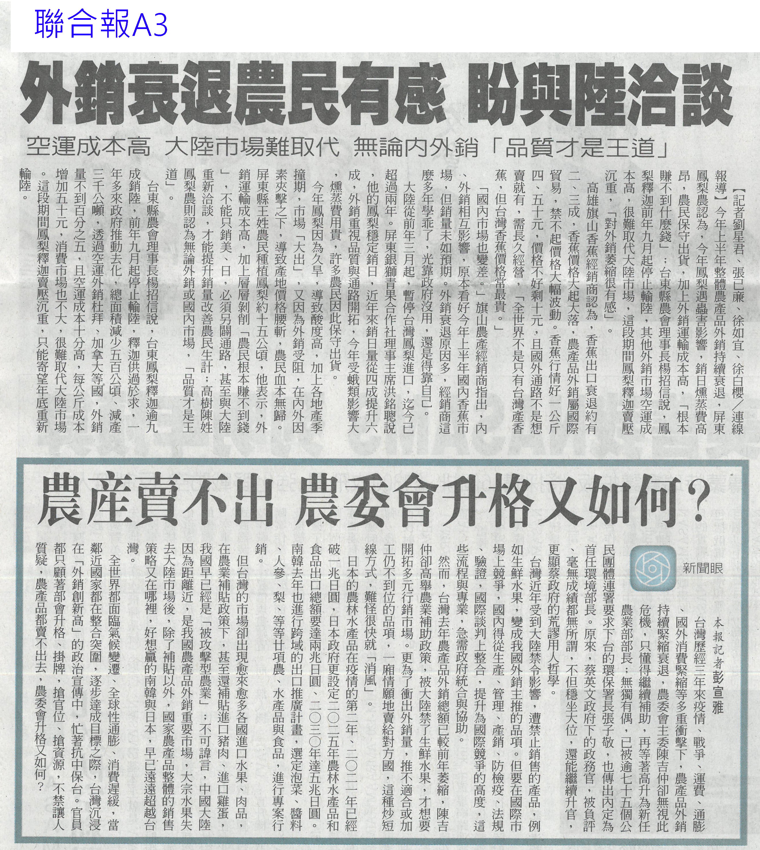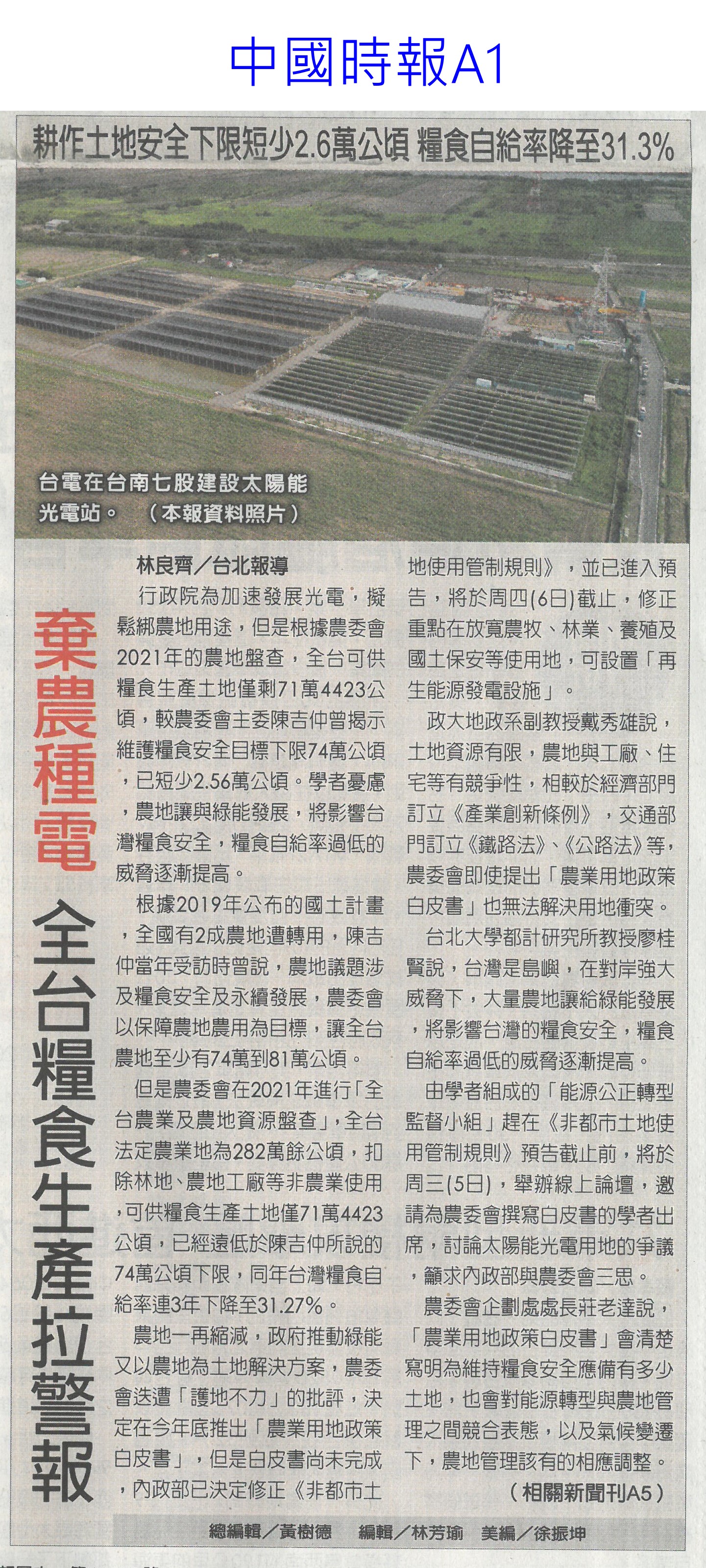 首頁萵苣觀新聞 萵苣觀新聞 排序 發布日期 更新日期 序號 發布日期 標題 1141. 112/07/20 二期作休耕補助 八月三日起申請(中華日報B2) 1142. 112/07/20 嘉南30年大旱 白河水庫仍維持供灌(中國時報A9) 1143. 112/07/19 學者:政府補貼衝量 反打壞市場(聯合報A3) 1144. 112/07/19 外銷消退農民有感 盼與陸洽談(聯合報A3) 1145. 112/07/19 我農產外銷量直直落(聯合報A1) 1146. 112/07/19 大遠百夏日物產展 秀農漁食力(中華日報B1) 1147. 112/07/14 畜牧沼渣循環經濟 助力有善農業(聯合報B2) 1148. 112/07/14 臺南優質農特產盡在 南得極品(中華日報B1) 1149. 112/07/14 嘉縣蓋蓄水池留住湧泉水源 灌溉百工頃果園(中國時報A9) 1150. 112/07/03 棄農種電 全台糧食生產拉警報(中國時報A1) 1151. 112/06/30 農業移工增至1.2萬人(中華日報A1) 1152. 112/06/30 雲溉肥製程升級 明年上市(聯合報B2) 1153. 112/06/29 11農改場合力 為原鄉找新出路(臺灣時報12) 1154. 112/06/21 80學者連署 反對強推農地種電(中國時報A8) 1155. 112/06/19 嘉義2水庫進帳1200萬噸 夏季水夠用(自由時報A14) 1156. 112/06/19 臺南優質物產 遠百竹北八樓登場(民眾日報8) 1157. 112/06/19 端節蔬果供應充裕 價格親民合理(民眾日報2) 1158. 112/06/17 食育力調查 蟬聯全國第一(中華日報B2) 1159. 112/06/17 臺灣作物諾亞方舟 保存7.5萬品種(自由時報A11) 1160. 112/06/17 台南新食刻 展優質農特產(中華日報B8) 第 58/142 頁,共 2828 筆上一頁到第123456789101112131415161718192021222324252627282930313233343536373839404142434445464748495051525354555657585960616263646566676869707172737475767778798081828384858687888990919293949596979899100101102103104105106107108109110111112113114115116117118119120121122123124125126127128129130131132133134135136137138139140141142頁下一頁每頁103070筆資料