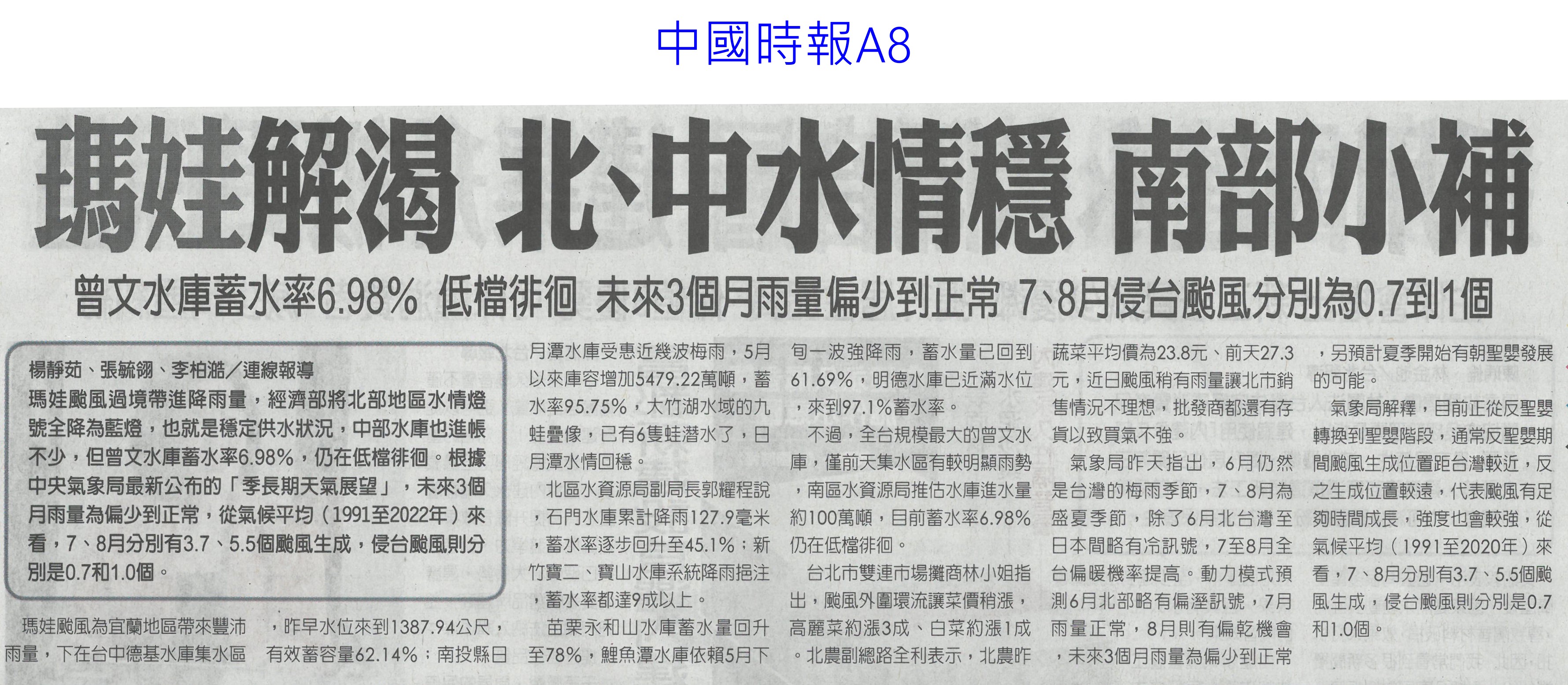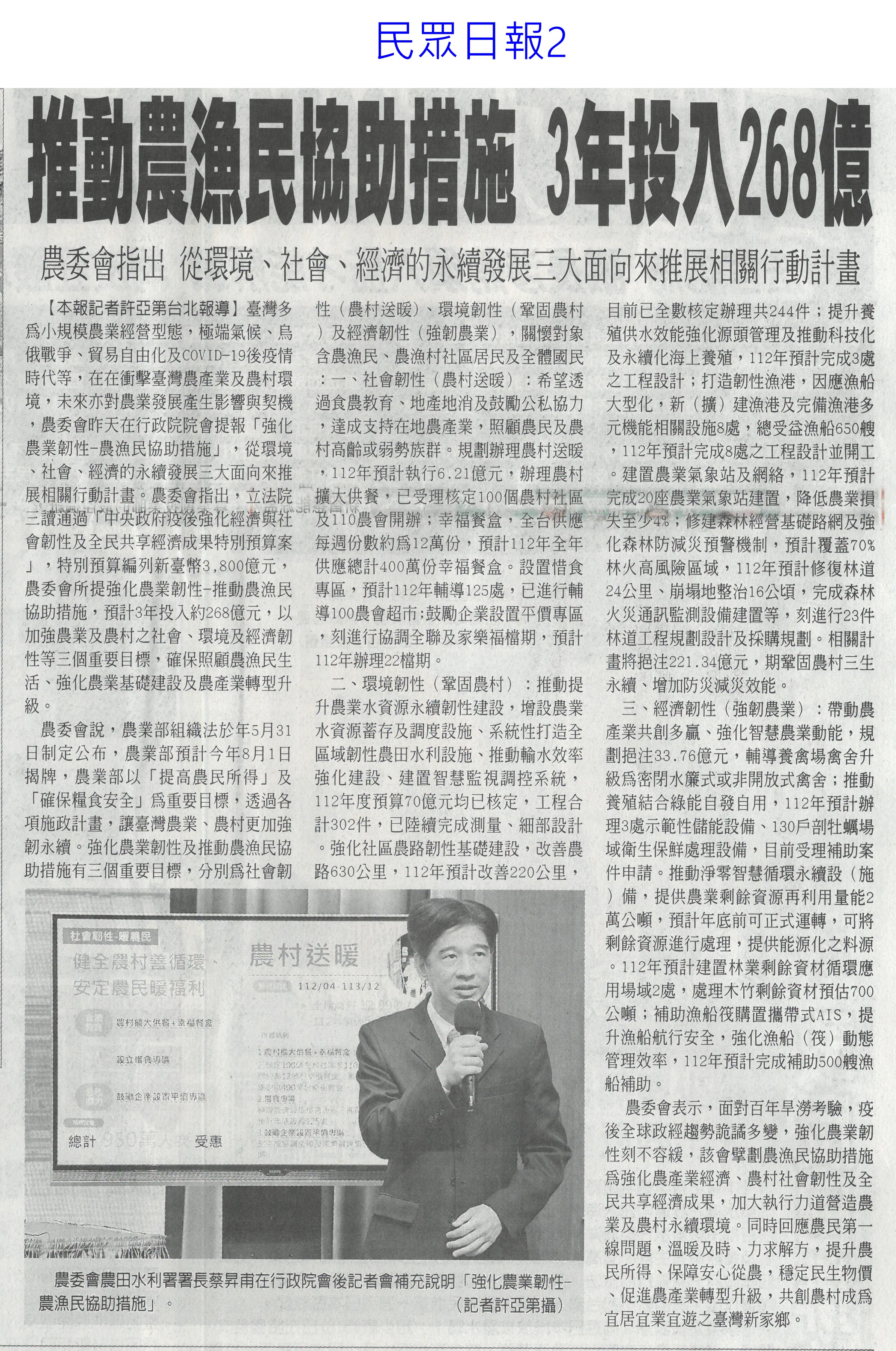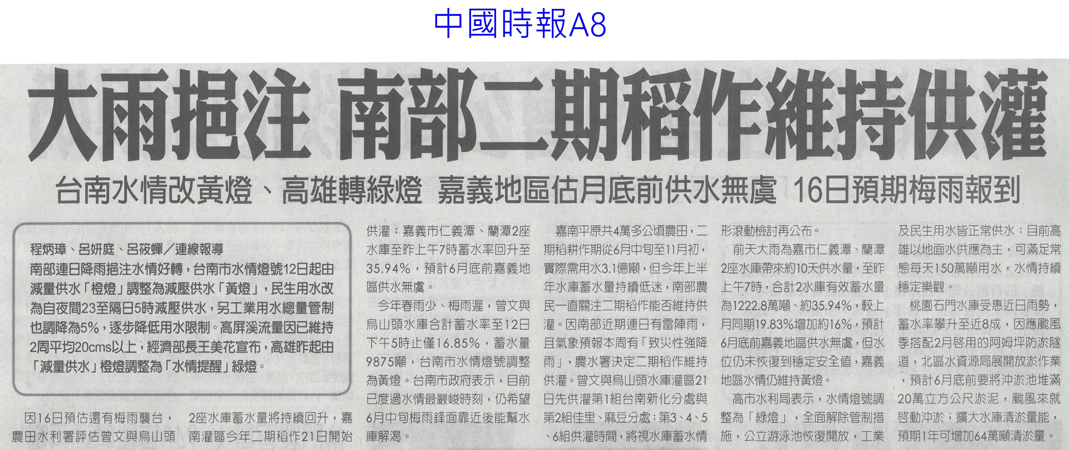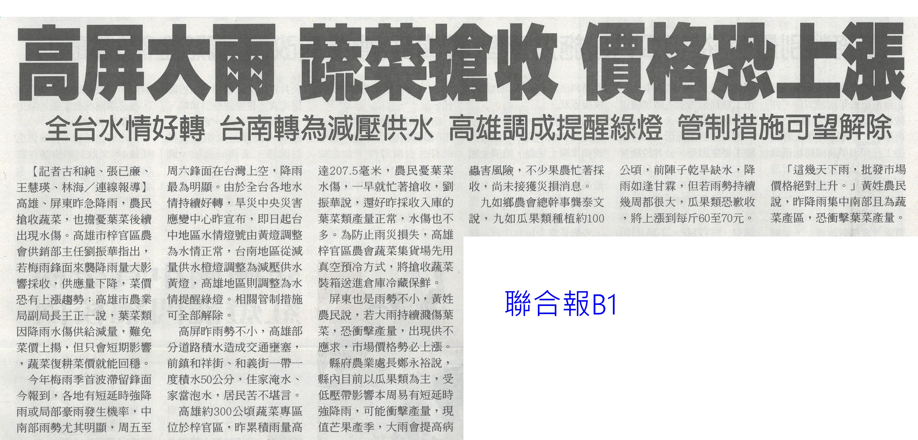 首頁萵苣觀新聞 萵苣觀新聞 排序 發布日期 更新日期 序號 發布日期 標題 1161. 112/06/17 農產冷鏈溫控 去年外銷創新高(中華日報A4) 1162. 112/06/17 台南嚴防豪雨 土石崩落(臺灣時報9) 1163. 112/06/17 高屏大雨 蔬菜搶收 價格恐上揚(聯合報B1) 1164. 112/06/17 雲林良品前進台北國際食品展(台灣新生報6) 1165. 112/06/17 曾文 南化水庫蓄水率回升 台南旱象漸紓解(中國時報A9) 1166. 112/06/16 豪大雨釀蔬菜災損!農委會:端午節前蔬果供應充裕 1167. 112/06/15 大雨挹注 南部二期稻維持供灌(中國時報A8) 1168. 112/06/15 雲林農特產 前進國際食品展(台灣新生報12) 1169. 112/06/14 8成患者1個月內平均減重5kg!日研究:三餐配高麗菜和豆腐有效控糖 1170. 112/06/12 雲林農業缺工破萬 推機械化(聯合報B2) 1171. 112/06/12 每年補助23億 改善農業缺工 農委會力推機械代耕(中國時報A9) 1172. 112/06/12 推動農漁民協助措施 3年投入268億(民眾日報2) 1173. 112/06/12 義大利熊蜂授粉 溫室農作成本大減(中國時報A9) 1174. 112/06/09 農產品初級加工 年產值逾2.4億(民眾日報4) 1175. 112/06/07 雷雨挹注 台南三大水庫小有進帳(民眾日報12) 1176. 112/06/07 章Q水產品游進校園 午餐覆蓋率破九成(民眾日報6) 1177. 112/06/07 無人機台南隊 市政好幫手(中華日報B2) 1178. 112/06/05 瑪娃解渴 北中水情穩 南部小補(中國時報A8) 1179. 112/06/05 臺南3座主要水庫小進帳 仍待降雨補足(中國時報A9) 1180. 112/06/05 台美倡議避談關稅 對國內農業不利(中國時報A5) 第 59/142 頁,共 2828 筆上一頁到第123456789101112131415161718192021222324252627282930313233343536373839404142434445464748495051525354555657585960616263646566676869707172737475767778798081828384858687888990919293949596979899100101102103104105106107108109110111112113114115116117118119120121122123124125126127128129130131132133134135136137138139140141142頁下一頁每頁103070筆資料