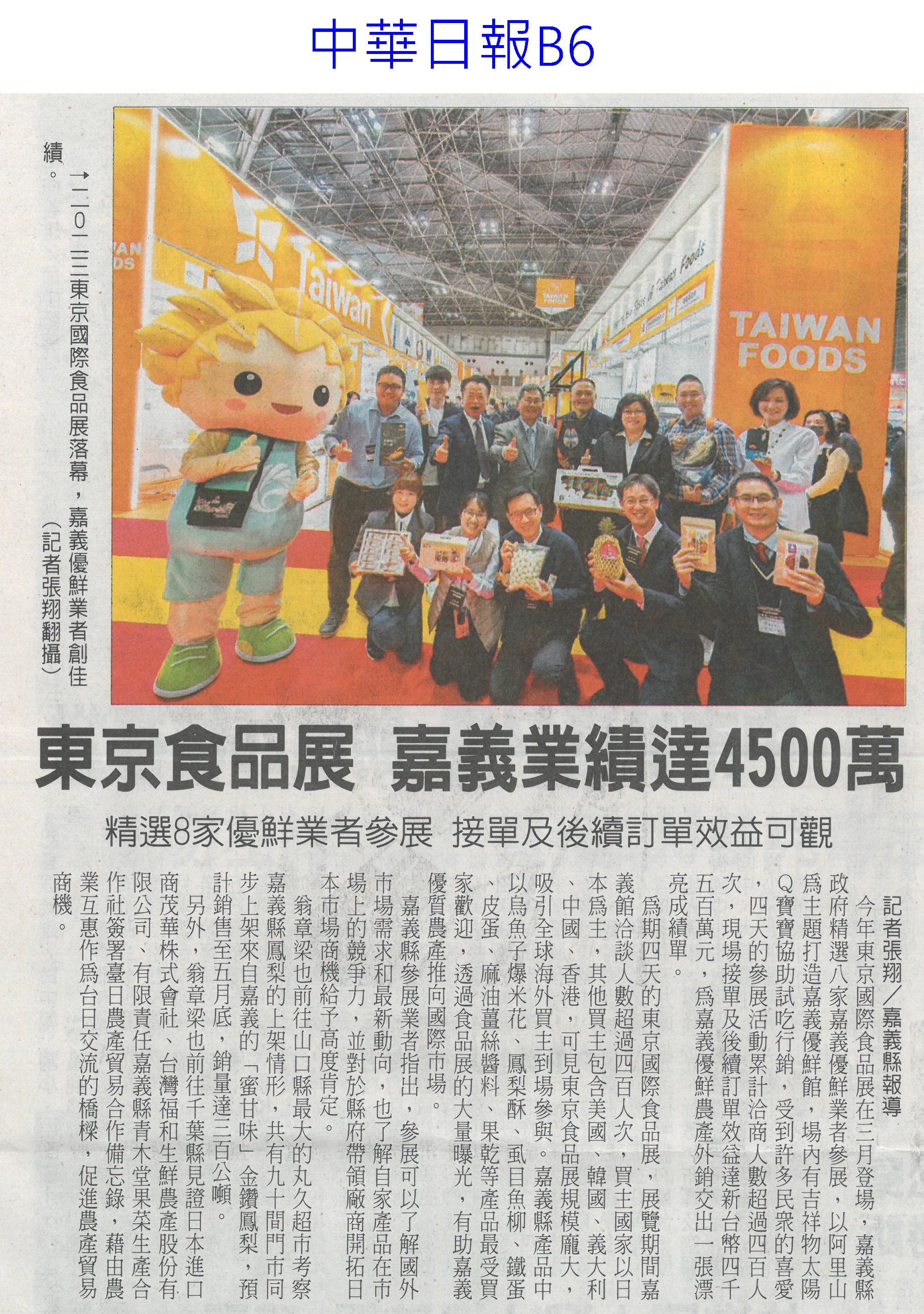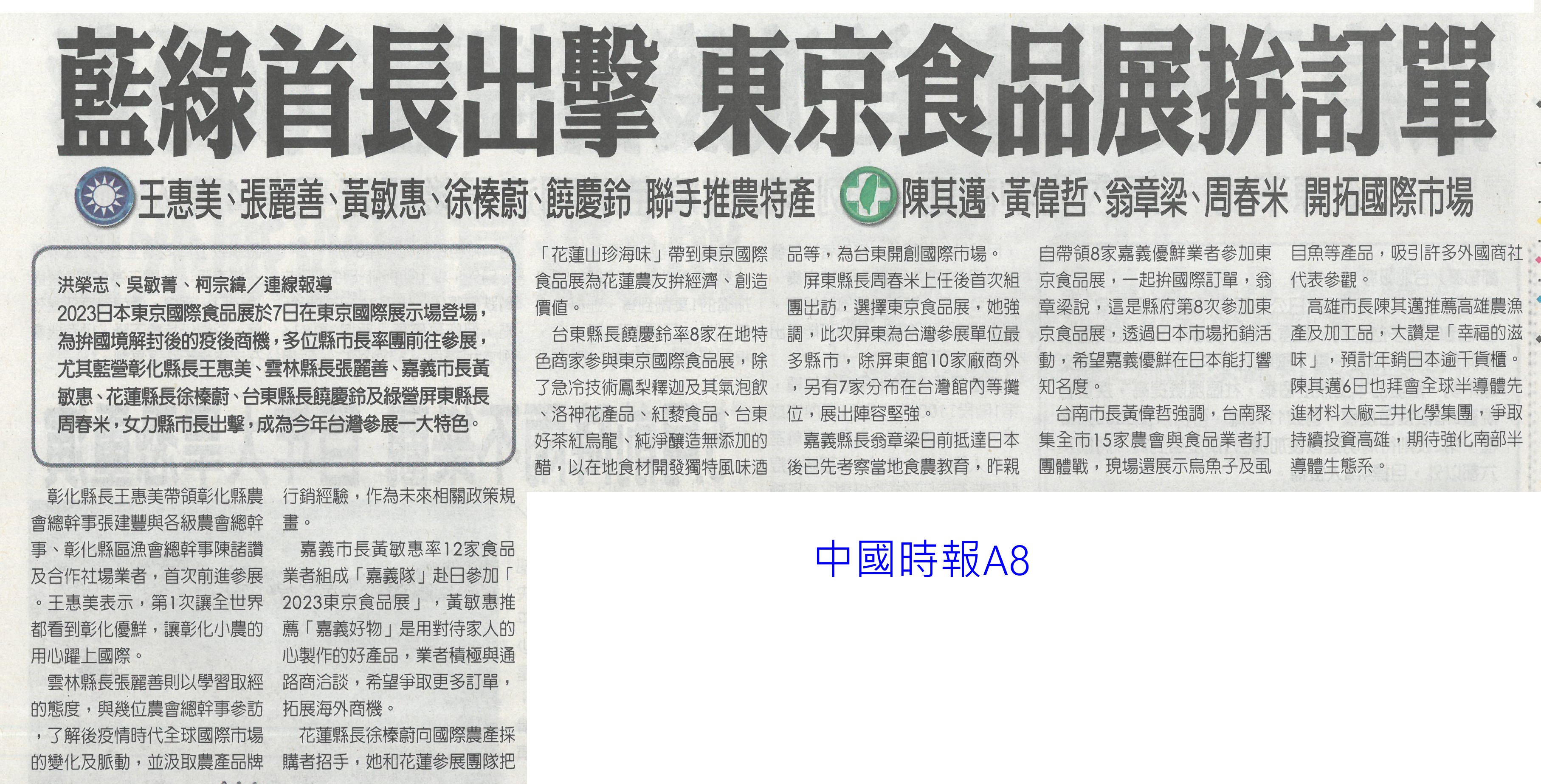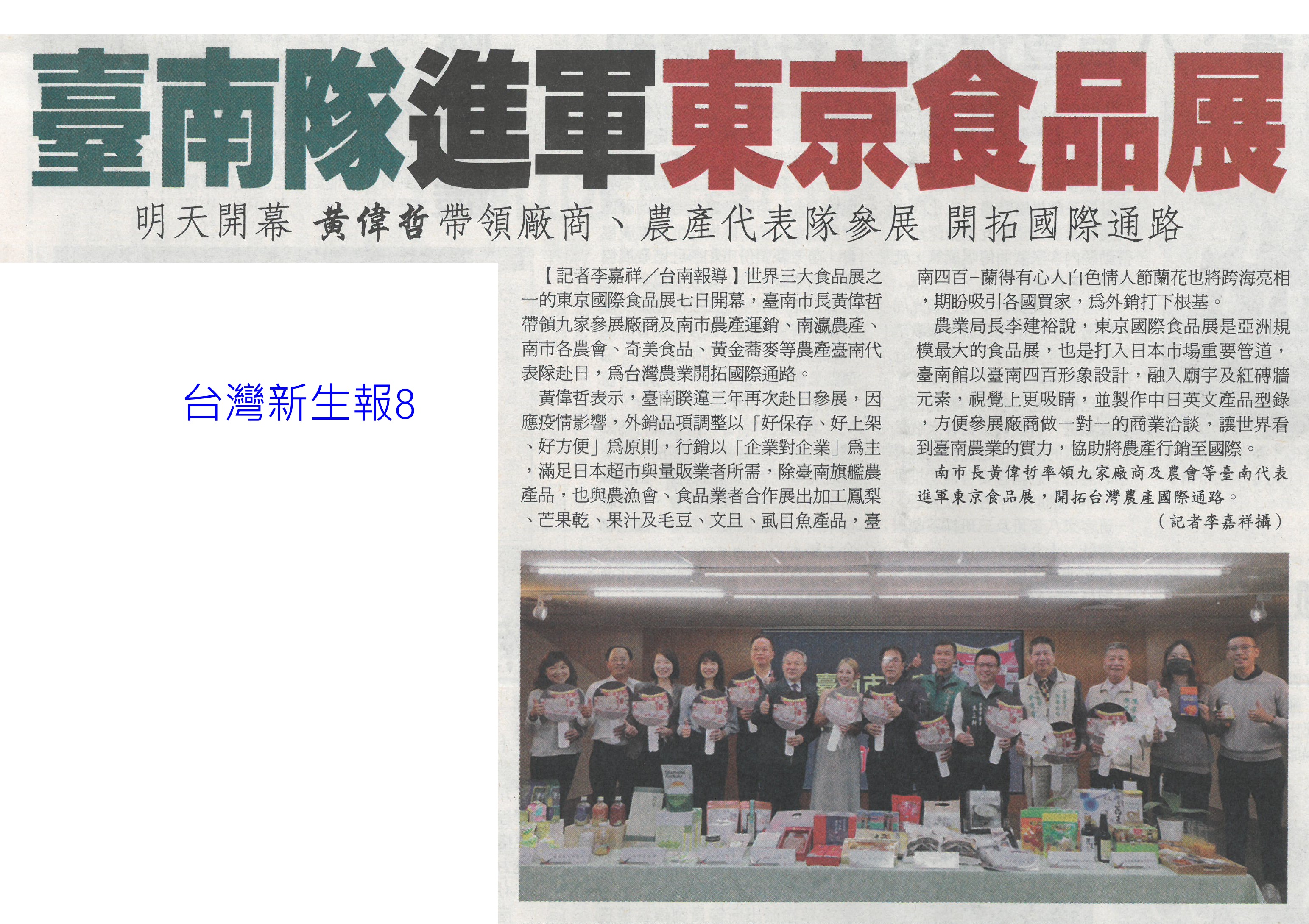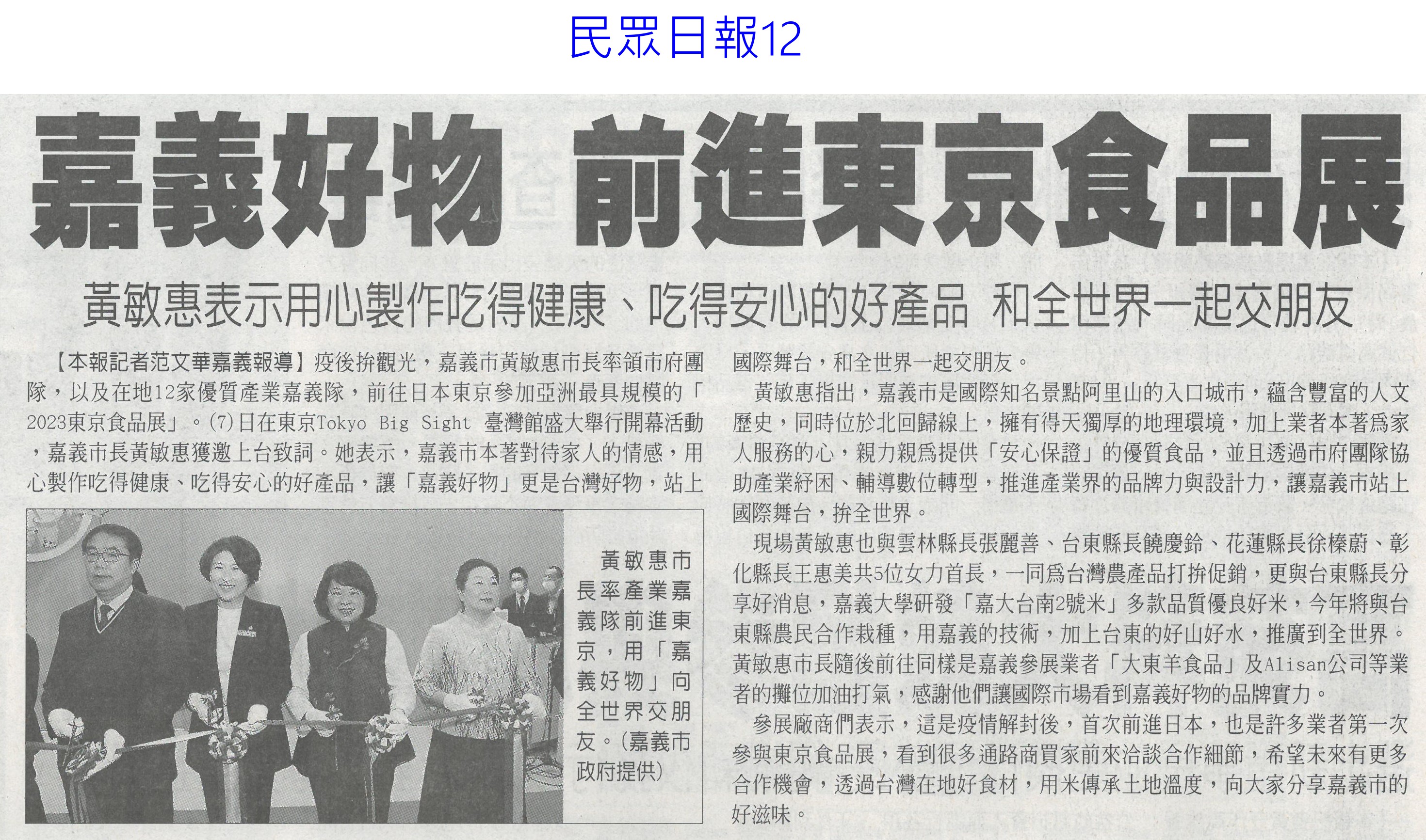 首頁萵苣觀新聞 萵苣觀新聞 排序 發布日期 更新日期 序號 發布日期 標題 1261. 112/03/16 東京食品展 嘉義業績達4500萬(中華日報B6) 1262. 112/03/14 翻轉農村 翁章梁推薦村遊.淺山埔(中國時報A9) 1263. 112/03/10 翁章梁見證台日貿易商簽合作備忘錄(中國時報A8) 1264. 112/03/09 東京國際食品展 陳駿季率團行銷(民眾日報6) 1265. 112/03/09 東京食品展 台灣136廠商重磅出擊(自由時報A10) 1266. 112/03/09 黃偉哲訪日最大通路 台南農產品可望在日本上架(聯合報B2) 1267. 112/03/08 台美淨零碳排農業研討會開鑼(臺灣時報19) 1268. 112/03/08 嘉義好物 前進東京食品展(民眾日報12) 1269. 112/03/08 藍綠首長出擊 東京食品展拚訂單(中國時報A8) 1270. 112/03/06 雲林良品 Time 頒獎(台灣新生報7) 1271. 112/03/06 農水署調水大作戰 9日起供灌(聯合報B2) 1272. 112/03/06 臺南隊進軍東京食品展(台灣新生報8) 1273. 112/03/02 30年大旱 農水署抗旱調度 拚省一半水庫用水(自由時報A2) 1274. 112/03/02 嘉市12好店拓外銷 將赴東京參展(聯合報B2) 1275. 112/03/02 全國十大績優農業產銷班選拔 4/1開跑(民眾日報4) 1276. 112/03/02 獨嘉首選 前進日本(台灣新生報6) 1277. 112/03/02 新化果菜市場增大型冷藏庫(中華日報B2) 1278. 112/03/02 黃敏惠領軍 食品嘉義隊前進東京(中國時報A9) 1279. 112/03/01 臺南農改場發表研究成果(台灣新生報6) 1280. 112/03/01 張麗善將率團參加東京國際食品展(台灣新生報7) 第 64/142 頁,共 2828 筆上一頁到第123456789101112131415161718192021222324252627282930313233343536373839404142434445464748495051525354555657585960616263646566676869707172737475767778798081828384858687888990919293949596979899100101102103104105106107108109110111112113114115116117118119120121122123124125126127128129130131132133134135136137138139140141142頁下一頁每頁103070筆資料
