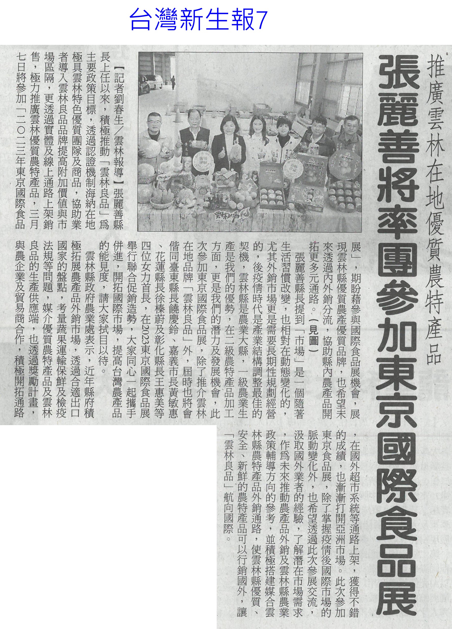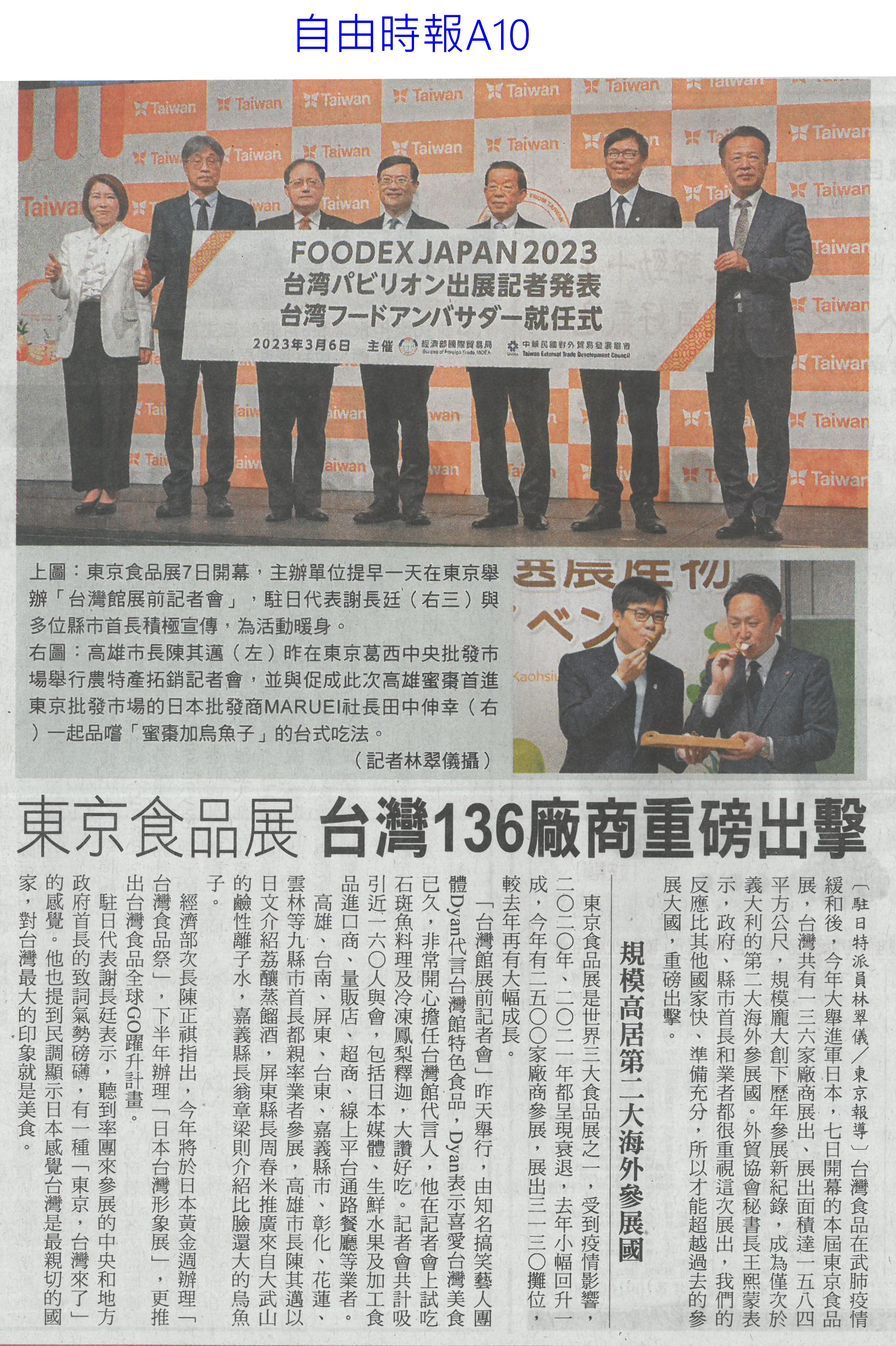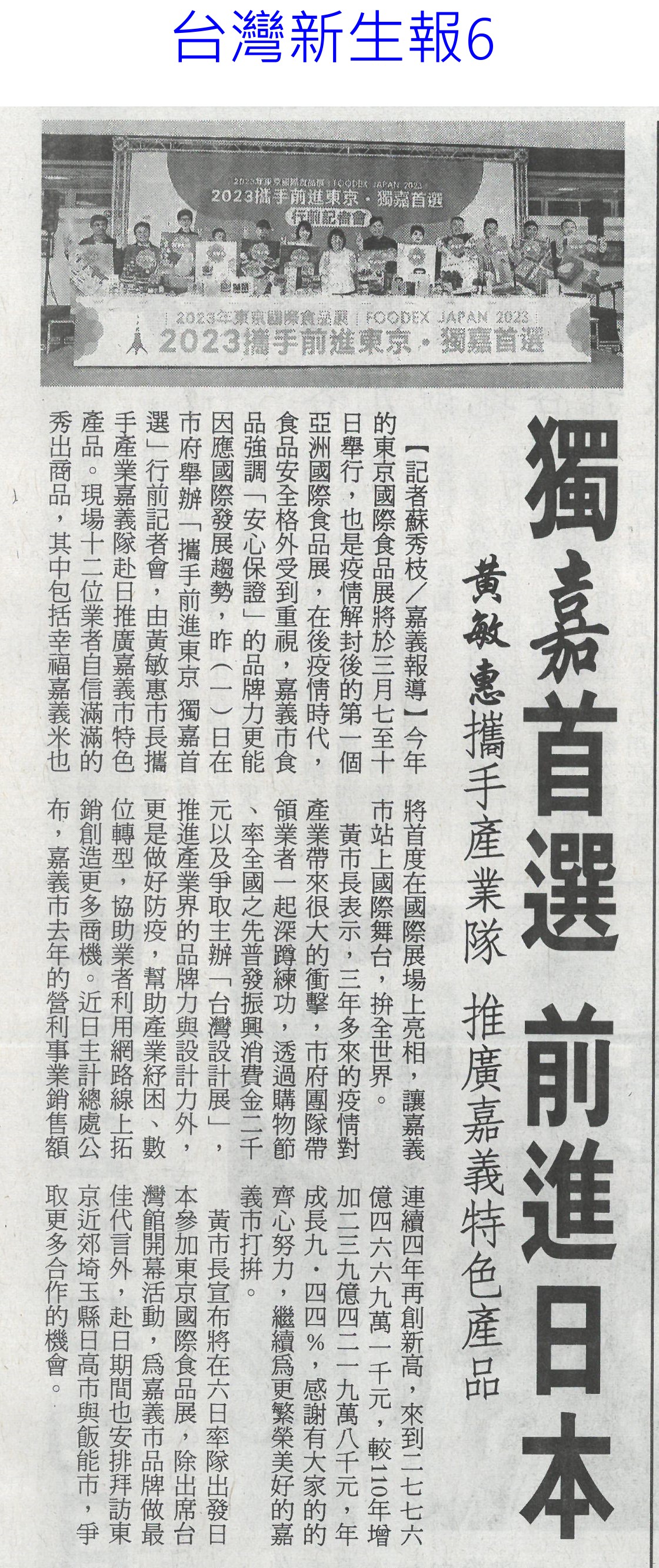 首頁萵苣觀新聞 萵苣觀新聞 排序 發布日期 更新日期 序號 發布日期 標題 1261. 112/03/16 東京食品展 嘉義業績達4500萬(中華日報B6) 1262. 112/03/14 翻轉農村 翁章梁推薦村遊.淺山埔(中國時報A9) 1263. 112/03/10 翁章梁見證台日貿易商簽合作備忘錄(中國時報A8) 1264. 112/03/09 東京國際食品展 陳駿季率團行銷(民眾日報6) 1265. 112/03/09 東京食品展 台灣136廠商重磅出擊(自由時報A10) 1266. 112/03/09 黃偉哲訪日最大通路 台南農產品可望在日本上架(聯合報B2) 1267. 112/03/08 台美淨零碳排農業研討會開鑼(臺灣時報19) 1268. 112/03/08 嘉義好物 前進東京食品展(民眾日報12) 1269. 112/03/08 藍綠首長出擊 東京食品展拚訂單(中國時報A8) 1270. 112/03/06 雲林良品 Time 頒獎(台灣新生報7) 1271. 112/03/06 農水署調水大作戰 9日起供灌(聯合報B2) 1272. 112/03/06 臺南隊進軍東京食品展(台灣新生報8) 1273. 112/03/02 30年大旱 農水署抗旱調度 拚省一半水庫用水(自由時報A2) 1274. 112/03/02 嘉市12好店拓外銷 將赴東京參展(聯合報B2) 1275. 112/03/02 全國十大績優農業產銷班選拔 4/1開跑(民眾日報4) 1276. 112/03/02 獨嘉首選 前進日本(台灣新生報6) 1277. 112/03/02 新化果菜市場增大型冷藏庫(中華日報B2) 1278. 112/03/02 黃敏惠領軍 食品嘉義隊前進東京(中國時報A9) 1279. 112/03/01 臺南農改場發表研究成果(台灣新生報6) 1280. 112/03/01 張麗善將率團參加東京國際食品展(台灣新生報7) 第 64/142 頁,共 2828 筆上一頁到第123456789101112131415161718192021222324252627282930313233343536373839404142434445464748495051525354555657585960616263646566676869707172737475767778798081828384858687888990919293949596979899100101102103104105106107108109110111112113114115116117118119120121122123124125126127128129130131132133134135136137138139140141142頁下一頁每頁103070筆資料