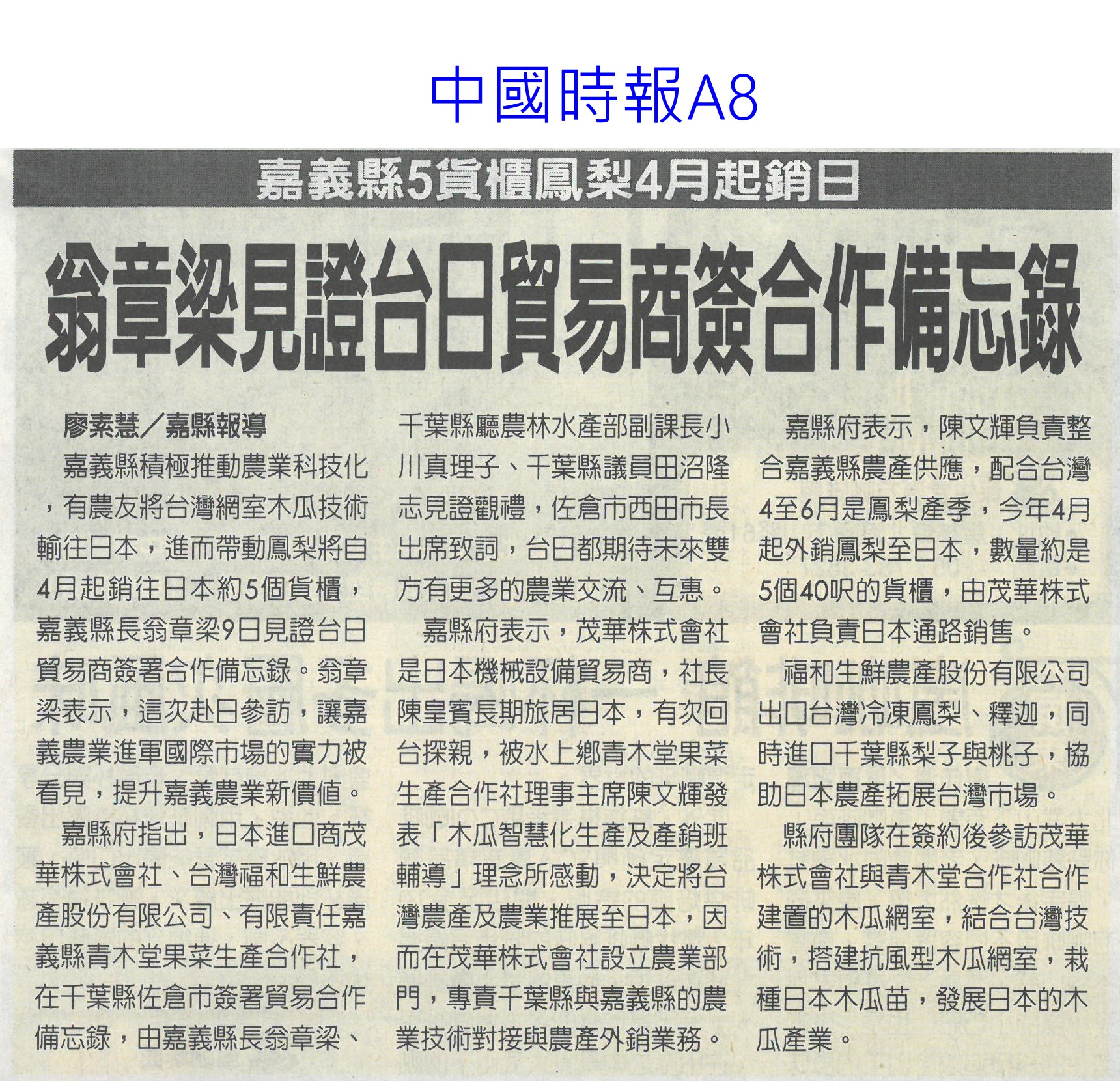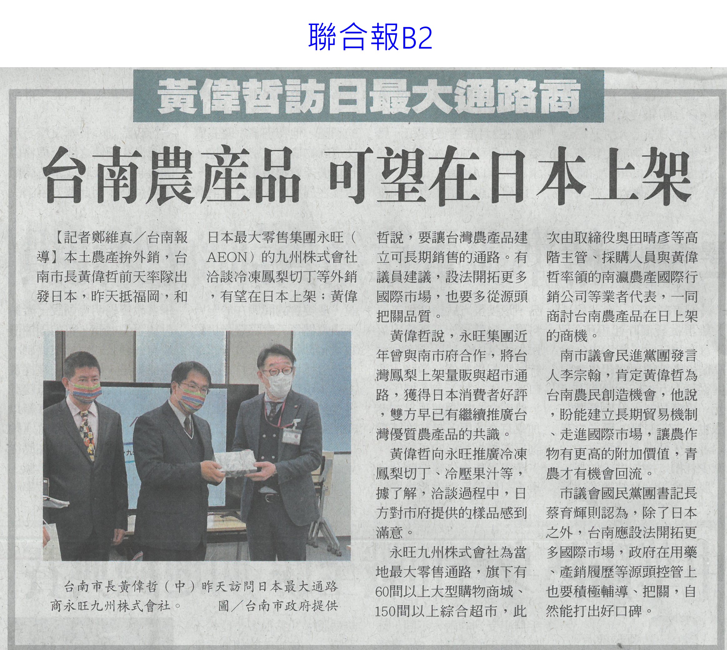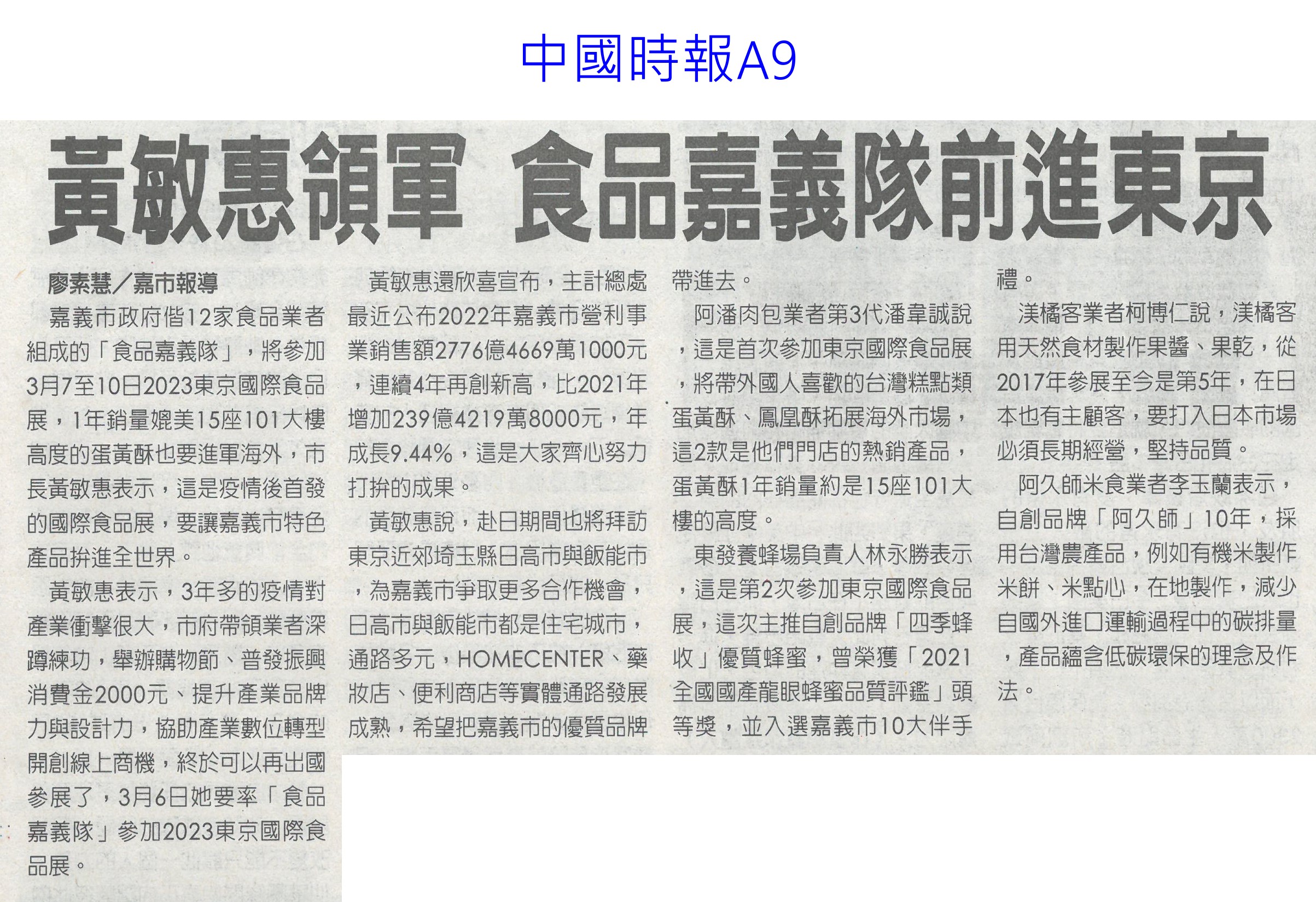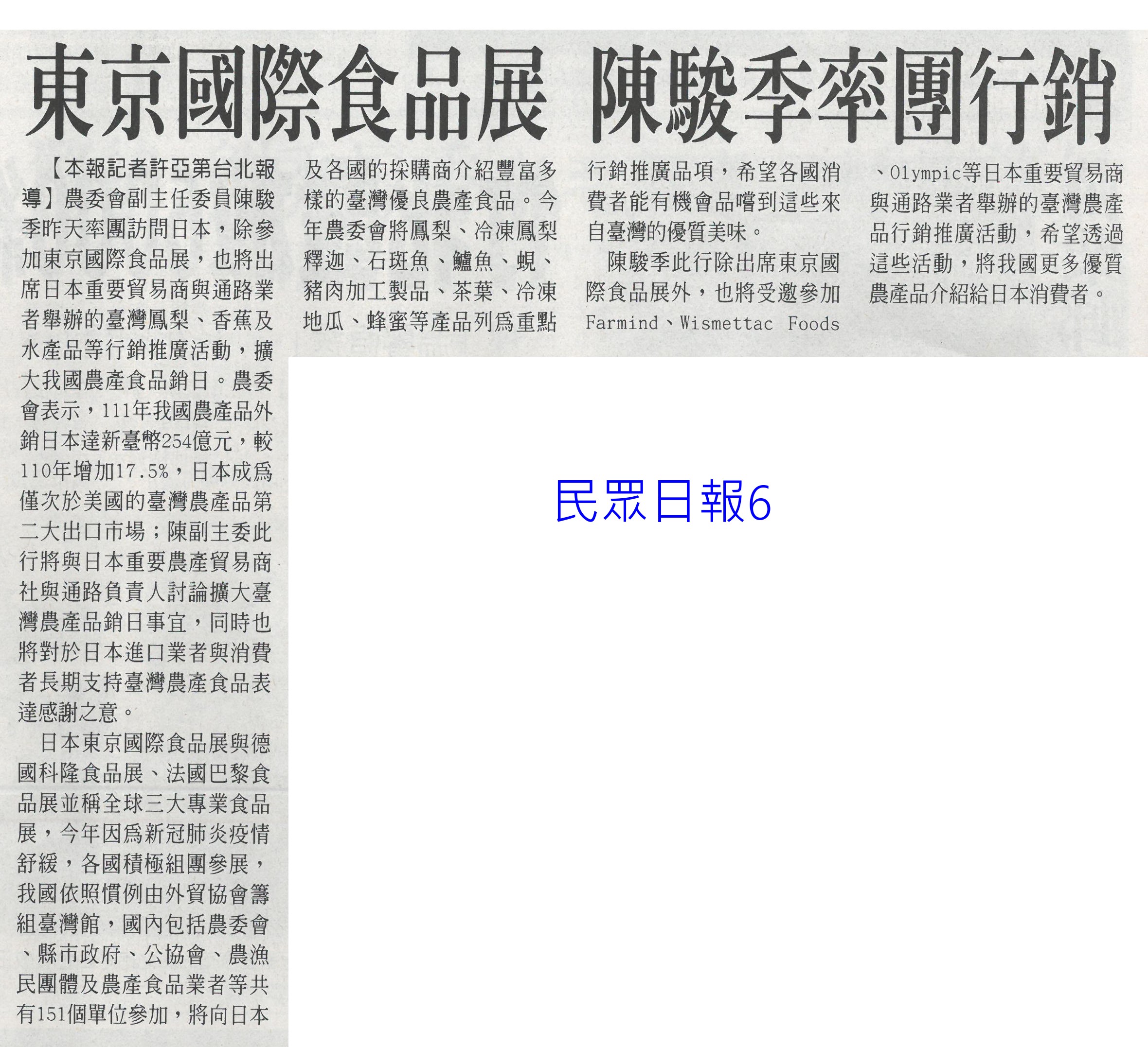 首頁萵苣觀新聞 萵苣觀新聞 排序 發布日期 更新日期 序號 發布日期 標題 1261. 112/03/16 東京食品展 嘉義業績達4500萬(中華日報B6) 1262. 112/03/14 翻轉農村 翁章梁推薦村遊.淺山埔(中國時報A9) 1263. 112/03/10 翁章梁見證台日貿易商簽合作備忘錄(中國時報A8) 1264. 112/03/09 東京國際食品展 陳駿季率團行銷(民眾日報6) 1265. 112/03/09 東京食品展 台灣136廠商重磅出擊(自由時報A10) 1266. 112/03/09 黃偉哲訪日最大通路 台南農產品可望在日本上架(聯合報B2) 1267. 112/03/08 台美淨零碳排農業研討會開鑼(臺灣時報19) 1268. 112/03/08 嘉義好物 前進東京食品展(民眾日報12) 1269. 112/03/08 藍綠首長出擊 東京食品展拚訂單(中國時報A8) 1270. 112/03/06 雲林良品 Time 頒獎(台灣新生報7) 1271. 112/03/06 農水署調水大作戰 9日起供灌(聯合報B2) 1272. 112/03/06 臺南隊進軍東京食品展(台灣新生報8) 1273. 112/03/02 30年大旱 農水署抗旱調度 拚省一半水庫用水(自由時報A2) 1274. 112/03/02 嘉市12好店拓外銷 將赴東京參展(聯合報B2) 1275. 112/03/02 全國十大績優農業產銷班選拔 4/1開跑(民眾日報4) 1276. 112/03/02 獨嘉首選 前進日本(台灣新生報6) 1277. 112/03/02 新化果菜市場增大型冷藏庫(中華日報B2) 1278. 112/03/02 黃敏惠領軍 食品嘉義隊前進東京(中國時報A9) 1279. 112/03/01 臺南農改場發表研究成果(台灣新生報6) 1280. 112/03/01 張麗善將率團參加東京國際食品展(台灣新生報7) 第 64/142 頁,共 2828 筆上一頁到第123456789101112131415161718192021222324252627282930313233343536373839404142434445464748495051525354555657585960616263646566676869707172737475767778798081828384858687888990919293949596979899100101102103104105106107108109110111112113114115116117118119120121122123124125126127128129130131132133134135136137138139140141142頁下一頁每頁103070筆資料