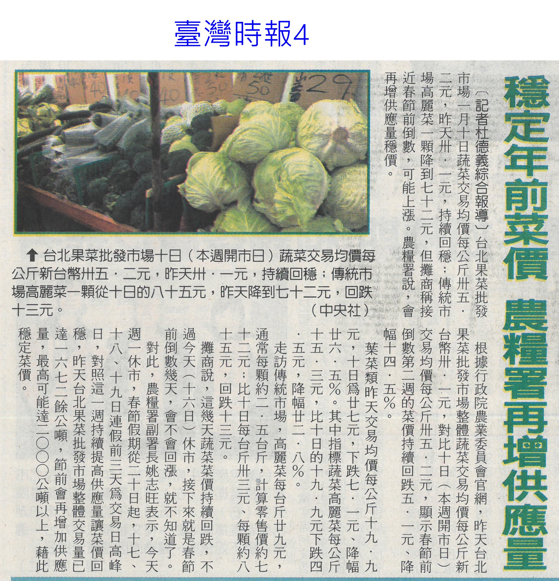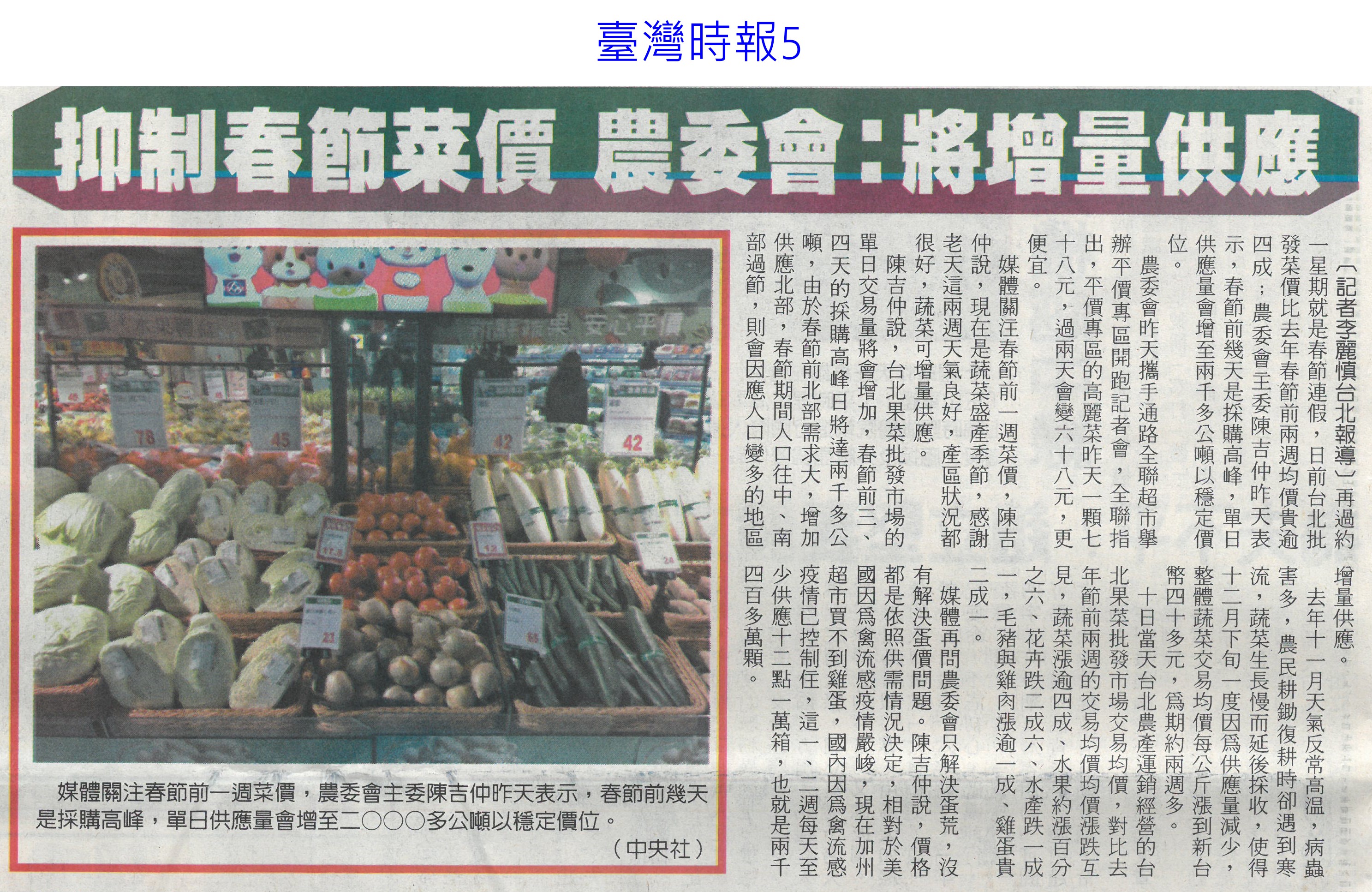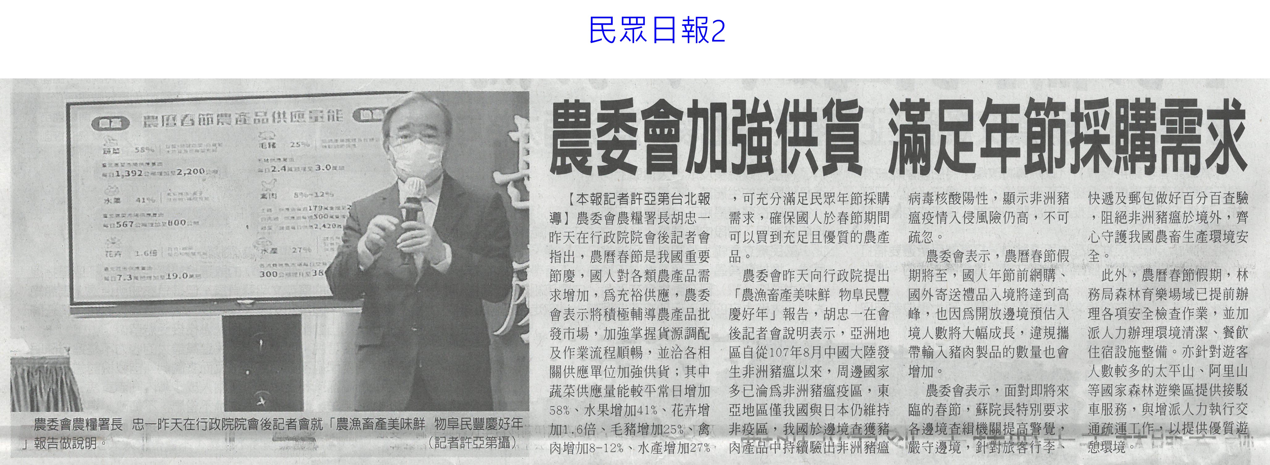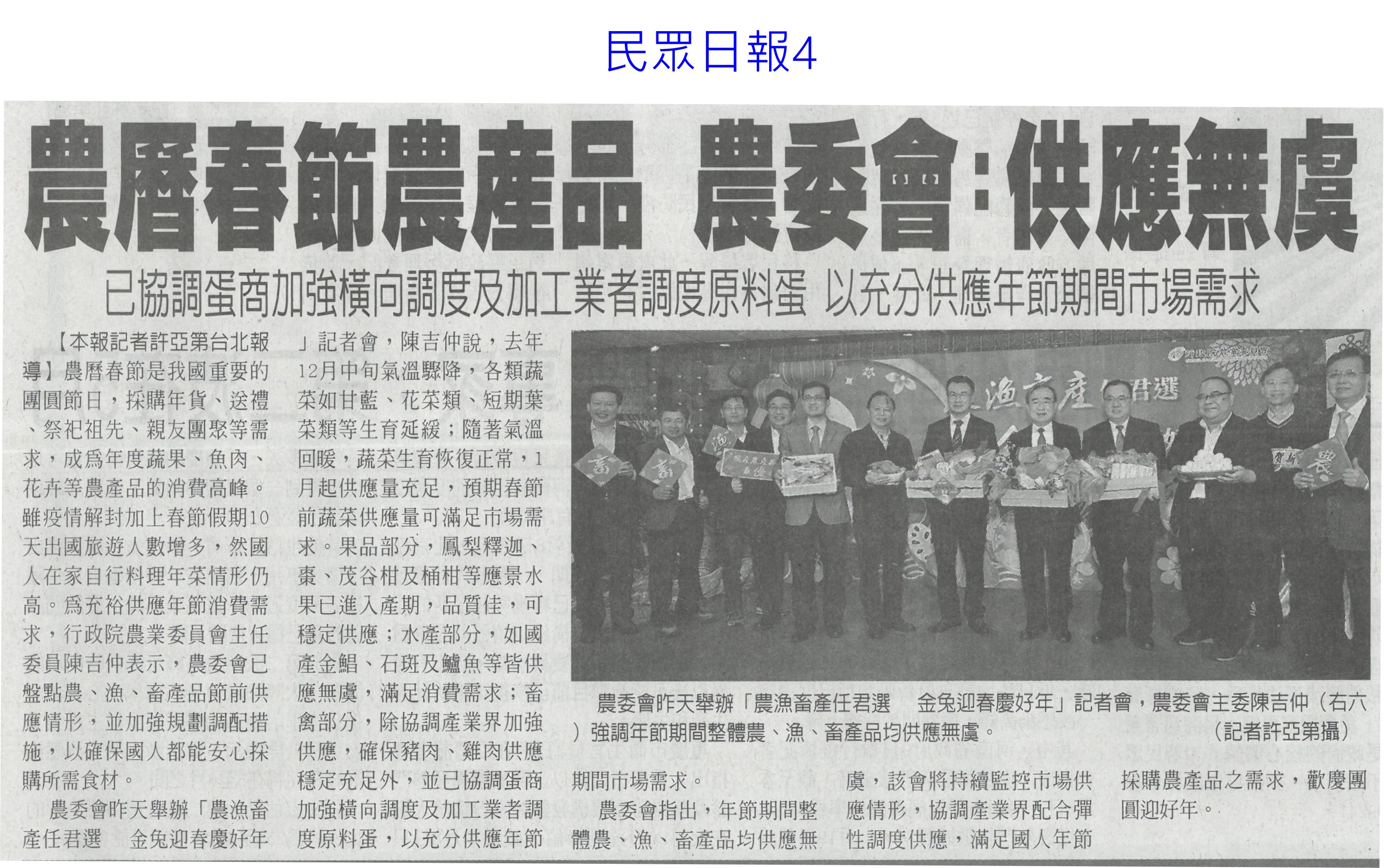 首頁萵苣觀新聞 萵苣觀新聞 排序 發布日期 更新日期 序號 發布日期 標題 1321. 112/02/01 南市尚好肥試種玉米筍 親子採收趣(民眾日報12) 1322. 112/02/01 寒流再次南下 農委會成立應變小組(民眾日報2) 1323. 112/01/18 西螺果菜市場量穩 今`明交易高峰(聯合報B2) 1324. 112/01/18 張麗善視察果菜市場供貨 拜早年(臺灣時報18) 1325. 112/01/18 穩定年前菜價 農糧署再增供應量(臺灣時報4) 1326. 112/01/18 老天不給力 曾文水庫3度人工增雨無效(自由時報A11) 1327. 112/01/18 春節供應 魚市增量 蔬果回穩(中華日報A3) 1328. 112/01/18 鋒面來了 南水局向老天多要點水(民眾日報3) 1329. 112/01/18 全聯攜手農委會 打造抗漲專區(台灣新生報8) 1330. 112/01/18 雲林年貨大街 張麗善送小紅包(中華日報B6) 1331. 112/01/13 抗通膨 農委會年推200萬個60元幸福餐盒(臺灣時報7) 1332. 112/01/13 抑制春節菜價 農委會:將增量供應(臺灣時報5) 1333. 112/01/13 農委會加強供貨 滿足年節採購需求(民眾日報2) 1334. 112/01/13 雲林良品康是美誠品上架(中華日報B6) 1335. 112/01/12 神農獎頒獎 蘇揆肯定卓越貢獻(民眾日報14) 1336. 112/01/12 農曆春節農產品 農委會:供應無虞(民眾日報4) 1337. 112/01/12 鼓勵使用雞糞加工肥料 農糧署補助加倍(臺灣時報9) 1338. 112/01/12 強化農產品溯源 大聲向混充說NO(民眾日報2) 1339. 112/01/12 大成歡聚好時光年貨市集 開跑(台灣新生報7) 1340. 112/01/12 大成年貨市集開跑 展售優質農特產(中華日報B3) 第 67/142 頁,共 2828 筆上一頁到第123456789101112131415161718192021222324252627282930313233343536373839404142434445464748495051525354555657585960616263646566676869707172737475767778798081828384858687888990919293949596979899100101102103104105106107108109110111112113114115116117118119120121122123124125126127128129130131132133134135136137138139140141142頁下一頁每頁103070筆資料
