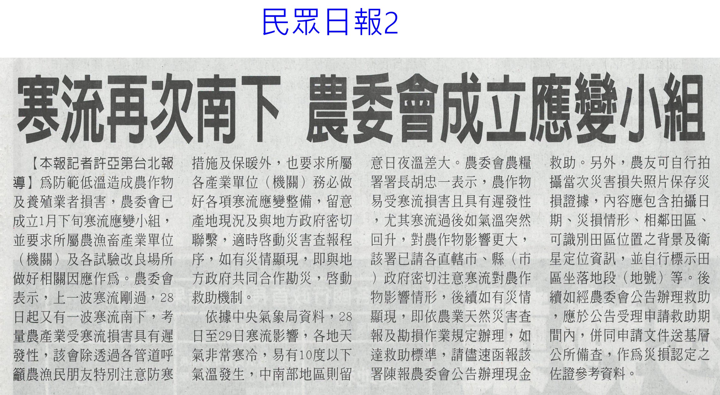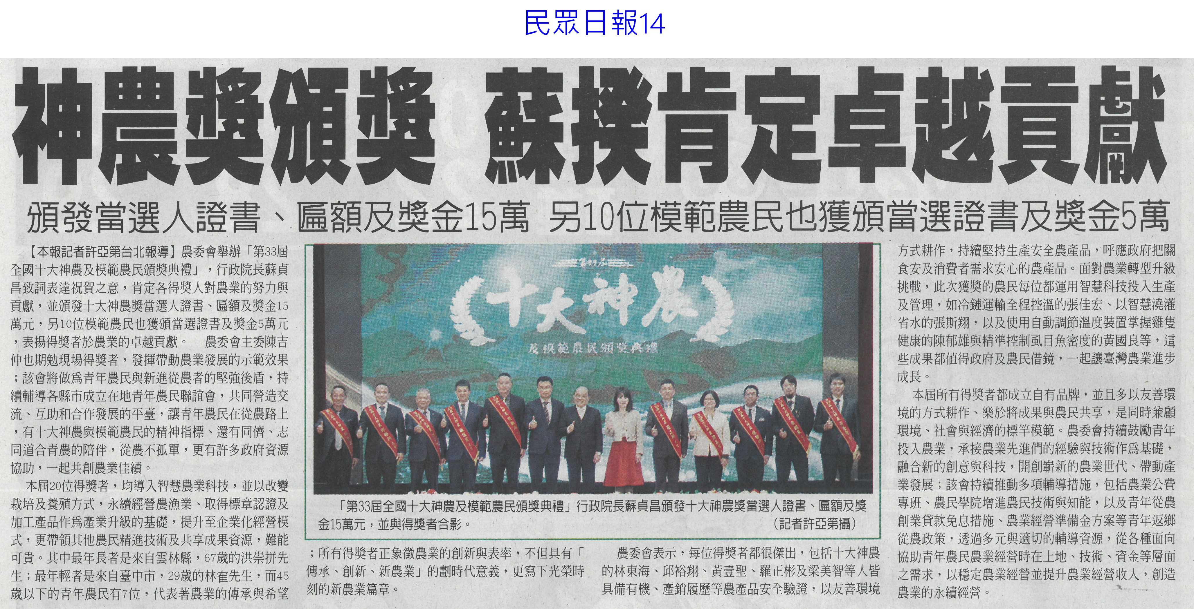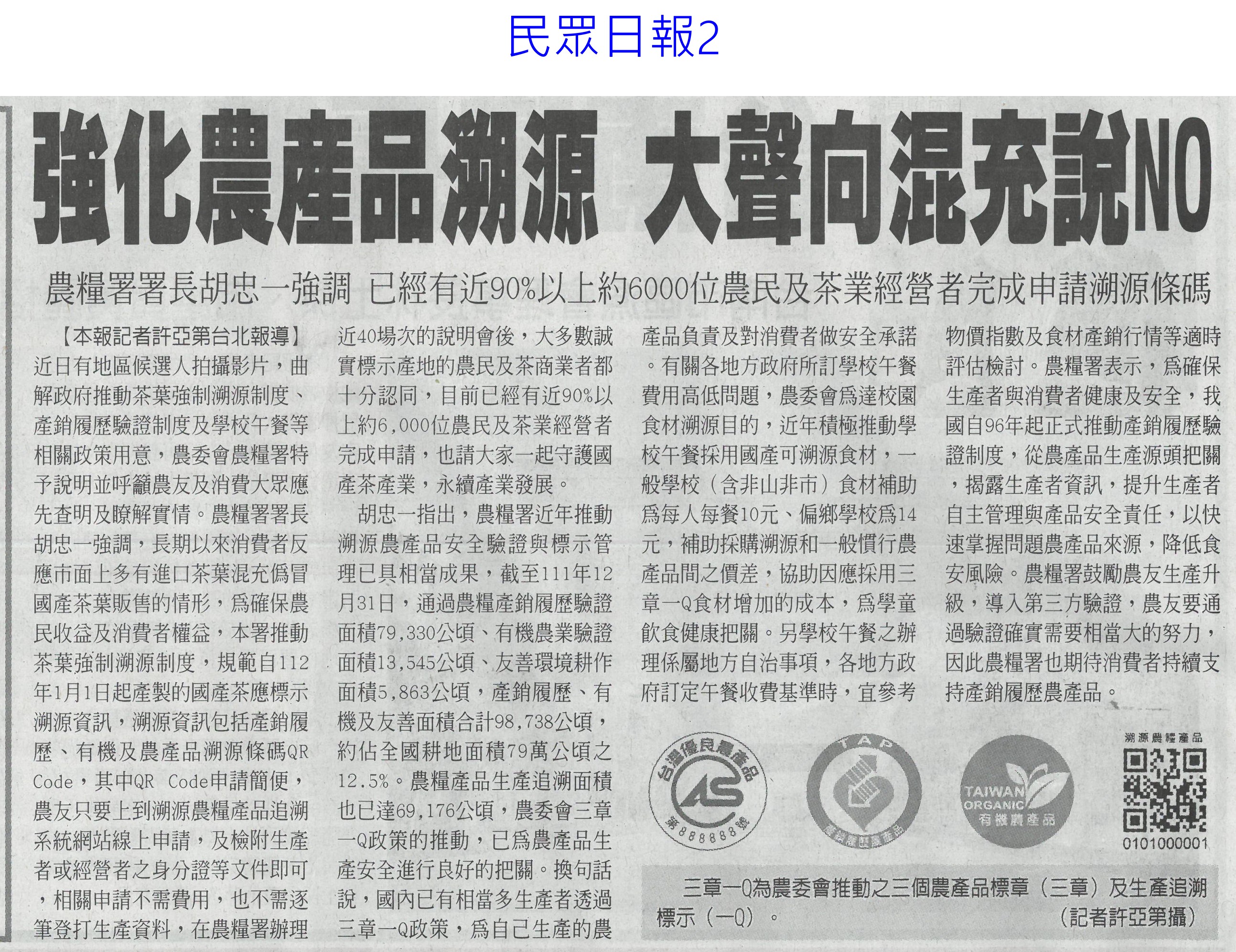 首頁萵苣觀新聞 萵苣觀新聞 排序 發布日期 更新日期 序號 發布日期 標題 1321. 112/02/01 南市尚好肥試種玉米筍 親子採收趣(民眾日報12) 1322. 112/02/01 寒流再次南下 農委會成立應變小組(民眾日報2) 1323. 112/01/18 西螺果菜市場量穩 今`明交易高峰(聯合報B2) 1324. 112/01/18 張麗善視察果菜市場供貨 拜早年(臺灣時報18) 1325. 112/01/18 穩定年前菜價 農糧署再增供應量(臺灣時報4) 1326. 112/01/18 老天不給力 曾文水庫3度人工增雨無效(自由時報A11) 1327. 112/01/18 春節供應 魚市增量 蔬果回穩(中華日報A3) 1328. 112/01/18 鋒面來了 南水局向老天多要點水(民眾日報3) 1329. 112/01/18 全聯攜手農委會 打造抗漲專區(台灣新生報8) 1330. 112/01/18 雲林年貨大街 張麗善送小紅包(中華日報B6) 1331. 112/01/13 抗通膨 農委會年推200萬個60元幸福餐盒(臺灣時報7) 1332. 112/01/13 抑制春節菜價 農委會:將增量供應(臺灣時報5) 1333. 112/01/13 農委會加強供貨 滿足年節採購需求(民眾日報2) 1334. 112/01/13 雲林良品康是美誠品上架(中華日報B6) 1335. 112/01/12 神農獎頒獎 蘇揆肯定卓越貢獻(民眾日報14) 1336. 112/01/12 農曆春節農產品 農委會:供應無虞(民眾日報4) 1337. 112/01/12 鼓勵使用雞糞加工肥料 農糧署補助加倍(臺灣時報9) 1338. 112/01/12 強化農產品溯源 大聲向混充說NO(民眾日報2) 1339. 112/01/12 大成歡聚好時光年貨市集 開跑(台灣新生報7) 1340. 112/01/12 大成年貨市集開跑 展售優質農特產(中華日報B3) 第 67/142 頁,共 2828 筆上一頁到第123456789101112131415161718192021222324252627282930313233343536373839404142434445464748495051525354555657585960616263646566676869707172737475767778798081828384858687888990919293949596979899100101102103104105106107108109110111112113114115116117118119120121122123124125126127128129130131132133134135136137138139140141142頁下一頁每頁103070筆資料