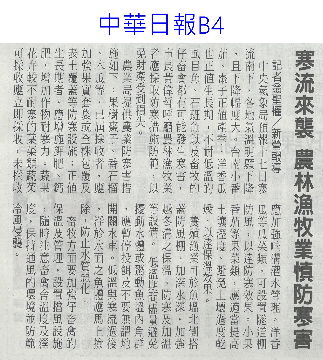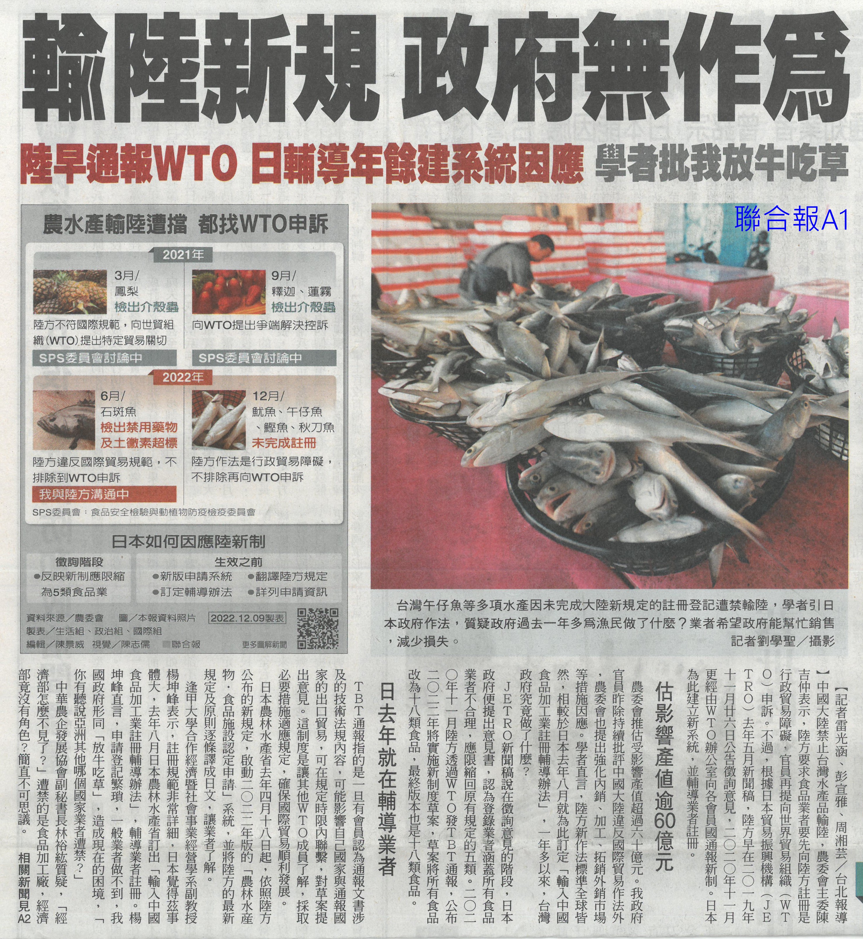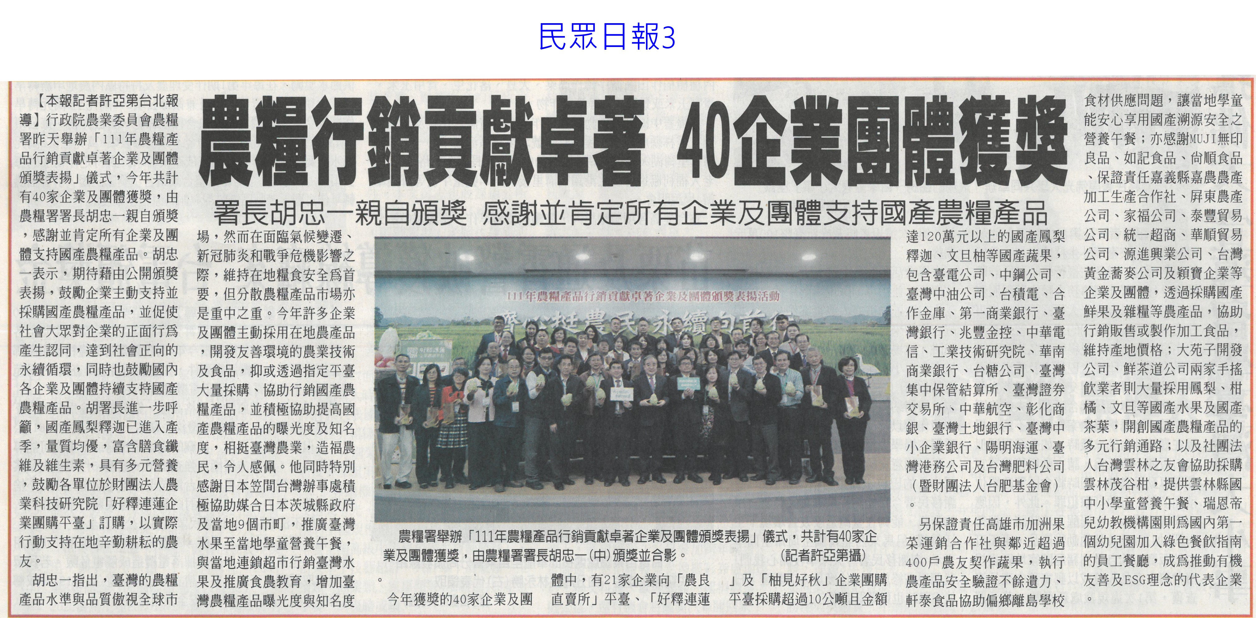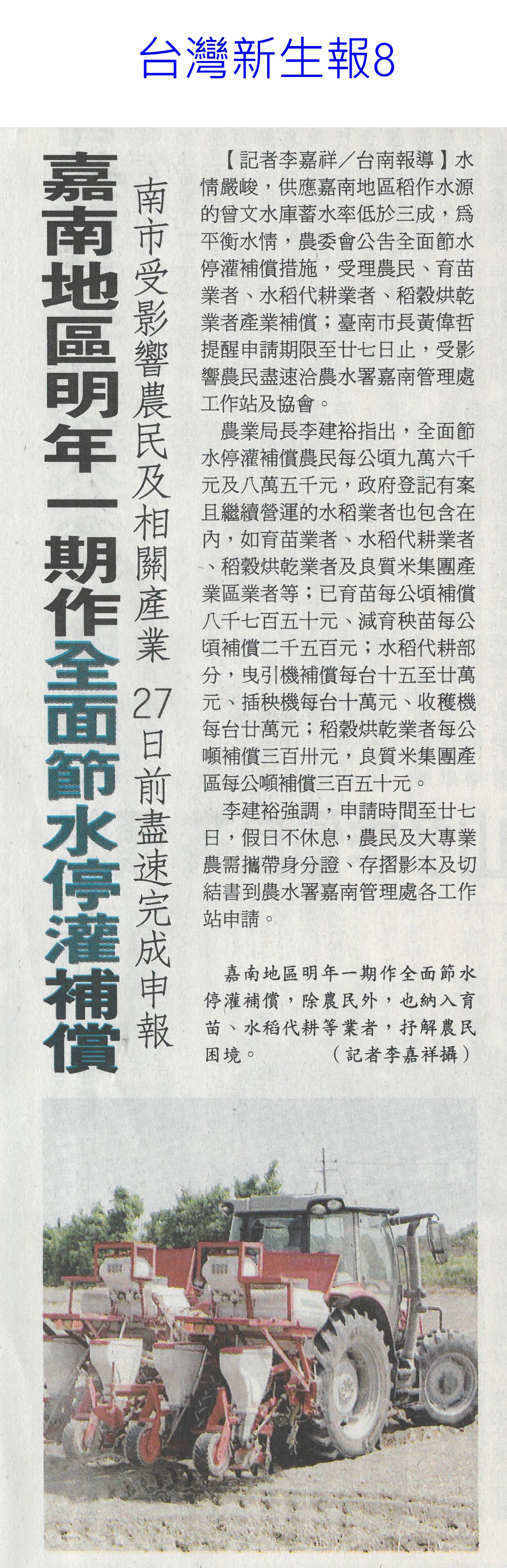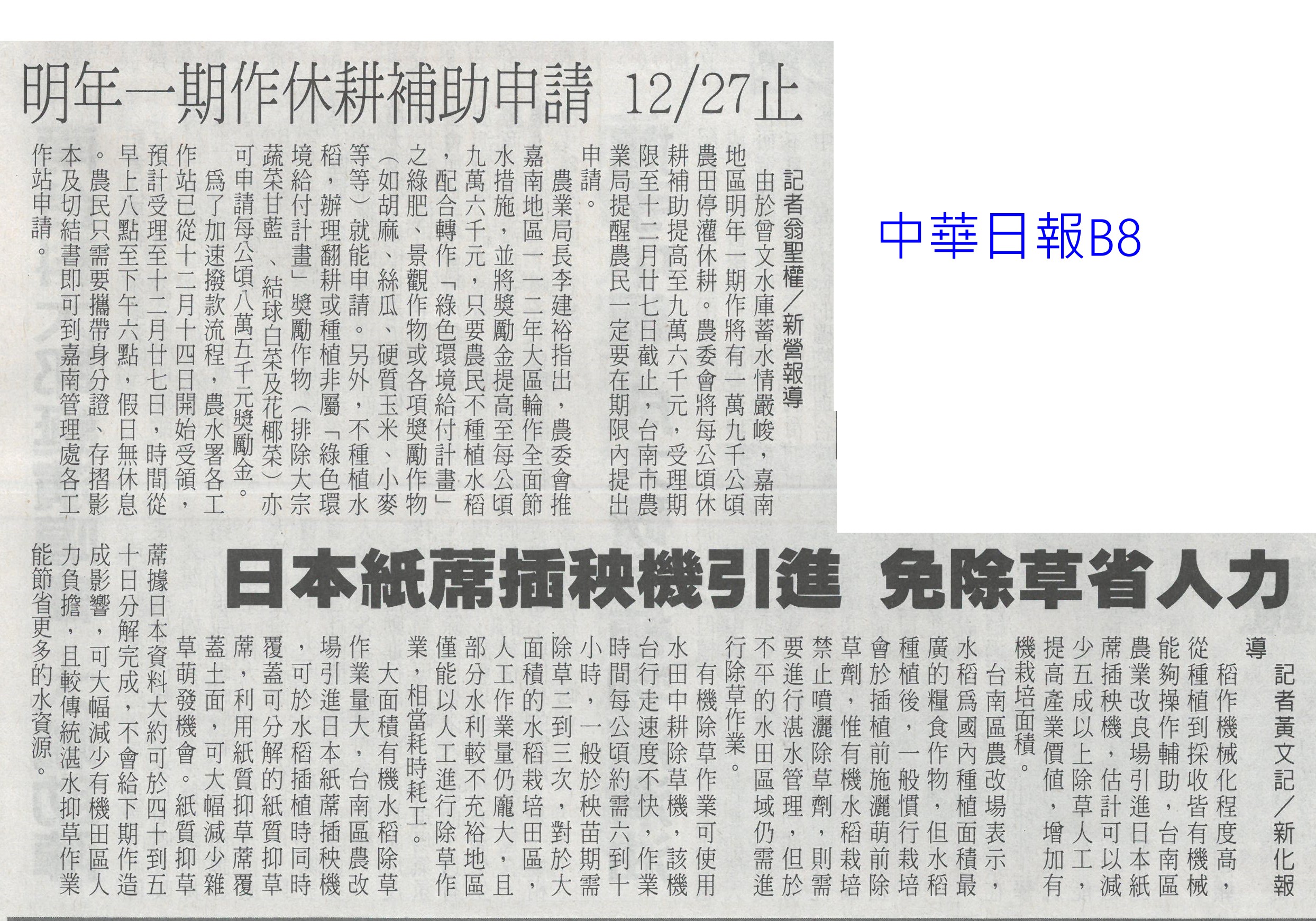 首頁萵苣觀新聞 萵苣觀新聞 排序 發布日期 更新日期 序號 發布日期 標題 1361. 111/12/26 嘉南地區明年一期作全面節水停灌補償(台灣新生報8) 1362. 111/12/21 雲林高鐵沿線農田 農糧署鼓勵轉旱作(民眾日報4) 1363. 111/12/21 農糧行銷貢獻卓著 40企業團體獲獎(民眾日報3) 1364. 111/12/21 明年1期作休耕補助申請 12/27止(中華日報B8) 1365. 111/12/20 全國最美 新化果菜市場正式開幕(中華日報B8) 1366. 111/12/20 寒流來襲 農改場籲加強作物防寒(民眾日報12) 1367. 111/12/20 臺灣良好農業規範 升級(民眾日報4) 1368. 111/12/20 強化銷日農產品產銷履歷日文版 明年上線(自由時報A10) 1369. 111/12/19 寒流來襲 農林漁牧業慎防寒害(中華日報B4) 1370. 111/12/19 冷氣團週六報到 農漁民整備防寒害(臺灣時報18) 1371. 111/12/19 曾文水庫蓄水率 剩2成7(自由時報A11) 1372. 111/12/19 試營運業績佳 新化果菜市場今開張(中國時報A9) 1373. 111/12/19 專家:珍惜ECFA 勿犧牲臺灣農漁民權利(中國時報A3) 1374. 111/12/13 鼓勵檳榔廢園轉作 農糧署祭補助(民眾日報10) 1375. 111/12/13 專家建言:改造外銷體質 降低對中依賴(自由時報A2) 1376. 111/12/13 看見農村英雄 帶動農村轉型(民眾日報3) 1377. 111/12/13 嘉市液態稻草分解菌示範(台灣新生報7) 1378. 111/12/13 暖暖府東市集 台日文化農業交流(中華日報B2) 1379. 111/12/13 嘉南明年一期作休耕 周邊產業損失大(中國時報A9) 1380. 111/12/12 輸陸新規 政府無作為(聯合報A1) 第 69/142 頁,共 2828 筆上一頁到第123456789101112131415161718192021222324252627282930313233343536373839404142434445464748495051525354555657585960616263646566676869707172737475767778798081828384858687888990919293949596979899100101102103104105106107108109110111112113114115116117118119120121122123124125126127128129130131132133134135136137138139140141142頁下一頁每頁103070筆資料