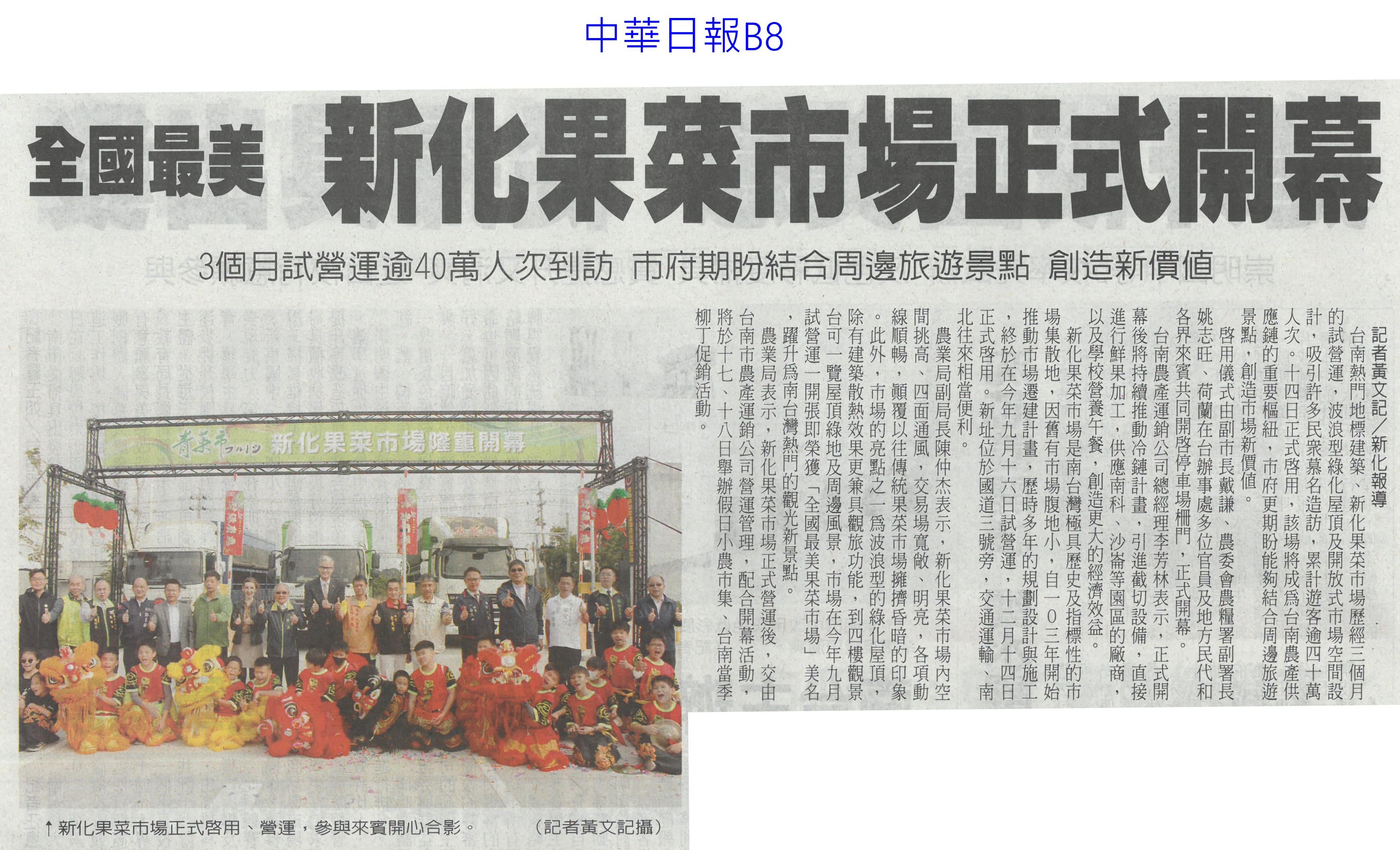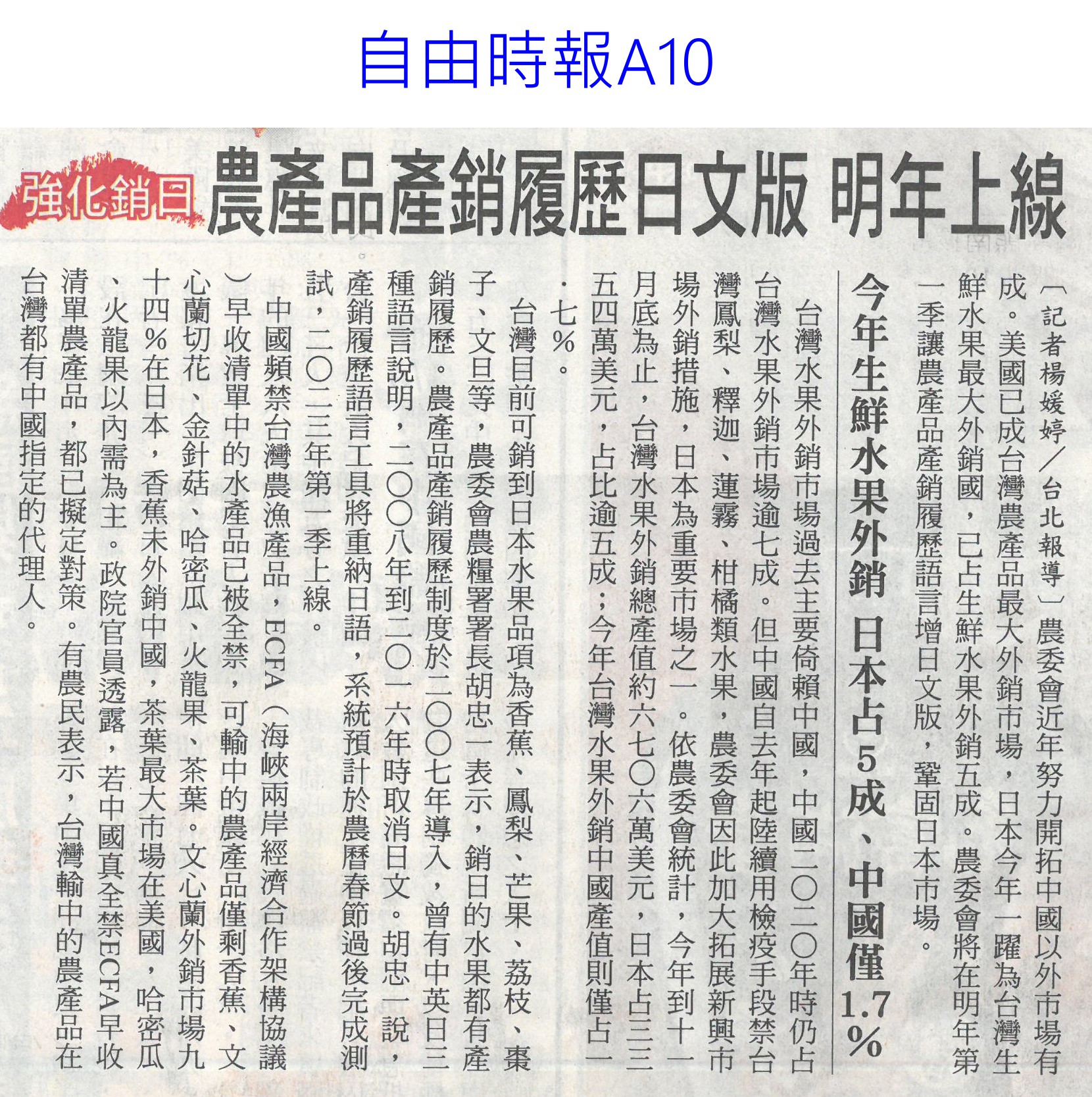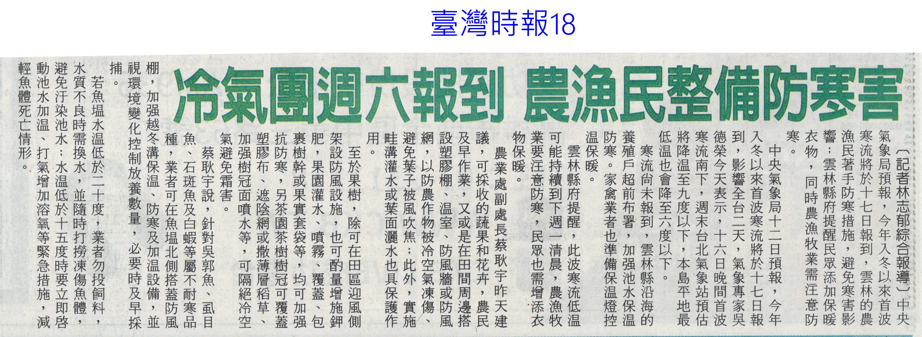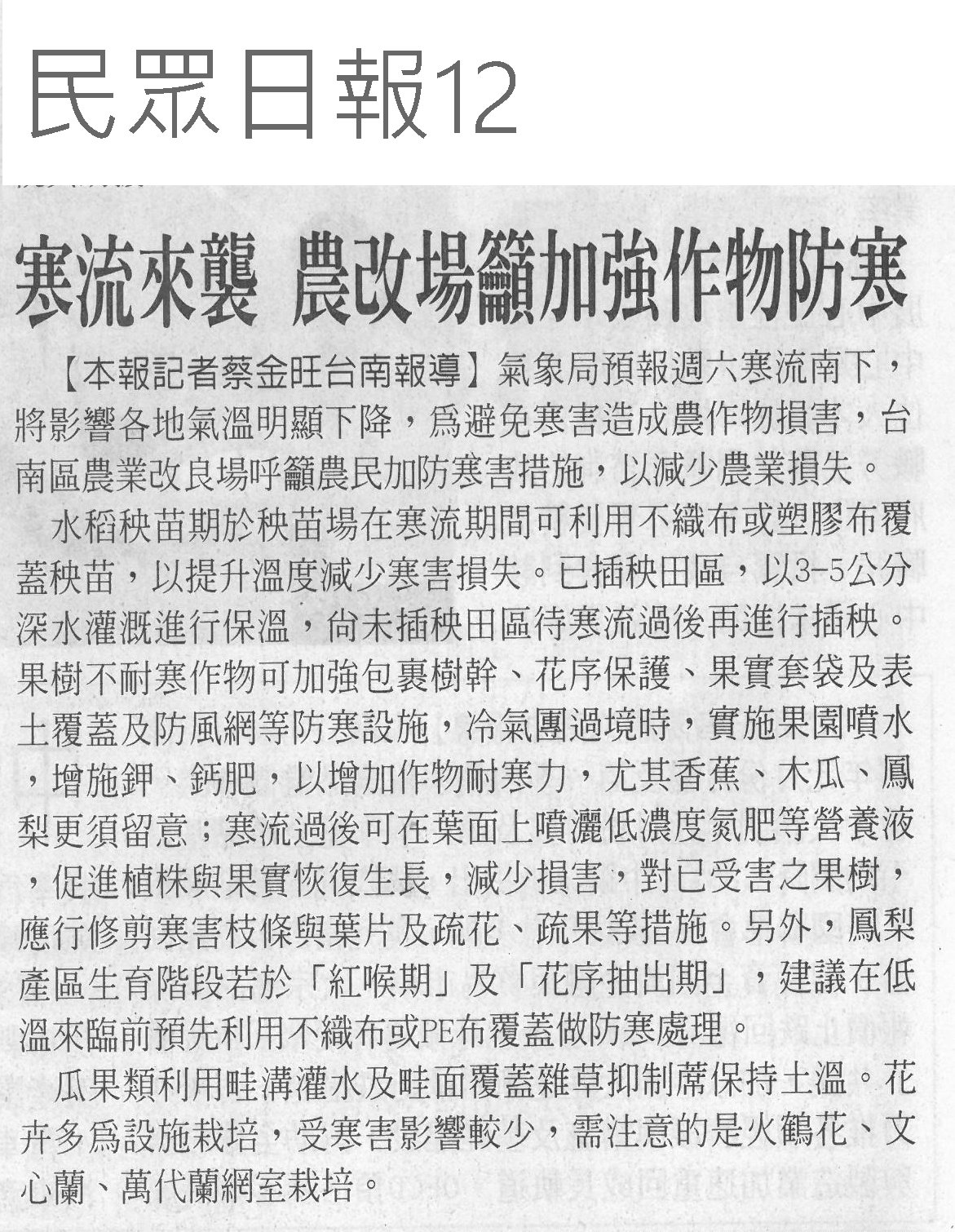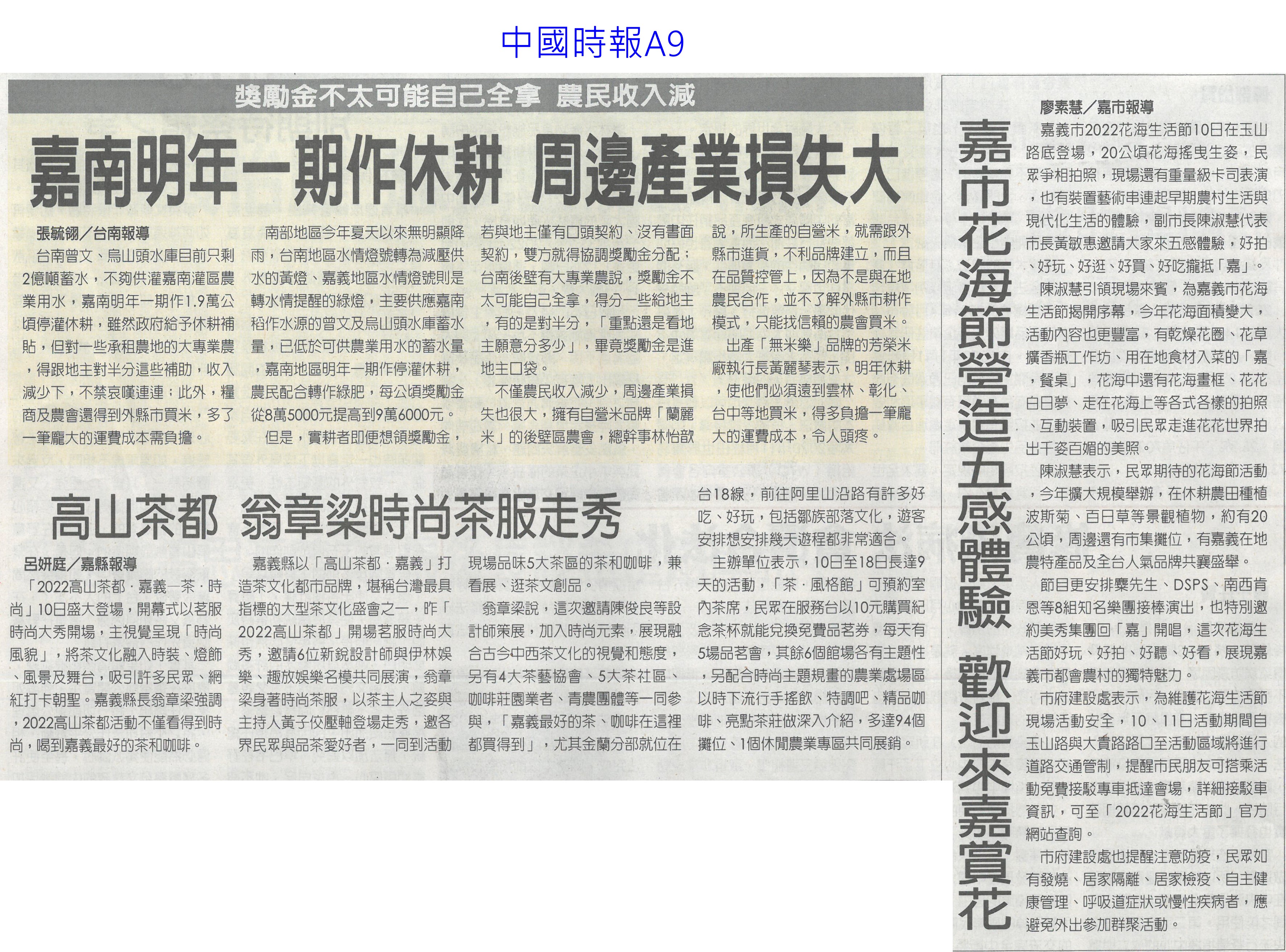 首頁萵苣觀新聞 萵苣觀新聞 排序 發布日期 更新日期 序號 發布日期 標題 1361. 111/12/26 嘉南地區明年一期作全面節水停灌補償(台灣新生報8) 1362. 111/12/21 雲林高鐵沿線農田 農糧署鼓勵轉旱作(民眾日報4) 1363. 111/12/21 農糧行銷貢獻卓著 40企業團體獲獎(民眾日報3) 1364. 111/12/21 明年1期作休耕補助申請 12/27止(中華日報B8) 1365. 111/12/20 全國最美 新化果菜市場正式開幕(中華日報B8) 1366. 111/12/20 寒流來襲 農改場籲加強作物防寒(民眾日報12) 1367. 111/12/20 臺灣良好農業規範 升級(民眾日報4) 1368. 111/12/20 強化銷日農產品產銷履歷日文版 明年上線(自由時報A10) 1369. 111/12/19 寒流來襲 農林漁牧業慎防寒害(中華日報B4) 1370. 111/12/19 冷氣團週六報到 農漁民整備防寒害(臺灣時報18) 1371. 111/12/19 曾文水庫蓄水率 剩2成7(自由時報A11) 1372. 111/12/19 試營運業績佳 新化果菜市場今開張(中國時報A9) 1373. 111/12/19 專家:珍惜ECFA 勿犧牲臺灣農漁民權利(中國時報A3) 1374. 111/12/13 鼓勵檳榔廢園轉作 農糧署祭補助(民眾日報10) 1375. 111/12/13 專家建言:改造外銷體質 降低對中依賴(自由時報A2) 1376. 111/12/13 看見農村英雄 帶動農村轉型(民眾日報3) 1377. 111/12/13 嘉市液態稻草分解菌示範(台灣新生報7) 1378. 111/12/13 暖暖府東市集 台日文化農業交流(中華日報B2) 1379. 111/12/13 嘉南明年一期作休耕 周邊產業損失大(中國時報A9) 1380. 111/12/12 輸陸新規 政府無作為(聯合報A1) 第 69/142 頁,共 2828 筆上一頁到第123456789101112131415161718192021222324252627282930313233343536373839404142434445464748495051525354555657585960616263646566676869707172737475767778798081828384858687888990919293949596979899100101102103104105106107108109110111112113114115116117118119120121122123124125126127128129130131132133134135136137138139140141142頁下一頁每頁103070筆資料