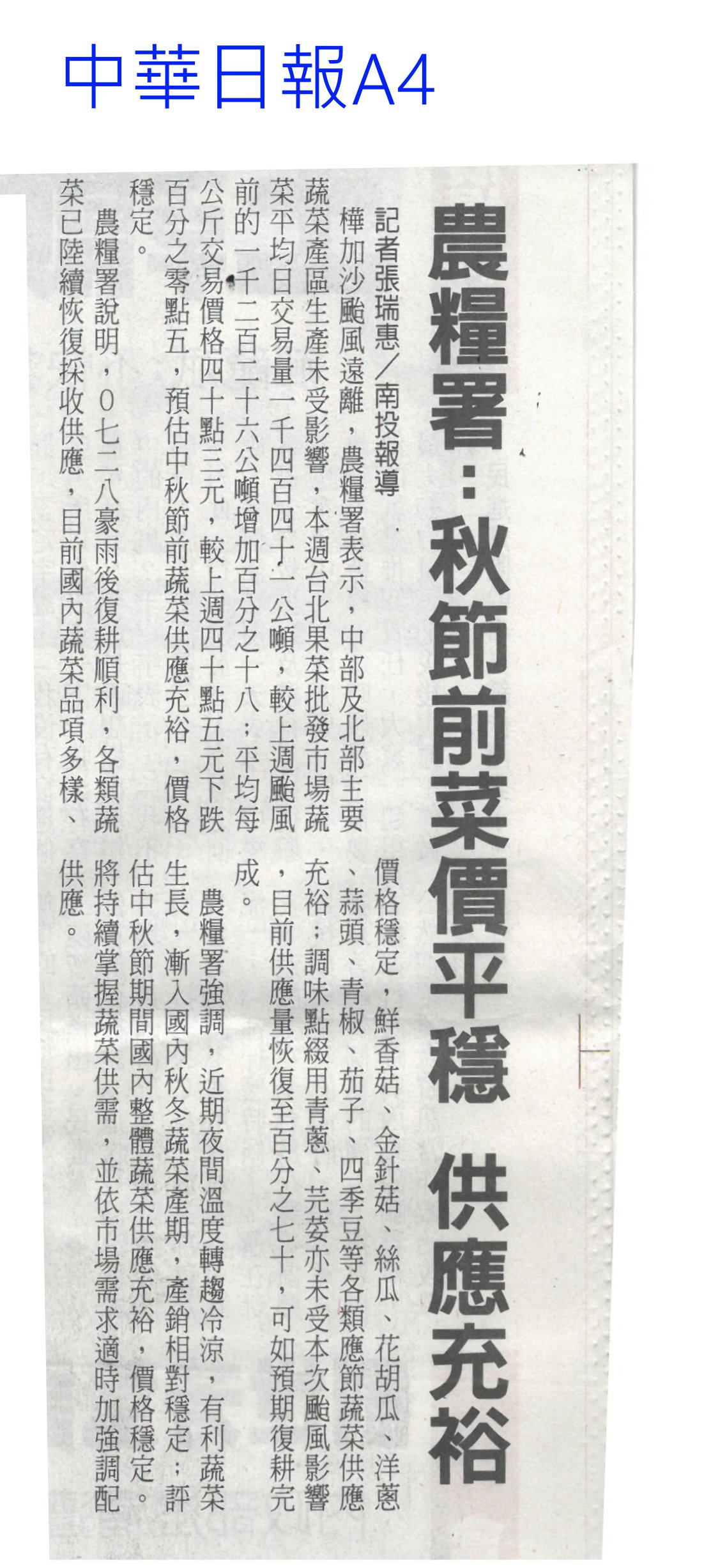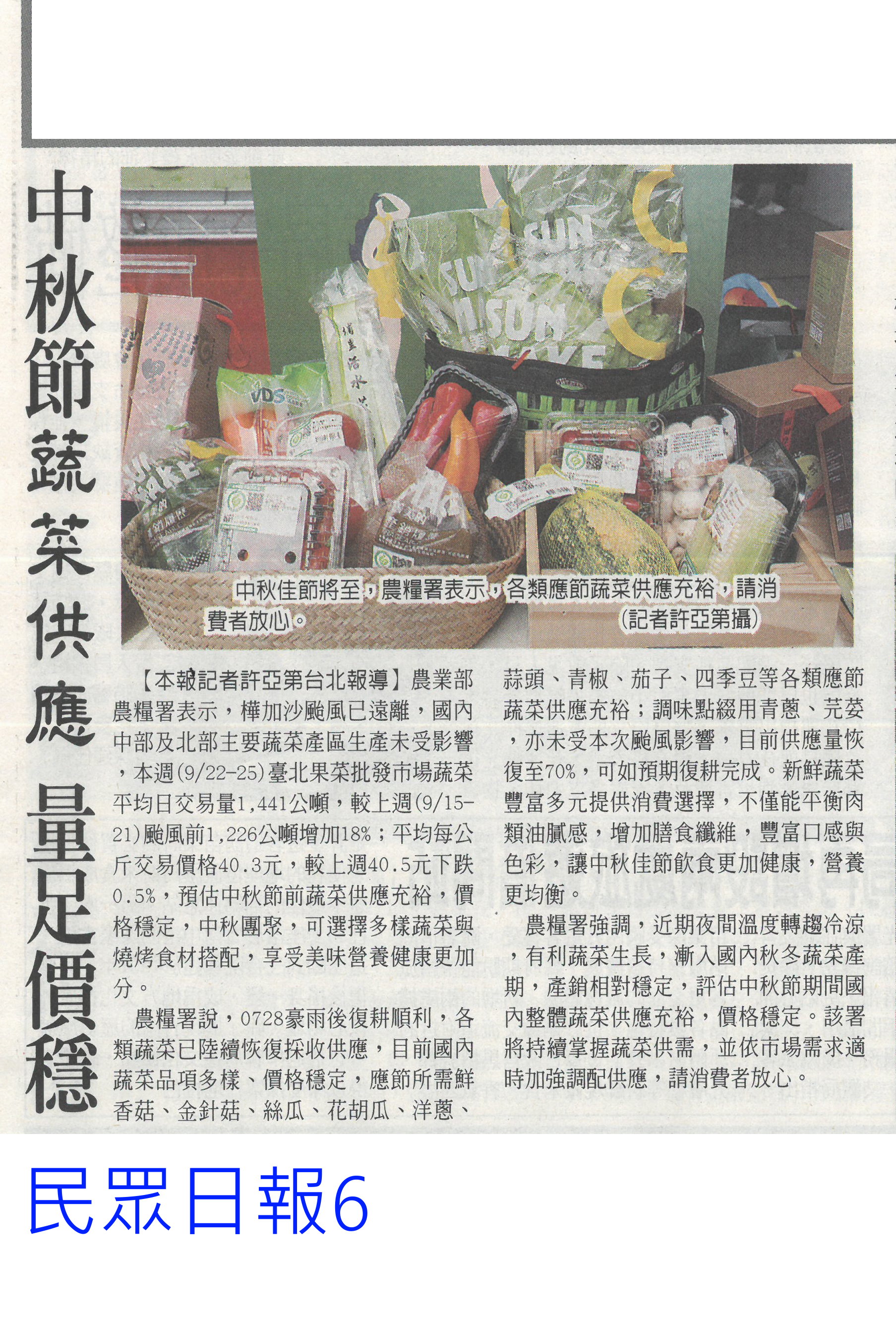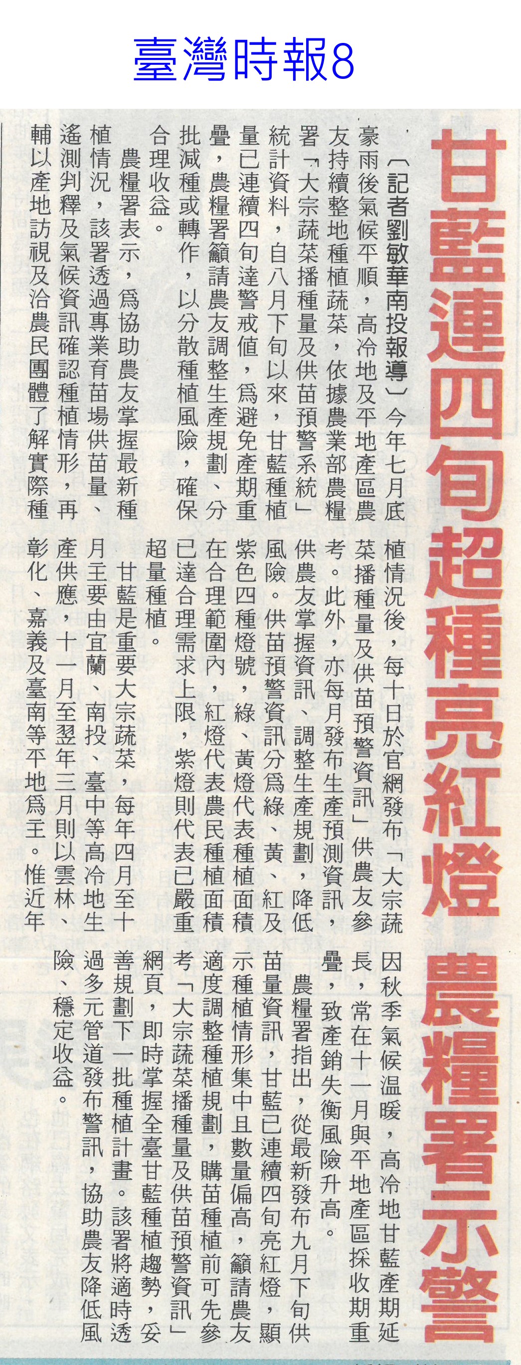 首頁萵苣觀新聞 萵苣觀新聞 排序 發布日期 更新日期 序號 發布日期 標題 141. 114/11/03 產地永續小宇宙 農糧署冷鏈展售(民眾日報3) 142. 114/10/28 黃偉哲首訪日本平戶市 行銷農特產(中華日報B2) 143. 114/10/21 陳駿季:5年內獼猴恐闖市區(中華日報A3) 144. 114/10/21 農民職災保險就醫津貼給付水準 提高(民眾日報6) 145. 114/10/21 植物診療師國考 老闆激勵過關加薪(自由時報A9) 146. 114/10/21 農剩餘資材利用 減碳聯盟合作啟動(民眾日報4) 147. 114/10/21 農郵精選集實體市集及線上登場(台灣新生報8) 148. 114/10/16 農民職災保險就醫津貼給付水準 提高(民眾日報6) 149. 114/10/13 甘藍連四旬超種亮紅燈 農糧署示警(臺灣時報8) 150. 114/10/13 高麗菜超種 連40天亮紅燈(中華日報A4) 151. 114/10/07 中秋健康烤肉 玉米筍爽脆解膩(中華日報B3) 152. 114/10/07 編6億助農產外銷 上半年反衰退(中國時報A6) 153. 114/10/07 雲林良品伴手禮 跨域合作(台灣新生報7) 154. 114/10/01 農業部:持續支持3章1 Q國產食材(臺灣時報4) 155. 114/10/01 中秋蔬菜供應 量足價穩(民眾日報6) 156. 114/10/01 農糧署:秋節前菜價平穩 供應充裕(中華日報A4) 157. 114/10/01 石壁觀光轉型 升格休閒農業區(聯合報B2) 158. 114/10/01 南得極品展售會 送禮兩相宜(中華日報B8) 159. 114/10/01 仁德小農市集 買在地做公益(中華日報B3) 160. 114/10/01 大內九月雪活動浪漫登場(台灣新生報6) 第 8/141 頁,共 2807 筆上一頁到第123456789101112131415161718192021222324252627282930313233343536373839404142434445464748495051525354555657585960616263646566676869707172737475767778798081828384858687888990919293949596979899100101102103104105106107108109110111112113114115116117118119120121122123124125126127128129130131132133134135136137138139140141頁下一頁每頁103070筆資料