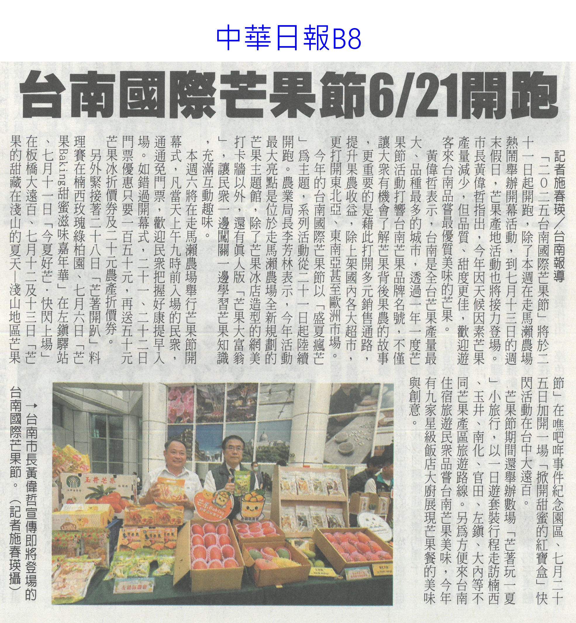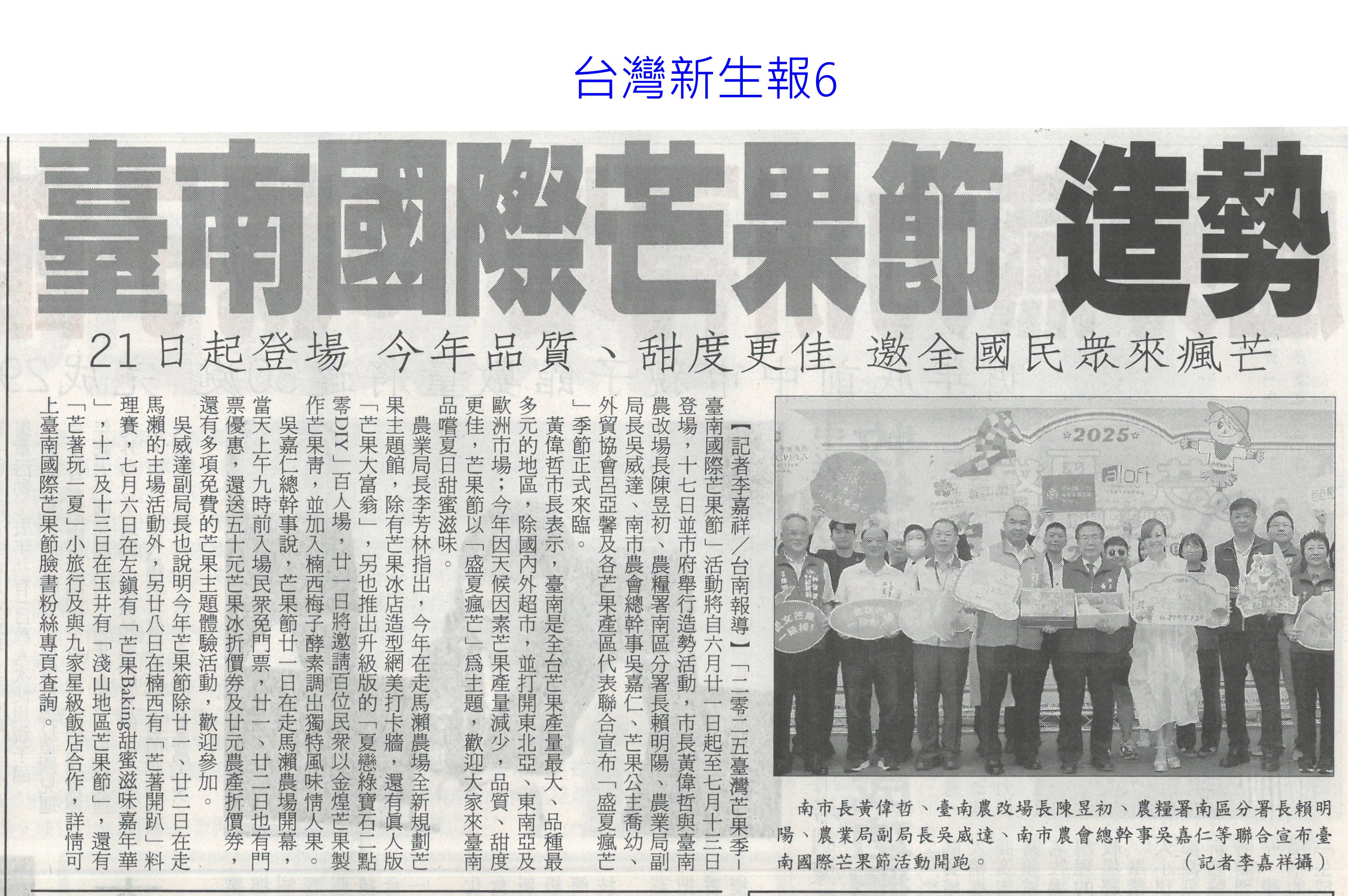 首頁芒果新鮮聞 芒果新鮮聞 排序 發布日期 更新日期 序號 發布日期 標題 181. 114/06/19 盛夏瘋芒 台南國際芒果節6/21開幕(自由時報A11) 182. 114/06/19 台南國際芒果節造勢(台灣新生報6) 183. 114/06/19 台南國際芒果節6/21開跑(中華日報B8) 184. 114/06/19 金鑽鳳梨截切鮮果盒上架超商(中華日報B8) 185. 114/06/19 台南金鑽鳳梨 全台超商吃得到(台灣新生報6) 186. 114/06/19 台北食品展 嘉義優鮮登台誓師(臺灣時報18) 187. 114/06/18 芒果太甜不敢吃?研究:吃2週有助降血糖、血壓、膽固醇 更年期婦女最受益 188. 114/06/18 台灣觀光100亮點臺南值星 6條路線「玩轉臺南」,親民價格「暑」於您! 189. 114/06/17 台灣觀光100亮點499元起暢玩台南!得獎路線公布6大遊程4大自由行必玩 190. 114/06/16 歐盟開放台灣芒果與番石榴 黃偉哲感謝防檢署積極交涉 191. 114/06/16 坐車旅遊都划算 臺南100亮點超值遊程線上開賣 192. 114/06/16 台南亮點遊程獲台灣旅遊大賞獎 6大路線超值遊開賣 193. 114/06/16 台灣觀光100亮點 6大遊程開賣 194. 114/06/16 黃偉哲力薦「南得極品」再戰台北食品展 台南業者共展農產實力 195. 114/06/16 玩轉臺南百樣精彩臺南100精選六條亮點遊程 邀全國遊客來臺南夏趴 196. 114/06/15 台南芒果、芭樂成功叩關歐盟! 黃偉哲感謝中央力挺 197. 114/06/15 芒果季來了!農業部傳授「3招保證好吃」選法:香甜濃郁又多汁 198. 114/06/14 台灣水果再傳捷報! 芒果、番石榴獲准銷歐盟會員國 199. 114/06/14 卓榮泰視察曾文溪排水 黃偉哲爭取150億水利建設經費 200. 114/06/14 台灣農產品外銷跨大步! 芒果、芭樂獲准進口歐盟 第 10/183 頁,共 3656 筆上一頁到第123456789101112131415161718192021222324252627282930313233343536373839404142434445464748495051525354555657585960616263646566676869707172737475767778798081828384858687888990919293949596979899100101102103104105106107108109110111112113114115116117118119120121122123124125126127128129130131132133134135136137138139140141142143144145146147148149150151152153154155156157158159160161162163164165166167168169170171172173174175176177178179180181182183頁下一頁每頁103070筆資料