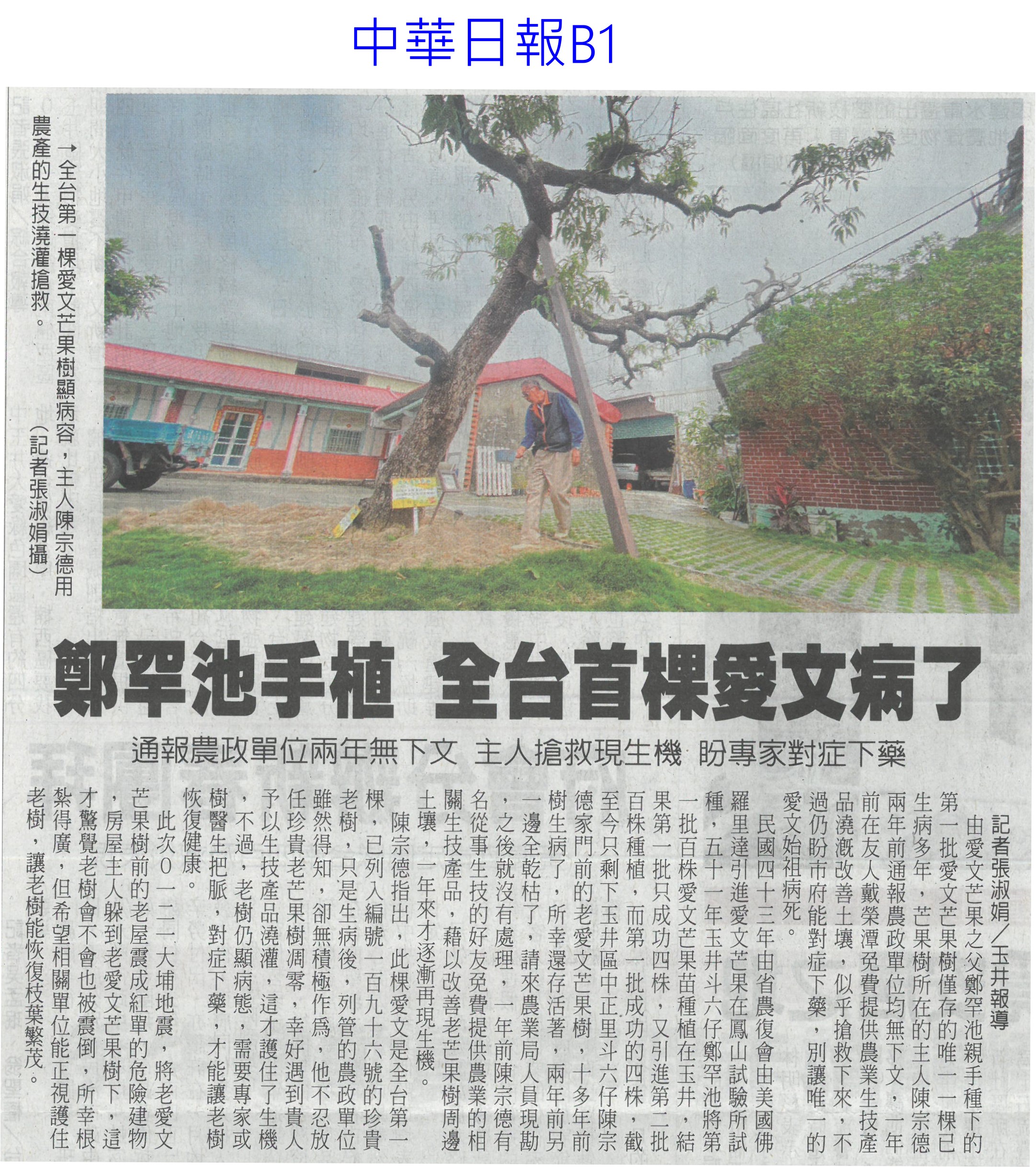 首頁芒果新鮮聞 芒果新鮮聞 排序 發布日期 更新日期 序號 發布日期 標題 341. 114/02/18 農產品檢測中心動土 強化品質安全(民眾日報14) 342. 114/02/18 降低稻作面積 農糧署輔導轉作雜糧(中華日報B8) 343. 114/02/18 台南後壁農地清淤 中央補助一億(中國時報A9) 344. 114/02/18 青農經營準備金 今開放申請(臺灣時報10) 345. 114/02/18 新進青農經營準備金 即日起至3月7日開放申請(自由時報A8) 346. 114/02/18 植物品種權 去年申請200件(自由時報A8) 347. 114/02/18 尊重植物品種權 農業創新無限可能(民眾日報16) 348. 114/02/18 農業經營準備金 今起開放申請(民眾日報14) 349. 114/02/17 水果變黑、軟爛,切掉還能吃或榨汁?專家解答安心吃2原則 350. 114/02/11 雲縣智慧農業補助開跑(台灣新生報6) 351. 114/02/11 雲林推智慧農業 最高補助百萬(中國時報A9) 352. 114/02/10 農業部長勘楠西南化災損(中華日報B2) 353. 114/02/10 農友休耕轉作申報 8日截止(中華日報B4) 354. 114/02/10 青農創新 卓蘭智慧溫網啓用(民眾日報4) 355. 114/02/10 對等關稅來勢洶 農部最憂蝴蝶蘭(中國時報A2) 356. 114/02/05 冷氣團來襲 農改場籲農友防寒害(中華日報B8) 357. 114/02/04 臺灣首棵愛文芒果樹病了(自由時報A11) 358. 114/02/04 鄭罕池手植 全台首棵愛文病了(中華日報B1) 359. 113/10/14 台灣趴趴走/台南水果做成冰!「果」然越吃越開心! 360. 113/10/11 不只番茄!3水果沾醬美味加倍 它配醬油秒變「生魚片」 第 18/183 頁,共 3656 筆上一頁到第123456789101112131415161718192021222324252627282930313233343536373839404142434445464748495051525354555657585960616263646566676869707172737475767778798081828384858687888990919293949596979899100101102103104105106107108109110111112113114115116117118119120121122123124125126127128129130131132133134135136137138139140141142143144145146147148149150151152153154155156157158159160161162163164165166167168169170171172173174175176177178179180181182183頁下一頁每頁103070筆資料