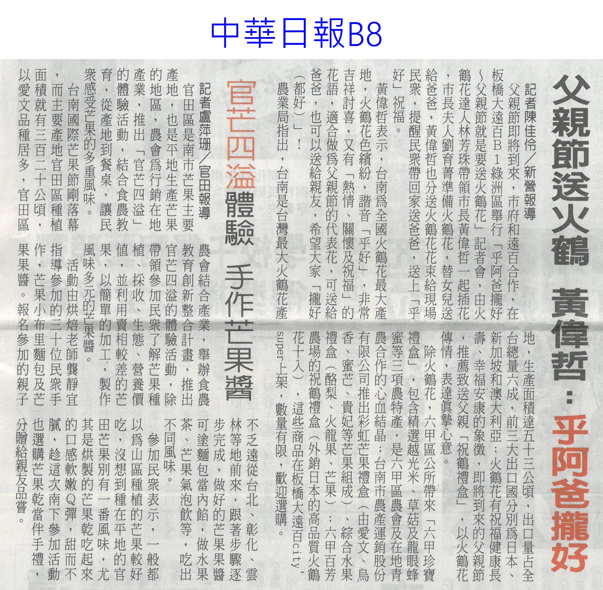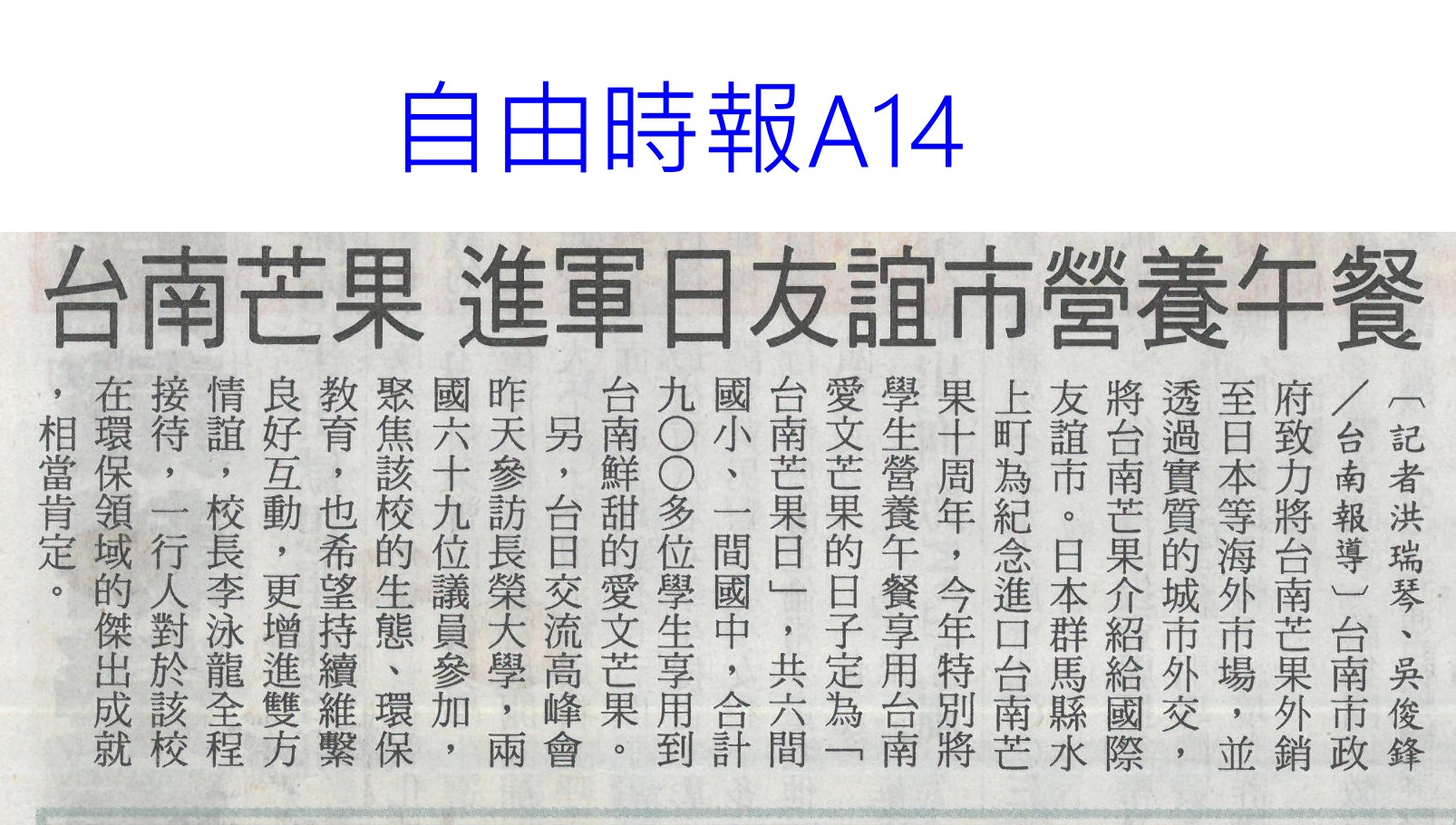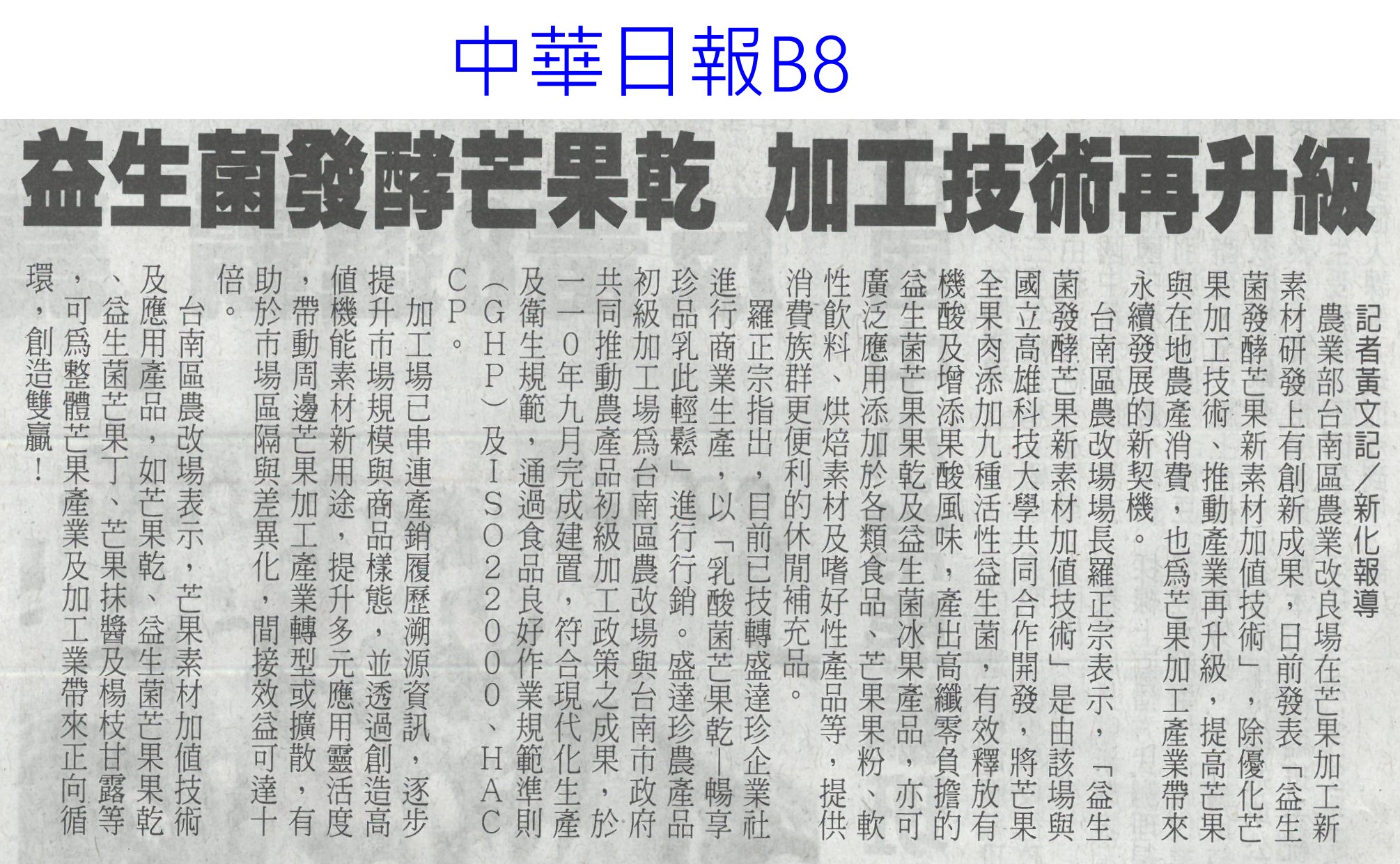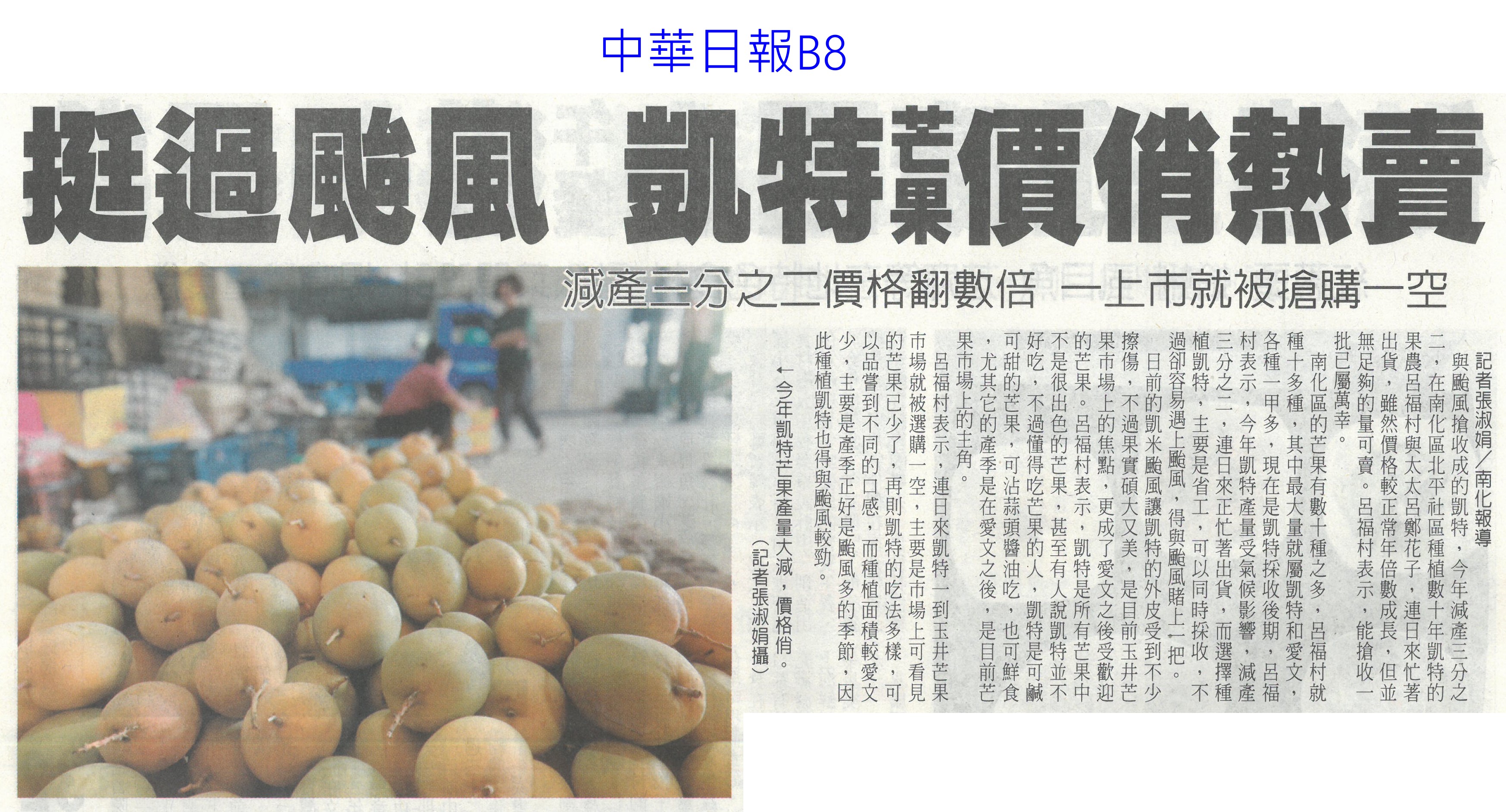 首頁芒果新鮮聞 芒果新鮮聞 排序 發布日期 更新日期 序號 發布日期 標題 361. 113/10/08 許玉靜領軍 青農團隊合作分享獲亞軍(中華日報B8) 362. 113/09/12 玉井公所首推在地芒金麵伴手禮(中華日報B3) 363. 113/09/10 結合愛文芒果 玉井推芒金關廟麵(自由時報A11) 364. 113/09/03 更新設備 玉井蒸熱廠交出好成績(中華日報B1) 365. 113/08/28 芒果乾公益拍賣(中華日報B3) 366. 113/08/28 雲林芒果大道拓寬工程進度62% 預計明年完工串聯虎尾新舊城區 367. 113/08/25 芒果、香蕉沒熟透難入口!專家曝超簡單1招加速享用 368. 113/08/23 挺過颱風 凱特芒果價俏熱賣(中華日報B8) 369. 113/08/22 暑假尾聲 來逗福田99呷芒果冰(民眾日報16) 370. 113/08/19 彩虹芒果寶盒進軍星國超市(中華日報B2) 371. 113/08/12 左鎮老街首辦芒果冰節 人潮湧現(自由時報A11) 372. 113/08/08 夏季冰品旅遊圖鑑 台南嚐芒果冰、澎湖吃仙人掌冰 373. 113/08/07 比愛文芒果更好吃!吃龍蝦長大的「龍蝦芒果」引起熱潮,快來試吃 374. 113/08/07 網友最愛芒果品種Top 10!「夏雪」被封芒果界LV,「第1名」還外銷日韓港 375. 113/08/06 官田四溢體驗 手作芒果醬(中華日報B8) 376. 113/07/31 台南芒果 進軍日友誼市營養午餐(自由時報A14) 377. 113/07/31 日本友誼市賣芒果挺台南 黃偉哲:展現實質城市外交成果 378. 113/07/30 益生菌發酵芒果乾 加工技術再升級(中華日報B8) 379. 113/07/30 黃偉哲城市外交助攻芒果外銷 日本友誼市營養午餐定「台南芒果日」 380. 113/07/24 吃愛文芒果可抗發炎?營養師揭4大特點 竟還能顧心臟 第 19/183 頁,共 3656 筆上一頁到第123456789101112131415161718192021222324252627282930313233343536373839404142434445464748495051525354555657585960616263646566676869707172737475767778798081828384858687888990919293949596979899100101102103104105106107108109110111112113114115116117118119120121122123124125126127128129130131132133134135136137138139140141142143144145146147148149150151152153154155156157158159160161162163164165166167168169170171172173174175176177178179180181182183頁下一頁每頁103070筆資料