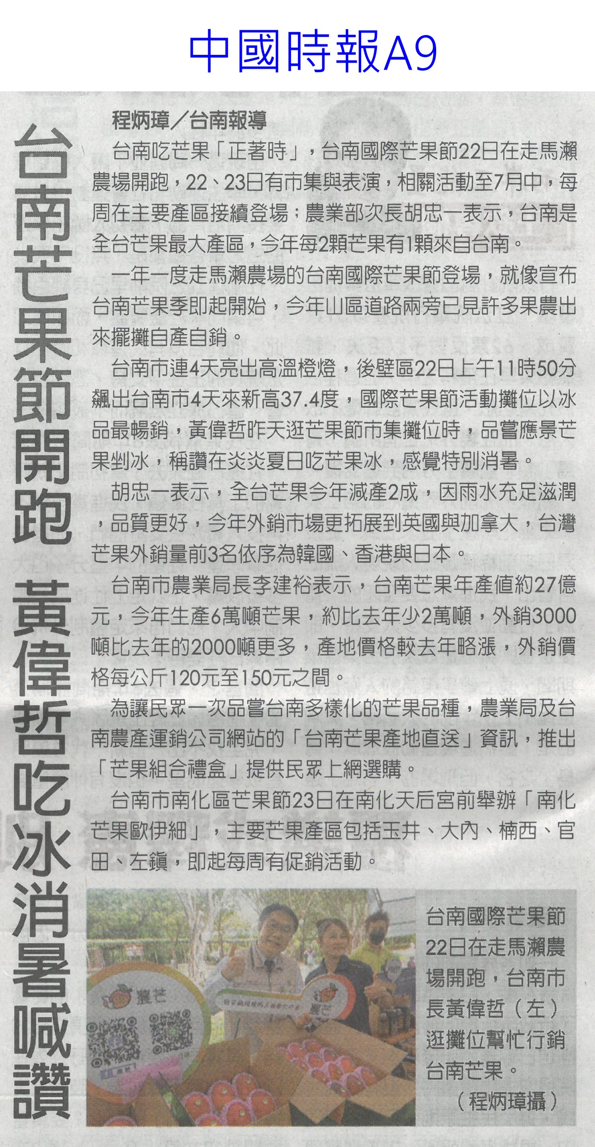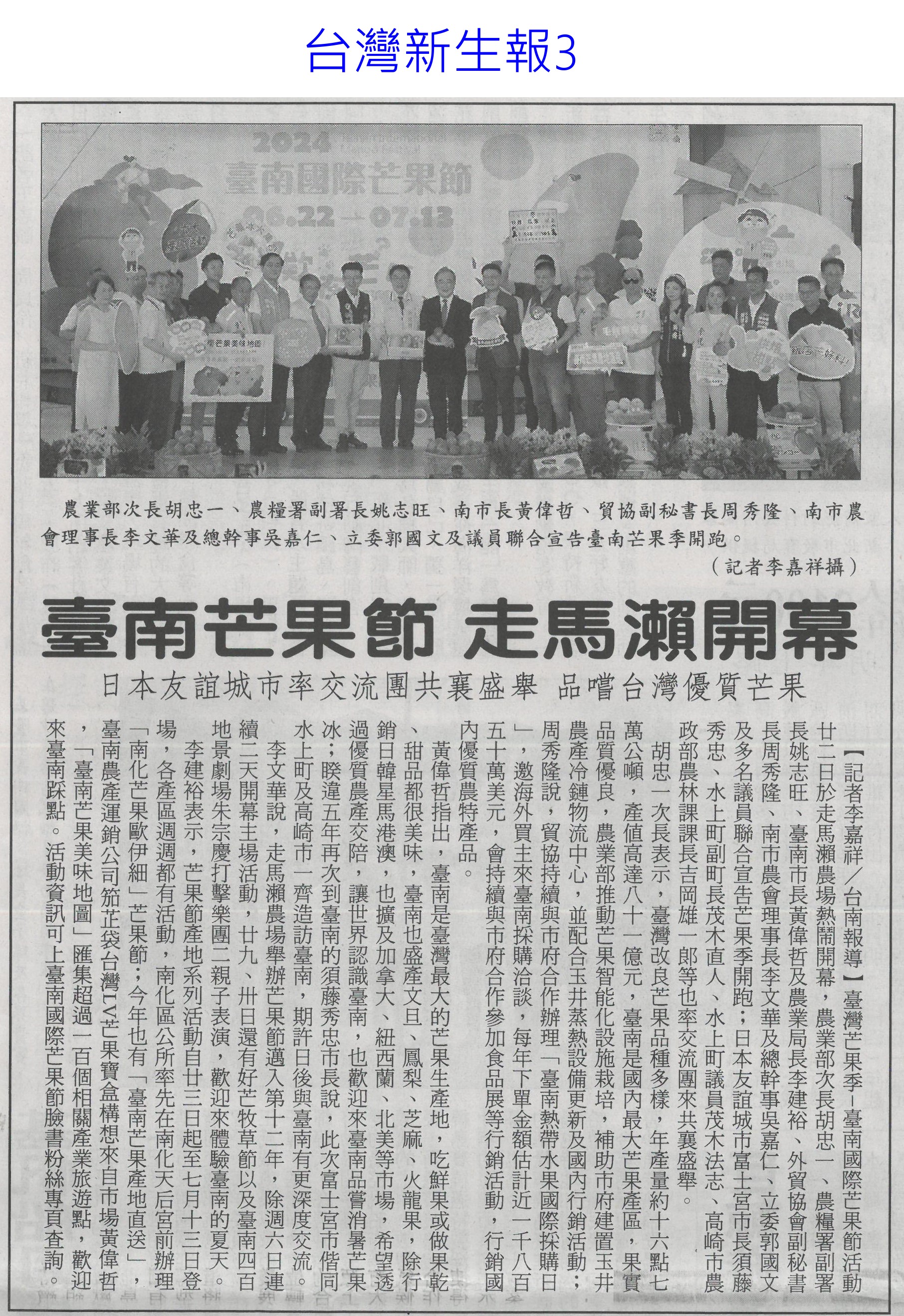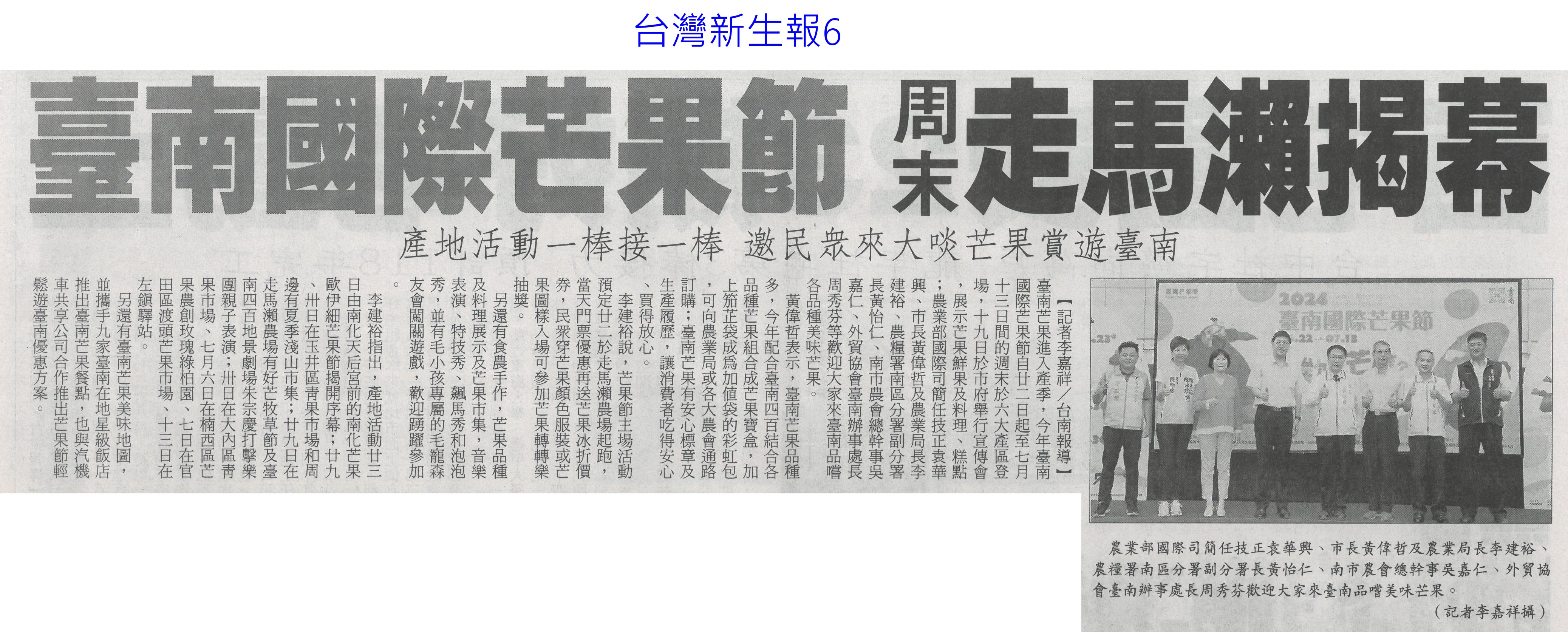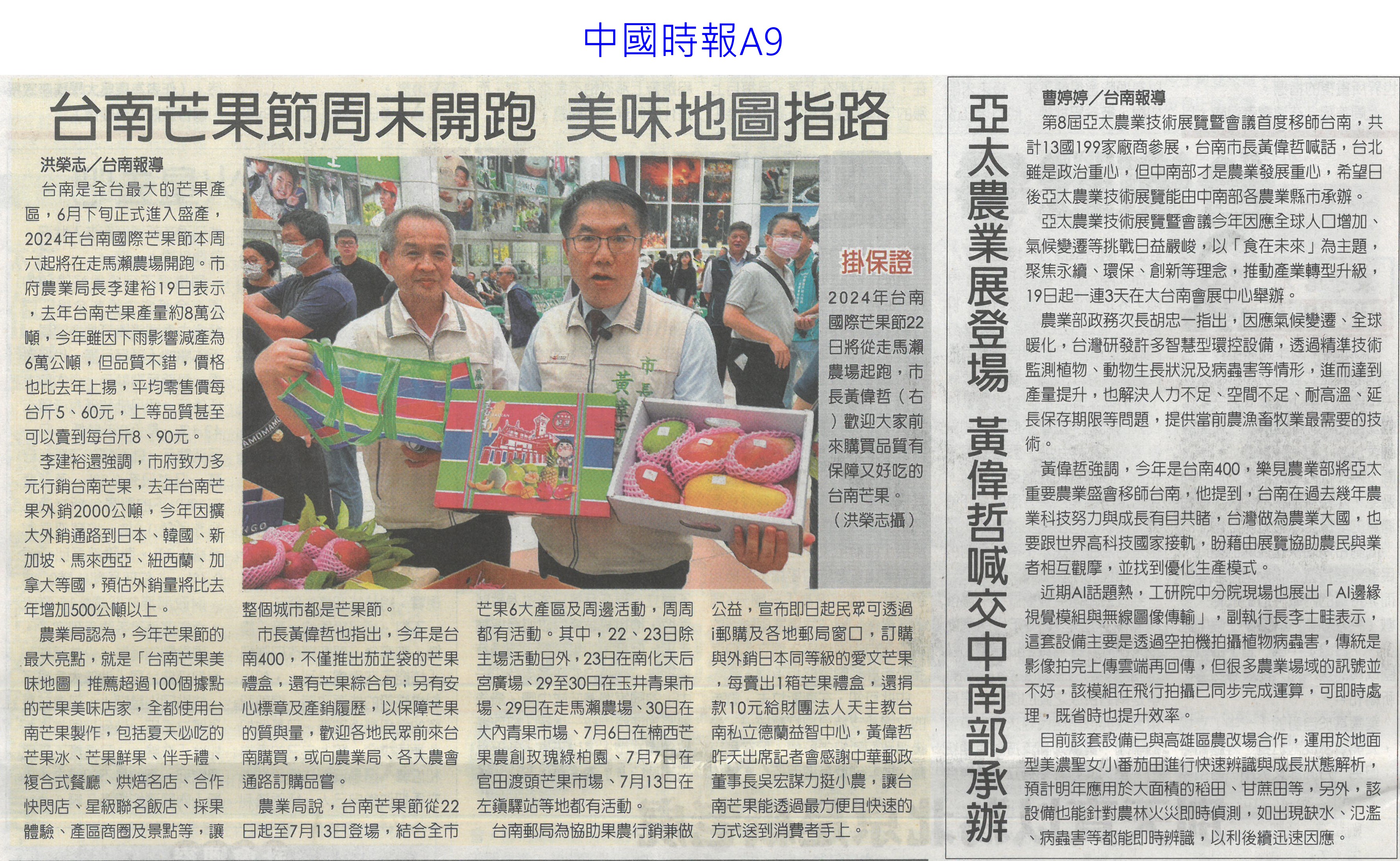 首頁芒果新鮮聞 芒果新鮮聞 排序 發布日期 更新日期 序號 發布日期 標題 461. 113/06/28 日友人訪台南 黃偉哲芒果寶盒迎賓(民眾日報3) 462. 113/06/28 南化芒果節登場 義賣助家扶(中華日報B1) 463. 113/06/28 台南國際芒果節大內起跑 6地接力行銷(自由時報A10) 464. 113/06/28 台南芒果節 走馬瀨開幕(台灣新生報3) 465. 113/06/28 芒果節在走馬瀨 連3週好芒(中華日報B1) 466. 113/06/28 台南芒果節開跑 黃偉哲吃冰消暑喊讚(中國時報A9) 467. 113/06/28 芒果節熱身 南化芒果大遠百快閃(中華日報B8) 468. 113/06/28 南化芒果市集 台南大遠百快閃(台灣新生報3) 469. 113/06/28 板橋大遠百 台南芒果飄香(台灣新生報5) 470. 113/06/28 行銷芒果增創意巧思(聯合報A9) 471. 113/06/28 南化新品文山芒果 今年採收(中華日報B8) 472. 113/06/28 亞太農業技術展 11國400攤齊聚(中華日報B8) 473. 113/06/28 亞太農業技術展覽暨會議 首度移師台南(台灣新生報2) 474. 113/06/28 亞太農業技術展 首度移師台南(臺灣時報18) 475. 113/06/28 台南芒果節 6/22走馬瀨登場(自由時報A13) 476. 113/06/28 台南國際芒果節 周末走馬瀨揭幕(台灣新生報6) 477. 113/06/28 台南郵局挺小農 行銷愛文做公益(中華日報B3) 478. 113/06/28 國際芒果節 22日走馬瀨登場(中華日報B1) 479. 113/06/28 台南芒果節周末開跑 美味地圖指路(中國時報A9) 480. 113/06/28 開轟芒果乾 山上農會訂單排隊(自由時報A11) 第 24/183 頁,共 3656 筆上一頁到第123456789101112131415161718192021222324252627282930313233343536373839404142434445464748495051525354555657585960616263646566676869707172737475767778798081828384858687888990919293949596979899100101102103104105106107108109110111112113114115116117118119120121122123124125126127128129130131132133134135136137138139140141142143144145146147148149150151152153154155156157158159160161162163164165166167168169170171172173174175176177178179180181182183頁下一頁每頁103070筆資料