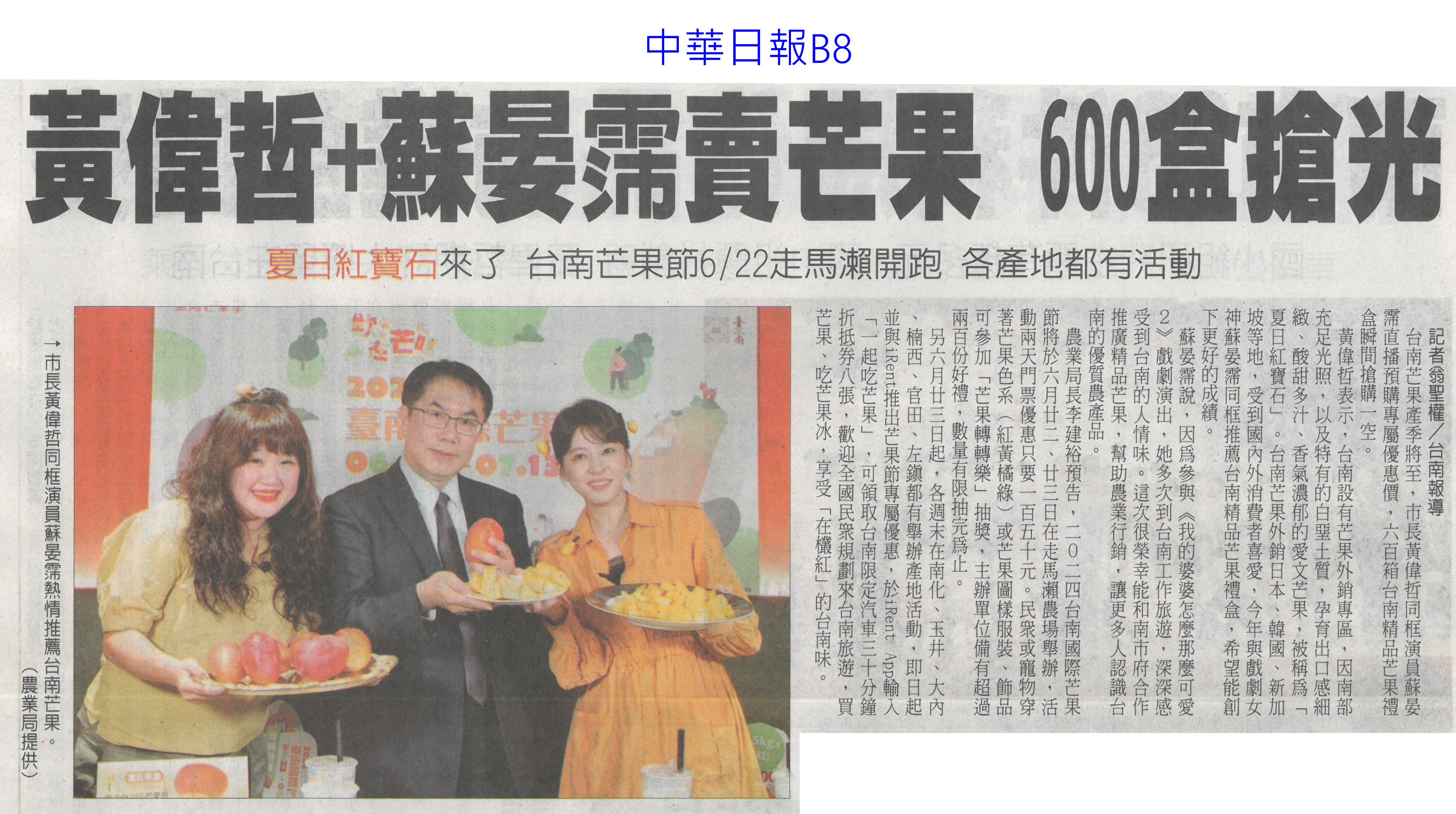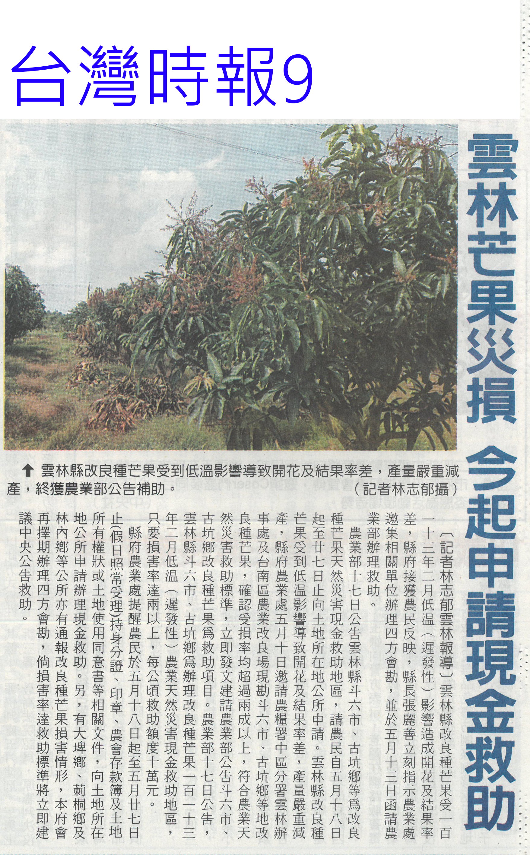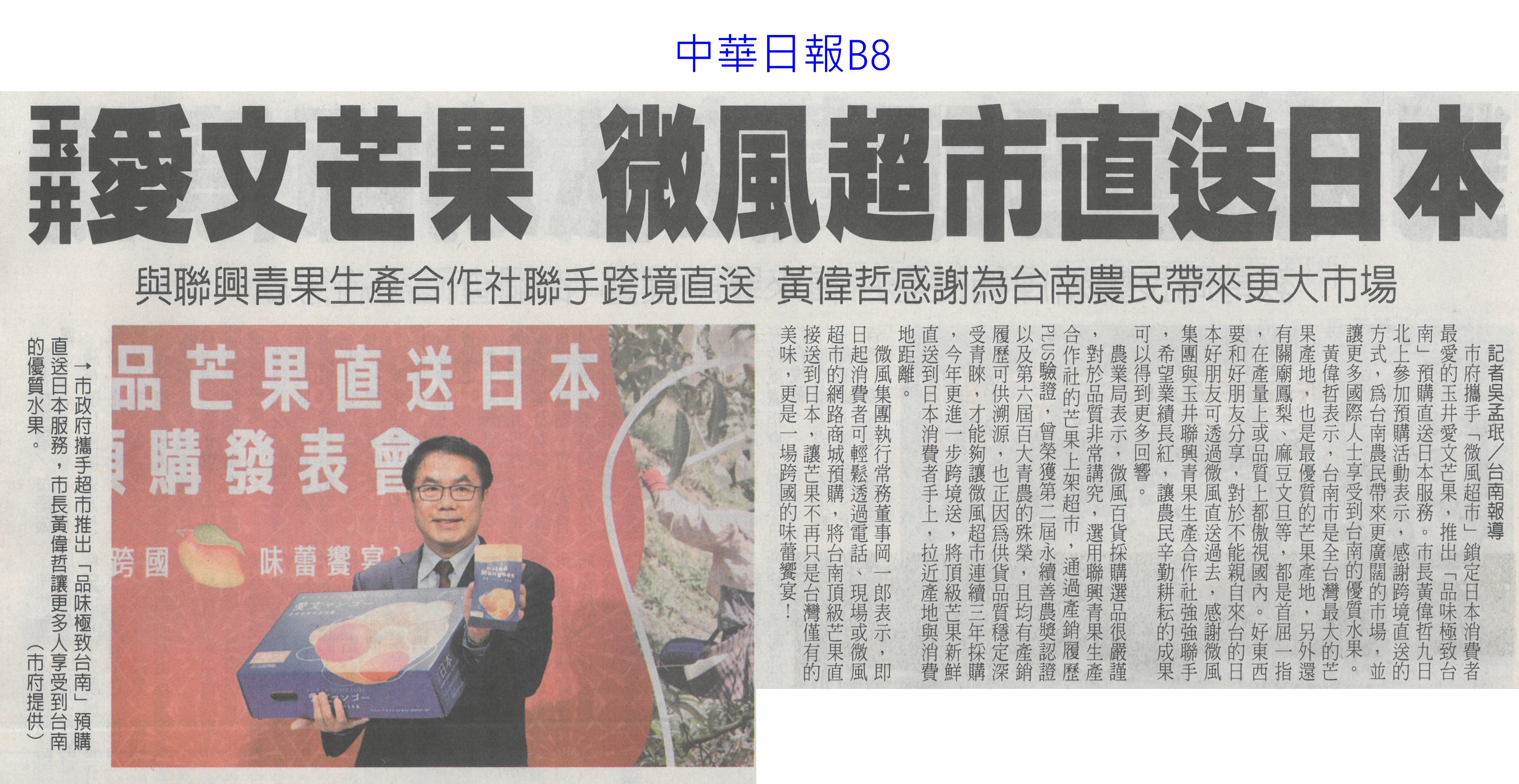 首頁芒果新鮮聞 芒果新鮮聞 排序 發布日期 更新日期 序號 發布日期 標題 541. 113/06/05 芒果季迎客 玉井增設停車空間(自由時報A11) 542. 113/06/05 黃偉哲+蘇晏霈賣芒果 600盒搶光(中華日報B8) 543. 113/06/05 迎接台南芒果節 黃偉哲邀請網紅「泡芙」品嘗台南芒果甜美滋味 544. 113/06/05 紅龍果今起可輸日!農業部:日本成最大水果出口國「年銷9億」 545. 113/06/04 芒果有毒?關鍵因素曝! 「1招」爽吃不會癢 546. 113/06/01 芒種將近!注重「除溼與消暑」中醫大推:四神湯、酸梅湯取代手搖飲 547. 113/06/01 進入愛文芒果產季 枋寮警啟動「護農專案」杜絕宵小蠢動 548. 113/05/31 芒果銷美 農業部:在1`2年有機會(中華日報A4) 549. 113/05/31 梅雨進補 三大水庫水情正常(中華日報B1) 550. 113/05/29 超大顆0.5公斤重愛文芒果奪大獎 .甜度高達14.2! 551. 113/05/29 台灣人吃帶殼海鮮易食物過敏 業者販售沒標警語恐挨罰 552. 113/05/28 50多家在地美食搬來台北 "台南美食文化節"黃偉哲來助陣! 553. 113/05/21 雲林芒果災損 今起申請現金救助(臺灣時報9) 554. 113/05/21 鮮果 加工品 7國14買家採購(自由時報A11) 555. 113/05/21 台南水果採洽會 7國買家下單(中華日報B8) 556. 113/05/21 台南水果國際採購日 估創千萬美元商機(中國時報A9) 557. 113/05/21 玉井愛文芒果 微風超市直送日本(中華日報B8) 558. 113/05/10 黃偉哲力推台南優質水果外銷 7國14家買主親至台南洽談農產採購交流 559. 113/05/09 芒果著果不佳 農損救助受理申報(臺灣時報13) 560. 113/05/09 氣溫忽冷忽熱 農漁產量歉收(中國時報A2) 第 28/183 頁,共 3656 筆上一頁到第123456789101112131415161718192021222324252627282930313233343536373839404142434445464748495051525354555657585960616263646566676869707172737475767778798081828384858687888990919293949596979899100101102103104105106107108109110111112113114115116117118119120121122123124125126127128129130131132133134135136137138139140141142143144145146147148149150151152153154155156157158159160161162163164165166167168169170171172173174175176177178179180181182183頁下一頁每頁103070筆資料
