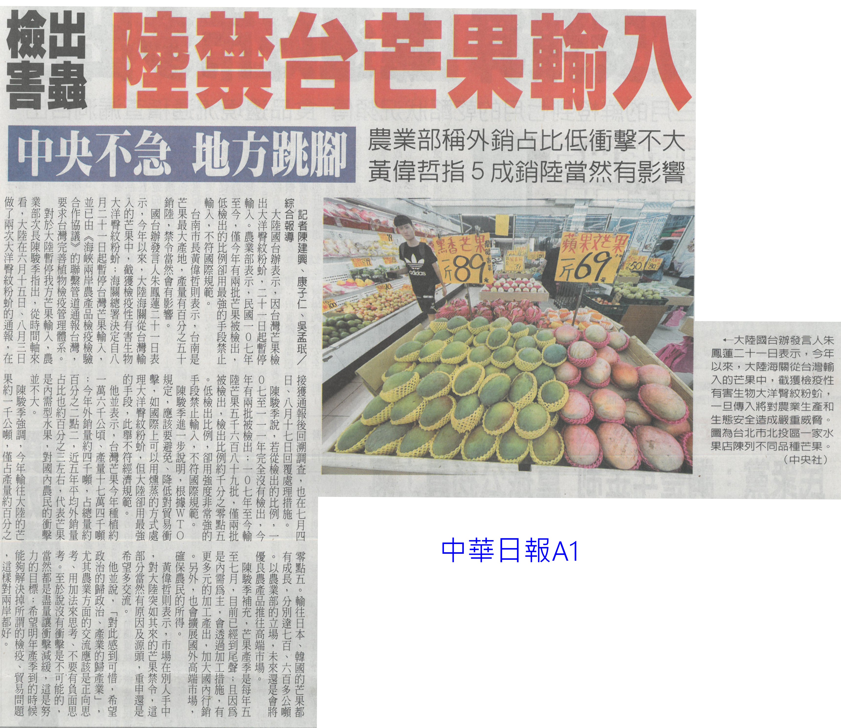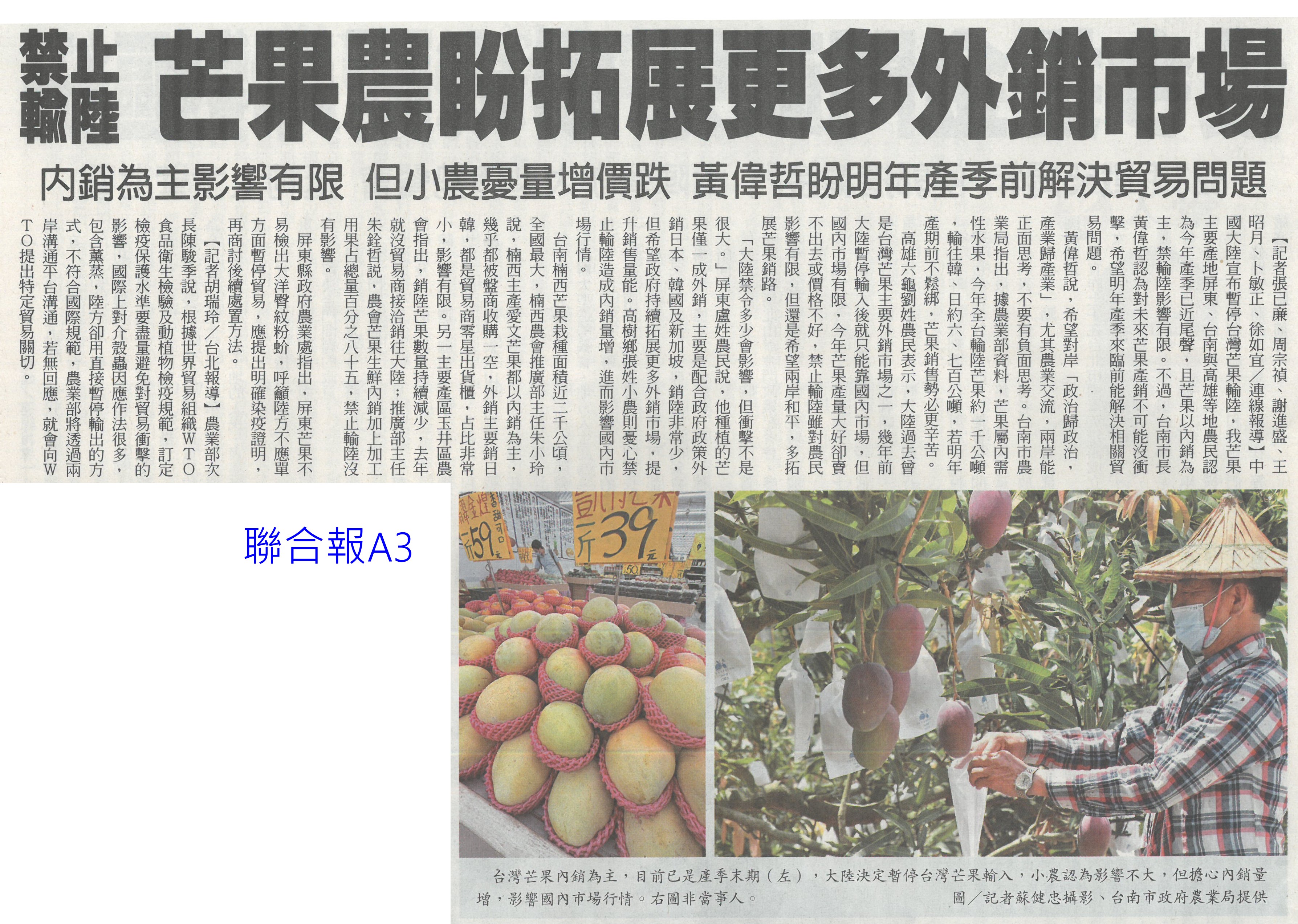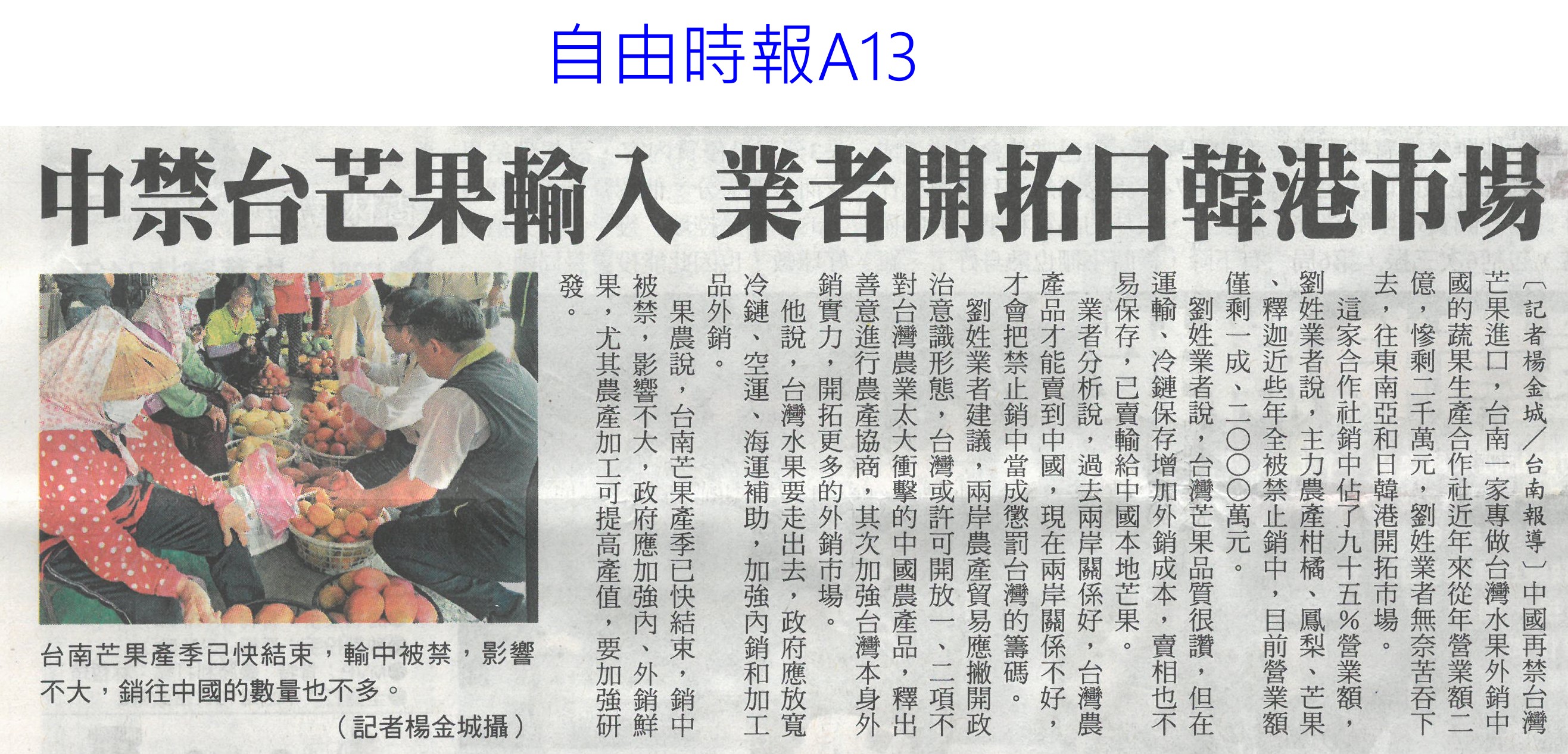 首頁芒果新鮮聞 芒果新鮮聞 排序 發布日期 更新日期 序號 發布日期 標題 741. 112/08/24 禁止輸陸 芒果農盼拓展更多外銷市場(聯合報A3) 742. 112/08/24 我芒果銷韓日 較中國價高3~4倍(自由時報A2) 743. 112/08/24 芒果產季已進入尾聲 南屏高:現階段影響不大(自由時報A2) 744. 112/08/24 陸暫停臺灣芒果輸入 對產銷影響有限(民眾日報2) 745. 112/08/24 檢出害蟲 陸禁台芒果輸入(中華日報A1) 746. 112/08/24 中禁台芒果輸入 業者開拓日韓港市場(自由時報A13) 747. 112/08/24 芒果循鳳梨釋迦模式輸陸?農糧署搖頭(自由時報A11) 748. 112/08/24 芒果收購價1斤6元? 高市府闢謠:平均40.4元 749. 112/08/23 高雄金煌芒果滯銷 每斤6元 收購價20年來新低 750. 112/08/23 [政治] 陳吉仲:農產品銷中出口值創新低 1至7月僅9.1% 751. 112/08/22 台芒果被禁!陳吉仲宣布好消息:農產品銷中「降至歷史新低」 752. 112/08/22 陸禁台灣芒果!陳吉仲「4點強硬回擊」被狂酸:班班吃芒果 753. 112/08/22 中國對台芒果下禁令 農糧署長批:共產國家做事不必有道理 754. 112/08/21 東山農會推蔬食中秋禮盒(中華日報B3) 755. 112/08/21 新化果菜市場推普渡水果客製化(中華日報B8) 756. 112/08/21 農業部:農產品銷陸已大幅減少(聯合報A3) 757. 112/08/21 第三階段省工高效農機補助 8/20起申請(台灣新生報7) 758. 112/08/21 低地利非天生 張麗善:農業部應檢討(中國時報A9) 759. 112/08/21 不想種電 口湖鄉盼重劃維持農用(中國時報A9) 760. 112/08/21 玉井豐里社區通過農再計畫(台灣新生報8) 第 38/183 頁,共 3656 筆上一頁到第123456789101112131415161718192021222324252627282930313233343536373839404142434445464748495051525354555657585960616263646566676869707172737475767778798081828384858687888990919293949596979899100101102103104105106107108109110111112113114115116117118119120121122123124125126127128129130131132133134135136137138139140141142143144145146147148149150151152153154155156157158159160161162163164165166167168169170171172173174175176177178179180181182183頁下一頁每頁103070筆資料