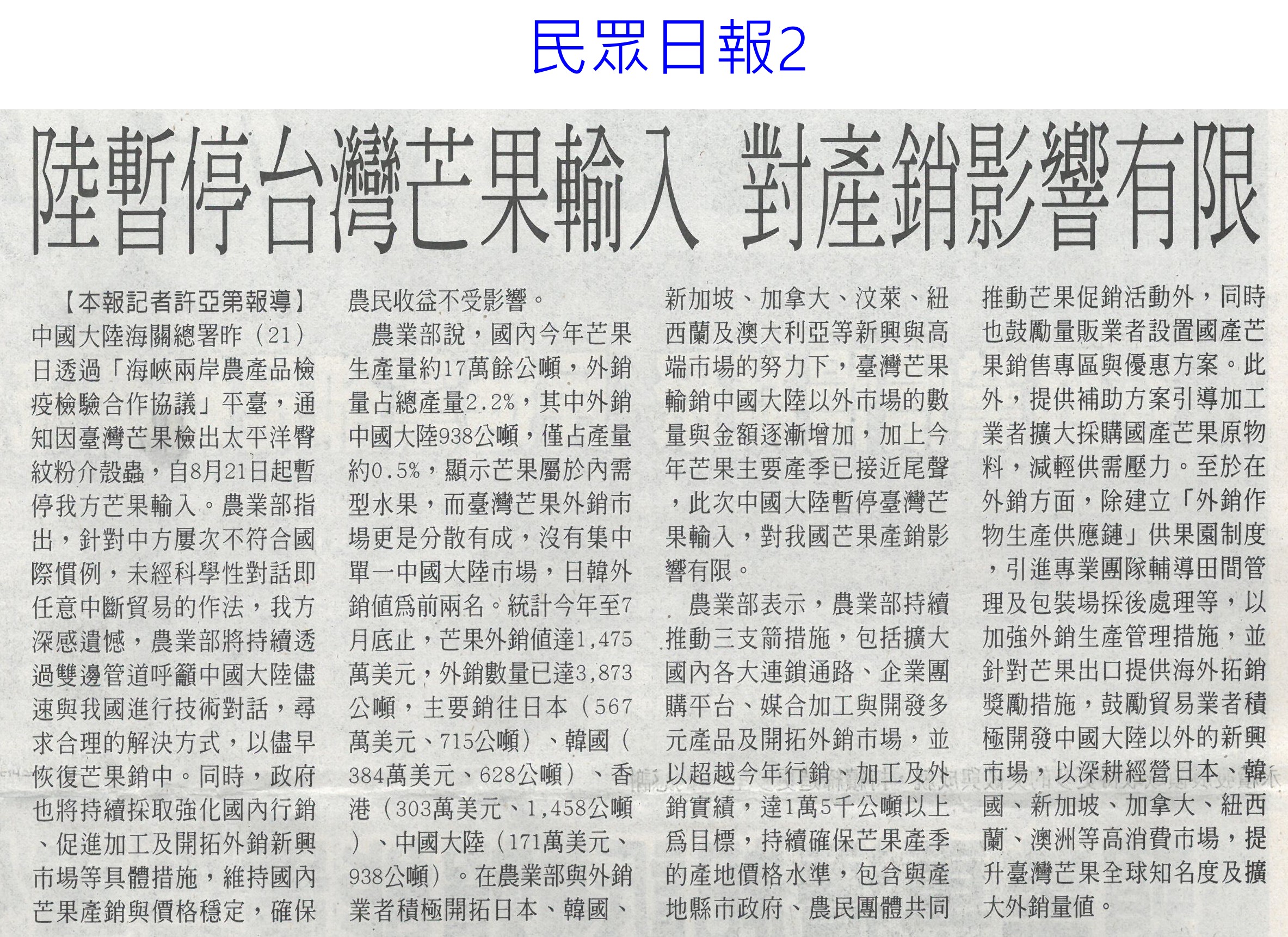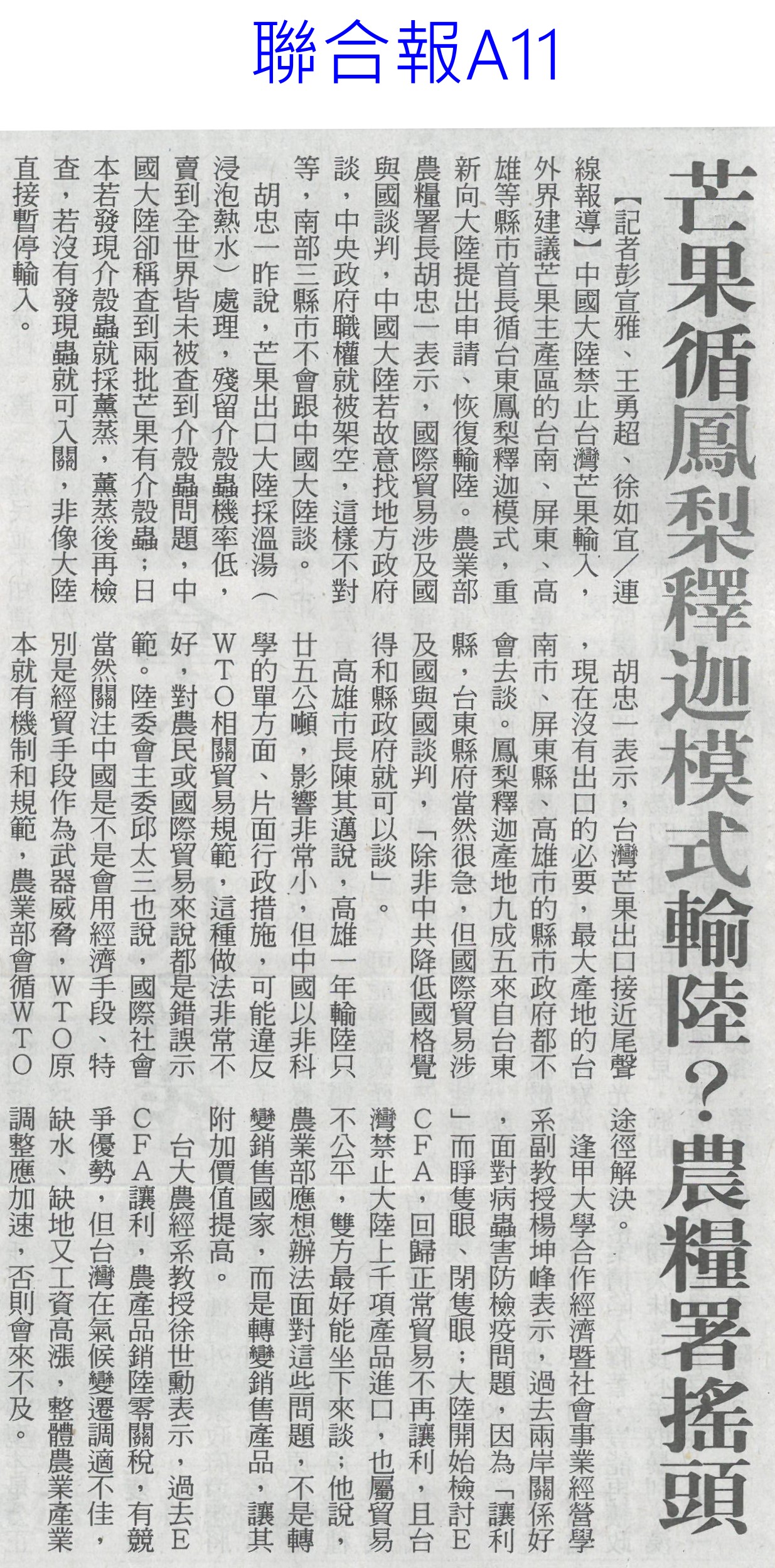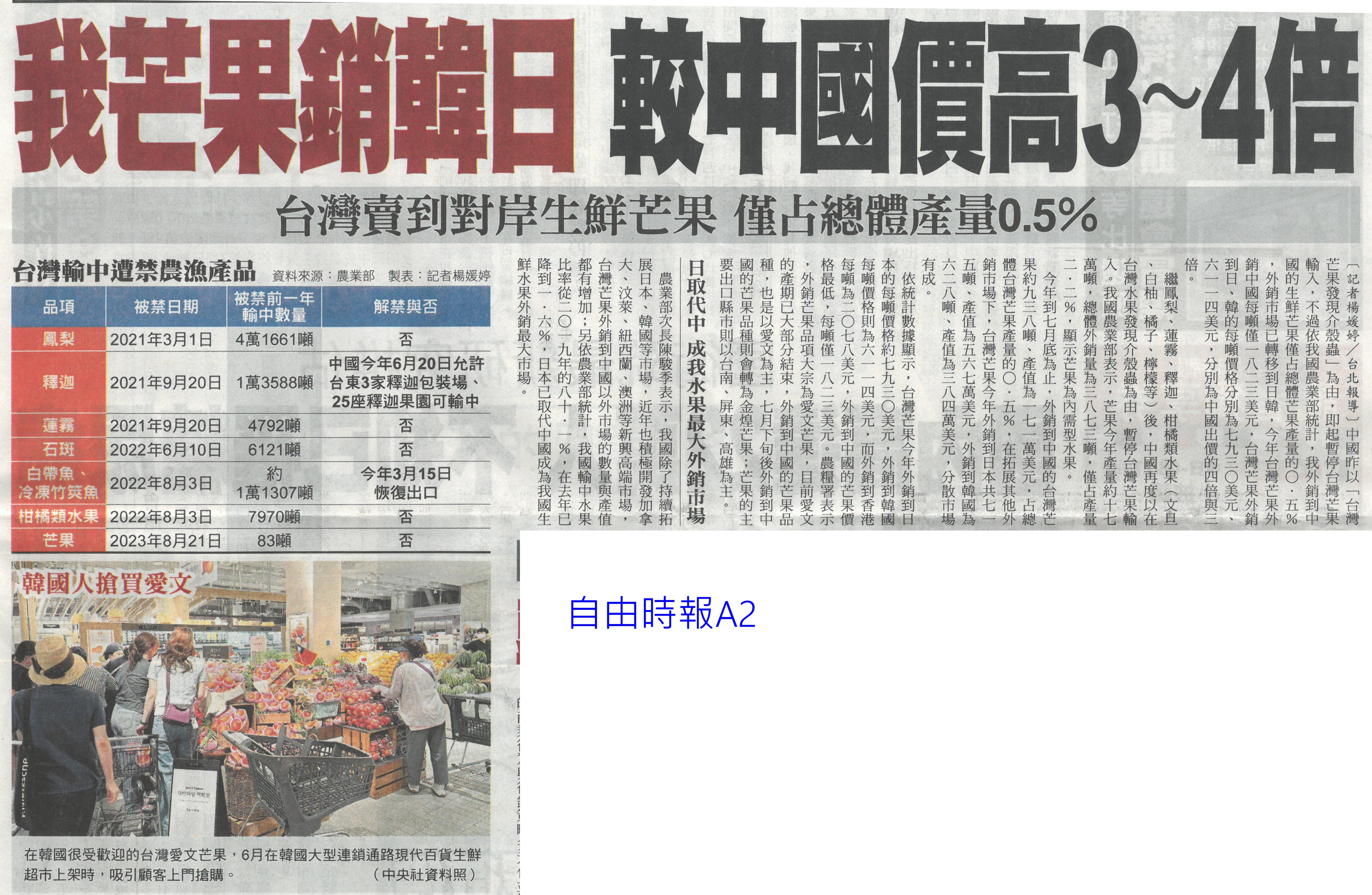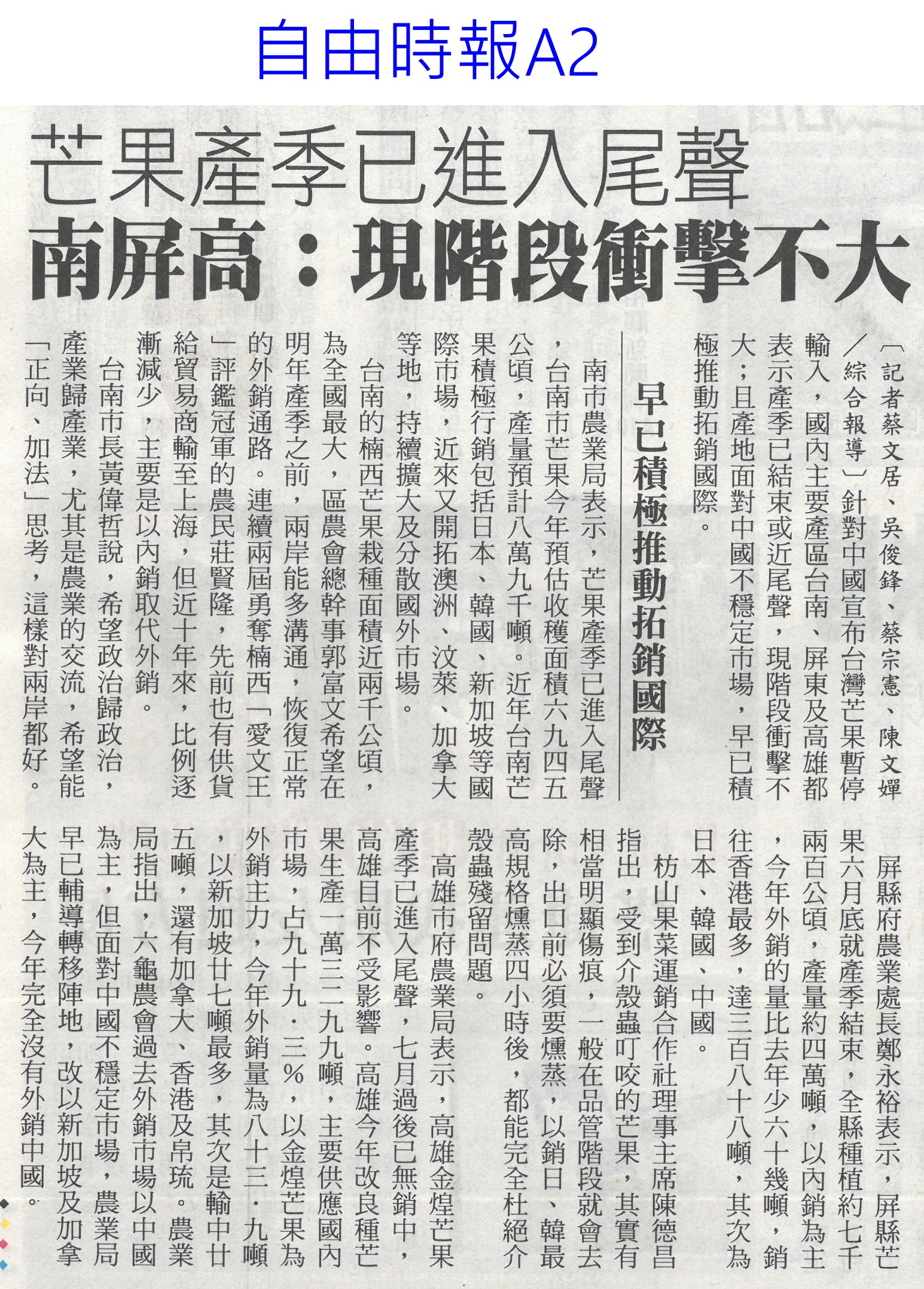 首頁芒果新鮮聞 芒果新鮮聞 排序 發布日期 更新日期 序號 發布日期 標題 741. 112/08/24 禁止輸陸 芒果農盼拓展更多外銷市場(聯合報A3) 742. 112/08/24 我芒果銷韓日 較中國價高3~4倍(自由時報A2) 743. 112/08/24 芒果產季已進入尾聲 南屏高:現階段影響不大(自由時報A2) 744. 112/08/24 陸暫停臺灣芒果輸入 對產銷影響有限(民眾日報2) 745. 112/08/24 檢出害蟲 陸禁台芒果輸入(中華日報A1) 746. 112/08/24 中禁台芒果輸入 業者開拓日韓港市場(自由時報A13) 747. 112/08/24 芒果循鳳梨釋迦模式輸陸?農糧署搖頭(自由時報A11) 748. 112/08/24 芒果收購價1斤6元? 高市府闢謠:平均40.4元 749. 112/08/23 高雄金煌芒果滯銷 每斤6元 收購價20年來新低 750. 112/08/23 [政治] 陳吉仲:農產品銷中出口值創新低 1至7月僅9.1% 751. 112/08/22 台芒果被禁!陳吉仲宣布好消息:農產品銷中「降至歷史新低」 752. 112/08/22 陸禁台灣芒果!陳吉仲「4點強硬回擊」被狂酸:班班吃芒果 753. 112/08/22 中國對台芒果下禁令 農糧署長批:共產國家做事不必有道理 754. 112/08/21 東山農會推蔬食中秋禮盒(中華日報B3) 755. 112/08/21 新化果菜市場推普渡水果客製化(中華日報B8) 756. 112/08/21 農業部:農產品銷陸已大幅減少(聯合報A3) 757. 112/08/21 第三階段省工高效農機補助 8/20起申請(台灣新生報7) 758. 112/08/21 低地利非天生 張麗善:農業部應檢討(中國時報A9) 759. 112/08/21 不想種電 口湖鄉盼重劃維持農用(中國時報A9) 760. 112/08/21 玉井豐里社區通過農再計畫(台灣新生報8) 第 38/183 頁,共 3656 筆上一頁到第123456789101112131415161718192021222324252627282930313233343536373839404142434445464748495051525354555657585960616263646566676869707172737475767778798081828384858687888990919293949596979899100101102103104105106107108109110111112113114115116117118119120121122123124125126127128129130131132133134135136137138139140141142143144145146147148149150151152153154155156157158159160161162163164165166167168169170171172173174175176177178179180181182183頁下一頁每頁103070筆資料
