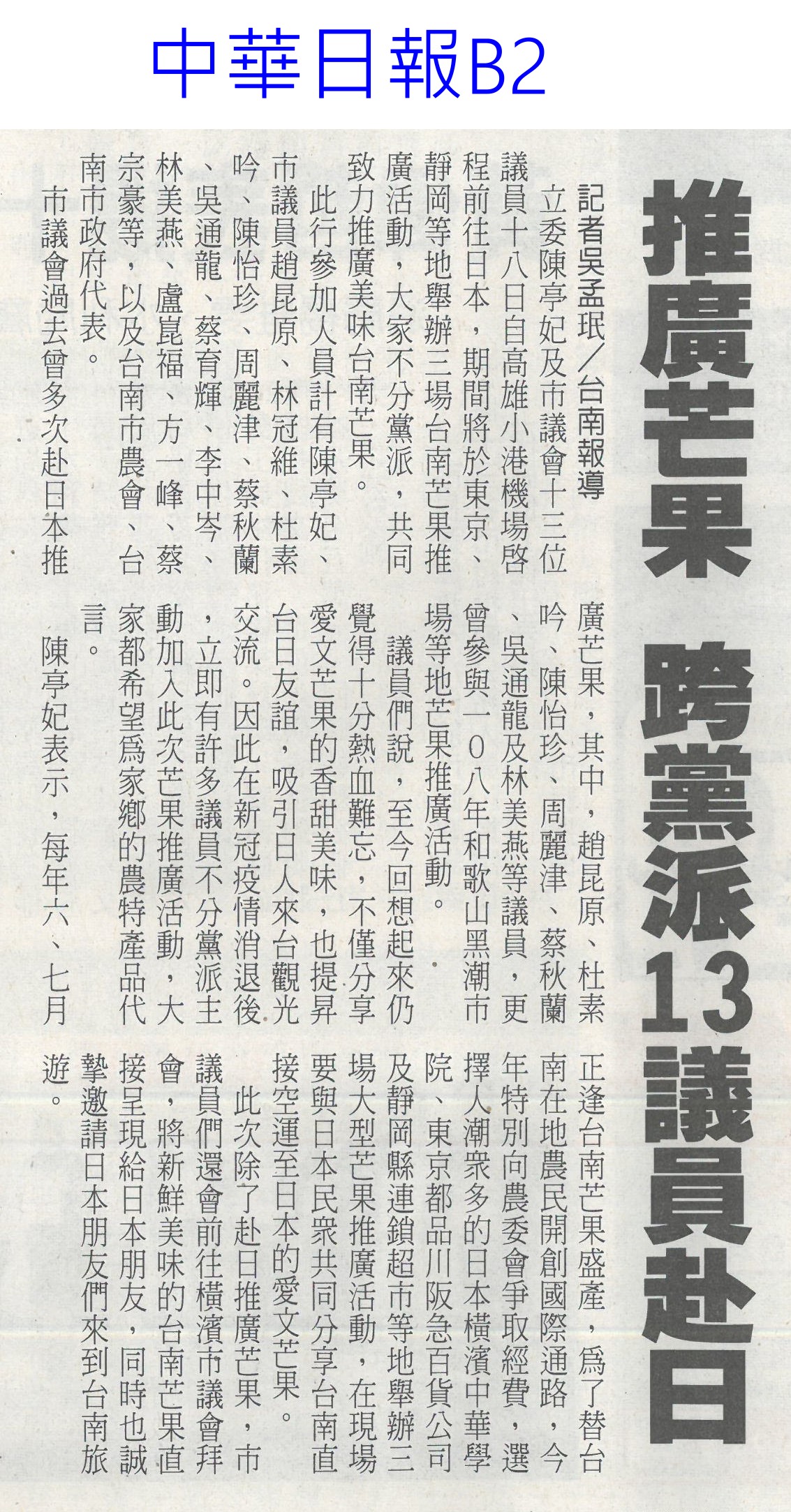 首頁芒果新鮮聞 芒果新鮮聞 排序 發布日期 更新日期 序號 發布日期 標題 821. 112/07/24 日本前僑高中 獲贈台南芒果超驚喜(自由時報A13) 822. 112/07/24 黃偉哲贈芒果 日高中生驚喜(中華日報B2) 823. 112/07/24 黃偉哲請日本弘前市學童吃芒果 小朋友:吃了還想再吃! 824. 112/07/23 黃偉哲致贈台南新鮮芒果 日本高中生超驚喜 825. 112/07/22 芒果皮出現黑點、黑斑還能吃嗎? 農糧署解答...做「1步驟」放心食用 826. 112/07/21 農作避日頭 留意自身狀況(台灣新生報12) 827. 112/07/21 四武集團推台南芒果甜點 日人搶買(中華日報B8) 828. 112/07/21 陳昆和持續以行動支持山區農民 媒合企業採購小農芒果捐社福 829. 112/07/20 黃偉哲偕視察茅港尾農水路改善(民眾日報12) 830. 112/07/20 農產外銷慘跌 陳吉仲撒幣等升官(民眾日報2) 831. 112/07/20 嘉義農產深受日本青睞(台灣新生報6) 832. 112/07/20 二期作休耕補助 八月三日起申請(中華日報B2) 833. 112/07/20 嘉南30年大旱 白河水庫仍維持供灌(中國時報A9) 834. 112/07/20 4張「網狀芒果」照讓35萬日網友驚豔:這樣切避開種子真好!芒果營養素超多,但3種人別吃太多 835. 112/07/20 芒果專業切法 駐日代表處曝「標準4步驟」讓日本人超驚訝 836. 112/07/19 南市跨黨派民代赴日推廣芒果(臺灣時報19) 837. 112/07/19 推廣芒果 跨黨派13議員赴日(中華日報B2) 838. 112/07/19 學者:政府補貼衝量 反打壞市場(聯合報A3) 839. 112/07/19 外銷消退農民有感 盼與陸洽談(聯合報A3) 840. 112/07/19 我農產外銷量直直落(聯合報A1) 第 42/183 頁,共 3656 筆上一頁到第123456789101112131415161718192021222324252627282930313233343536373839404142434445464748495051525354555657585960616263646566676869707172737475767778798081828384858687888990919293949596979899100101102103104105106107108109110111112113114115116117118119120121122123124125126127128129130131132133134135136137138139140141142143144145146147148149150151152153154155156157158159160161162163164165166167168169170171172173174175176177178179180181182183頁下一頁每頁103070筆資料