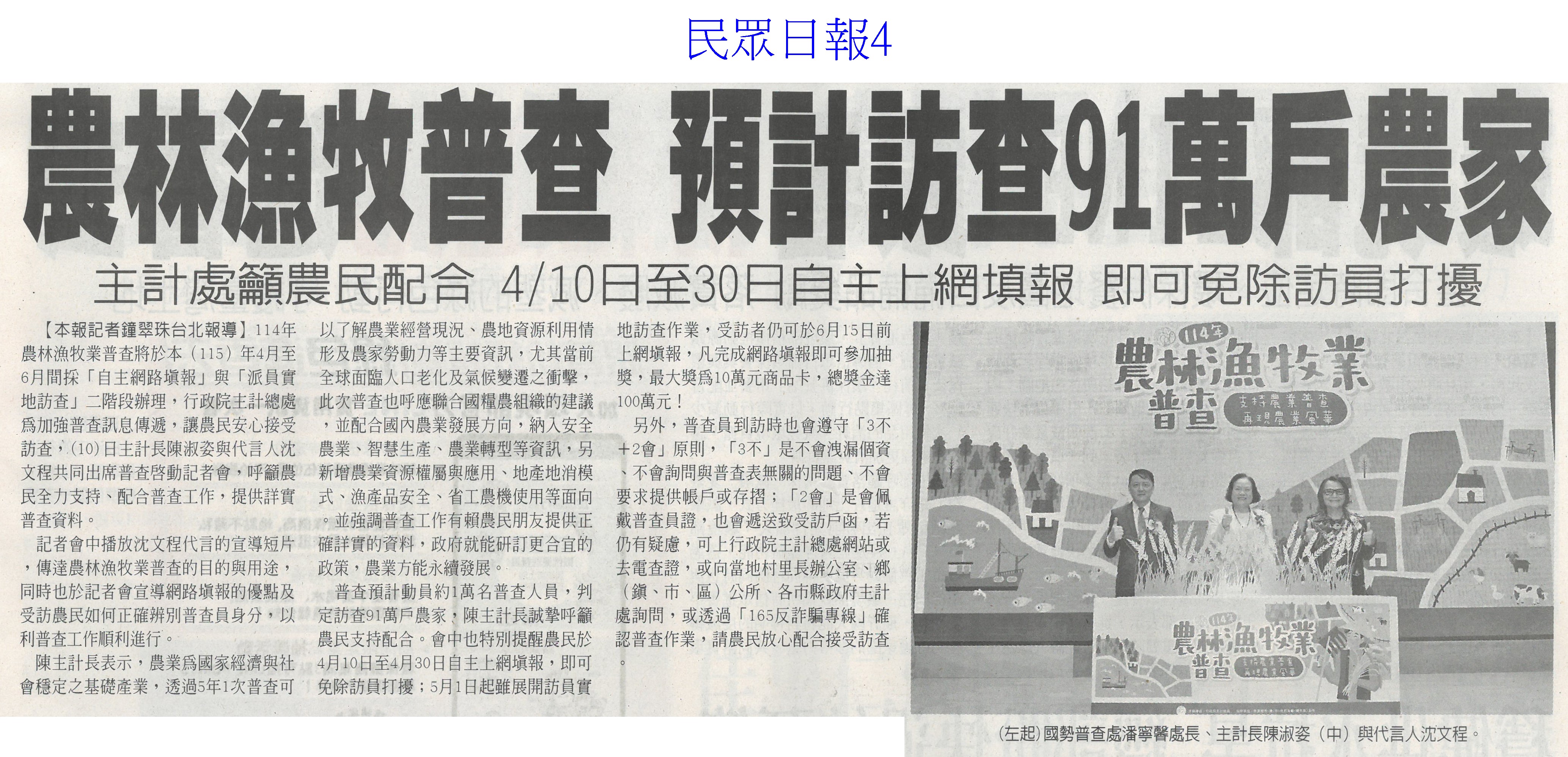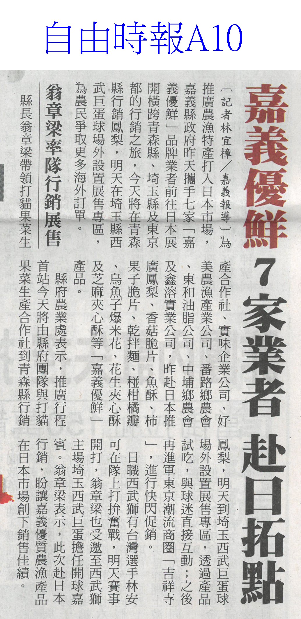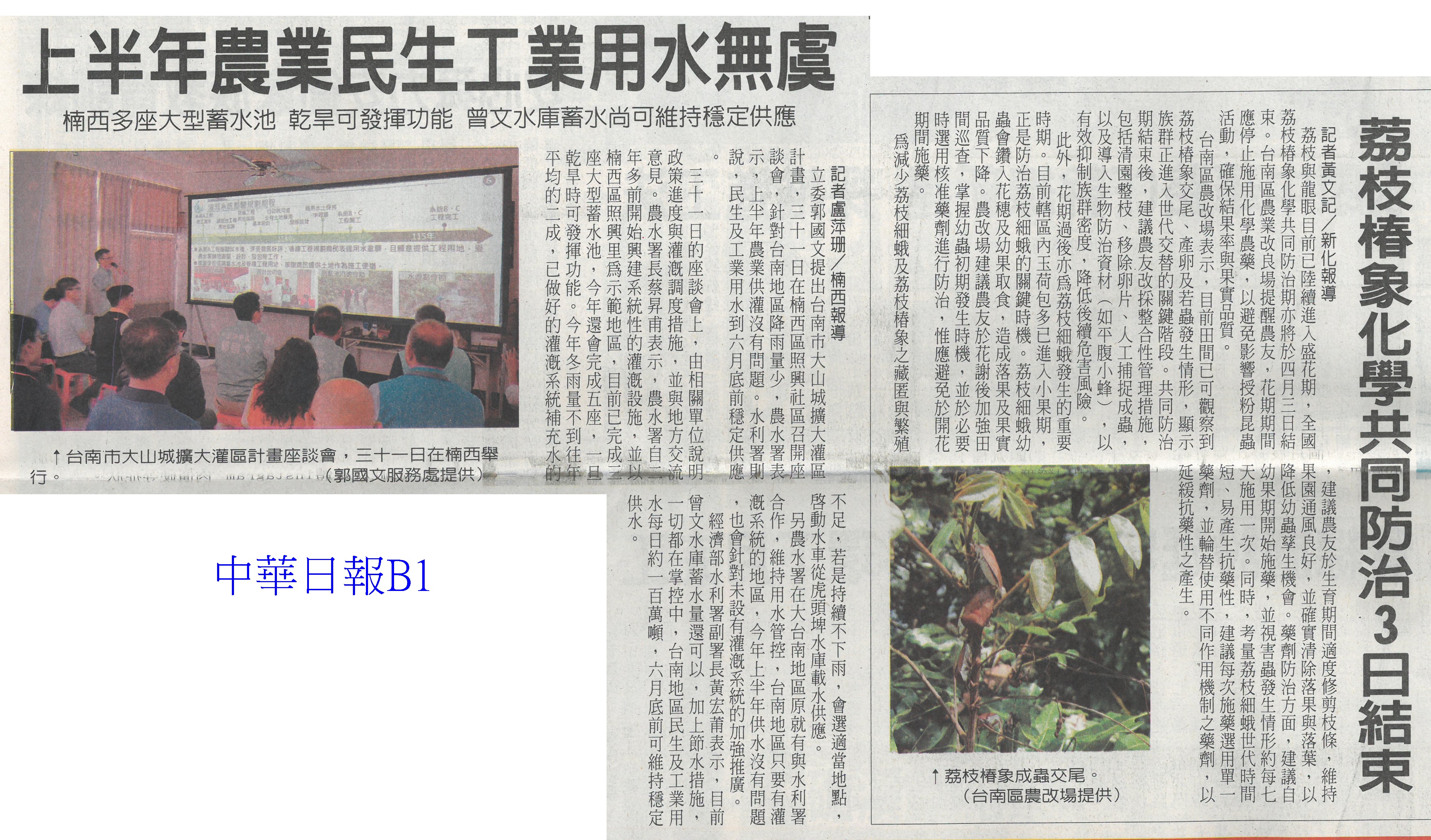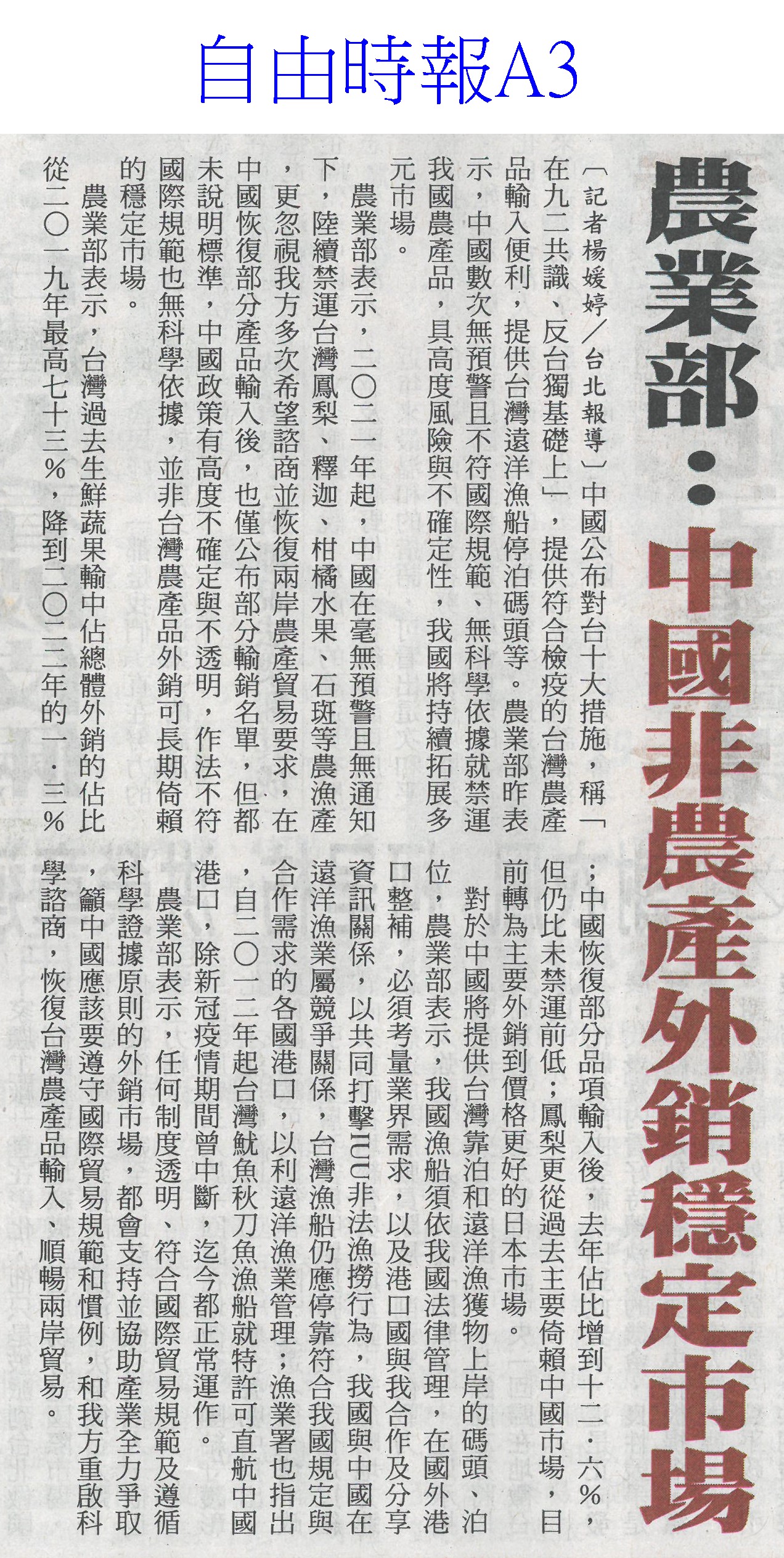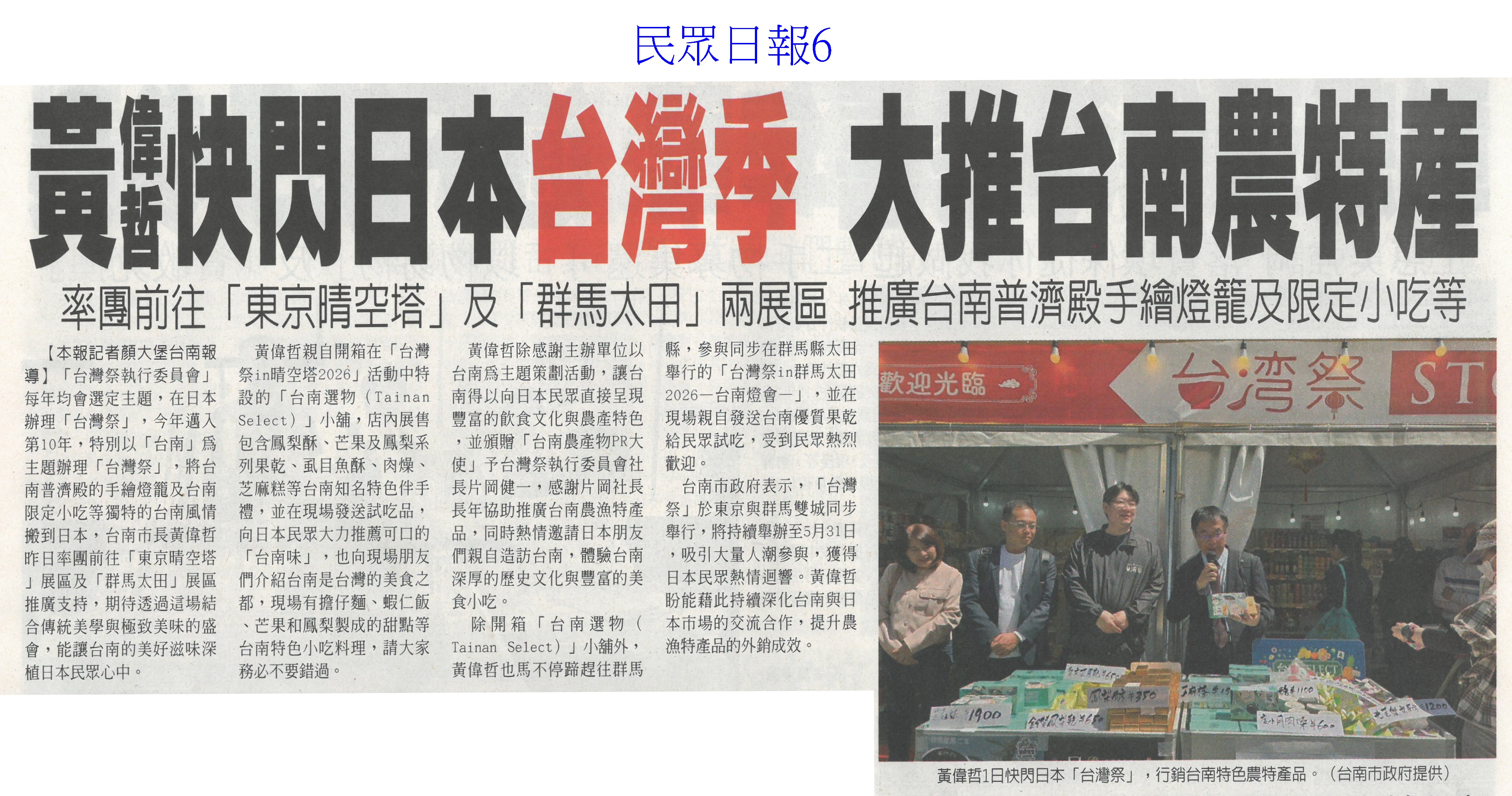 首頁花現新聞 花現新聞 排序 發布日期 更新日期 序號 發布日期 標題 1. 115/04/15 台南農產進軍新加坡食品展(台灣新生報6) 2. 115/04/15 不靠中國 台南農產前進新加坡食品展(自由時報A11) 3. 115/04/13 中北部水庫蓄水量回升 全台仍需節約用水(自由時報A8) 4. 115/04/13 農林漁牧普查 預計訪查91萬戶農家(民眾日報4) 5. 115/04/13 黃偉哲快閃日本台灣季 大推台南農特產(民眾日報6) 6. 115/04/13 農業部:中國非農產外銷穩定市場(自由時報A3) 7. 115/04/12 校園新鮮事/屏科大3生創蜜棗品牌 8. 115/04/10 嘉義優鮮7家業者 赴日拓點(自由時報A10) 9. 115/04/09 農業生產資材 協調價格凍漲(民眾日報2) 10. 115/04/09 陳駿季:300億農安基金因應(中國時報A3) 11. 115/04/09 凱道農玩節 玩樂中扎根食農教育(民眾日報4) 12. 115/04/09 台南農產首赴英國食品展 創1.5億商機(自由時報A9) 13. 115/04/09 學甲引進蜀葵花 翻轉農地價值(臺灣時報9) 14. 115/04/07 學甲蜀葵爭艷 畫賞花海夜觀光影(中華日報B6) 15. 115/04/07 農漁產英國參展 創1.5億商機(中華日報A8) 16. 115/04/02 政府補助及部分台肥吸收 肥料凍漲(臺灣時報4) 17. 115/04/01 上半年農業民生工業用水無虞(中華日報B1) 18. 115/03/31 農糧署導入GIS 農藥殘留採樣無死角(民眾日報16) 19. 115/03/30 國際肥料價格波動 南市推環保尚好肥(民眾日報12) 20. 115/03/30 酒米新品種南藏 發表暨技轉簽約(民眾日報3) 第 1/128 頁,共 2560 筆到第123456789101112131415161718192021222324252627282930313233343536373839404142434445464748495051525354555657585960616263646566676869707172737475767778798081828384858687888990919293949596979899100101102103104105106107108109110111112113114115116117118119120121122123124125126127128頁下一頁每頁103070筆資料