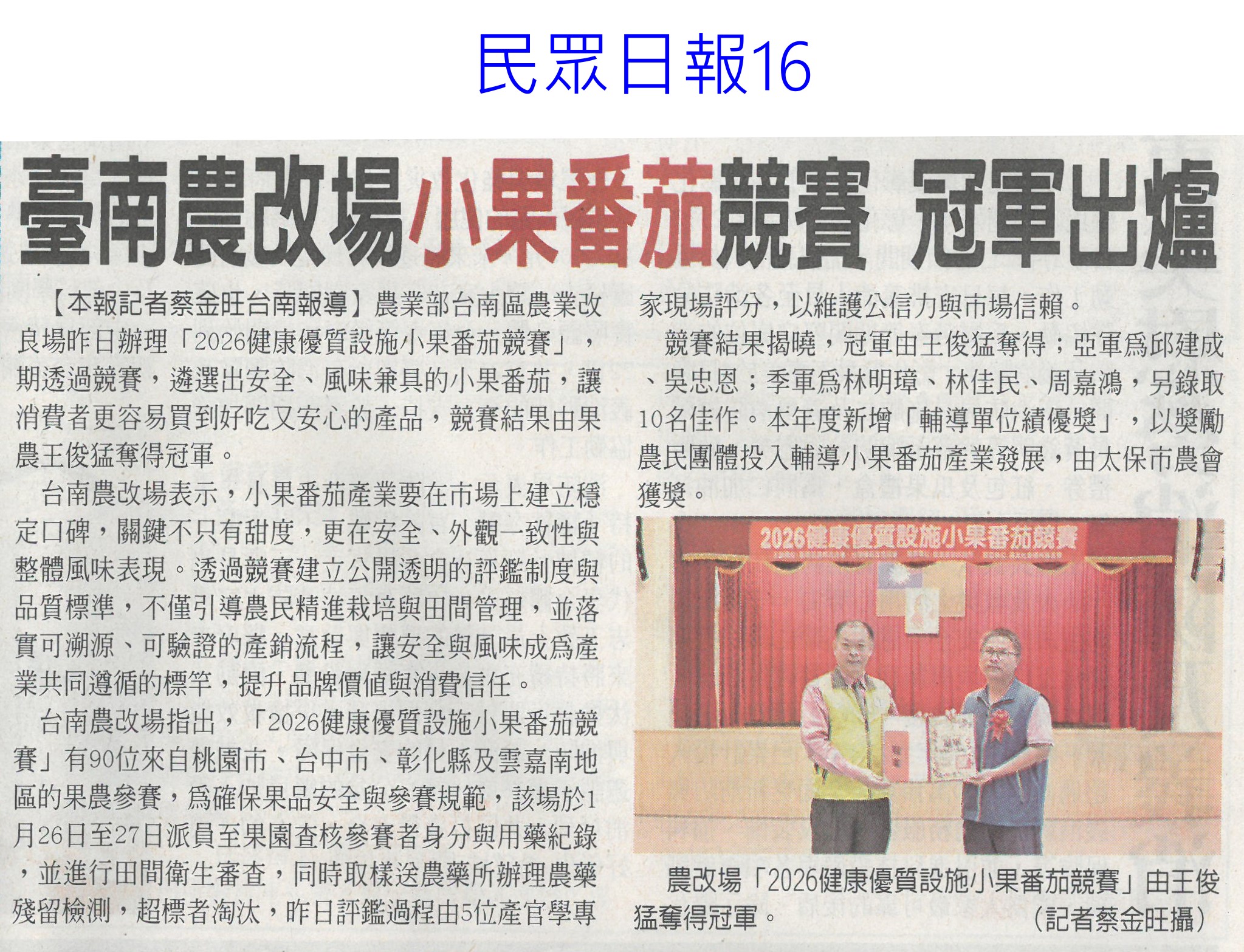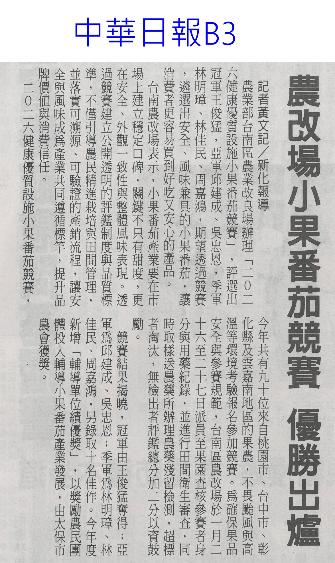 首頁番茄搶先報 番茄搶先報 排序 發布日期 更新日期 序號 發布日期 標題 1. 115/02/06 臺南農改場小果番茄競賽 冠軍出爐(民眾日報16) 2. 115/02/06 農改場小果番茄競賽 優勝出爐(中華日報B3) 3. 115/02/03 從產地到門市 小七安心草莓獨家開賣(民眾日報16) 4. 115/02/03 蜜棗銷大馬 黃偉哲找通路(中華日報B2) 5. 115/02/03 青農張清文 推觀光草莓園(中華日報B4) 6. 115/02/03 雲林農業前進中東 佈局國際(台灣新生報6) 7. 115/02/03 鹽水番茄 營養豐富品種多(台灣新生報6) 8. 115/02/03 影/重回「美濃大峽谷」 石麗君農地附近至少4天坑尚未回填 9. 115/02/03 印度農村貢獻AI熱潮 她當資料標註員成模型幕後推手 10. 115/02/03 7-ELEVEN 開賣「魚莓共生」草莓!24小時低溫直送 3,000店限量上市 11. 115/02/02 行銷台南農產 黃偉哲前進新加坡(臺灣時報13) 12. 115/02/02 以水為本 林內水舞休閒農業區啟用(自由時報A8) 13. 115/02/02 行銷台南甜 黃偉哲赴星賣蜜棗(中華日報B2) 14. 115/02/02 斥資133億 曾文南化聯通管啟用(中國時報A9) 15. 115/02/02 新春農產饗宴 55優質業者擺攤(中華日報B3) 16. 115/02/02 嘉縣年貨大街 在地農特產200多攤(自由時報A8) 17. 115/01/28 農退儲金提繳比例 改農民4政府6(聯合報A6) 18. 115/01/28 雲林良品 前進波灣國際食品展(台灣新生報6) 19. 115/01/28 黃偉哲領軍打開國際市場(中華日報B1) 20. 115/01/28 清真認證 雲林農產前進波灣(中國時報A9) 第 1/171 頁,共 3415 筆到第123456789101112131415161718192021222324252627282930313233343536373839404142434445464748495051525354555657585960616263646566676869707172737475767778798081828384858687888990919293949596979899100101102103104105106107108109110111112113114115116117118119120121122123124125126127128129130131132133134135136137138139140141142143144145146147148149150151152153154155156157158159160161162163164165166167168169170171頁下一頁每頁103070筆資料